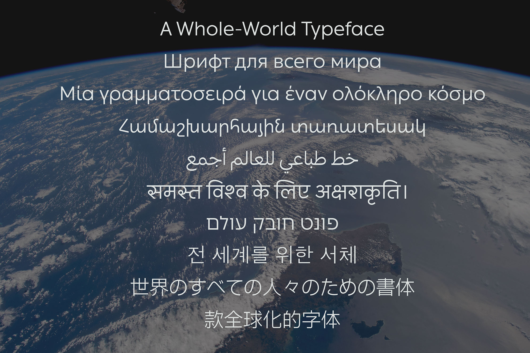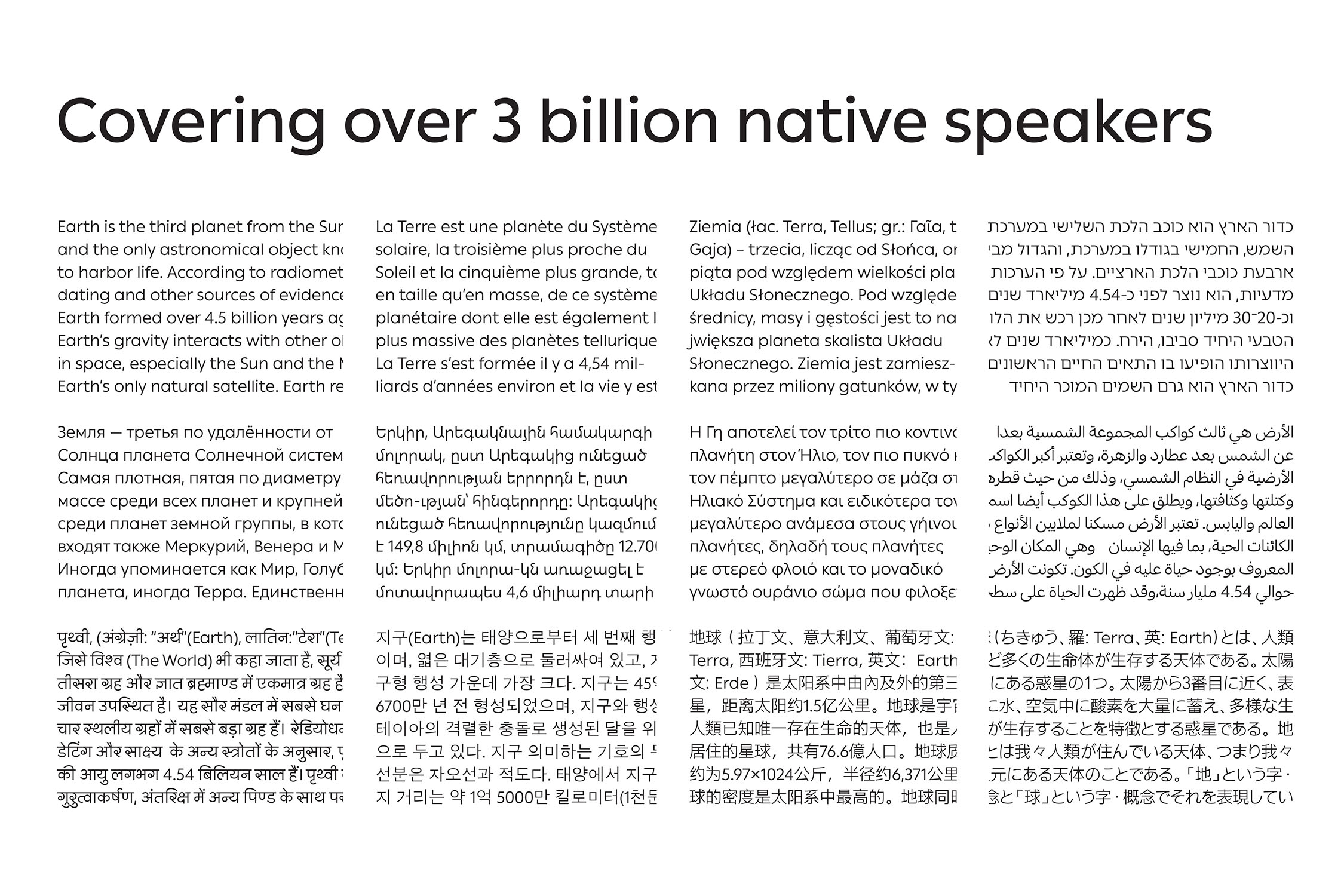 Peter Biľak, Nikola Djurek (Latin, Greek, Cyrillic and Armenian), Daniel Grumer (Hebrew), Arphic Technology (Chinese, Japanese and Korean), Kristyan Sarkis (Arabic) and Parimal Parmar (Devanagari).
