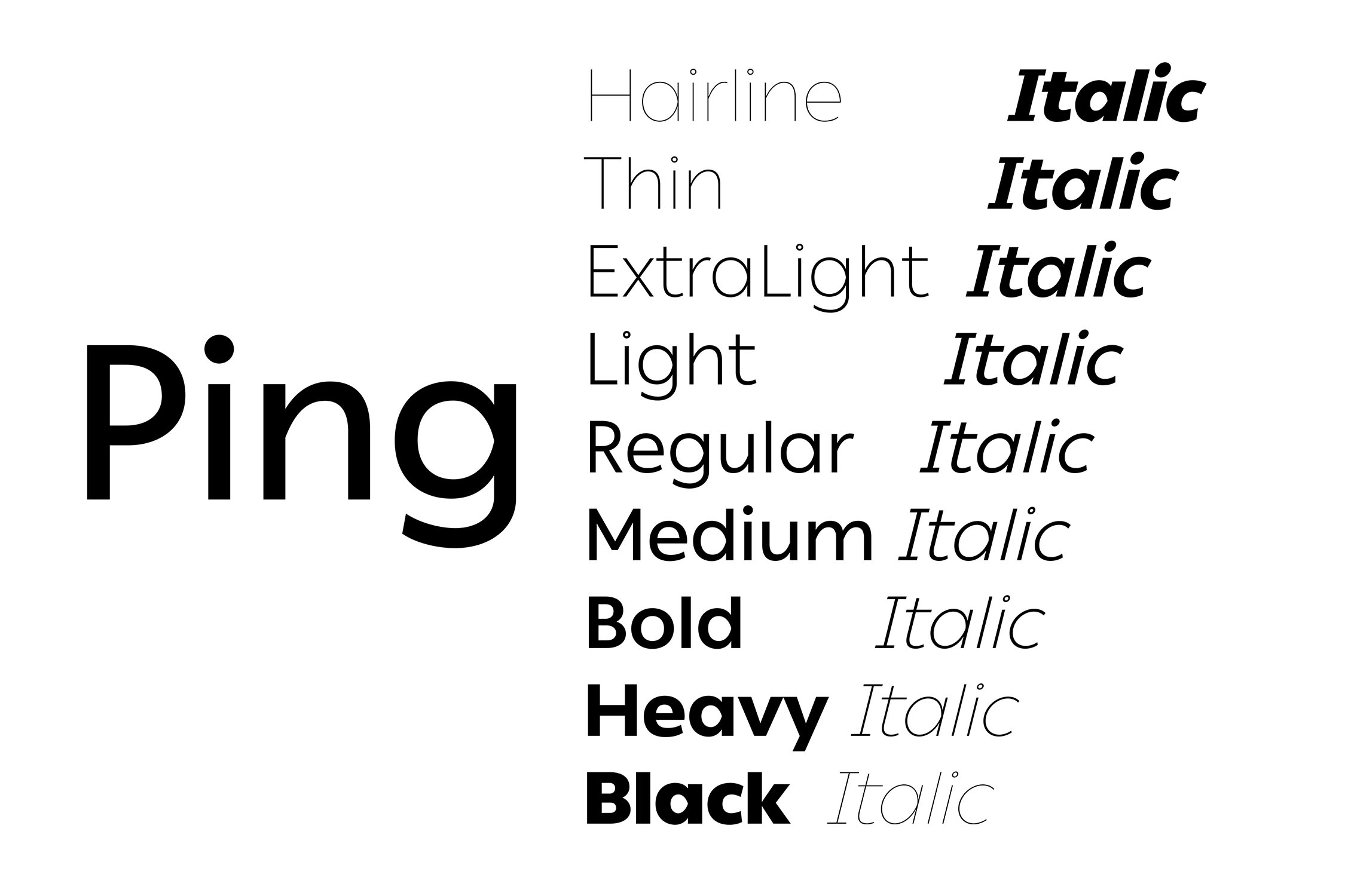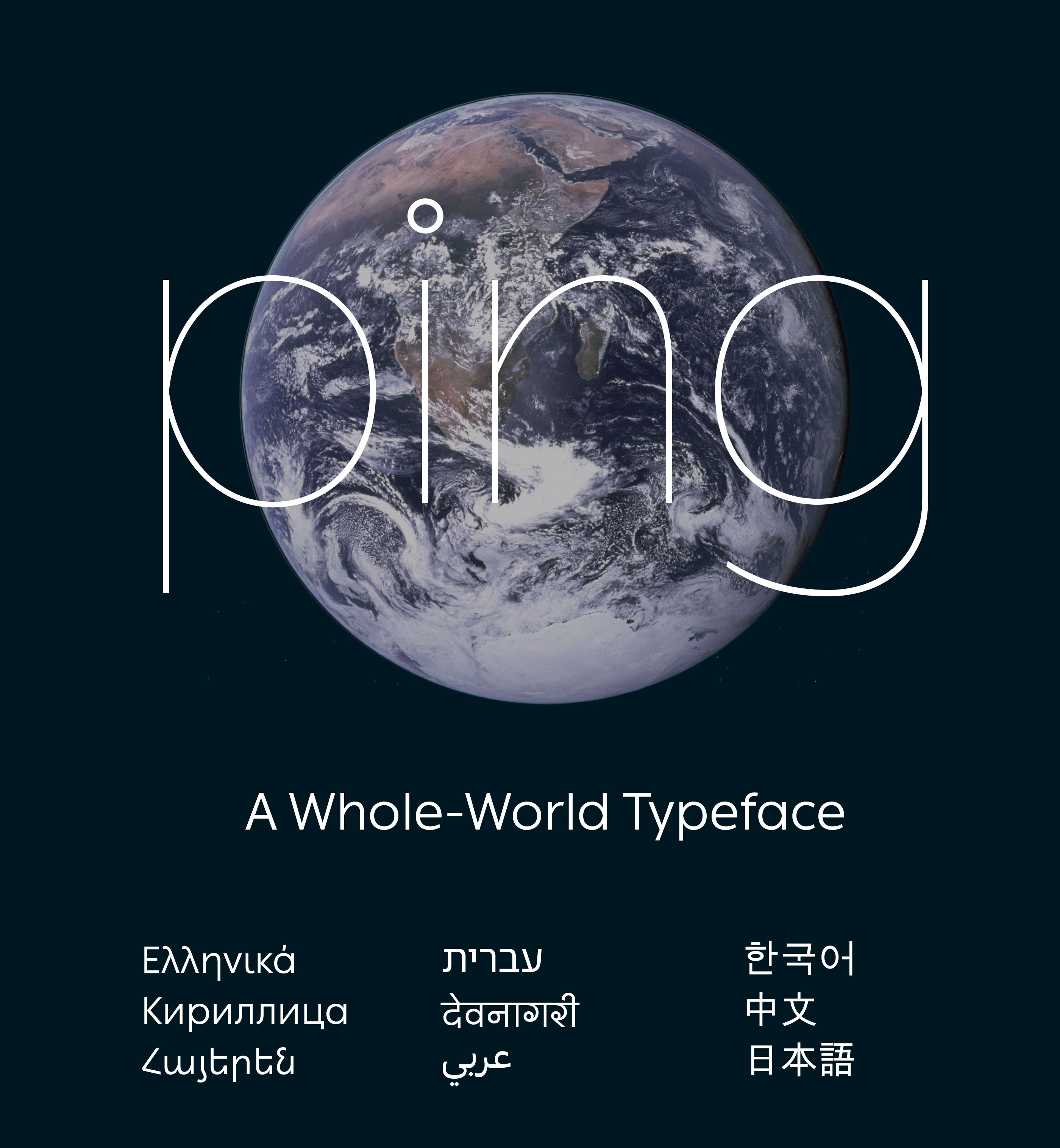 Ping is a fluid sans serif font with a geometric structure, but unlike other geometric typefaces, Ping doesn’t reject the influence of the human hand. Ping’s simplified letterforms are constructed with the least number of pen strokes. Ping also aims to be a truly international typeface, supporting not only hundreds of Latin-based languages, but also Arabic, Armenian, Chinese (Simplified and Traditional), Cyrillic, Devanagari, Greek, Korean, Hebrew and Japanese, unprecedented goal for a small independent type foundry.