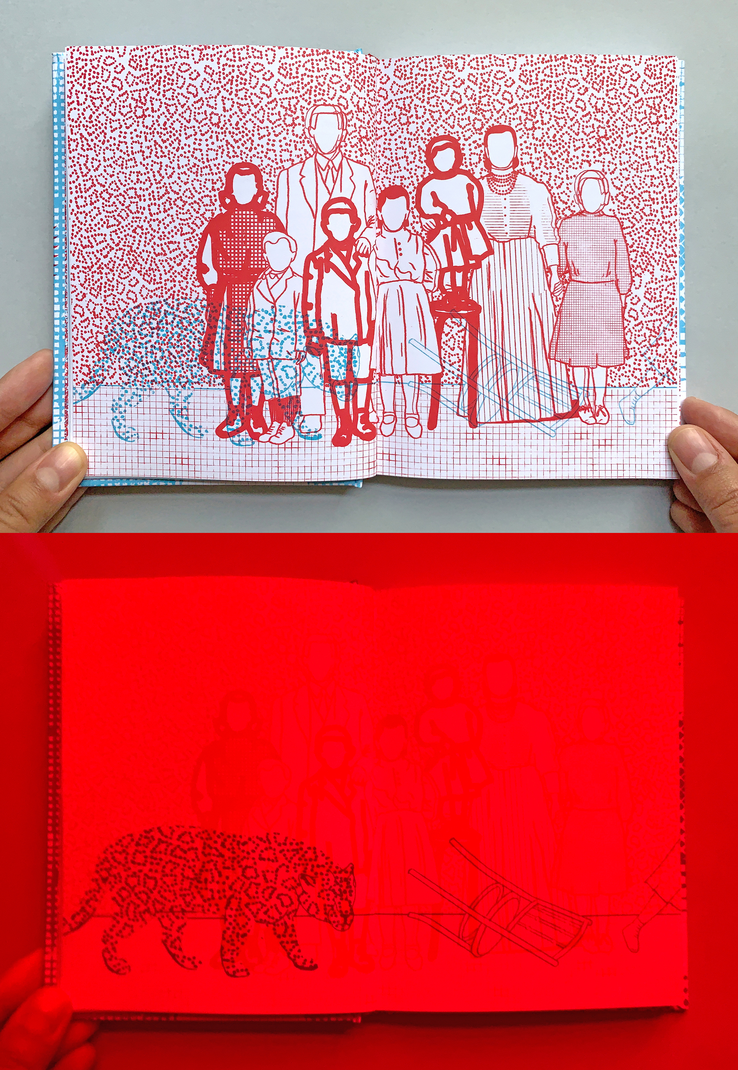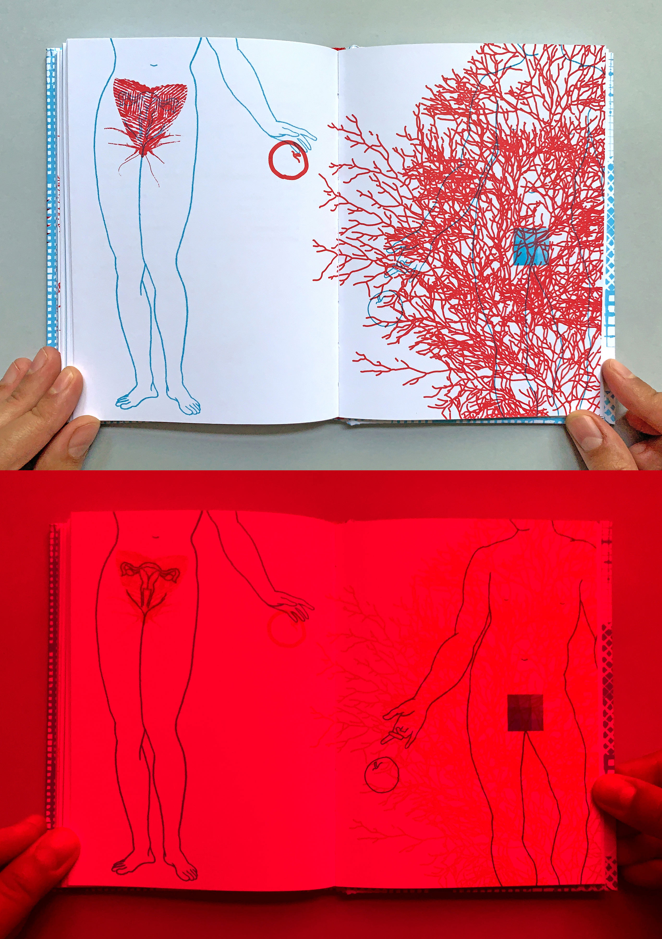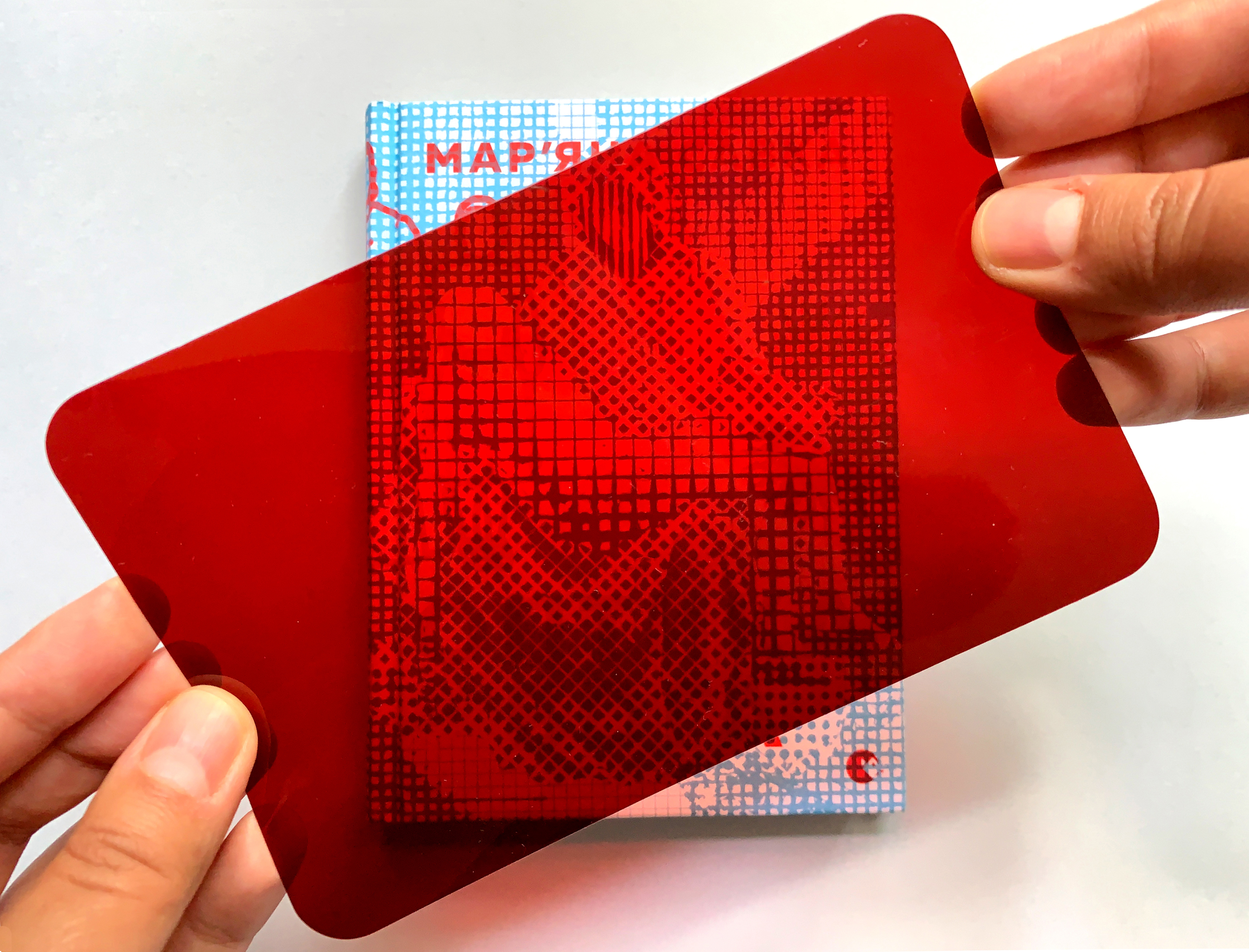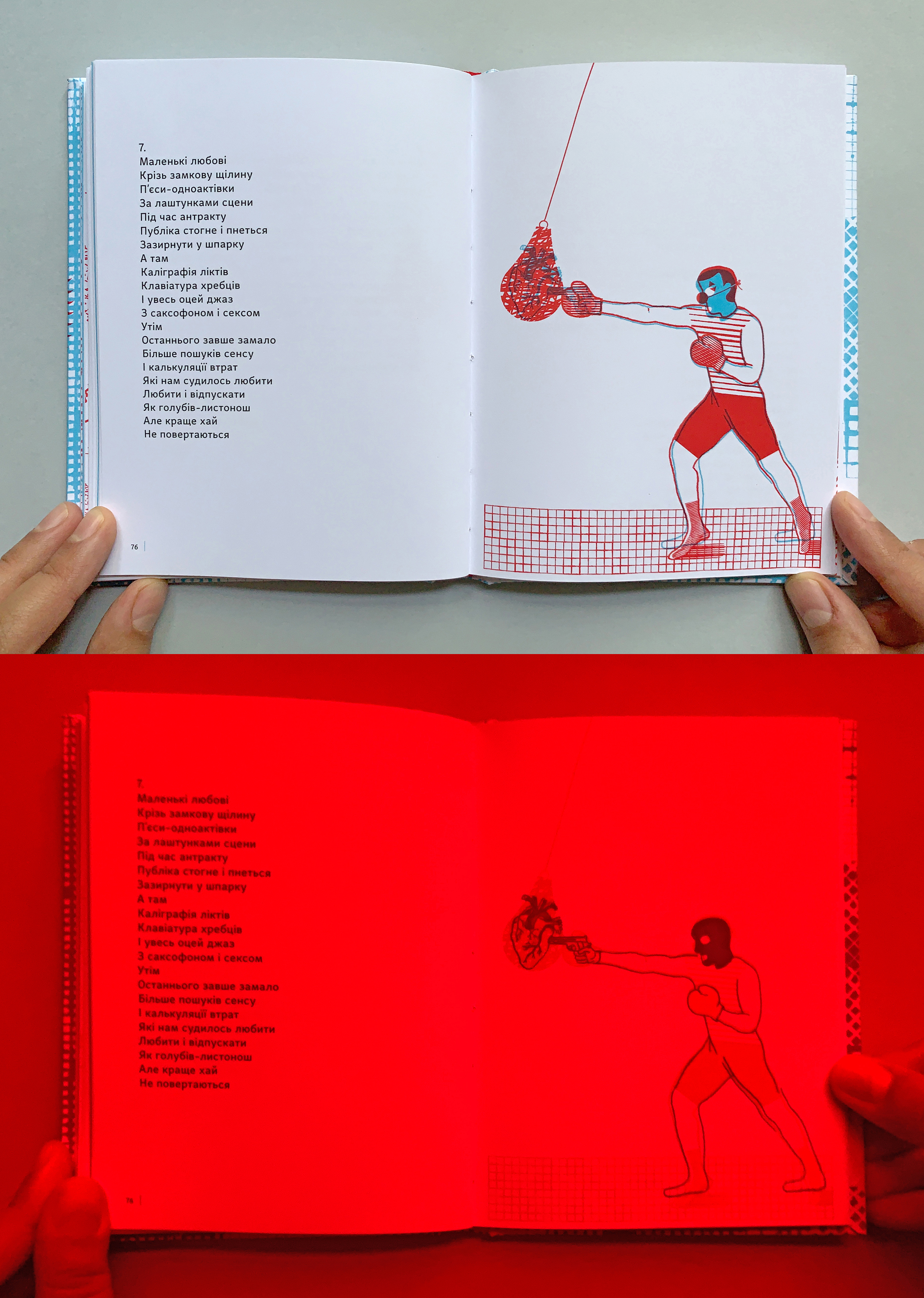 Optics of God – illustrated book of poetry by modern Ukrainian author Mariana Savka. Each illustration is printed with two colors – blue and red. Reader can look at the picture with a naked eye and through the red filter attached to the book, and the image will change.