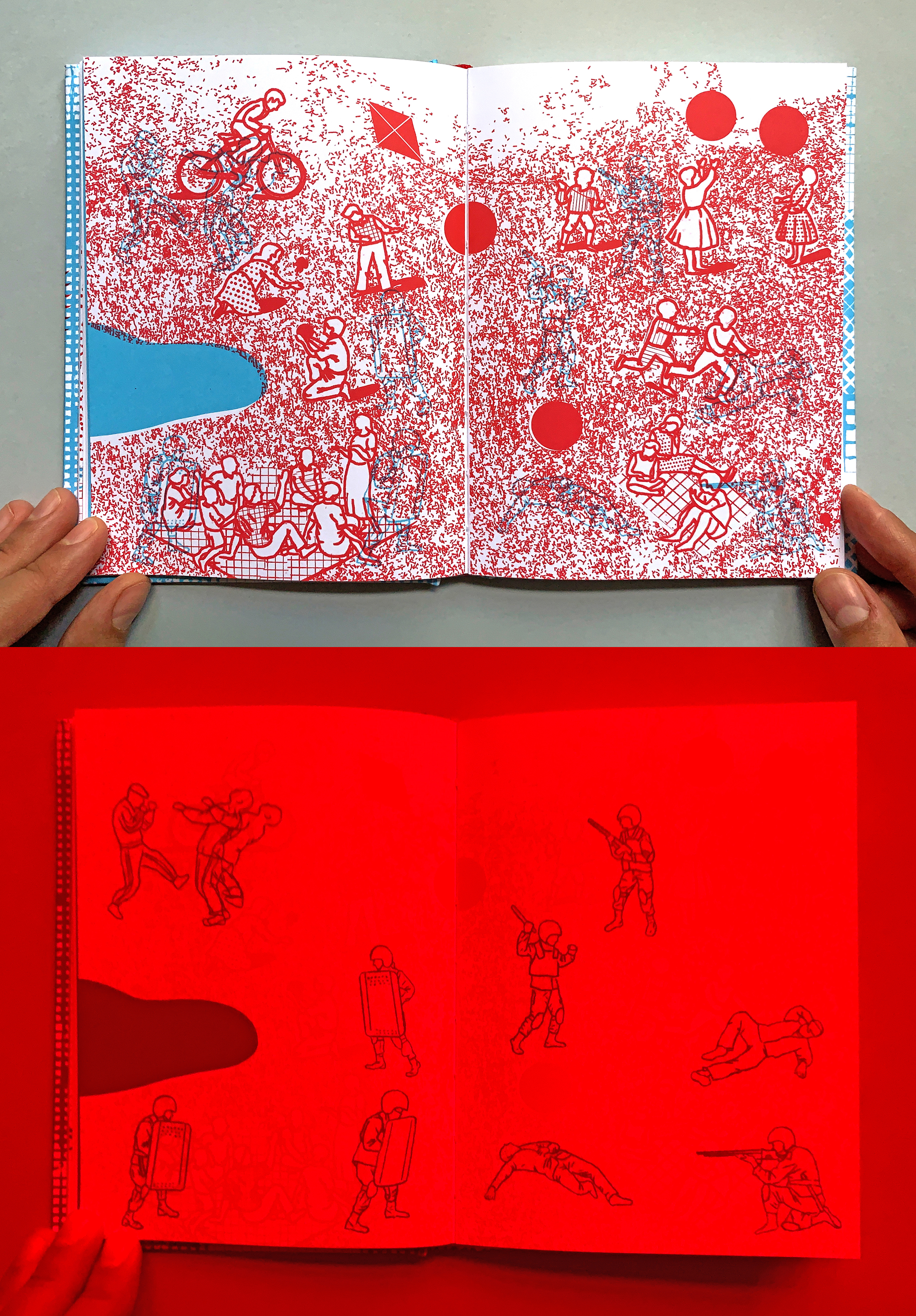 At a time when reality is increasingly perceived through Instagram filters, when the original image is washed away, distorted, mutated, it becomes difficult to maintain the clarity of vision. The optics of perception is changed, and it is not easy to separate the real from the fake, to see clear through the visual noise. And what if you could have your own filter through which everything can be seen clearly? The red filter in the book "Optics of God" shows hidden images and symbols, like the photography processing in darkroom’s red light. Something new is being revealed. So, as we look through the book using this filter, it is like we are looking through a dark glass at the sun eclipse. Red-blue illustrations where the lines are like vanes. Only the filter cuts off the extra, allows you to look behind the surface and we clearly see another layer. In the illustrations for this book we work with the concept of illusion and truth as opposed to it. We explore these two sides of the coin that create one whole – peaceful life and violence, happiness and loneliness, love and hate. We also reveal the biblical subjects and their dualism – life and death, good and evil. And of course, we do not stay out of today – in illustrations optics appear to be civil protests and war. And television, as a symbol of what precisely shapes the optics of the many people. It is difficult to realize that both good and bad deeds can be done by the same people. The optics of God are the ability to see life in two layers at the same time. And only the optics of God allow to divide this reality into separate colors and look beyond, to see the bigger picture. The book "Optics of God" guides the reader as a pilgrim, a road of trials and self-awareness. And only God knows what lies ahead.