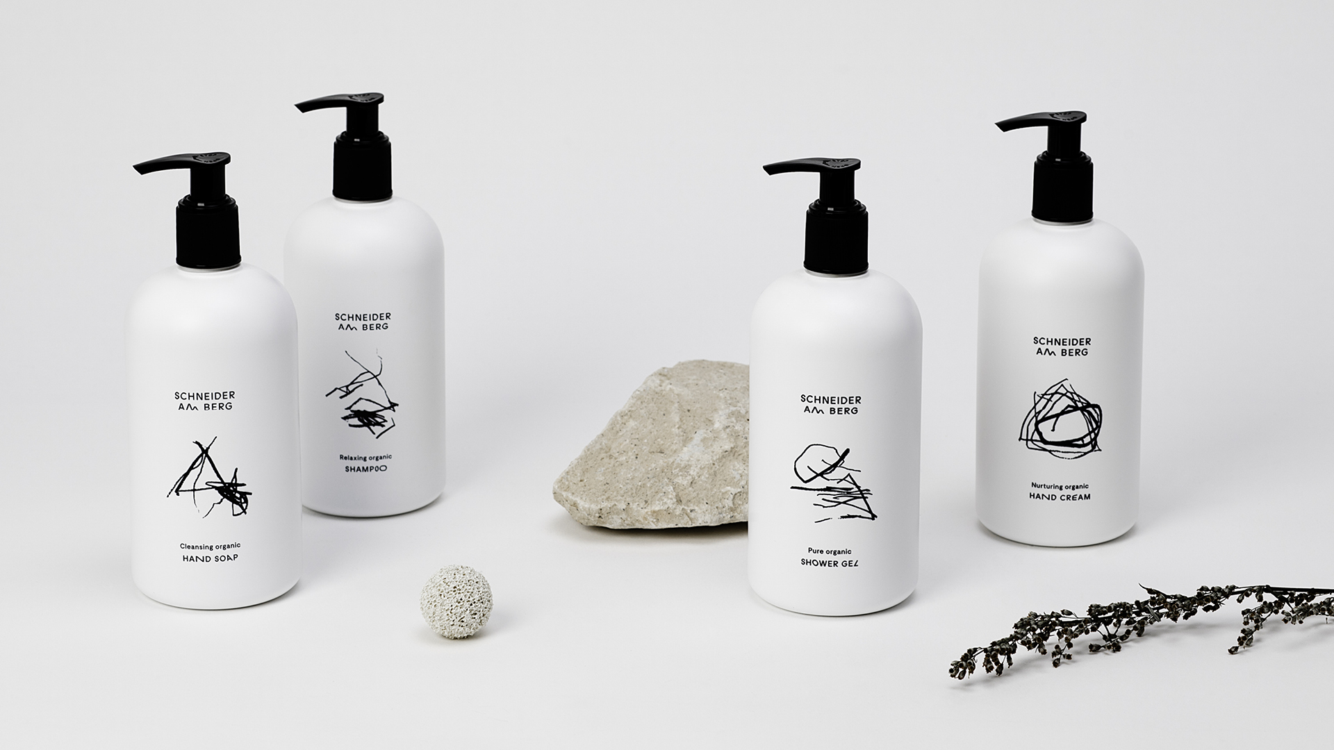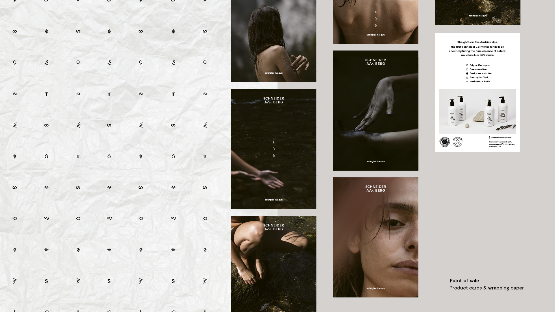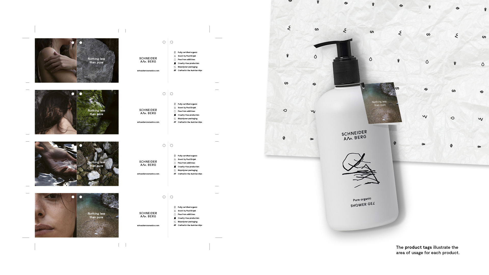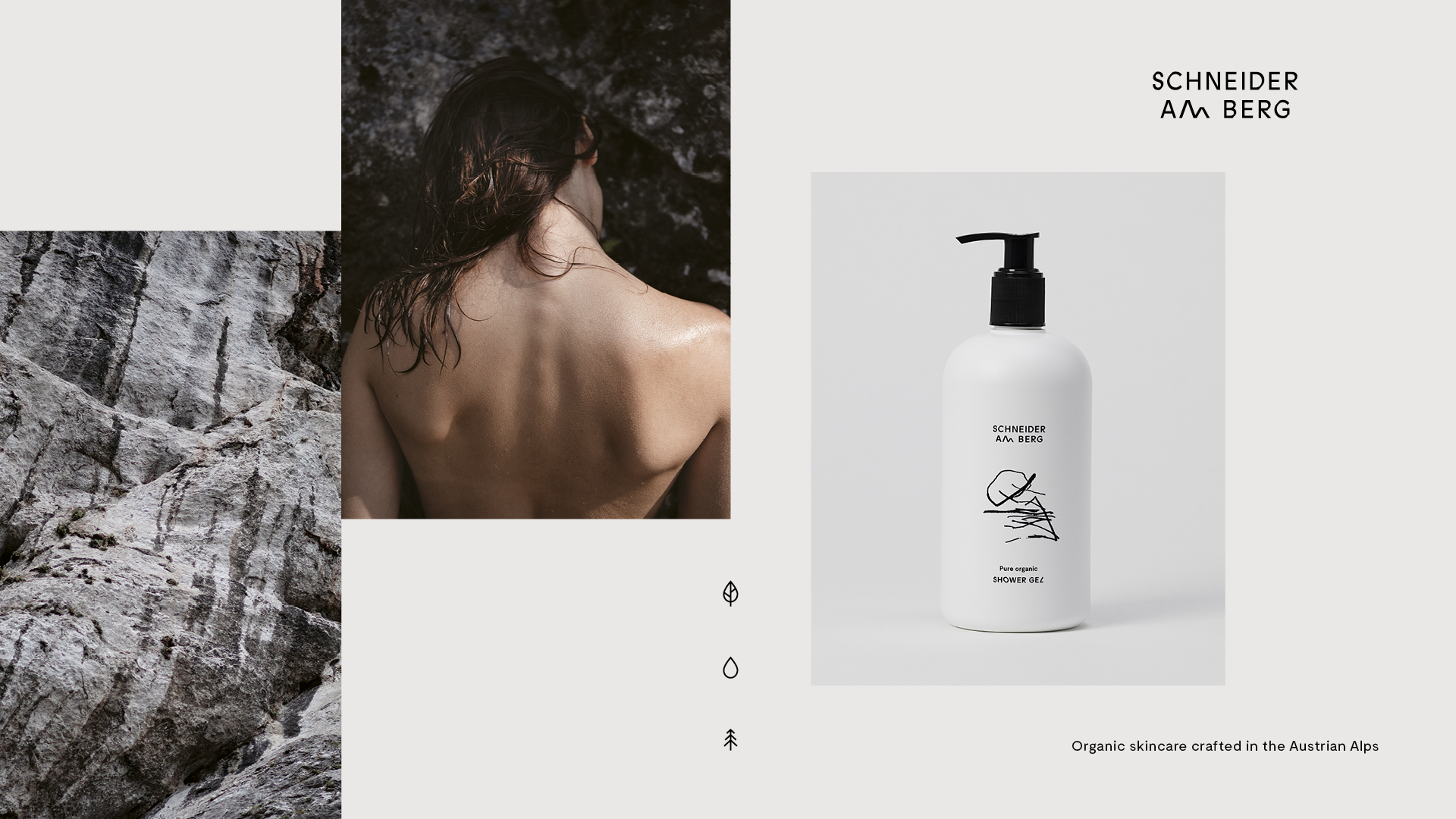 Schneider am Berg is the first product line by Schneider Cosmetics, a new Austrian lable who focuses on all organic skincare, handmade in the Austrian alps. Based on the concept »Nothing less then pure«, the packaging should stand out inbetween the variety of rather generic »apothecary« looking brands. The goal was to set a clear statement not just with the products itself but with a confident and uncompromising appeal when it comes to skincare. All bottles consist of 100% bio-degradeable polymere while the metal tubes are made of recyclable aluminium. The first product range is called »am Berg« which means »on the mountain«. For the design two contradictory aspects were blended together: The clean pure and the rough wild that could be seen as the nature in all of us. Therefor the visual profile was set on balance and discontinuity to emphasize the uncompromising brand approach. The colors black and white, a special detailed typography, custommade glyph extensions and icons became the collective tone of voice. An abstract mountain symbol for each product breaks the white purity of the containers. Silkscreen print, wrapping paper and product tags on haptic Federigoni Constellation paper finished off a successful product premiere.