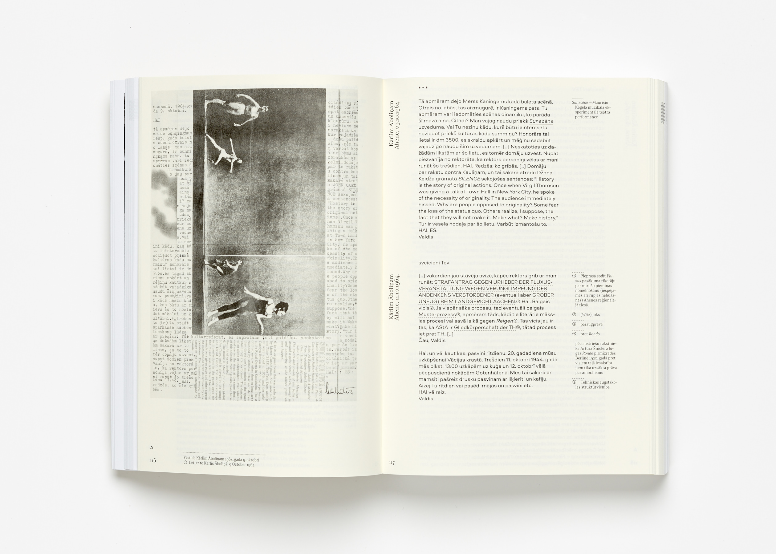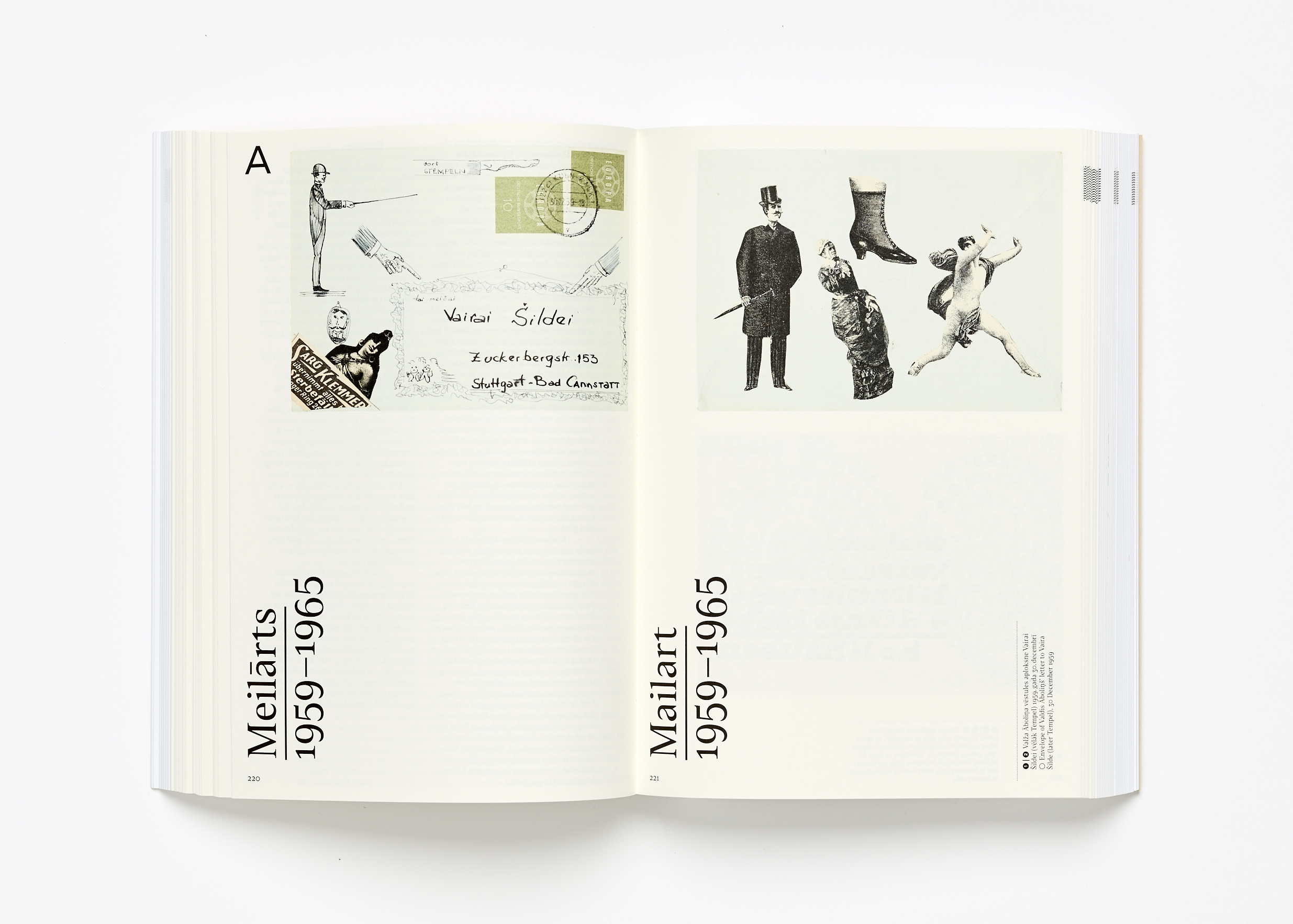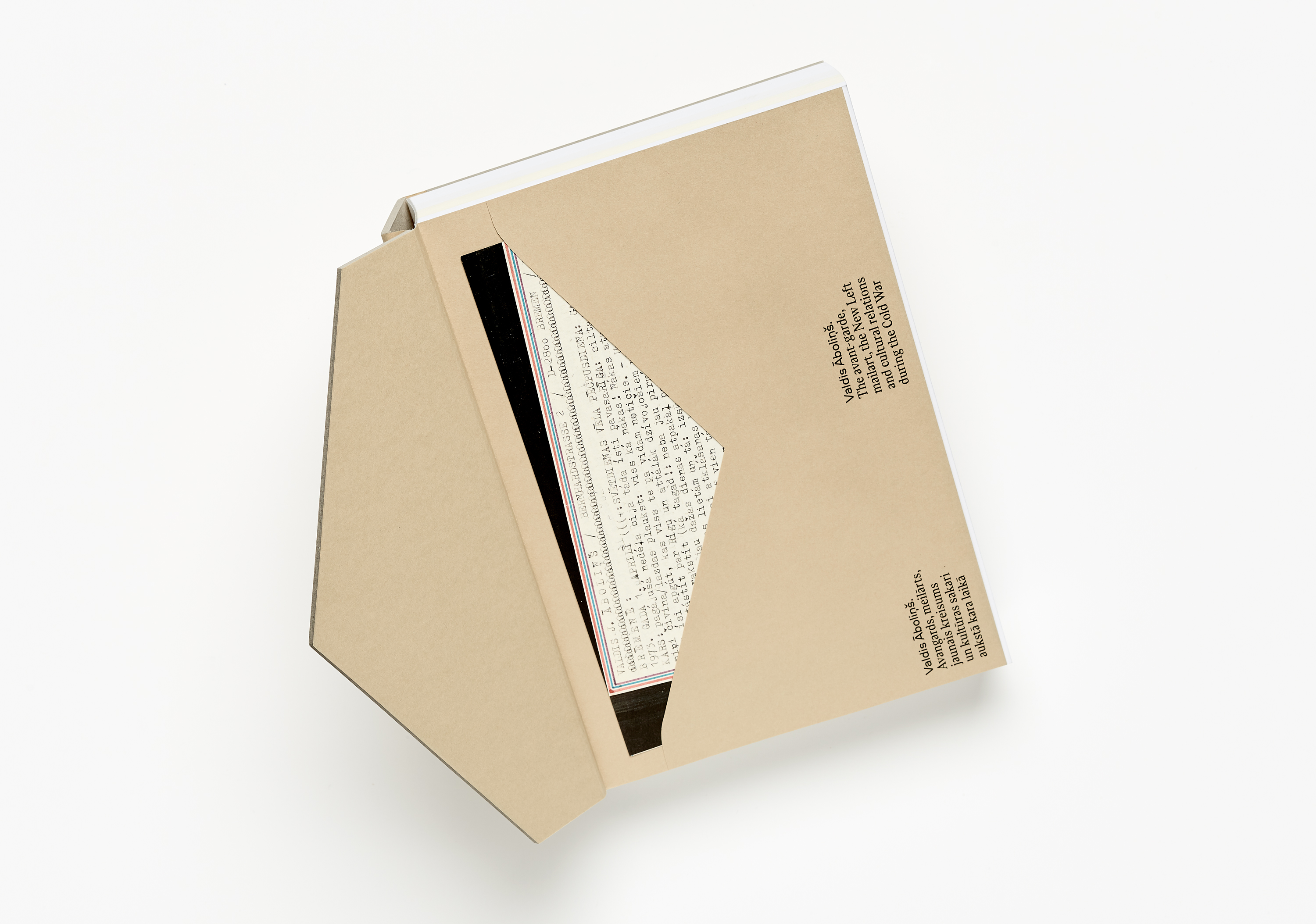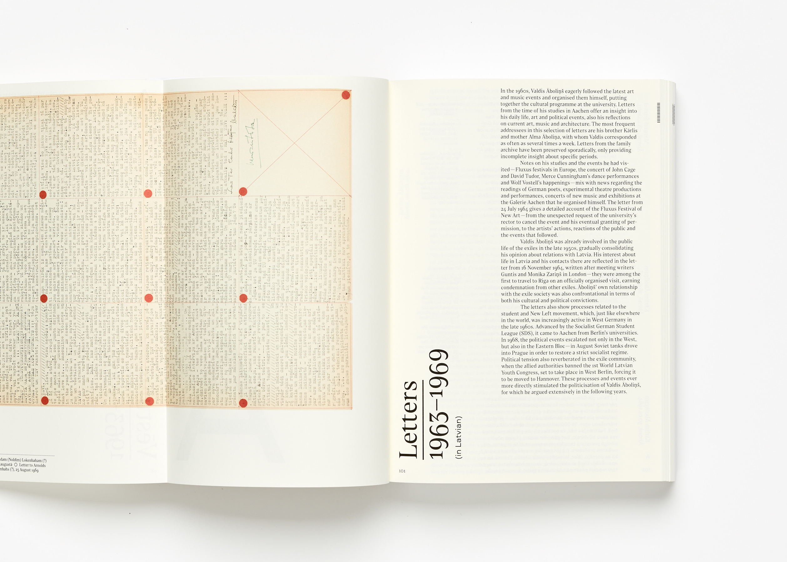 The book is dedicated to Valdis Āboliņš, Latvian exile, cultural activist, the driving force behind the Fluxus movement in Aachen and nGbK in West Berlin, virtually unknown in Latvia. His work and heritage, similarly to a lost and found message, was finally delivered to Latvia in this envelope-like edition, a reference to mail art — his passion and way to communicate with the outer world. The book consists of Āboliņš’ letters’ transcripts, essays exploring his biography and cultural context, and a selection of his mail-art pieces and drawings, divided into three sections (A, B and O). Each book holds one of four facsimiles of his letters.