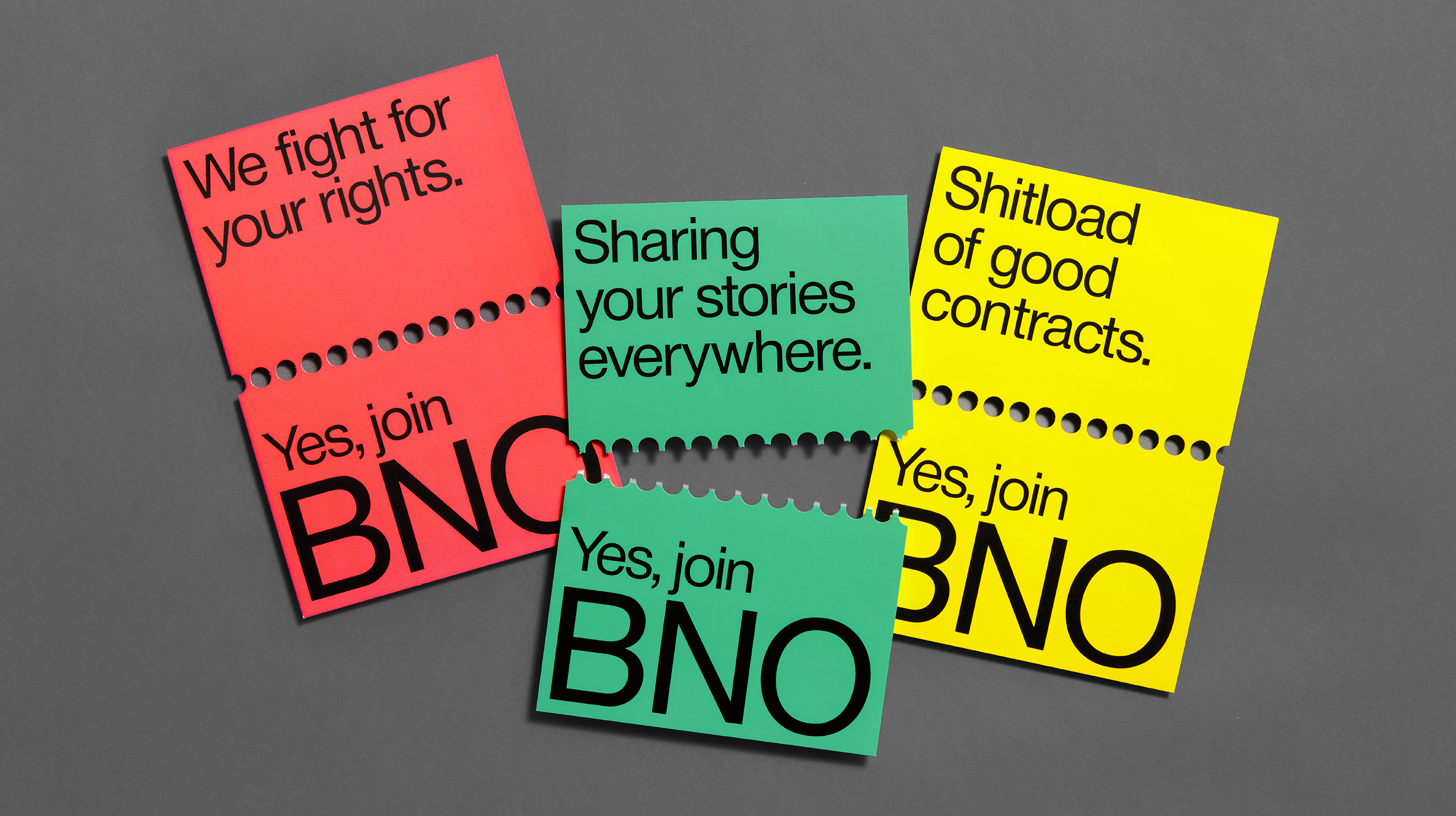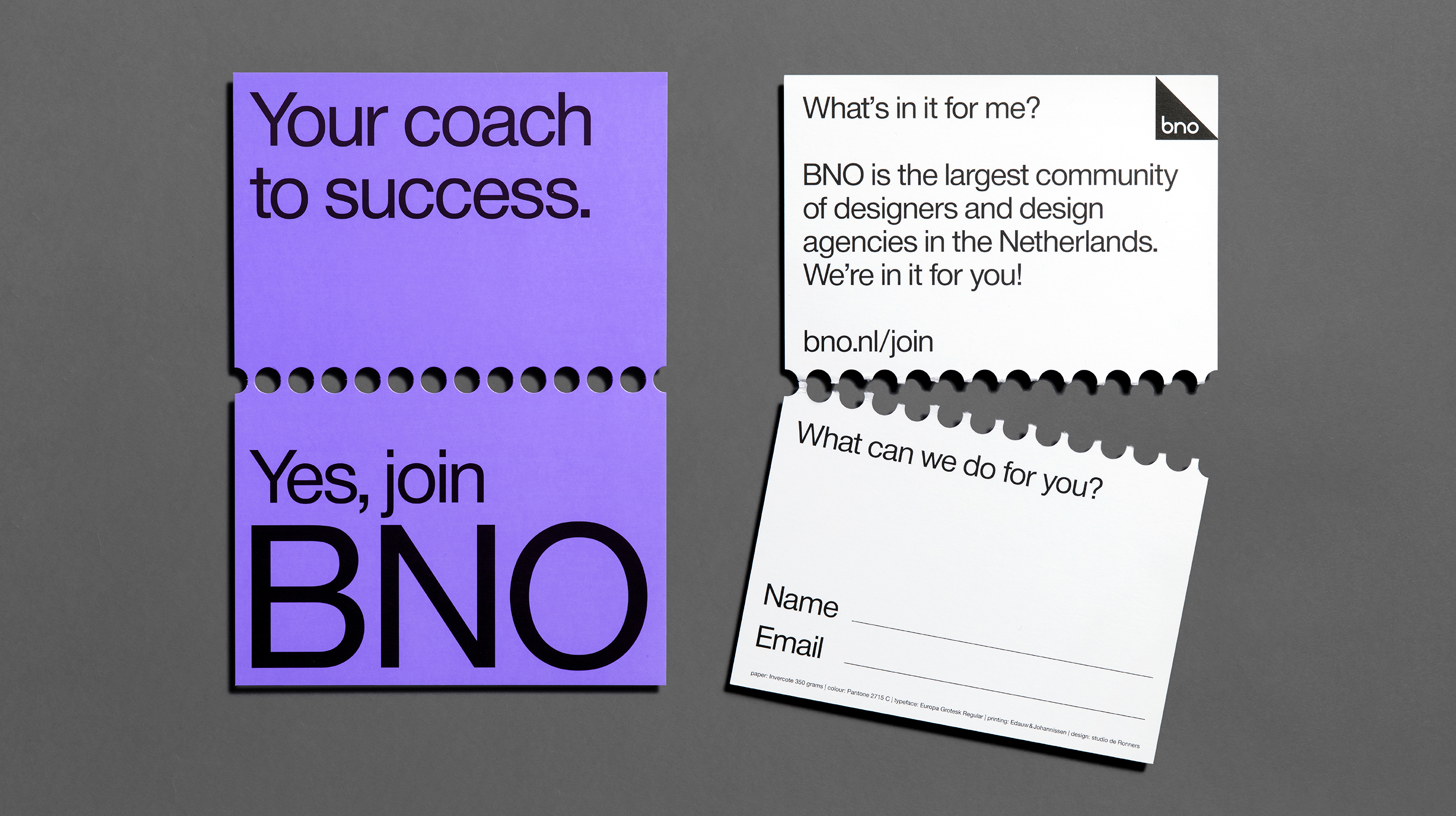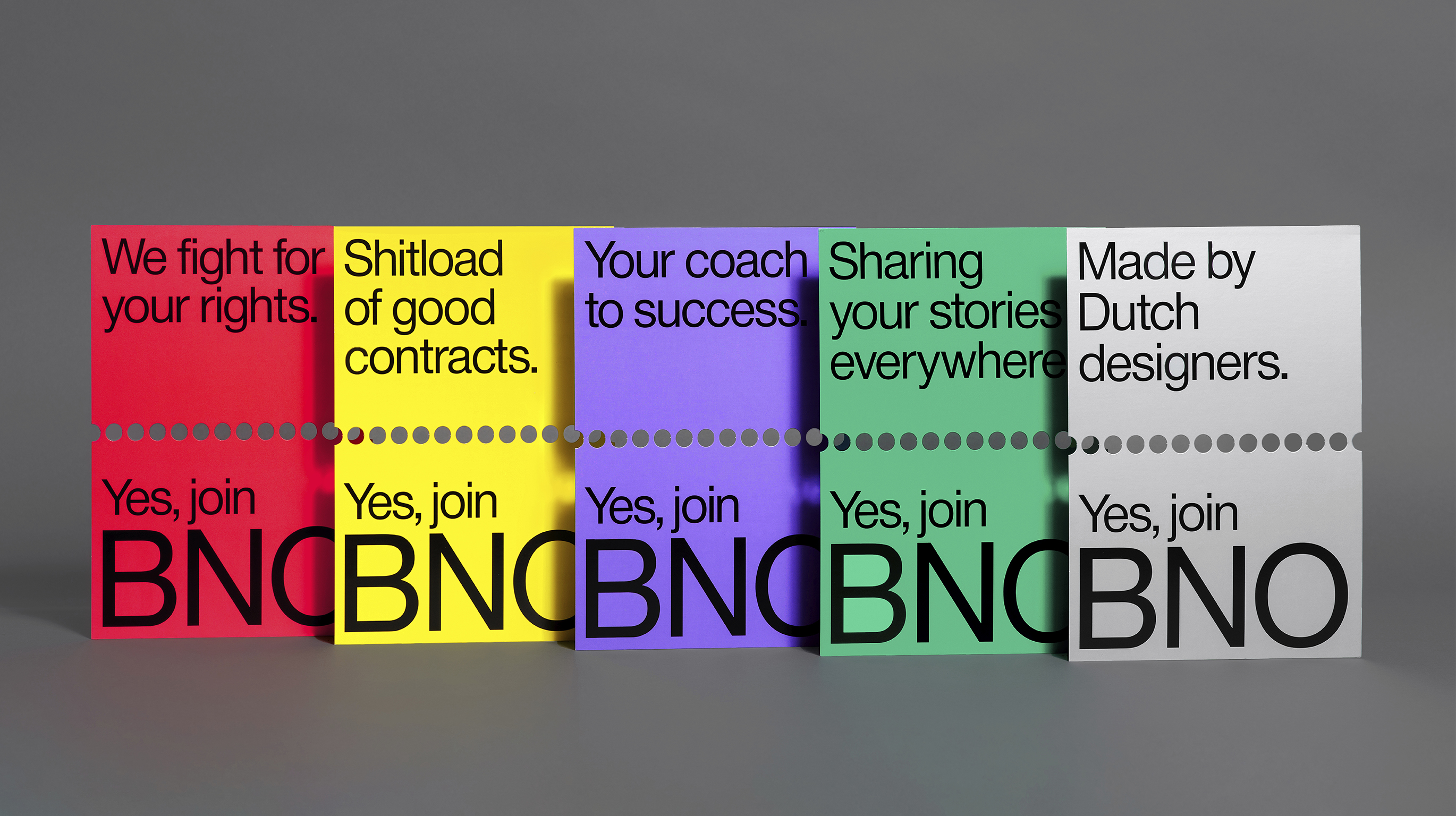 To kick off the new promotional campaign, we designed a flyer series aimed at the most critical audience imaginable: designers. To make them notice the BNO, we created pieces of eye candy: we came up with bold statements that we placed on brightly coloured flyers that immediately grab the attention. BNO is presented as “Your coach to success” or providing a “Shitload of good contracts”. The main motto, “Made by Dutch designers”, says a lot about BNO in just four words, and is the key to this campaign. We are Dutch designers, just like you, so join us!