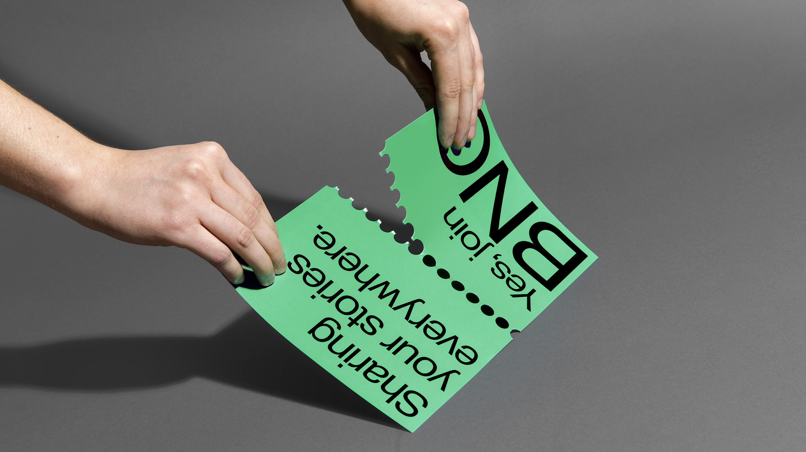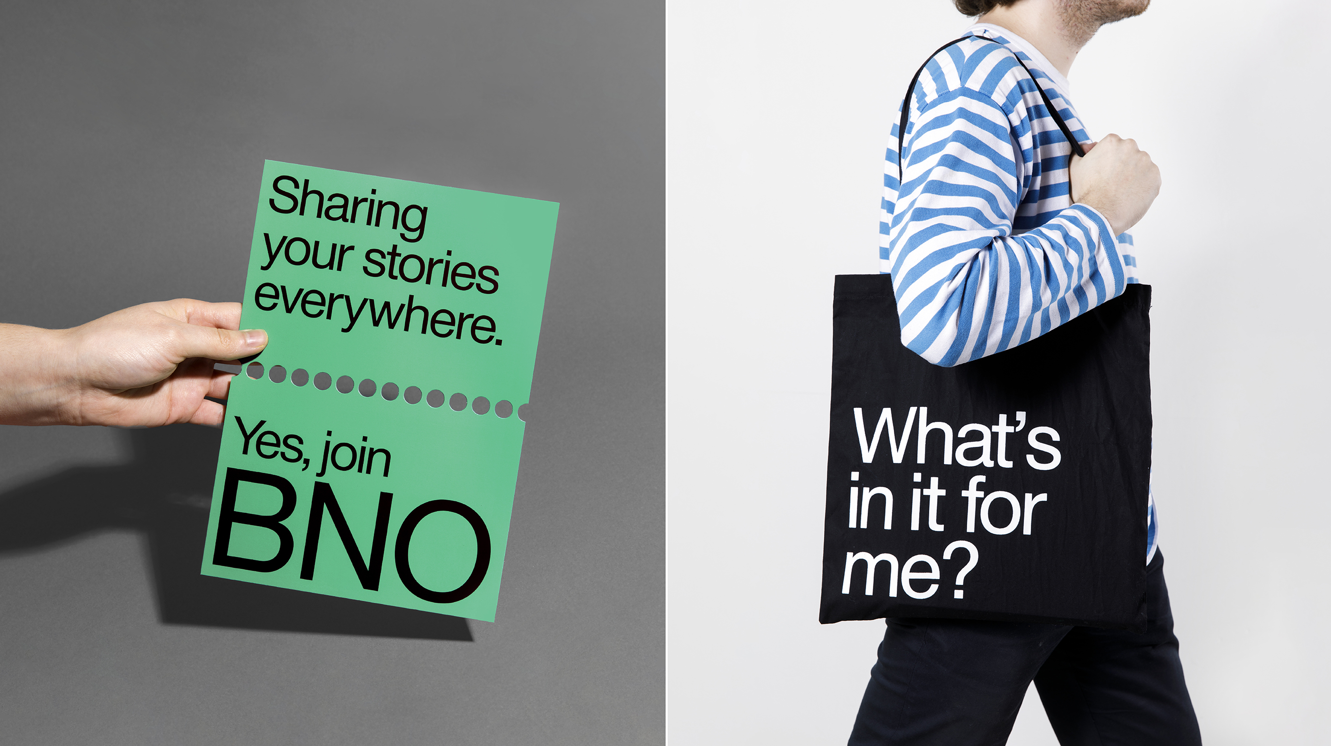 The flyers, handed out by BNO crew from our BNO tote bags, were meant to encourage direct interaction between the designer and the organisation. They consist of two parts, each triggering a different reaction. The top half asks “What’s in it for me?” and makes you want to learn more on the website. You could also let BNO contact you by filling out the bottom half titled “What can we do for you?”. Choose a side and tear along the dotted line. The exaggerated holes are a cheeky way to turn a humble flyer into a monumental design object.