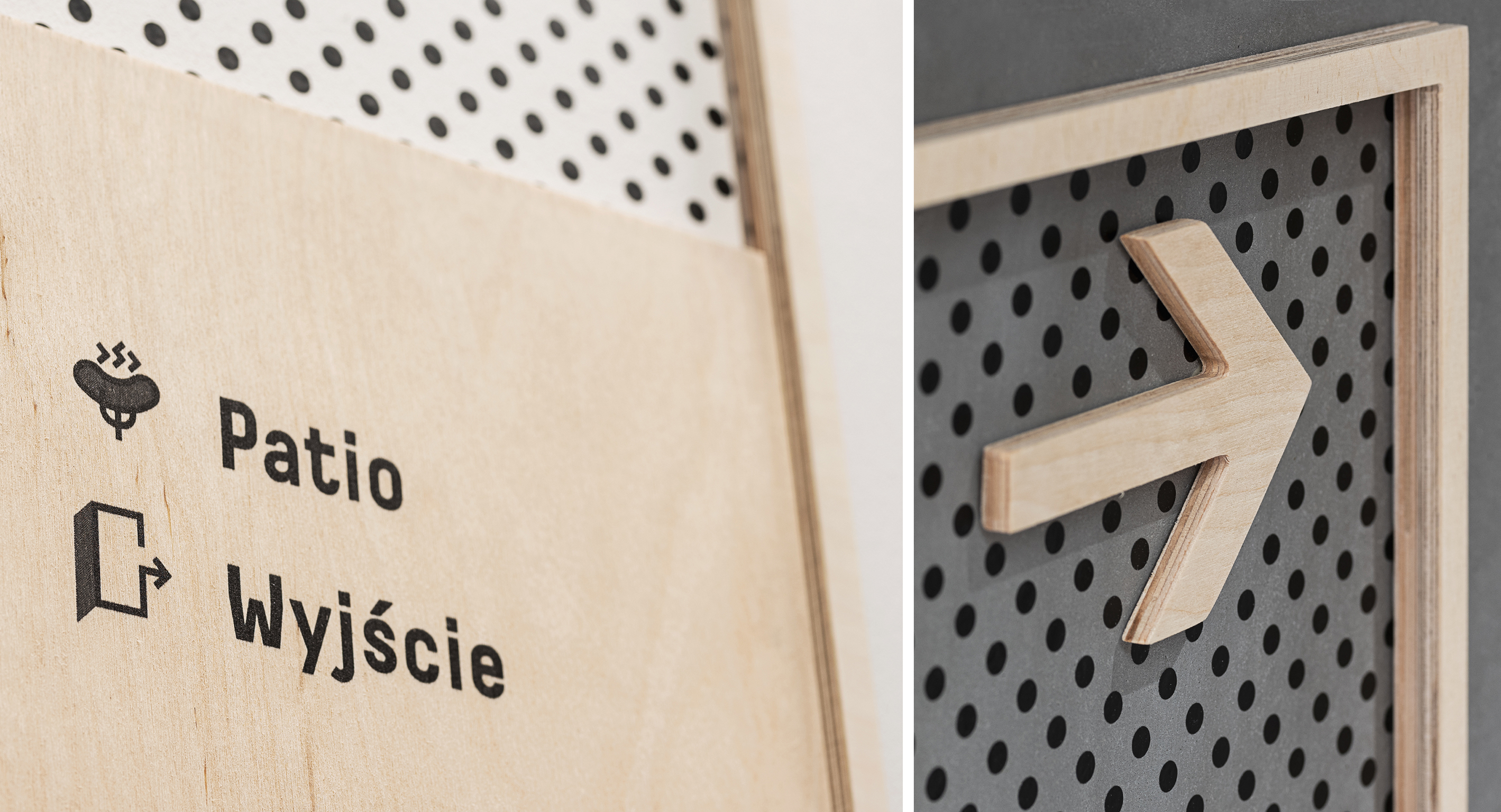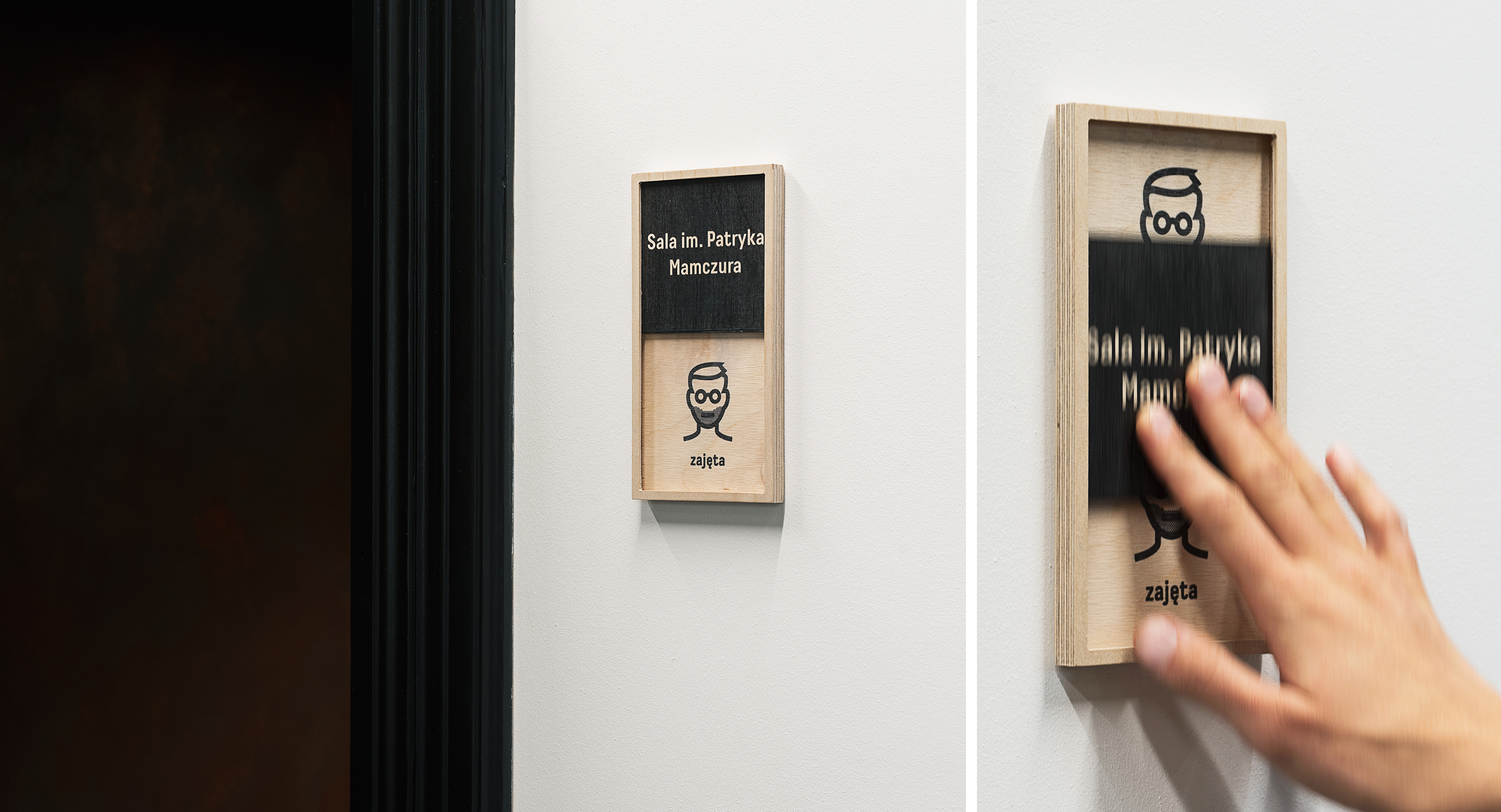 When designing the visual communication, we made sure that it would not dominate the interior architecture. In our design, we have decided to refer to the investment materials (mostly plywood), to choose an interesting typeface and prepare an original set of information carriers, which allow users to interact (a simple room occupancy information system, that can be changed by simply moving a plate element – and as a result of movement – discovering the changes that are appearing in the pictogram presented). Our goal was to design carriers that are fun in form and pleasant in perception. The whole process included creating all graphic and industrial design elements as well.