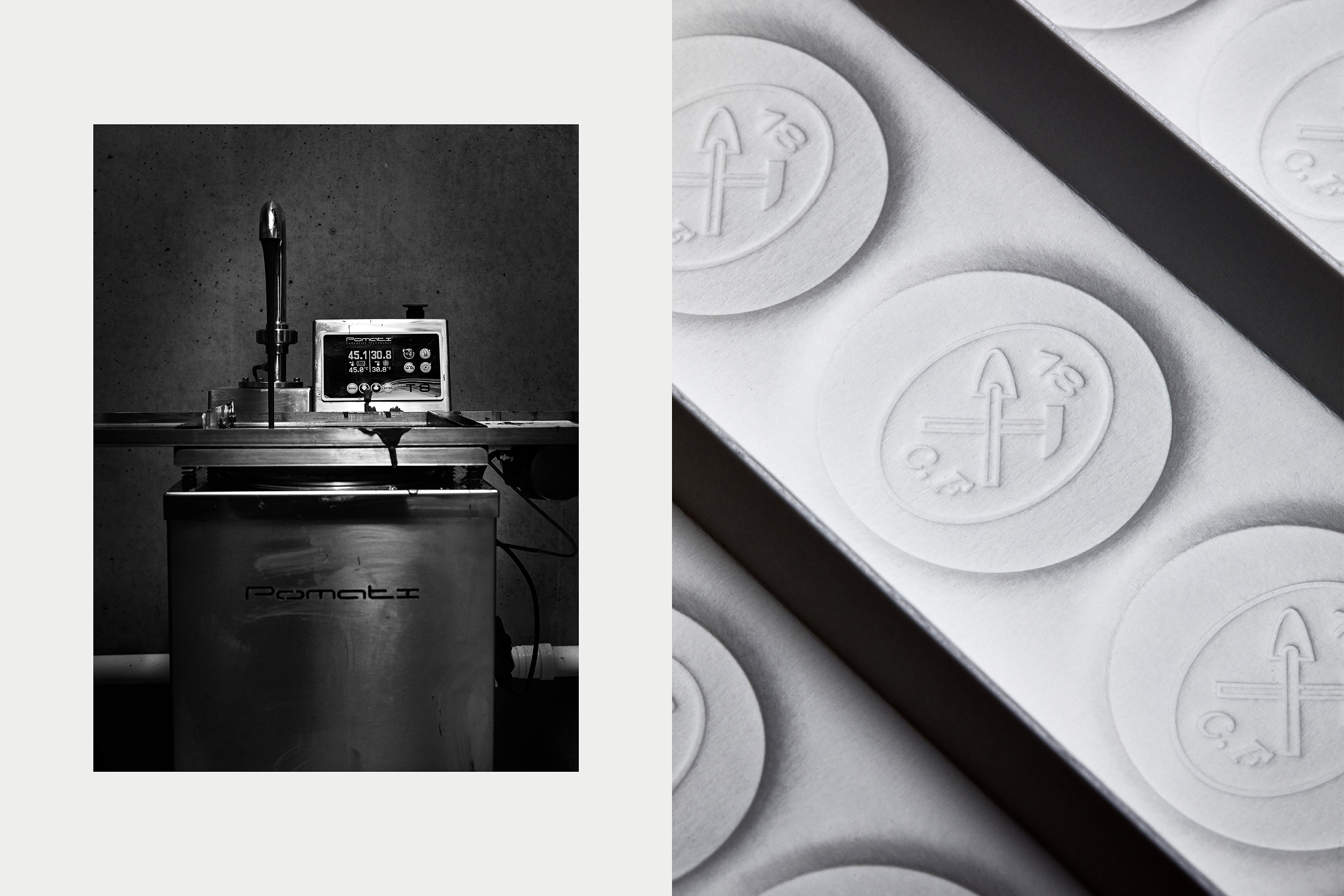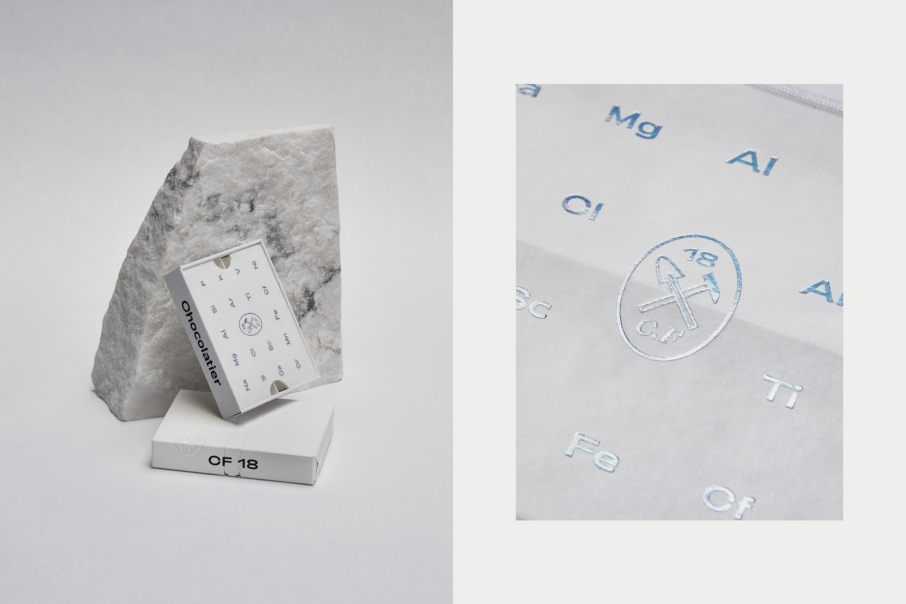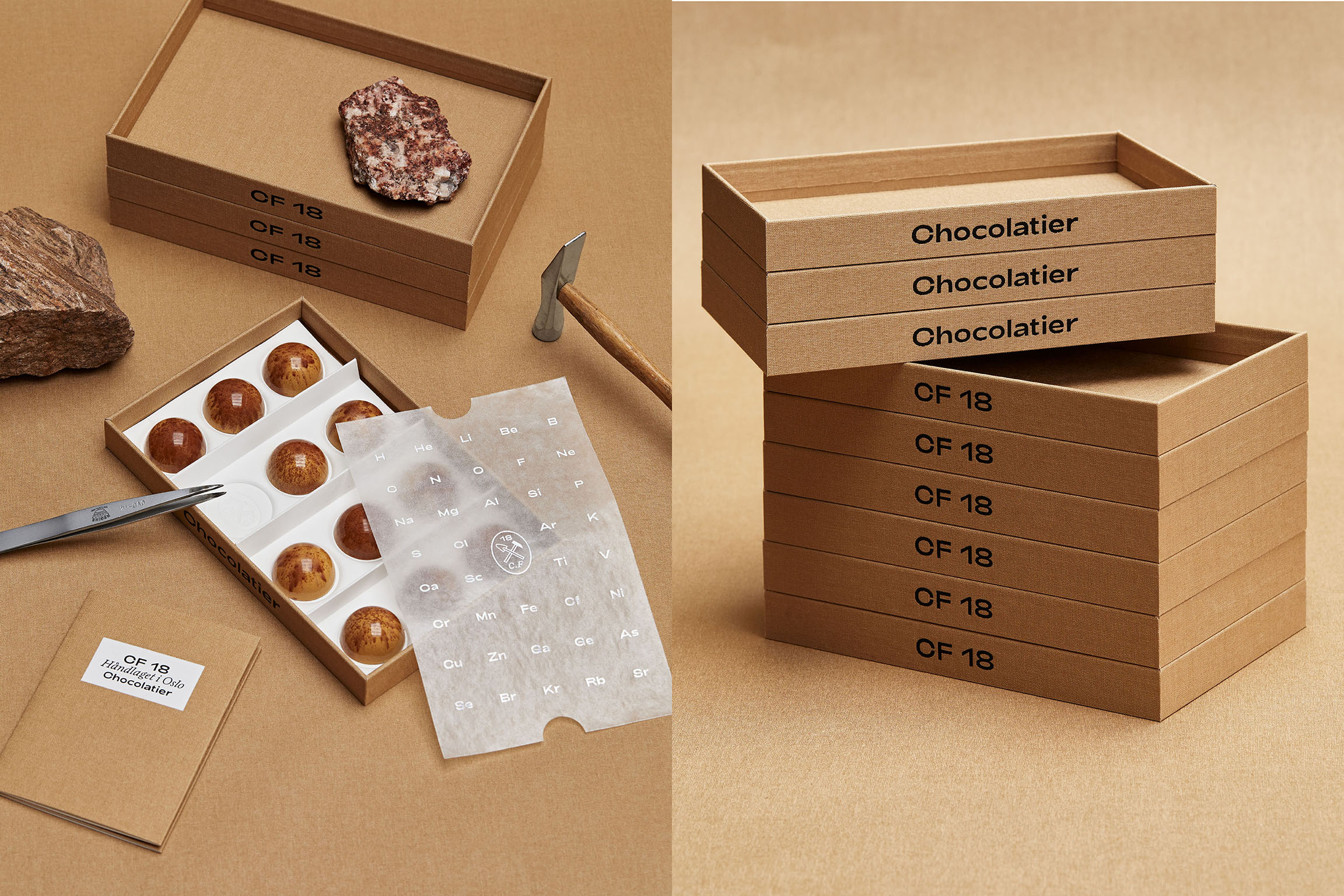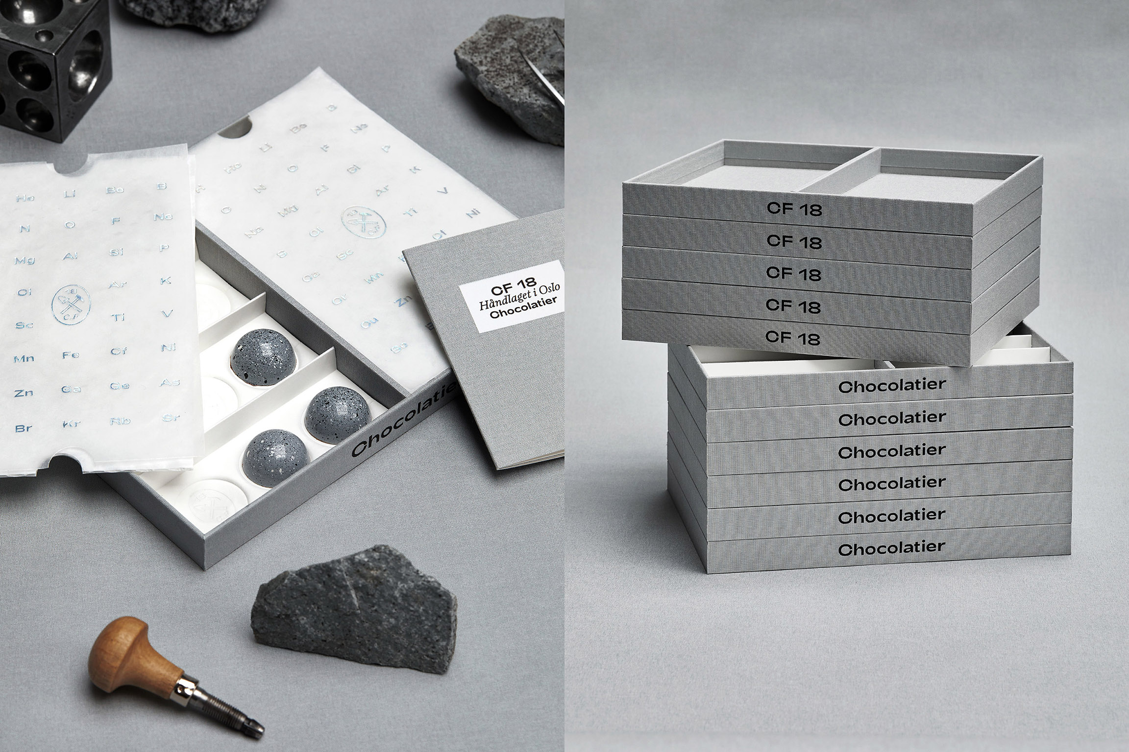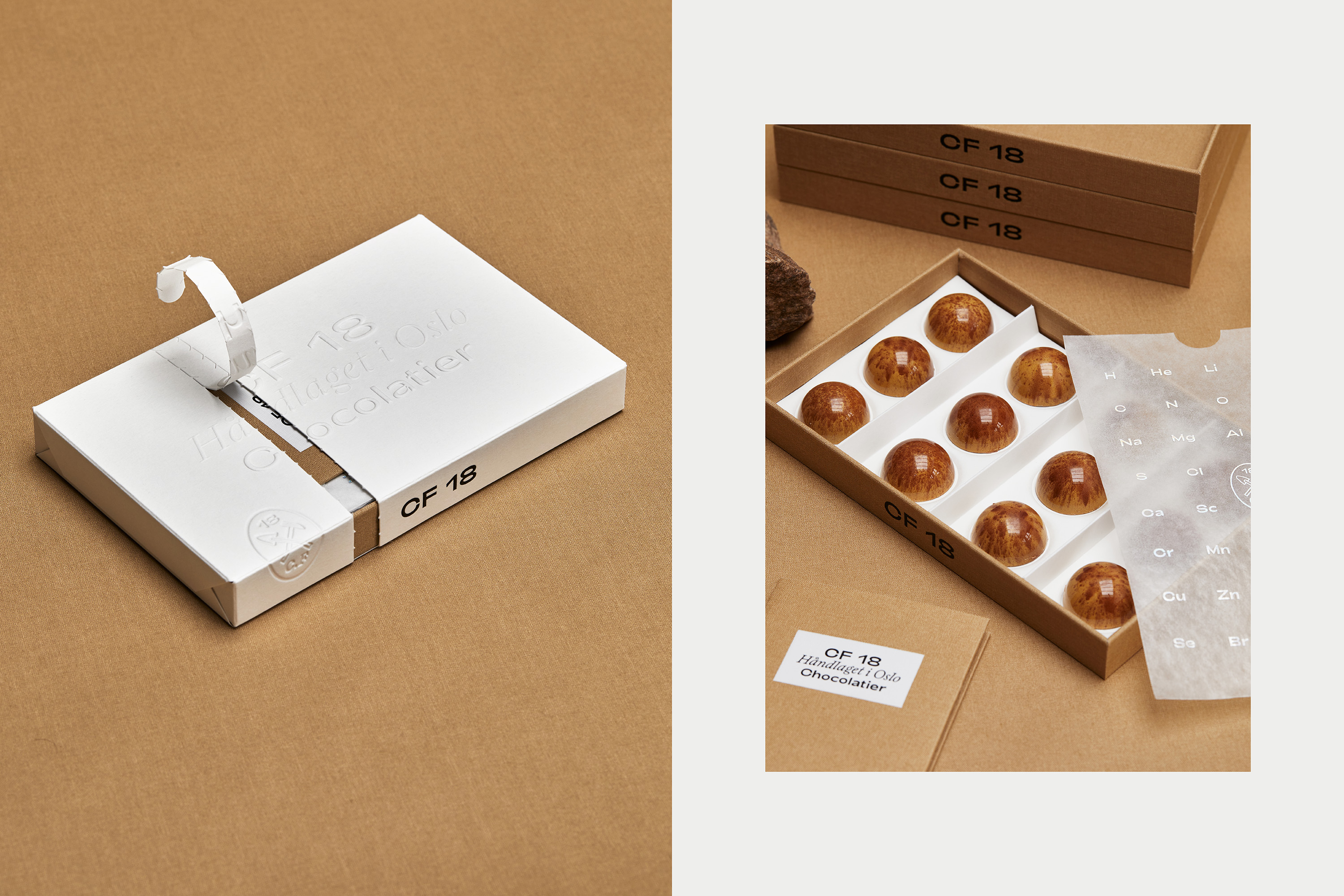 The oval brand mark portrays the tools common to both chocolatiers and geologists, to underline craft and creation. The foiled glassine paper with an extract from the periodic table, creates an additional and subtle link to chemistry and geology. These elements are balancing the contemporary philosophy of CF18, manifested by the white outer box, the tear-off, the monocrome palette and the choice of typography. We used a sans serif font (Adieu) from the Oslo-based foundry Good Type Foundry and a chiseled type (Laica B) from the Swiss foundry ABC Dinamo.