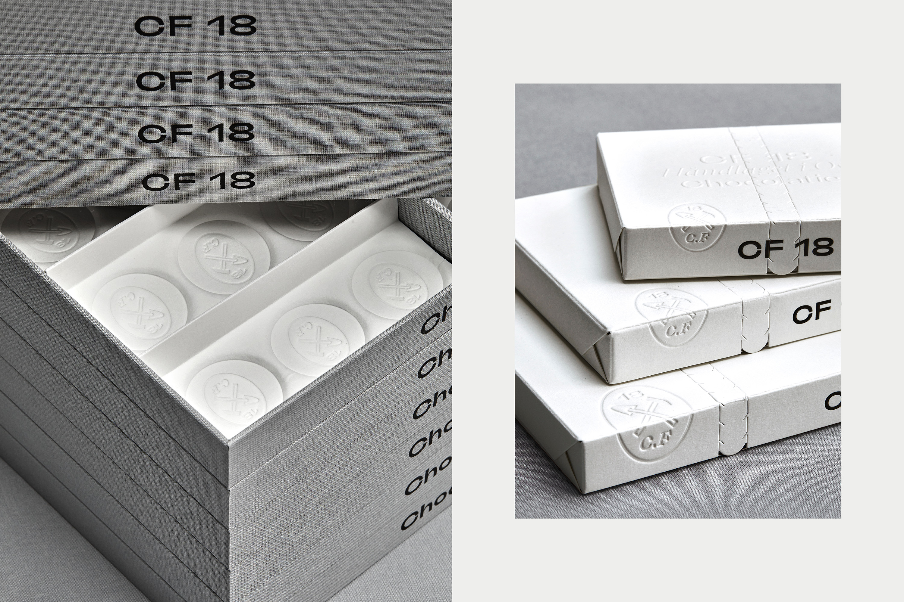 CF18 Chocolatier was founded by Christian Fredrik Furuholmen in 2018. Fredrik used to work as a civil engineer, but decided to change his life and went to study at Cordon Bleu in London, in order to realise his dream of becoming a chocolatier. The goal was to create an identity that communicated precision, innovation and craft. By customising all elements in the packaging and working with a new highly mouldable paper, we managed to avoid the plastic that usually goes into chocolate packaging.