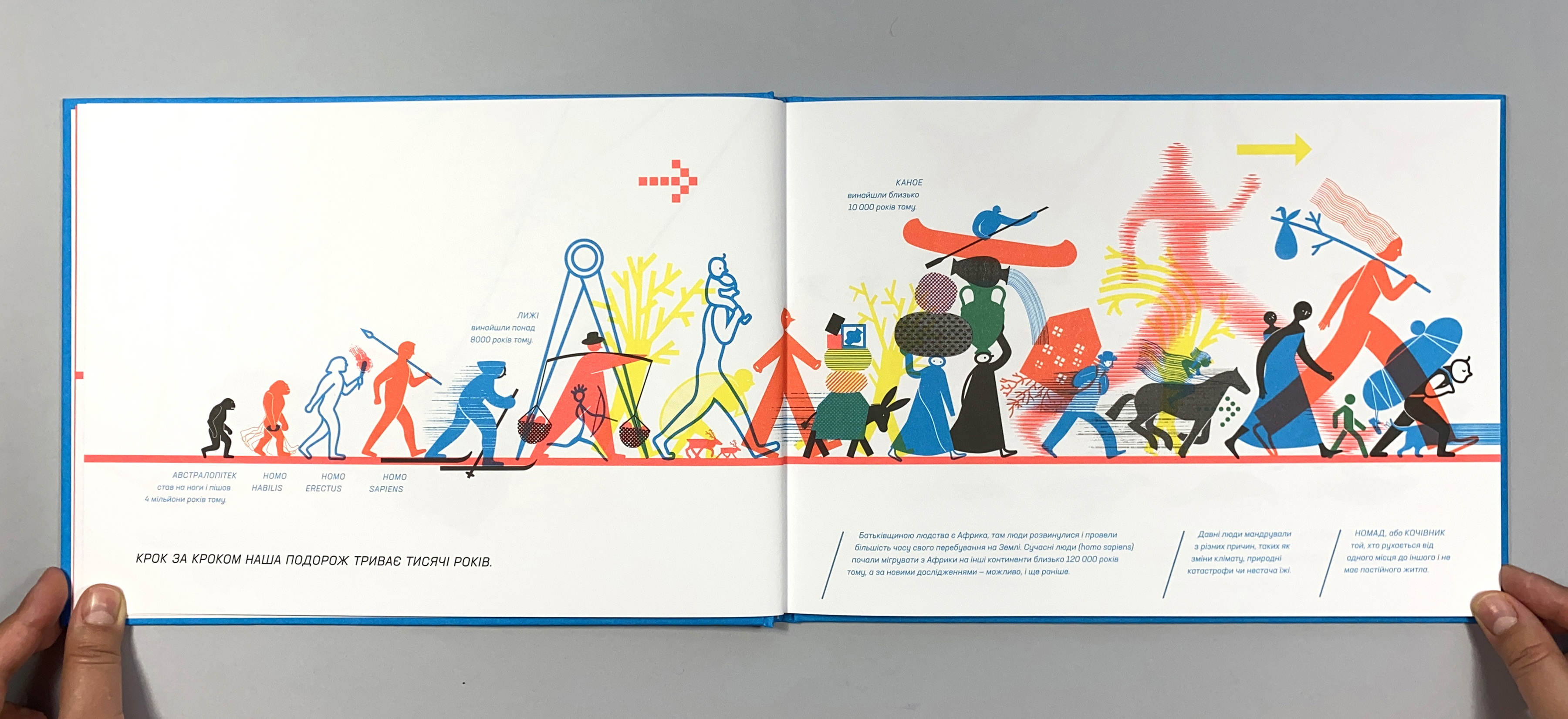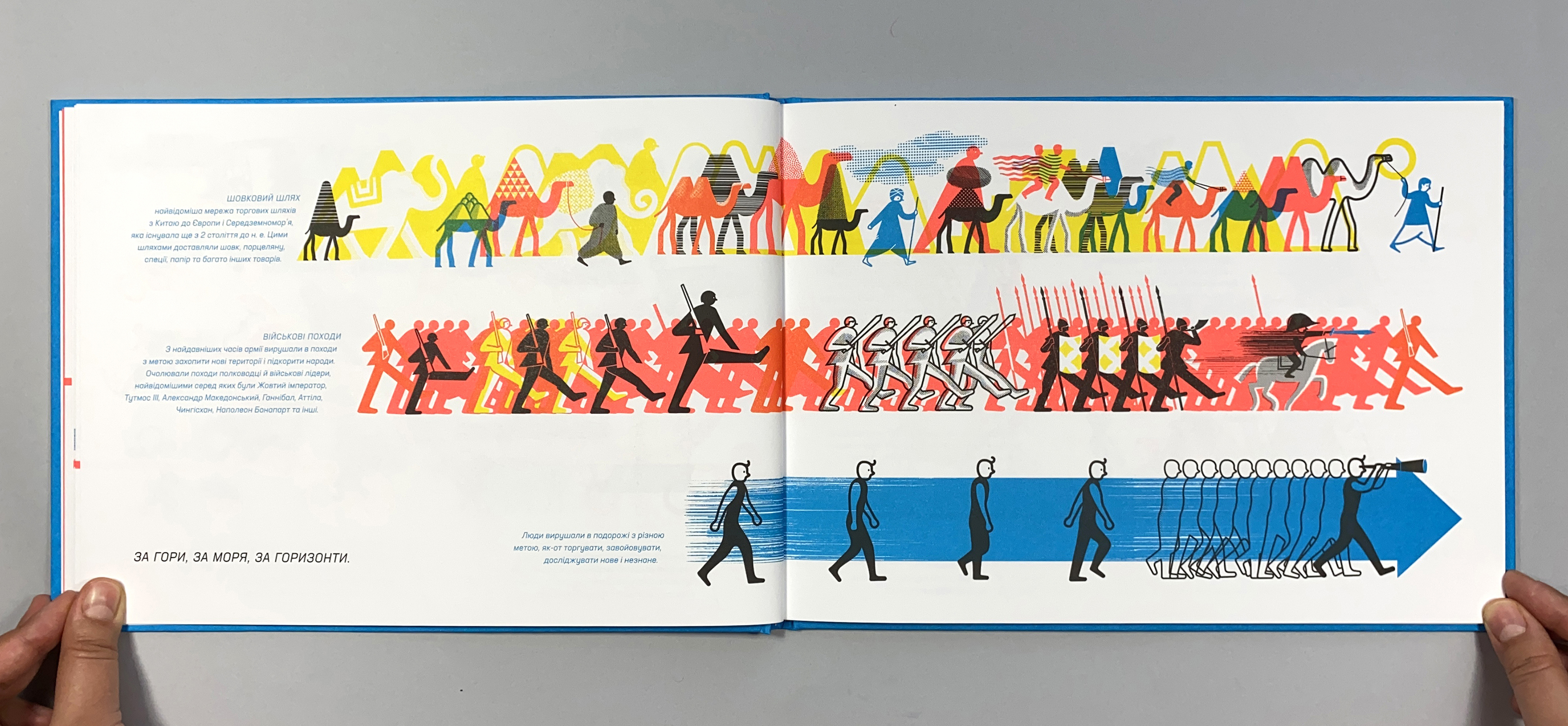 The universe is ever on the move: Nothing in it remains completely at rest. Movement is natural: The Earth, the water on it, the atmosphere, the continents, and all living organisms exist in a state of constant motion. We walk, run, jump, crawl, swim, and fly. We travel. This book is about movement and travel—not only by people, but also that of animals, plants, the wind, water, and our planet. It describes journeys for the purpose of trade and commerce, journeys for the purpose of pleasure and repose or for survival, as well as scientific expeditions and pilgrimages. It’s about migrations, maps, navigation, and, finally, about finding one’s one path. The one word that a traveler most often hears in his travels is “where.” “Where are you heading to?”, “Where are you coming from?” This book is a visual and intellectual expedition through thousands of years of movement, in search of answers to these as well as many other questions.