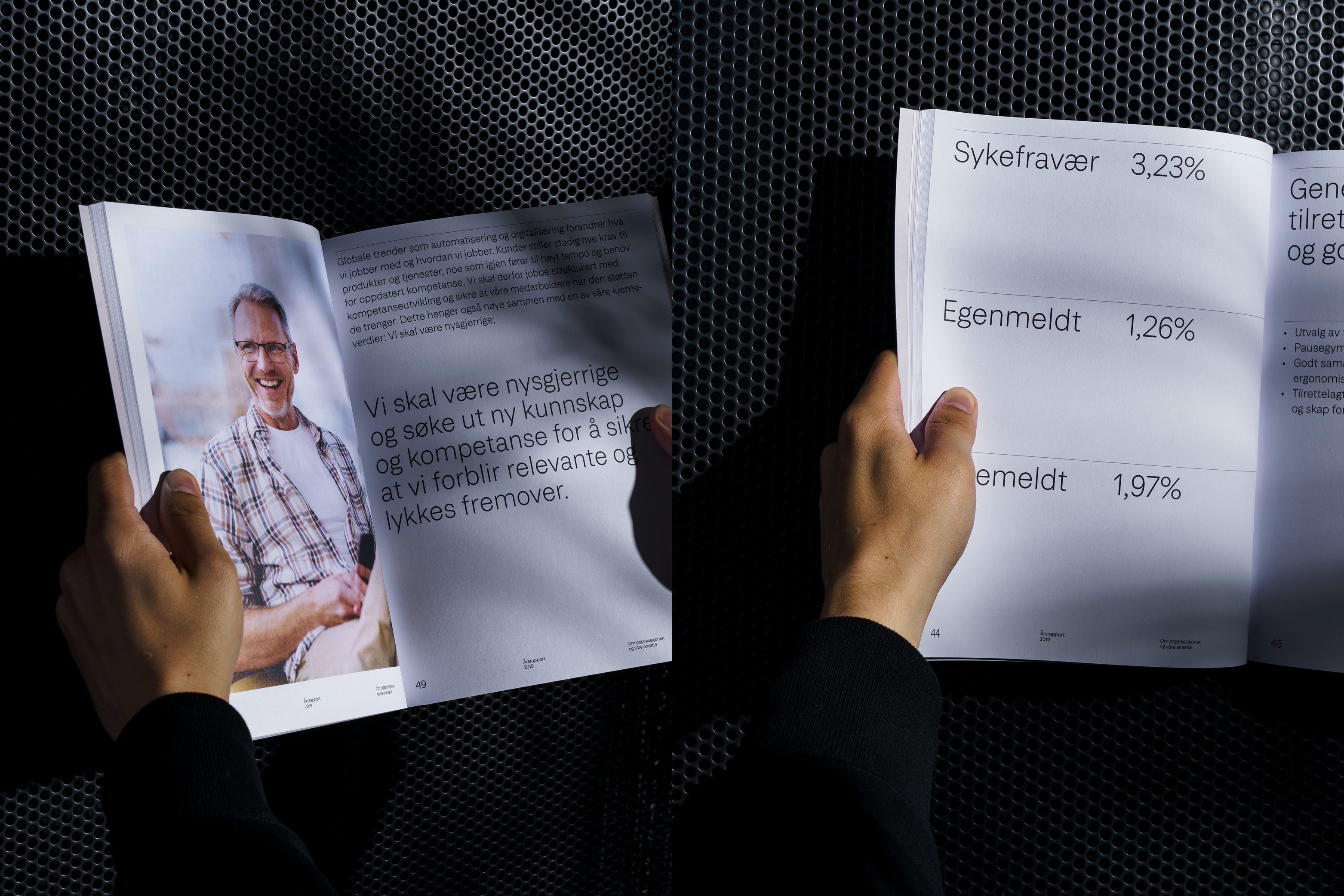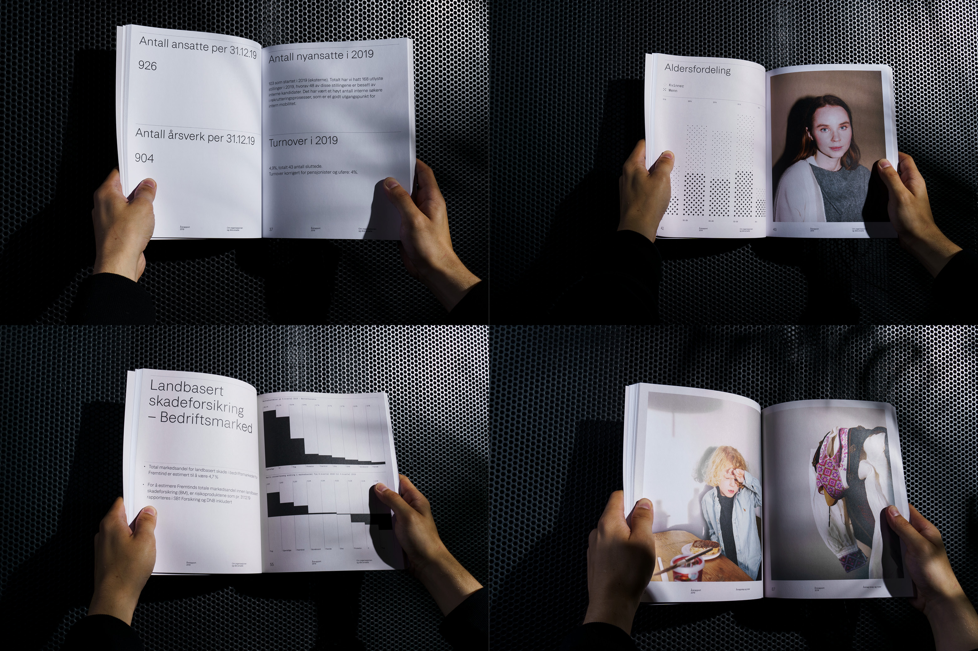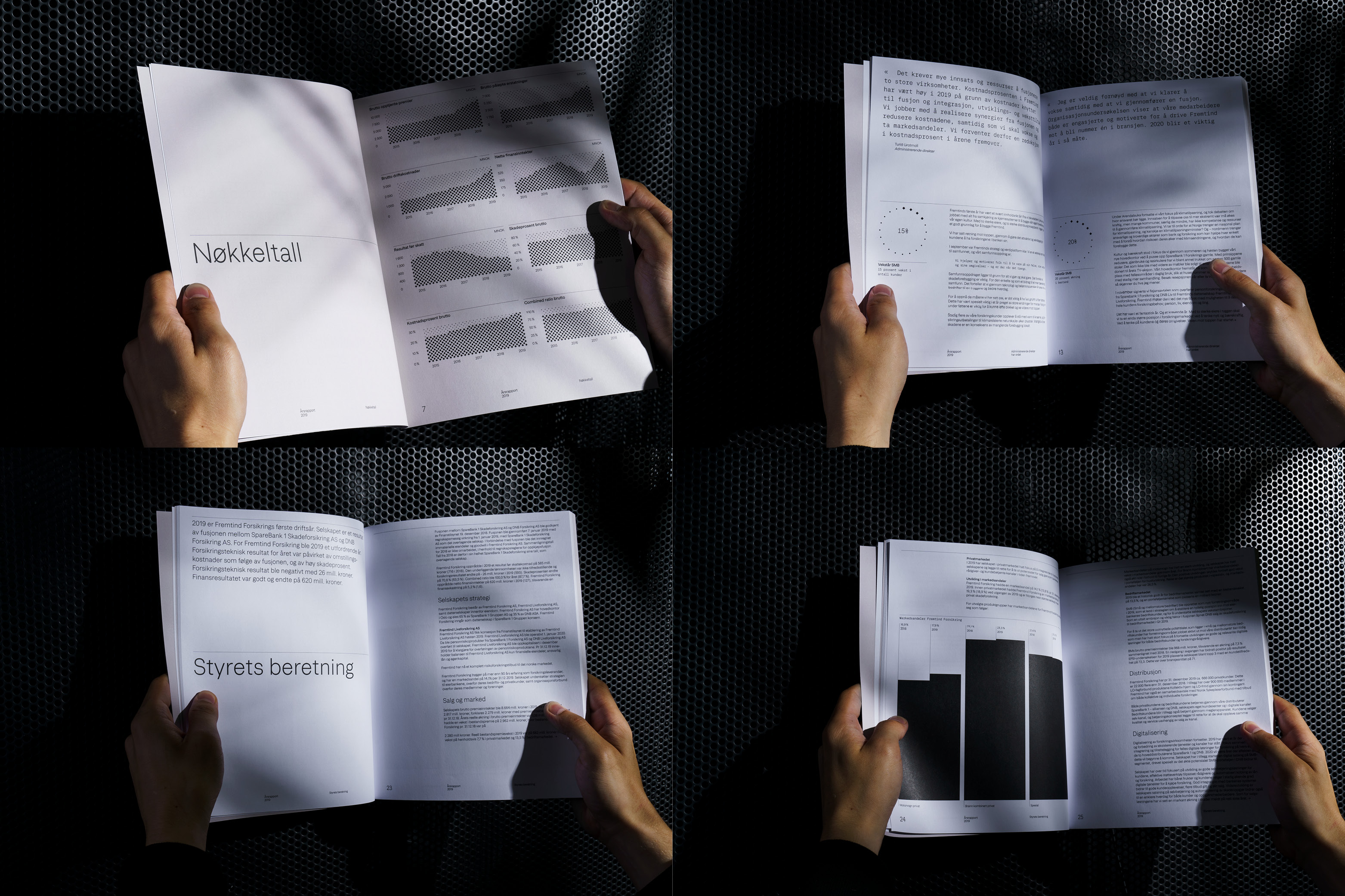 The report is set in Fremtind Grotesk, a type family containing six weights, drawn especially for Fremtind. The type is accompanied by earthly, identity photography, providing lively breaks to the pragmatic typographic approach. The layout is rigid and restrained, yet with room for flexibility. It ensures a consistent layout of text, numbers, photography and infographics. Typographic craftsmanship was key. We wanted the reader to be left with a sense of quality and solidity.