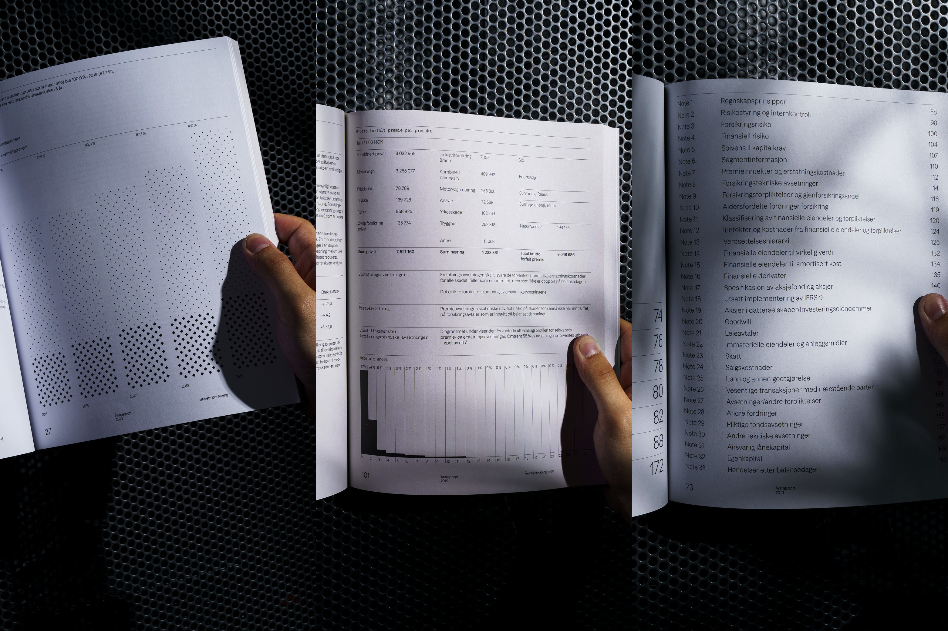 The infographic program is quite different from how insurance companies usually present their numbers. It strives for simplicity and clearity, without unnecessary decoration. The report is printed on high-quality, recycled, FSC-certified (Forest Stewardship Council), uncoated paper stock.
