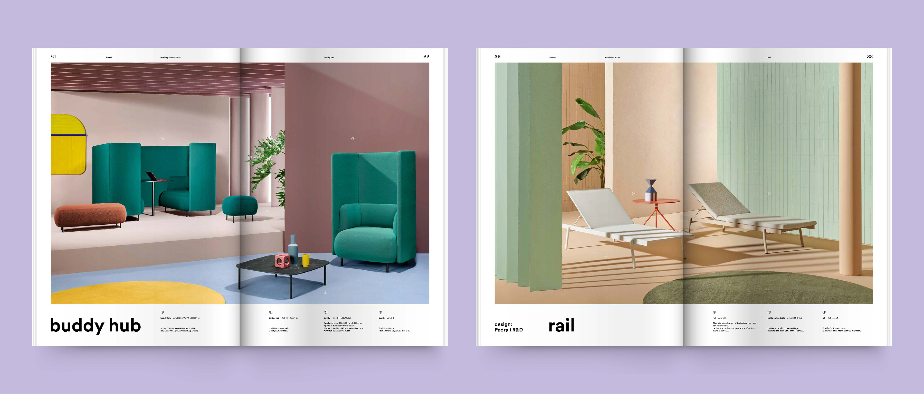 studio FM milano is working on defining the new visual identity of Pedrali. The 2 brochures Working Spaces and New Ideas aim to present new Pedrali products as well as defining the new visual codes of the brand. Through photography and the semi-abstract scenography, a large format and a playful sophisticated color schemes (rooted in Pedrali's tradition) kept together by a clean graphic design layout, Pedrali brand is redefining its own identity and tone of voice.