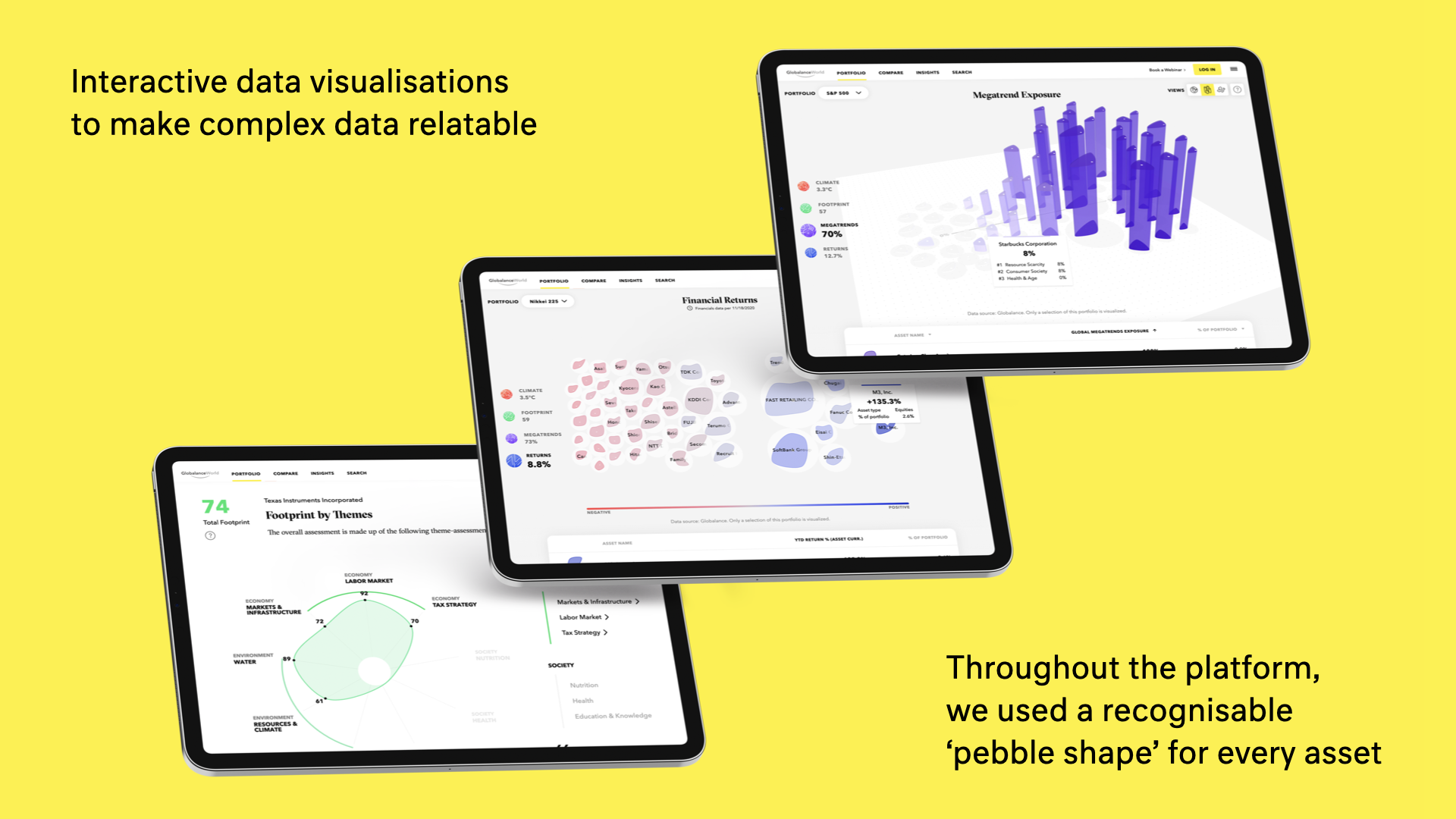 The platform has a unique data-driven visual language: Pebble shape. It’s an organic symbol based on nine criteria that Globalance Bank uses to calculate the footprint impact. Pebble shape introduces a new language to communicate financial data in a clear, consistent, and recognizable way. It’s used across the platform to create a unified way of visualizing data.