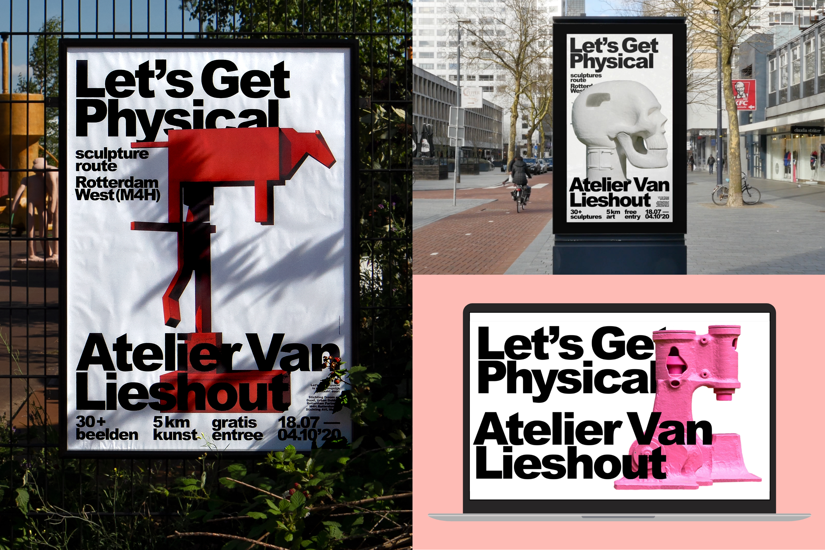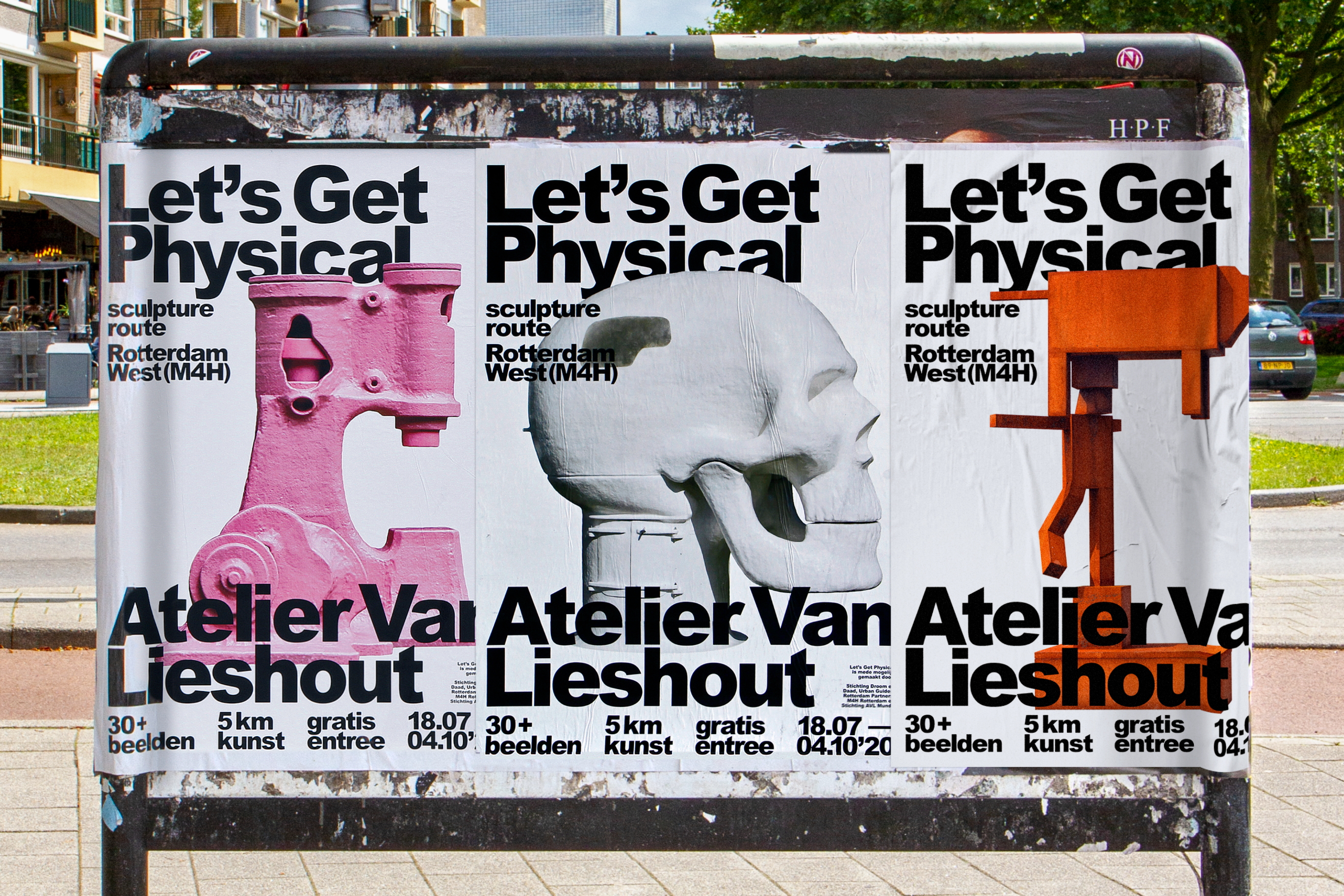 Let’s Get physical… but don’t get to close. We combined Arial Black (a given design-requirement) with three iconic pieces by Joep Van Lieshout and placed both ingredients as big as possible, with the tightest typographic spacing possible, to play with physical proximity and accentuate the title ‘Let’s Get Physical’. Furthermore, we used the strongest colours from iconic pieces by Atelier Van Lieshout: the rusty metal of ‘Milkman’, the fleshy pink of ‘Power Hammer’ and stark white of ‘Wellness Skull’.
