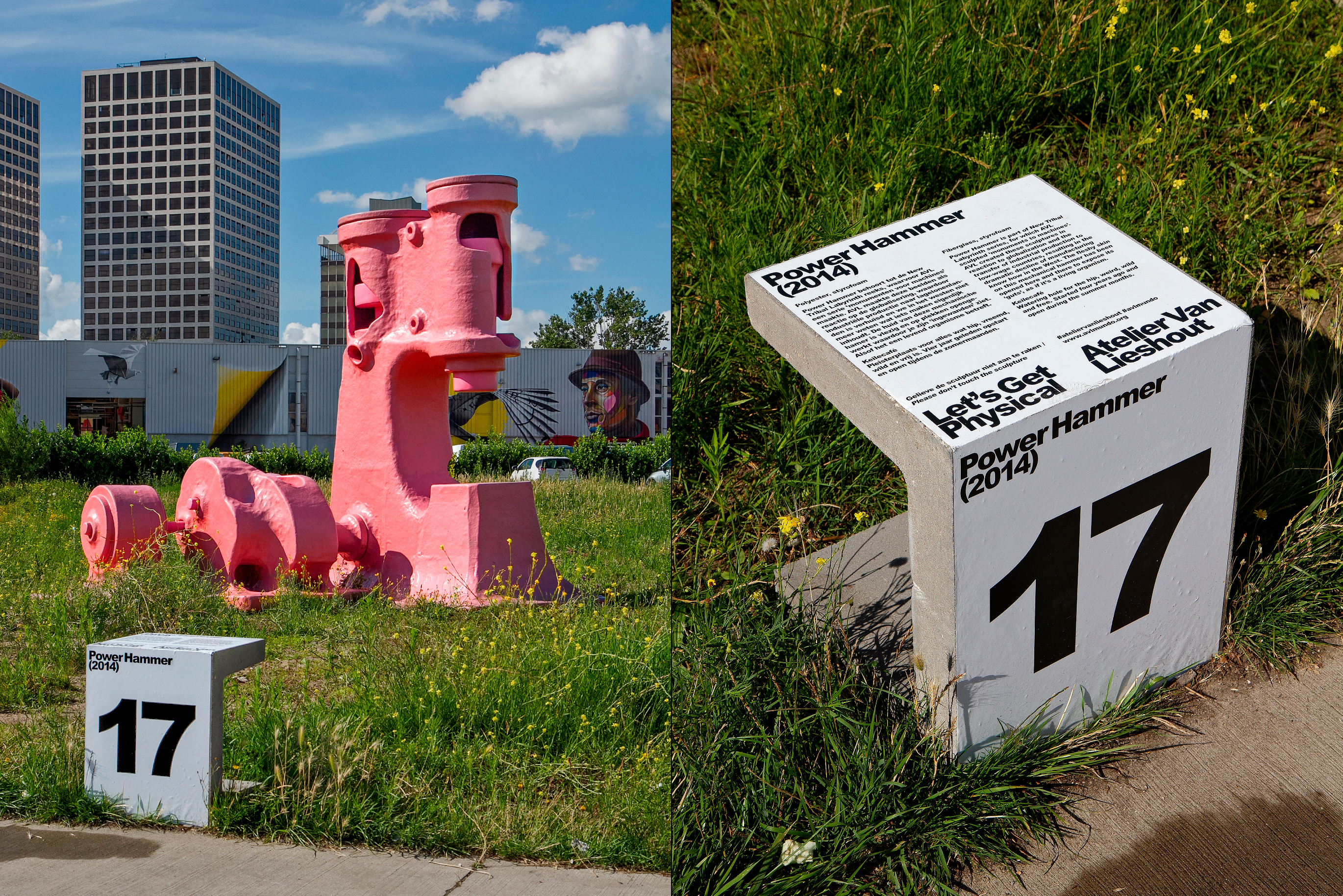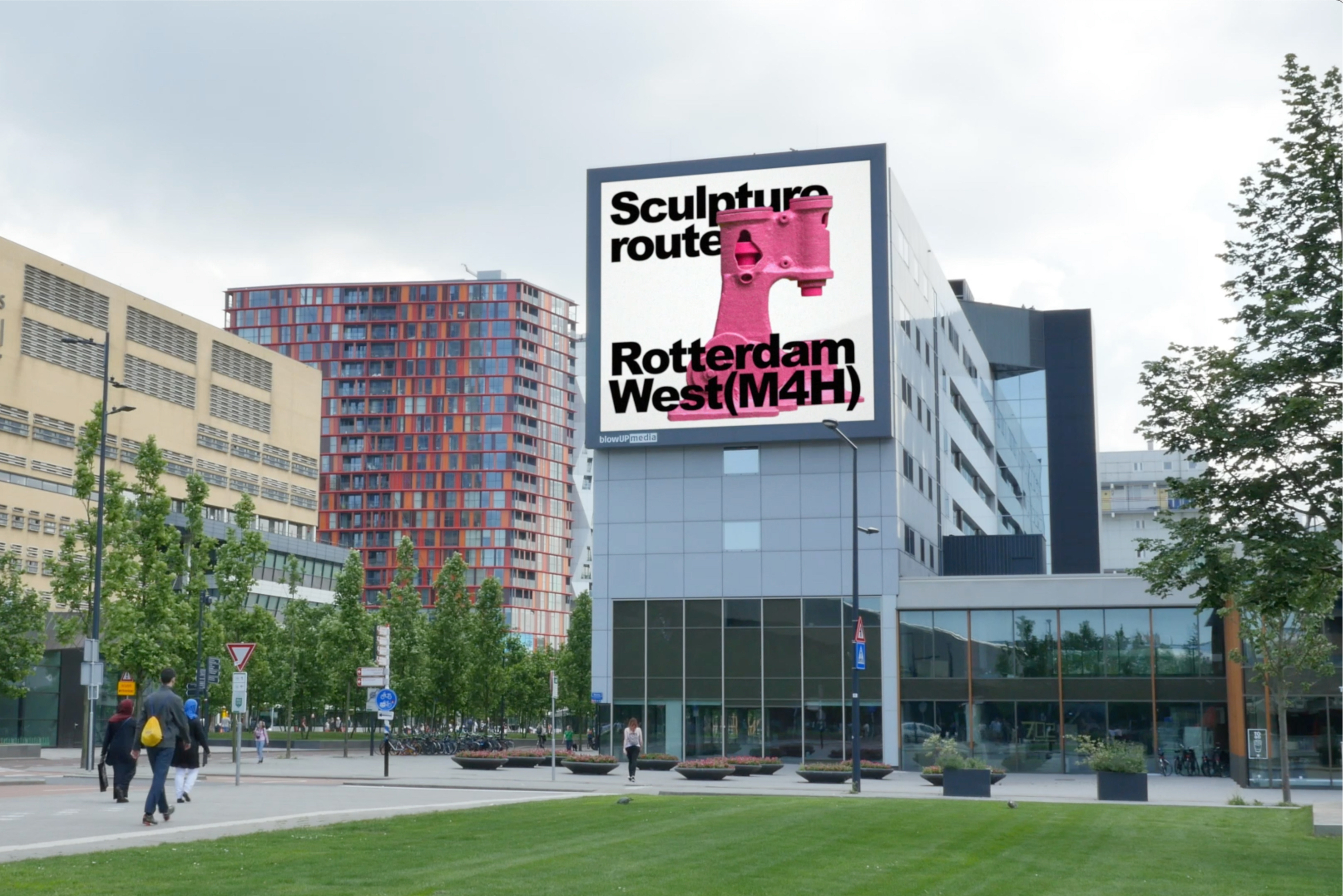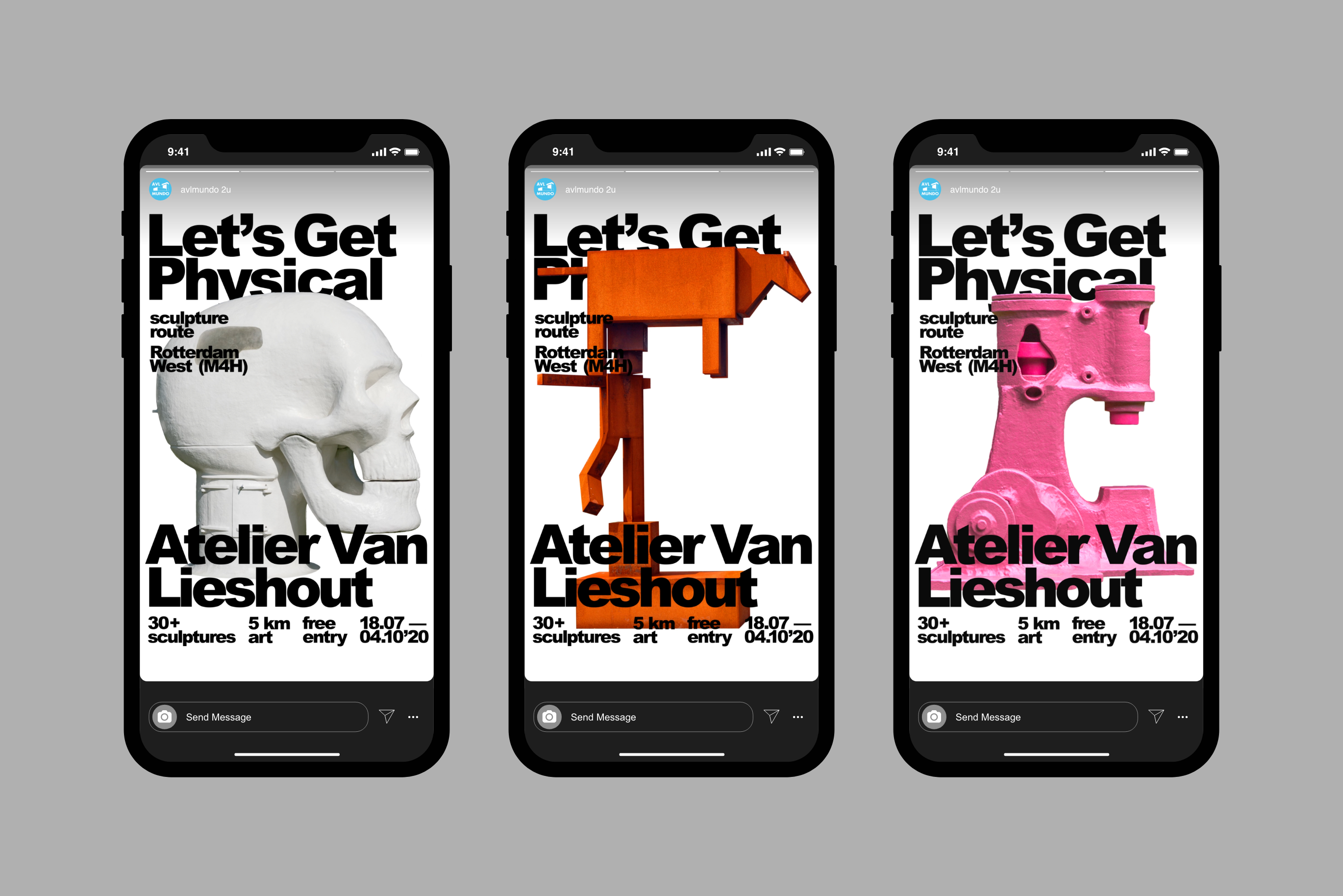 The posters were developed in print – to emphasize the activist and sticky, physical character – and in motion graphics. The motion graphics bring the iconic pieces by Atelier Van Lieshout to life in a cartoonish way. The “bump” strengthens the feeling of human proximity, as if you bump into the images while looking at it. More detailed information about the selected pieces, was found on the website, the printed route map and on the concrete blocks along the route. The design concept was broadly implemented on- and offline: from the website to posters, route map, flyers, stickers and the wayfinding of the sculpture route. We promoted the event on the AVL Mundo website, several social media platforms and on posters throughout Rotterdam.