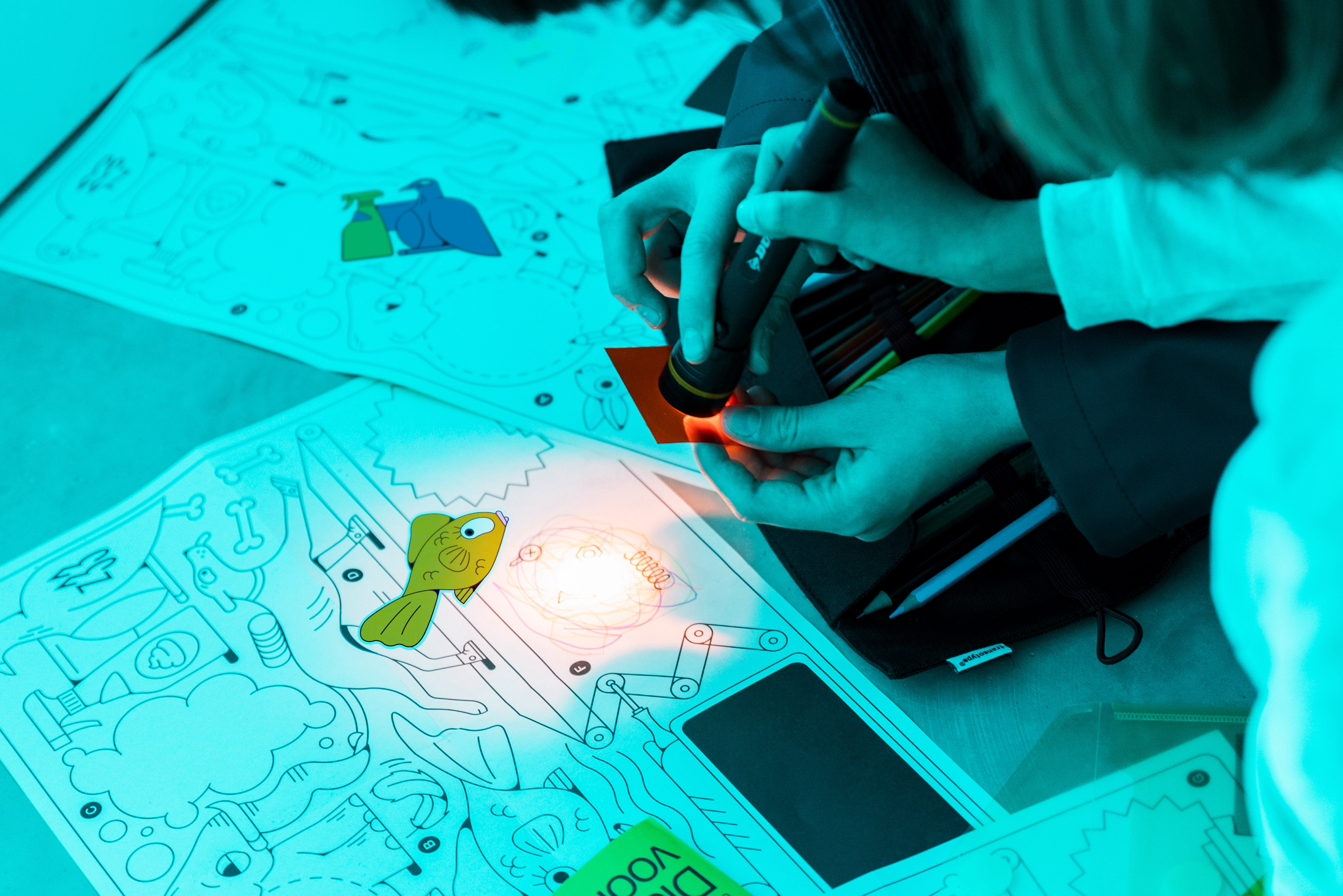 At the start of the exhibition, the children are given a bag of goodies. This bag contains a set of stickers and all the equipment necessary to accomplish the educational assignments at different stops in the exhibition, such as an educational flyer with instructions and a treasure map. The set of stickers encourage children to reflect on the artworks. The treasure map is filled with educational assignments and a colouring page. In this way, children can play, experiment, interact and reflect on the artworks in the exhibition.