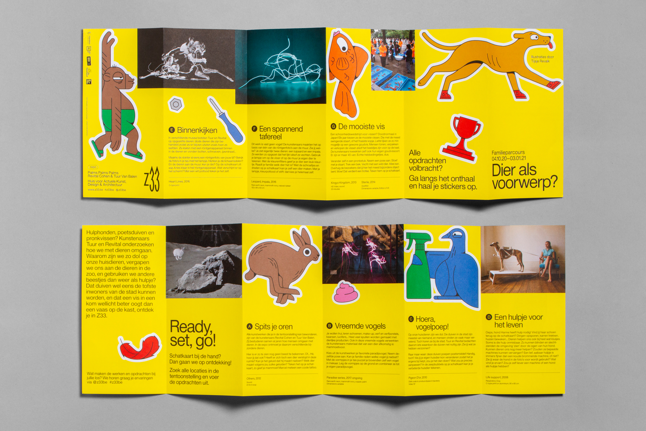 For Z33s rebranded family programme, we work together with different upcoming illustrators to create illustrations based on the artworks of the current exhibition. For this first campaign we joined forces with the talented Tijsje Revalk. We designed an educational flyer for children (or their parents in case they can’t read yet), a treasure map, collectable art stickers, posters and socials.