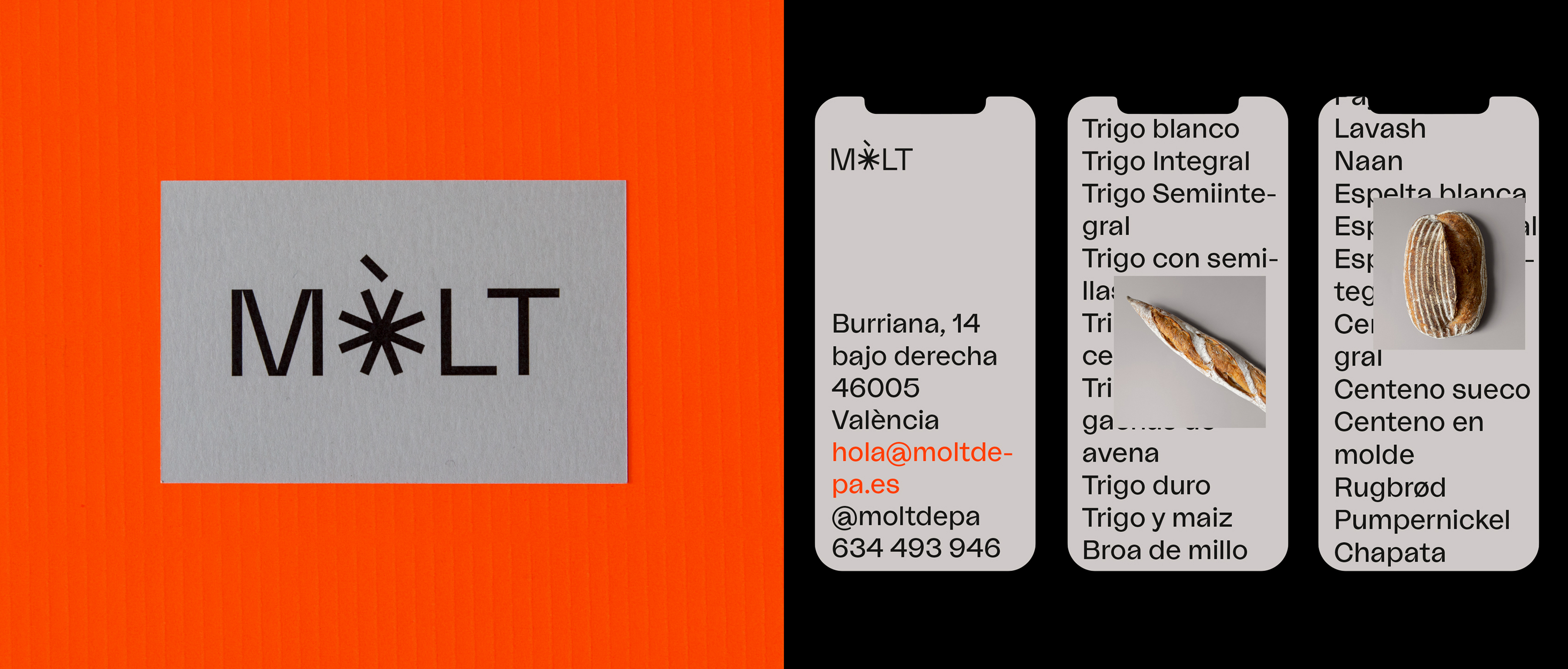 Mòlt deserved to have visibility. If we say that the fluorescent red represents the fire and the grey the flour we would be redundant. We simply seek an image that is capable of transmitting values and personality. Making bread is easy, but making it different and putting a differential stamp on it is a more complex task. To represent all this in a brand is Mòlt.