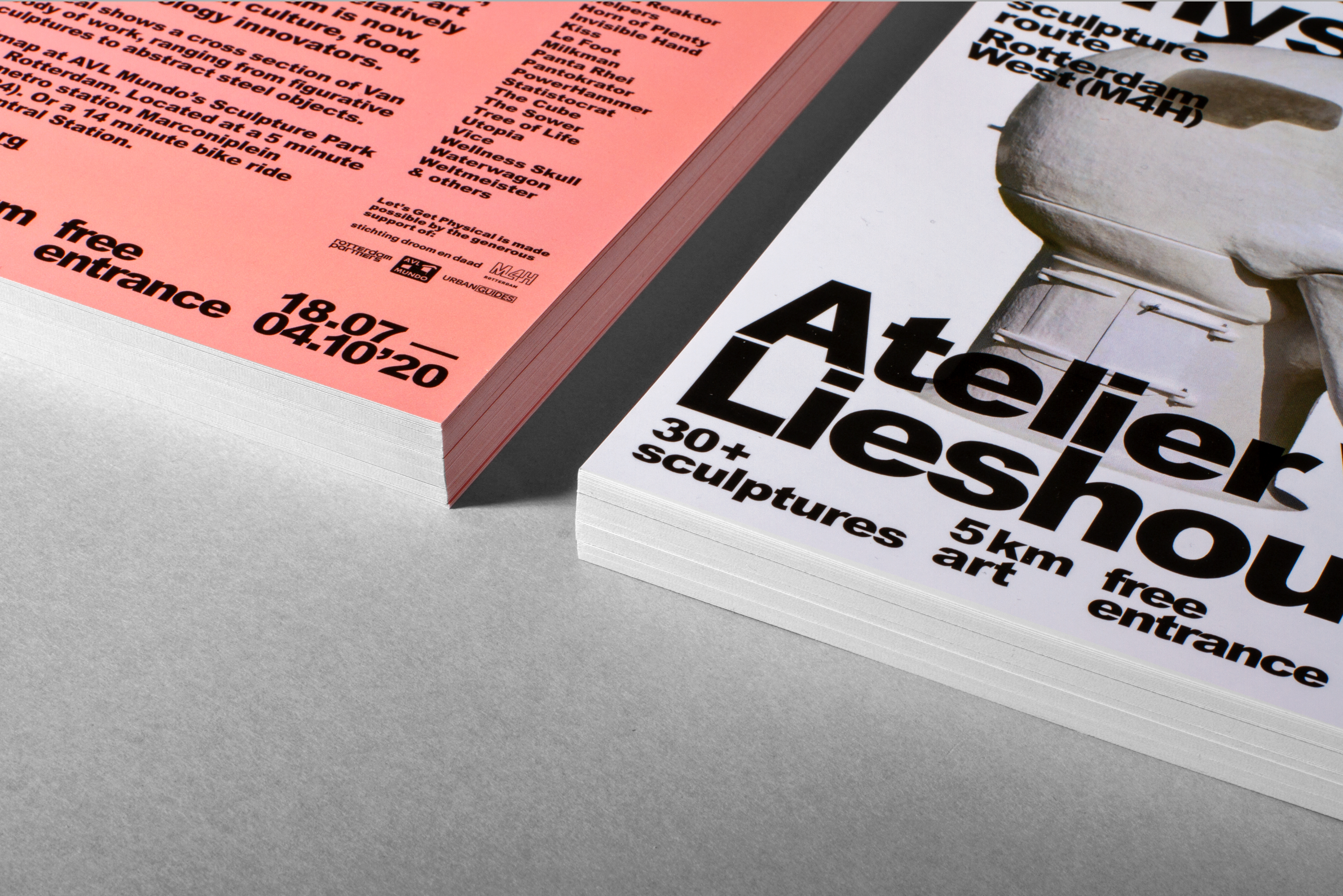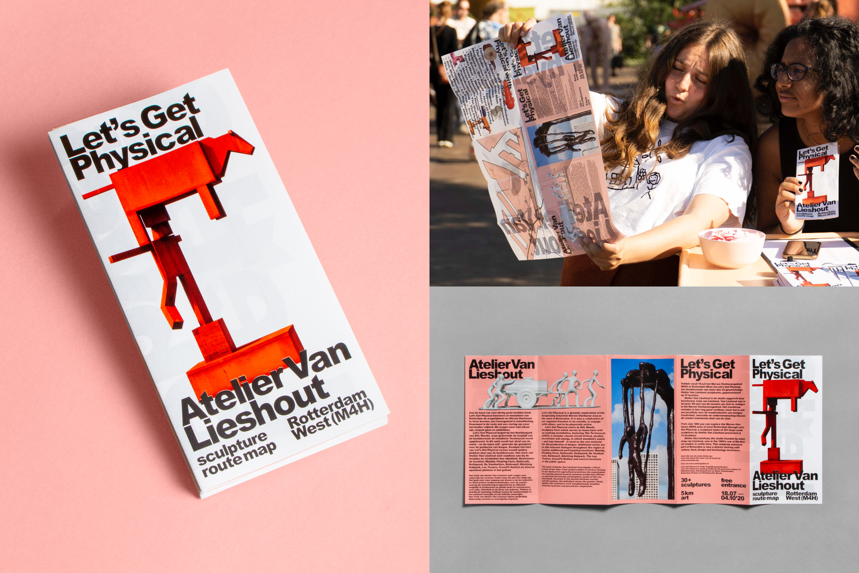 We used the strongest colours from iconic pieces by Atelier Van Lieshout: the rusty metal of ‘Milkman’, the fleshy pink of ‘Power Hammer’ and stark white of the ‘Wellness Skull’. Both were printed on glossy paper, to emphasize the sticky, meaty character of his sculptures. The ‘Welness Skull’ is printed on the back of the route map. The numbers on the route map corresponded with the numbers on the concrete blocks along the route.