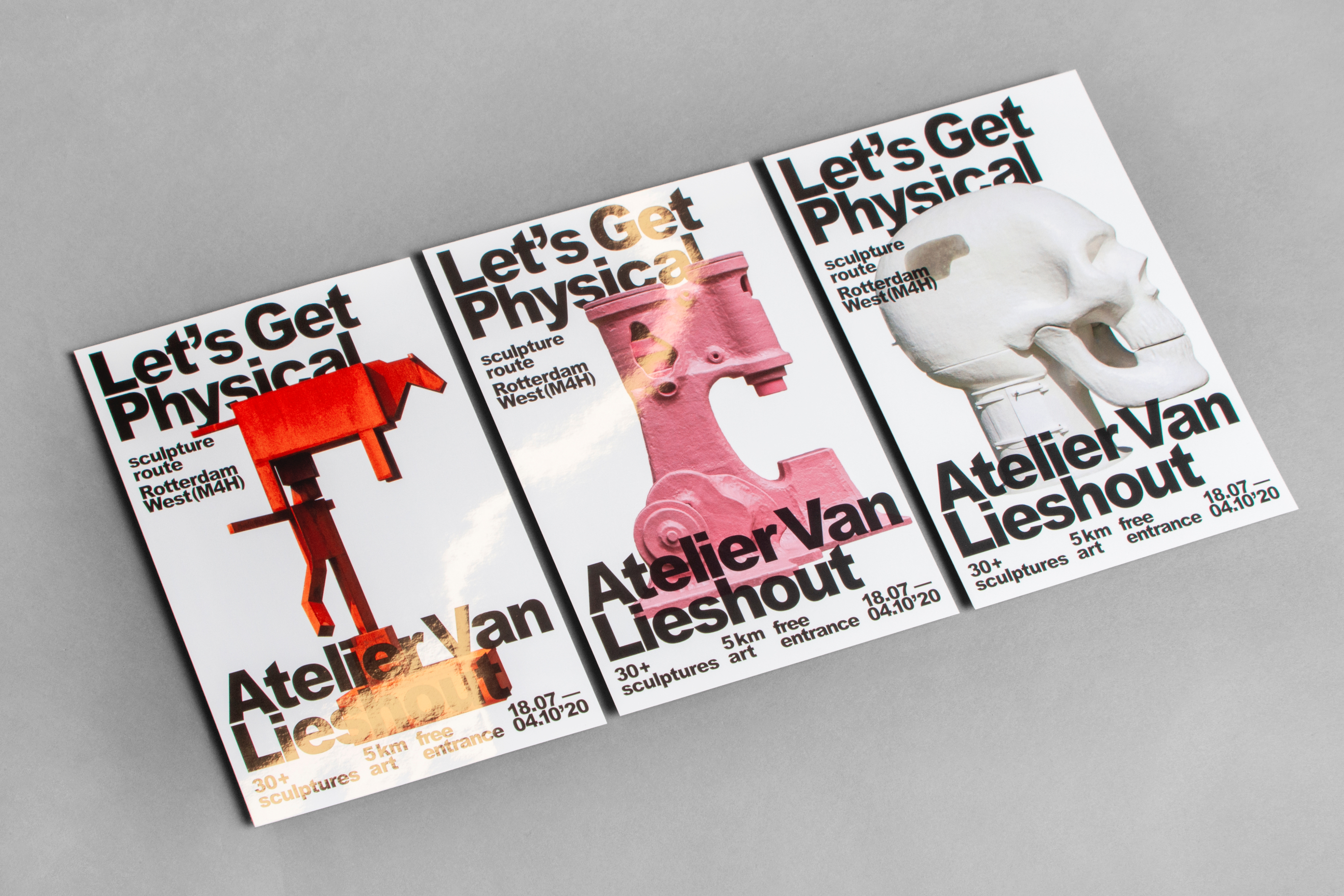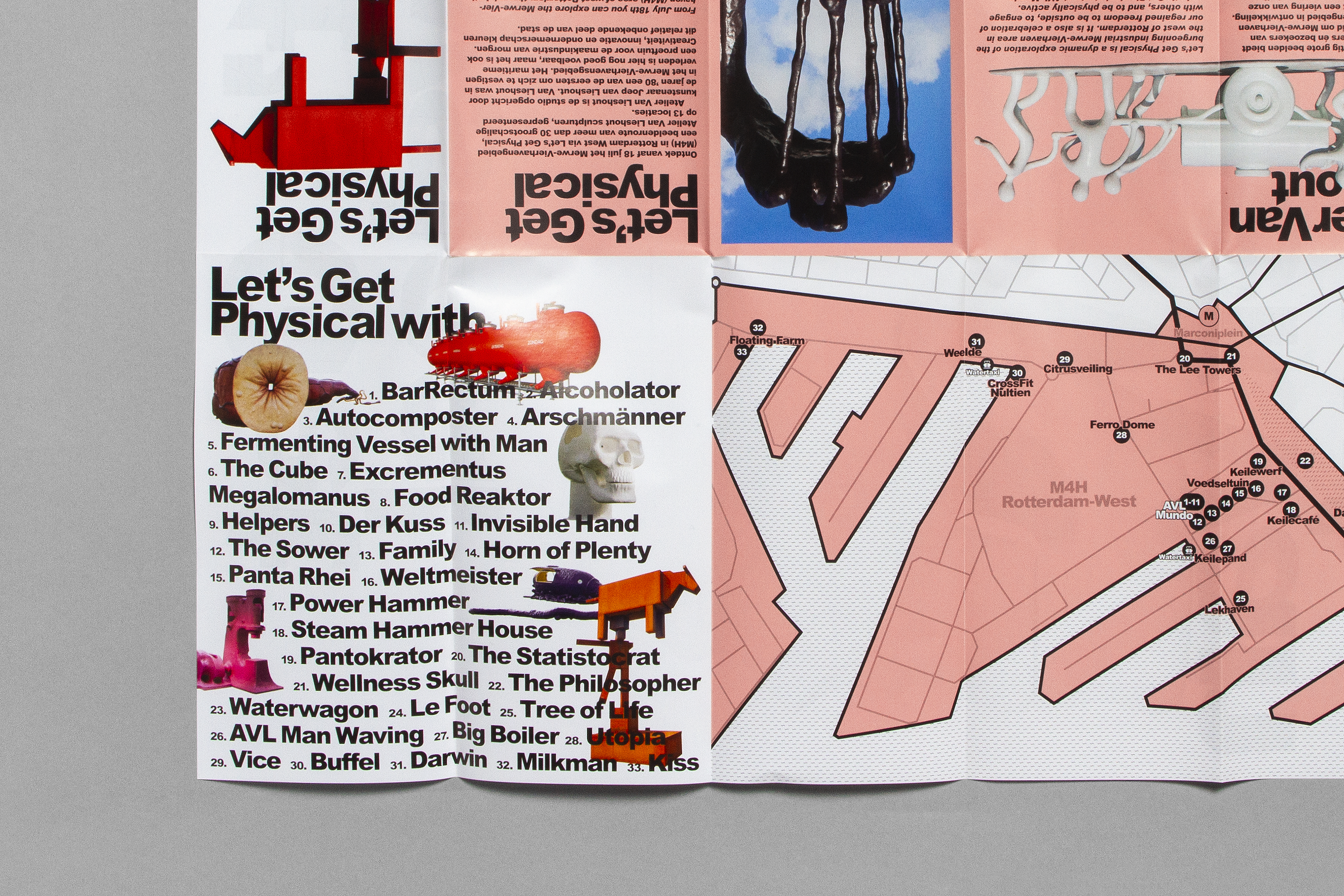 When starting the route, visitors were given a flyer and a route map with more detailed information about the artist, the area and the selected pieces. We combined Arial Black with the names, images and numbers of the artworks and placed all ingredients as big as possible (with the tightest typographic spacing possible) to play with physical proximity and accentuate the title ‘Let’s Get Physical’.