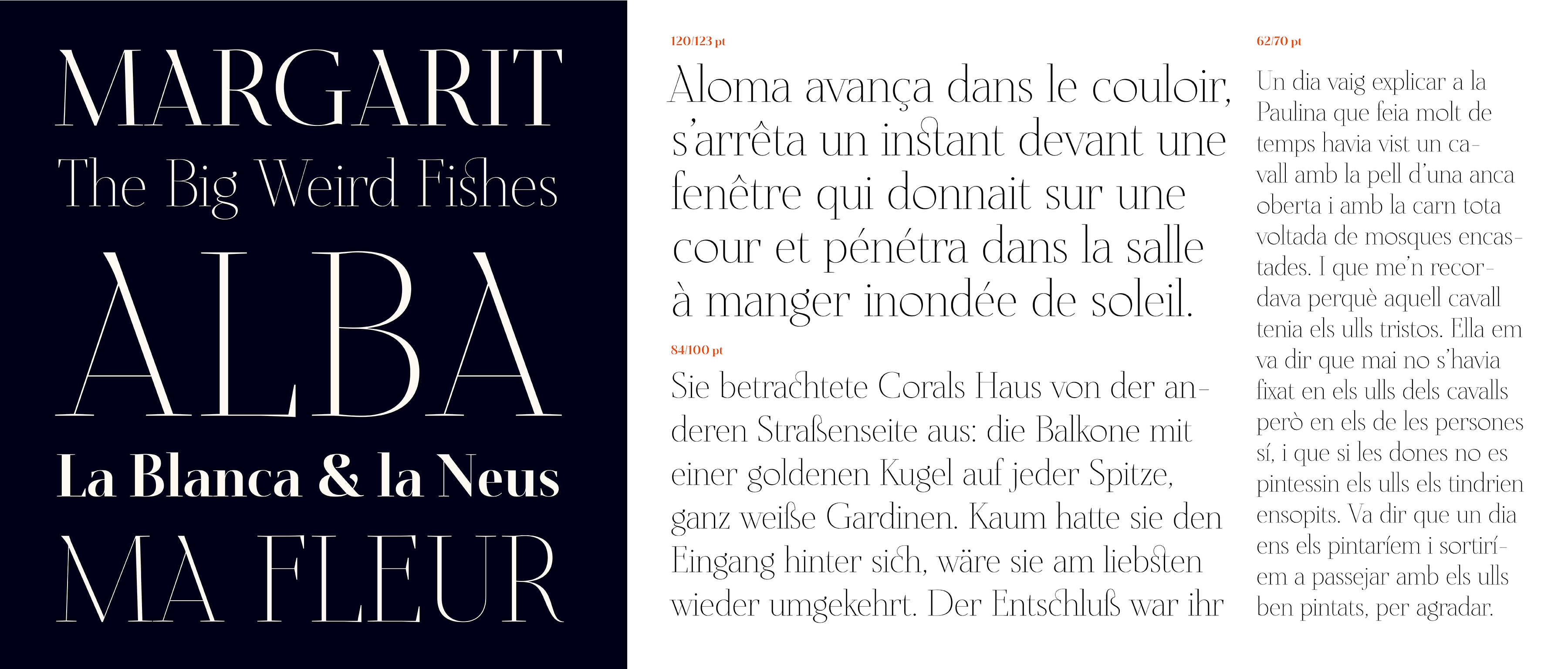 Aloma has a Neoclassical flavour with classical Roman proportions, although some sort of inconsistency is applied in some letters. It is intended for editorial design (magazines, catalogs), mainly for titling and short texts.
