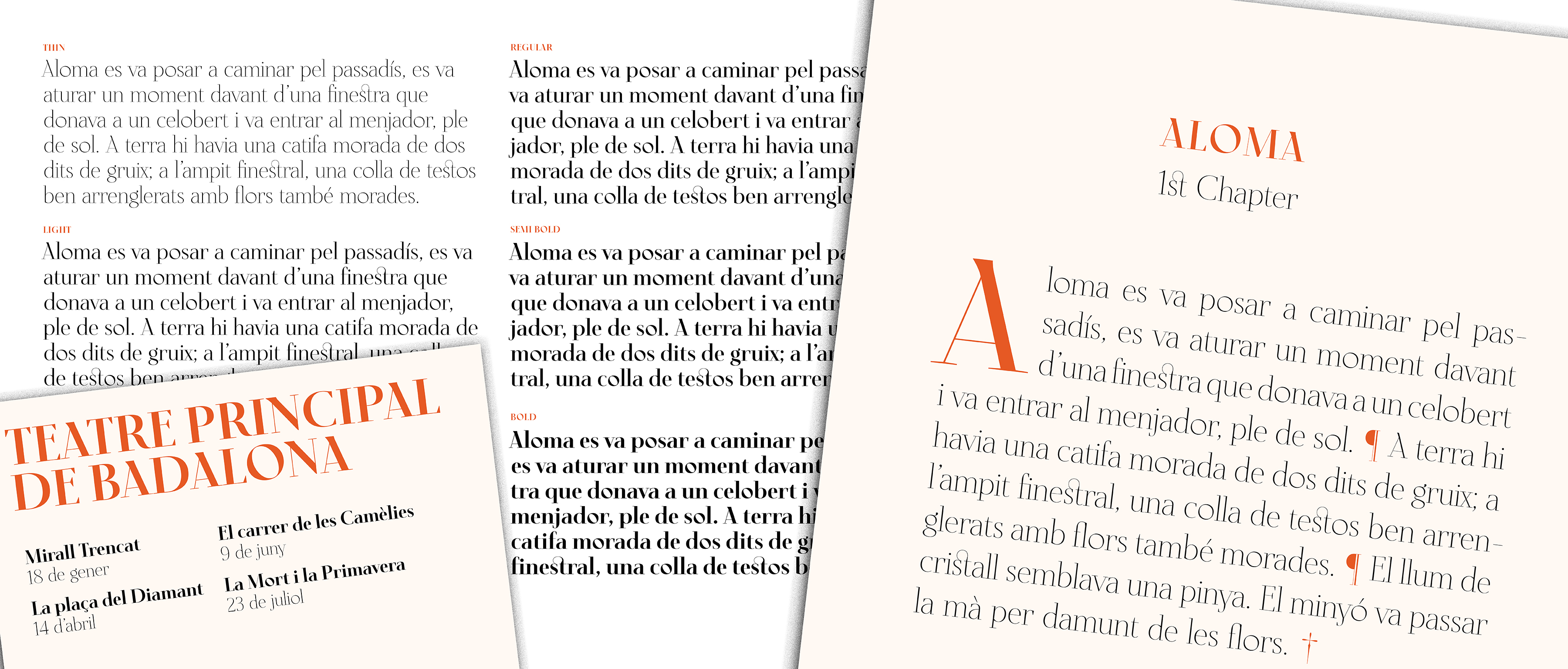 Aloma is a type family intended for both text and display purposes. It is inspired on “Aloma” novel written by catalan writer Mercè Rodoreda, and published in Barcelona in 1938. The first ideas for the design were based on Deco magazine headlines and lettering. Also on the ideas behind Catalan Noucentisme movement.