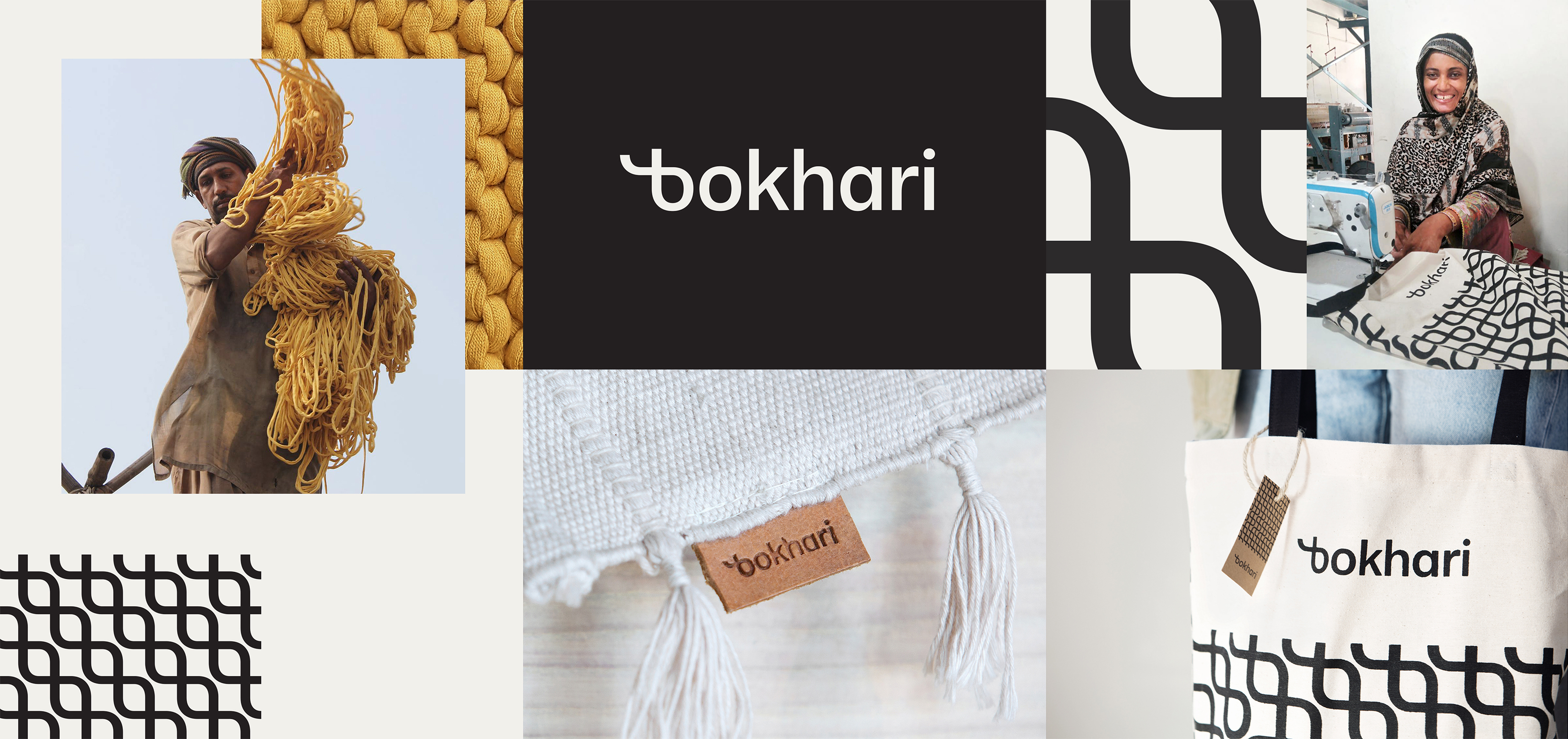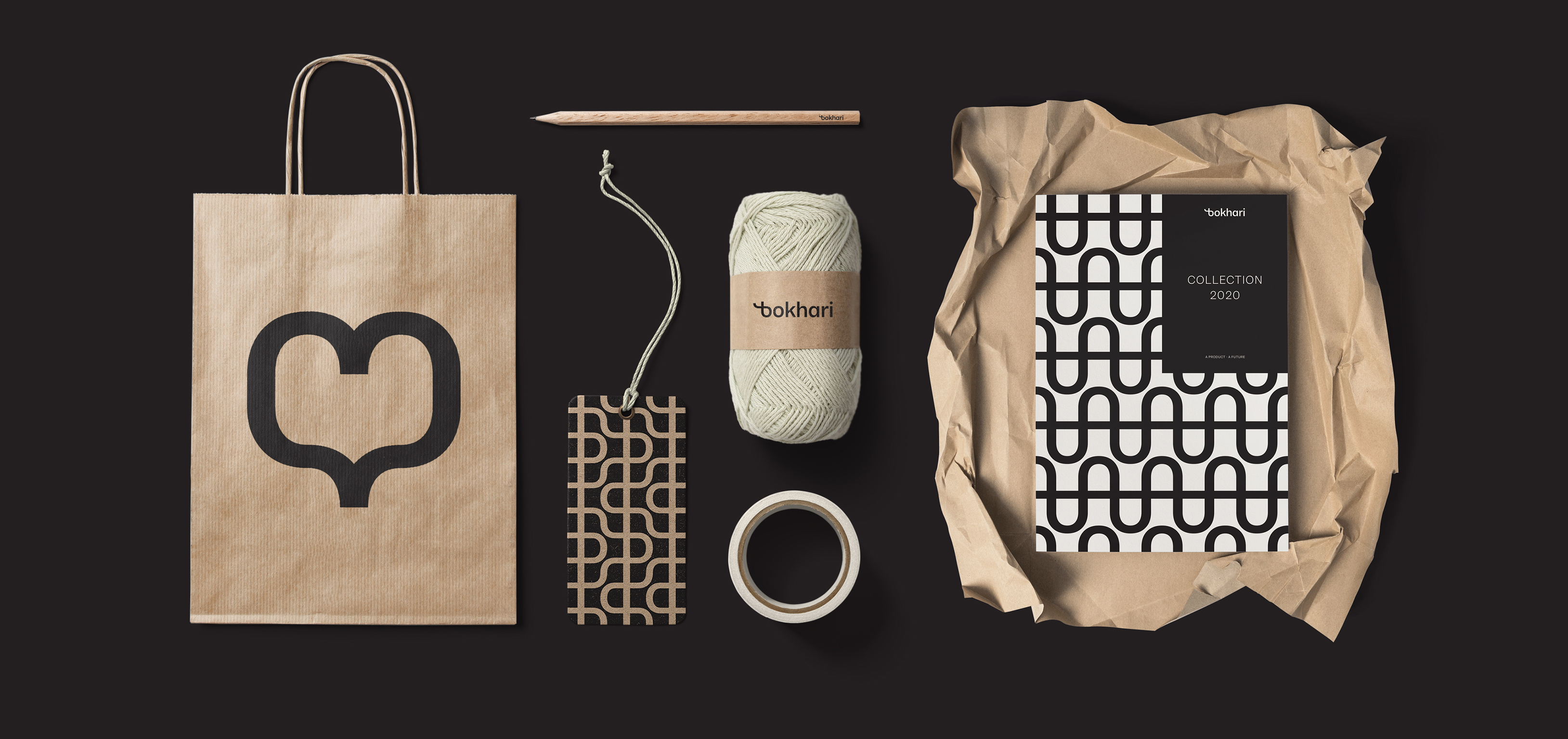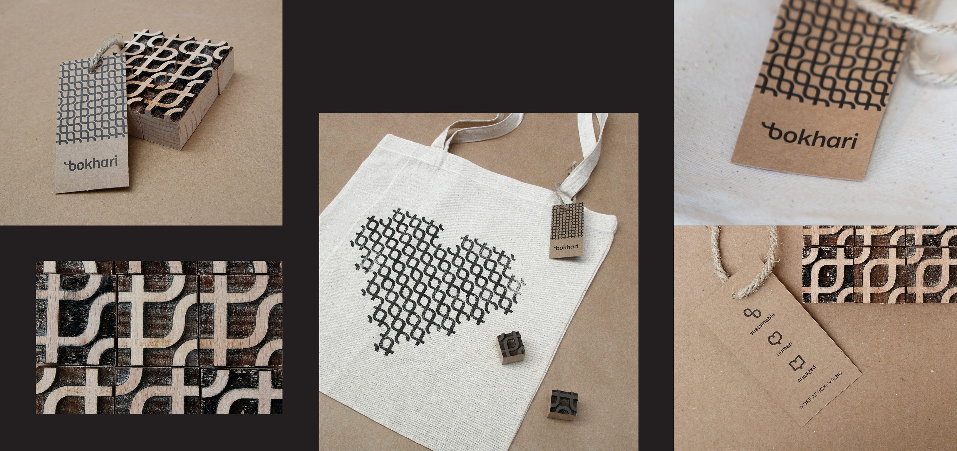 Sustainability, continuity and engagement are not only Bokhari's core values, but also key notions that characterize the craft of textile production itself. By representing the initial letter b as a stylized weaving knot, we emphasize this connection in a memorable way. The initial motif serves as the basis of a distinctive logotype, icons which communicate the brand's social commitment, as well as a set of elaborate weaving patterns to complement the expression. The graphic elements revolve around a coherent grid of typographic proportions and employ the principles of modularity and repetition typical for textile production. Applied in multiple contexts, the identity becomes an effective communication tool which serves as a vehicle for the Bokhari brand, both rational and expressive in equal measure. Additionally, we created a set of Bokhari wooden stamps as a gift to the LAMS school on the behalf of the company, thus promoting a culture of continuity and their engagement with the educational cause. With each stamp representing one of the unique pattern motifs, the whole set became a living part of the identity, encouraging creativity and curiosity among the children and allowing them to create unique patterns and artworks.