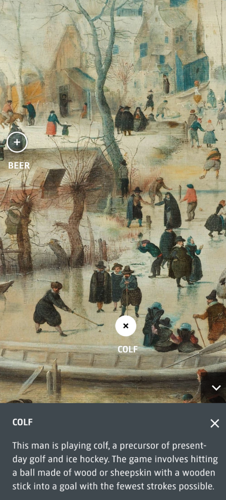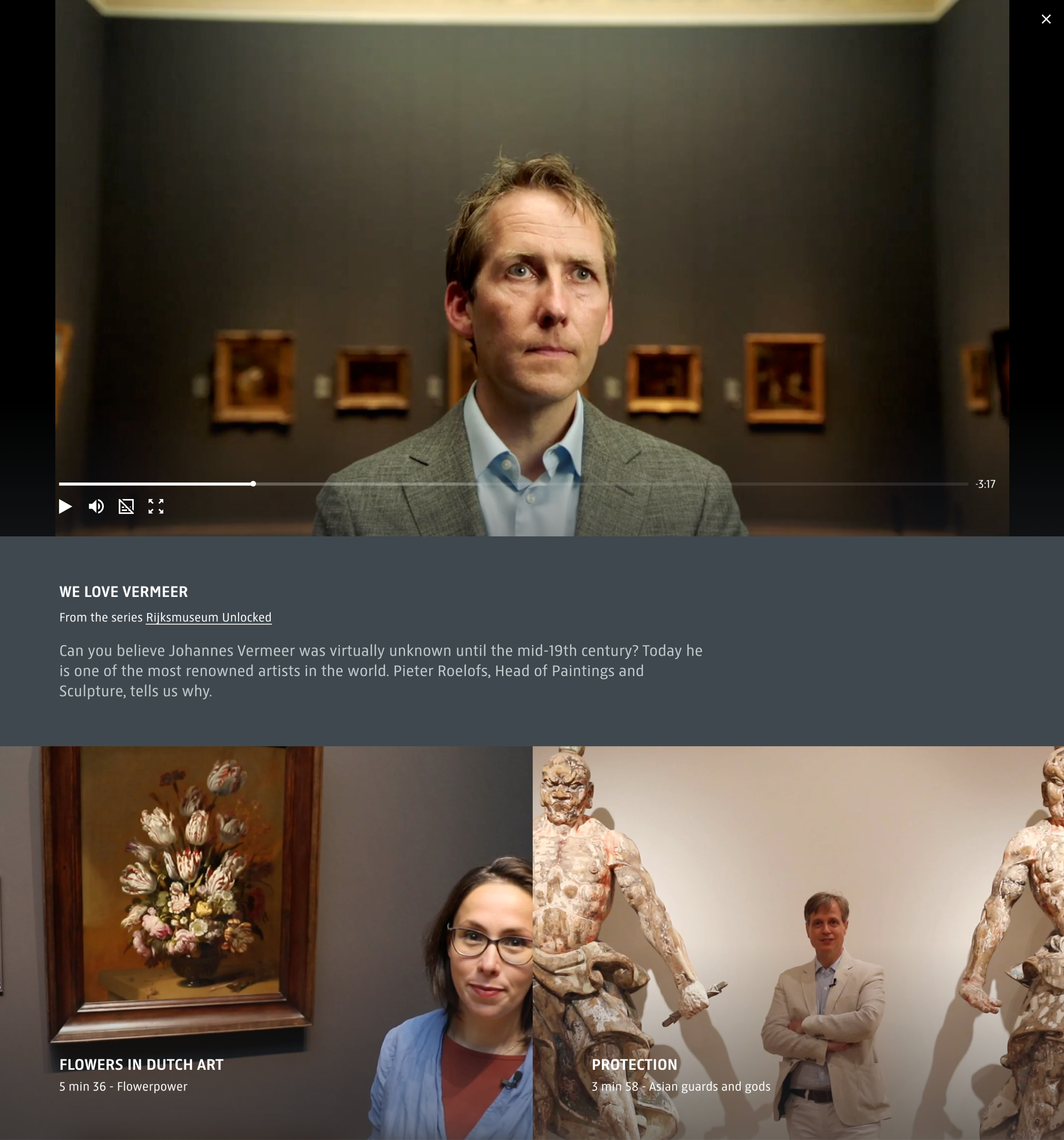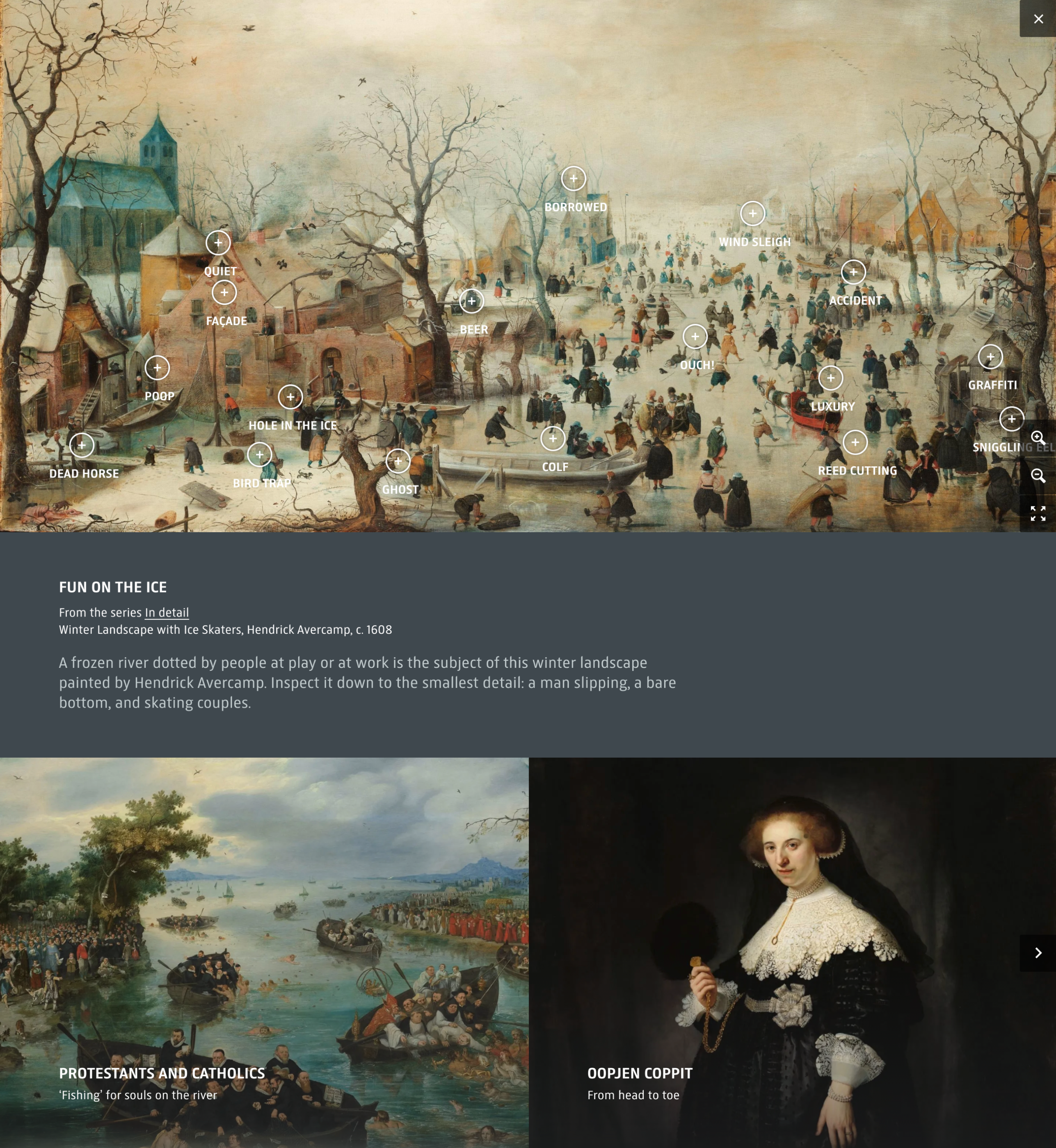 Of course we made the new website fully searchable: from the collection and activities to all practical information. And we have brought all activities of the Rijks together in a simple overview with smart filter options. All based on the CMS , developed by Q42. Besides, the ultra-resolution storytelling tool Micrio allows users to zoom in to the smallest details of the paintings and immerse themselves in the artworks. The zoomable works in the series 'In detail' are also enriched with numerous stories and facts. And for visitors who really want to binge art, there are plenty of video tours to enjoy. All made with Micrio.