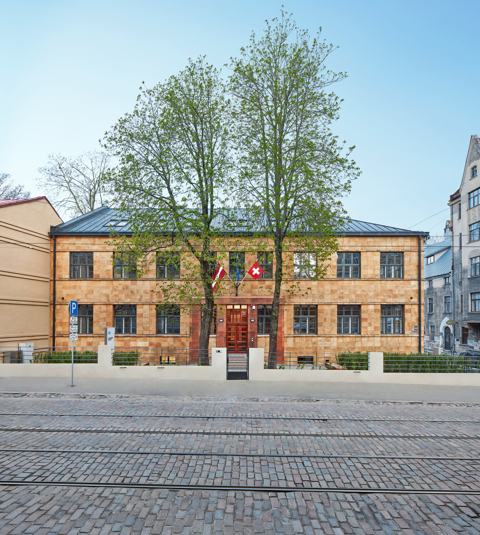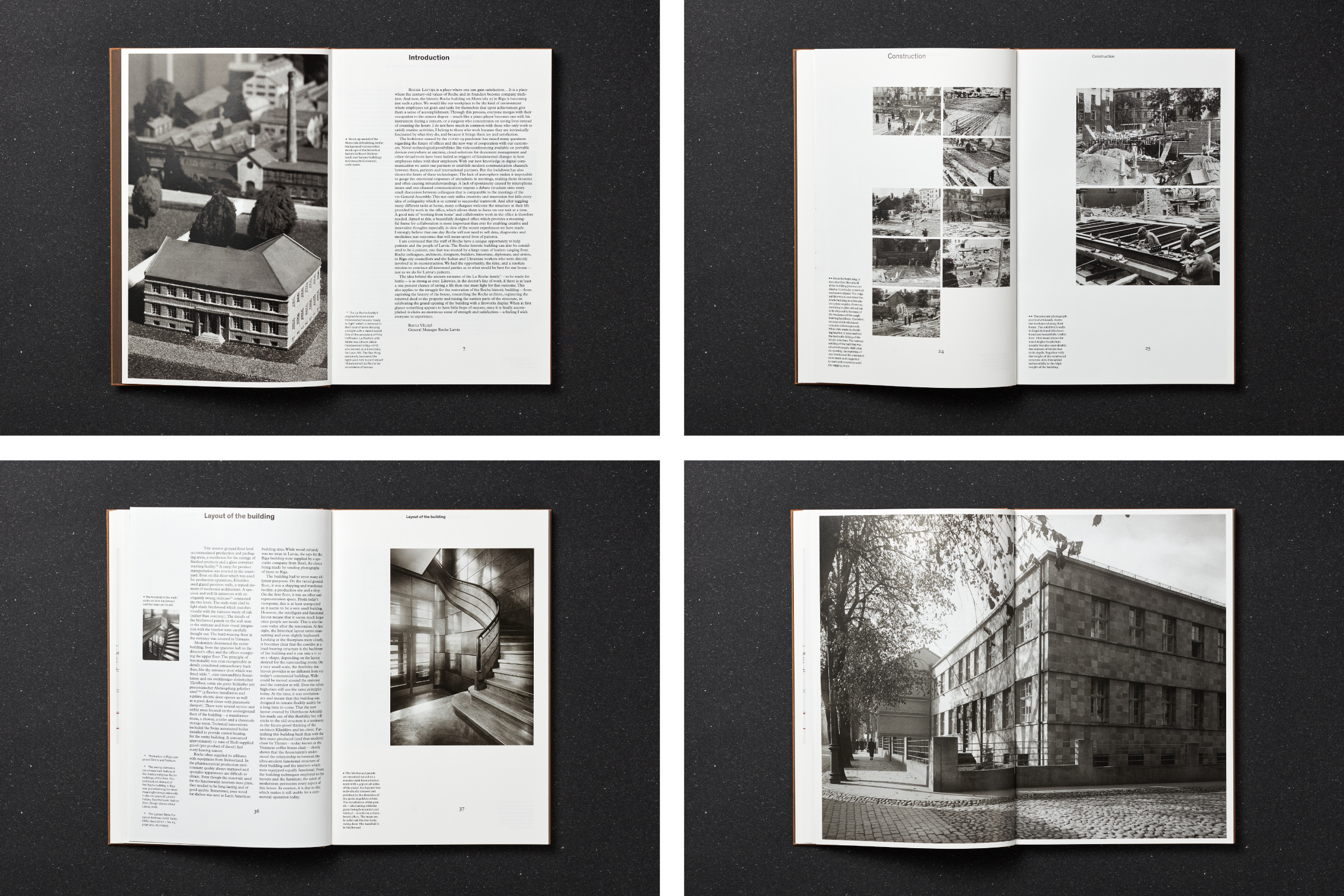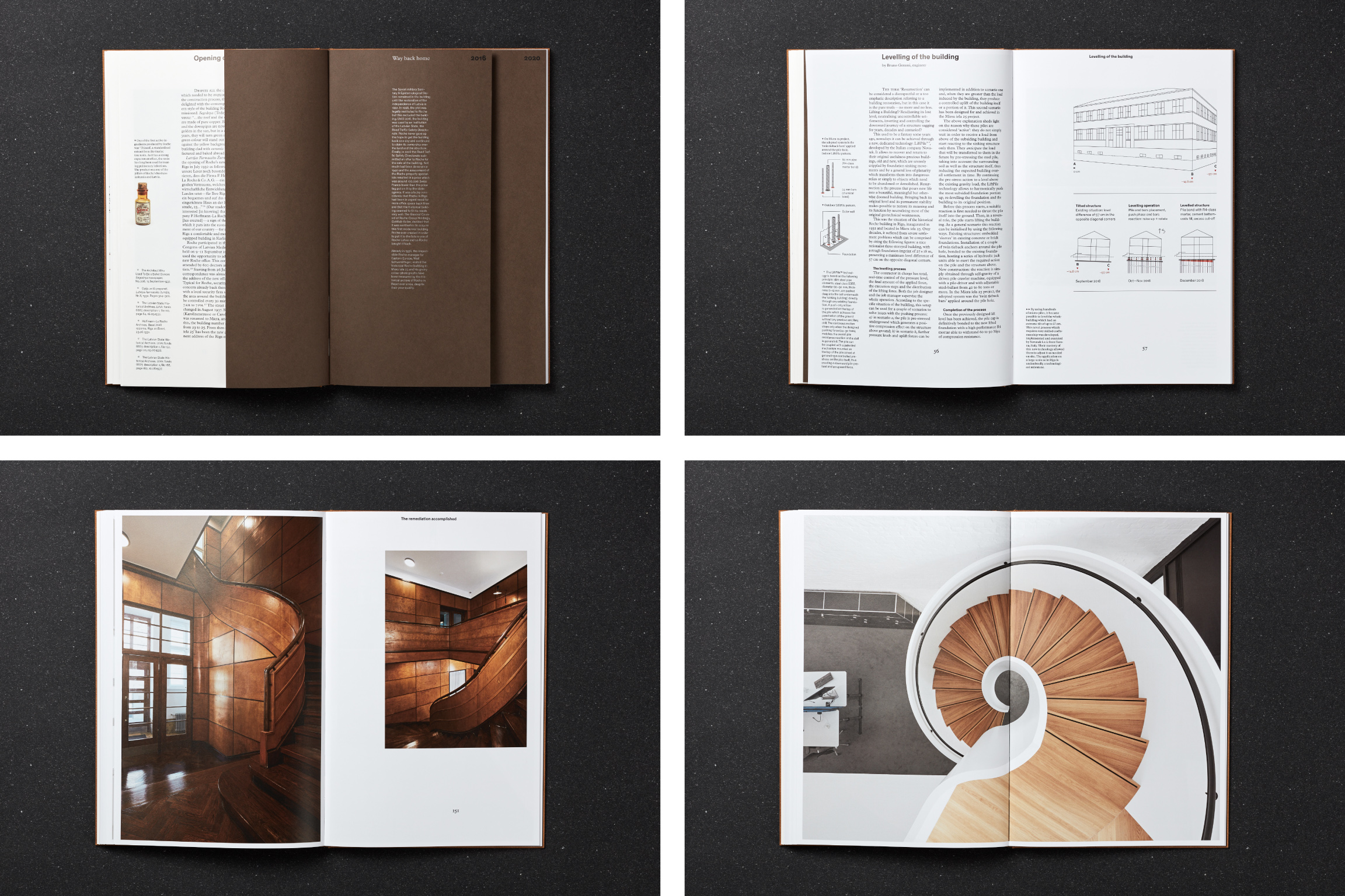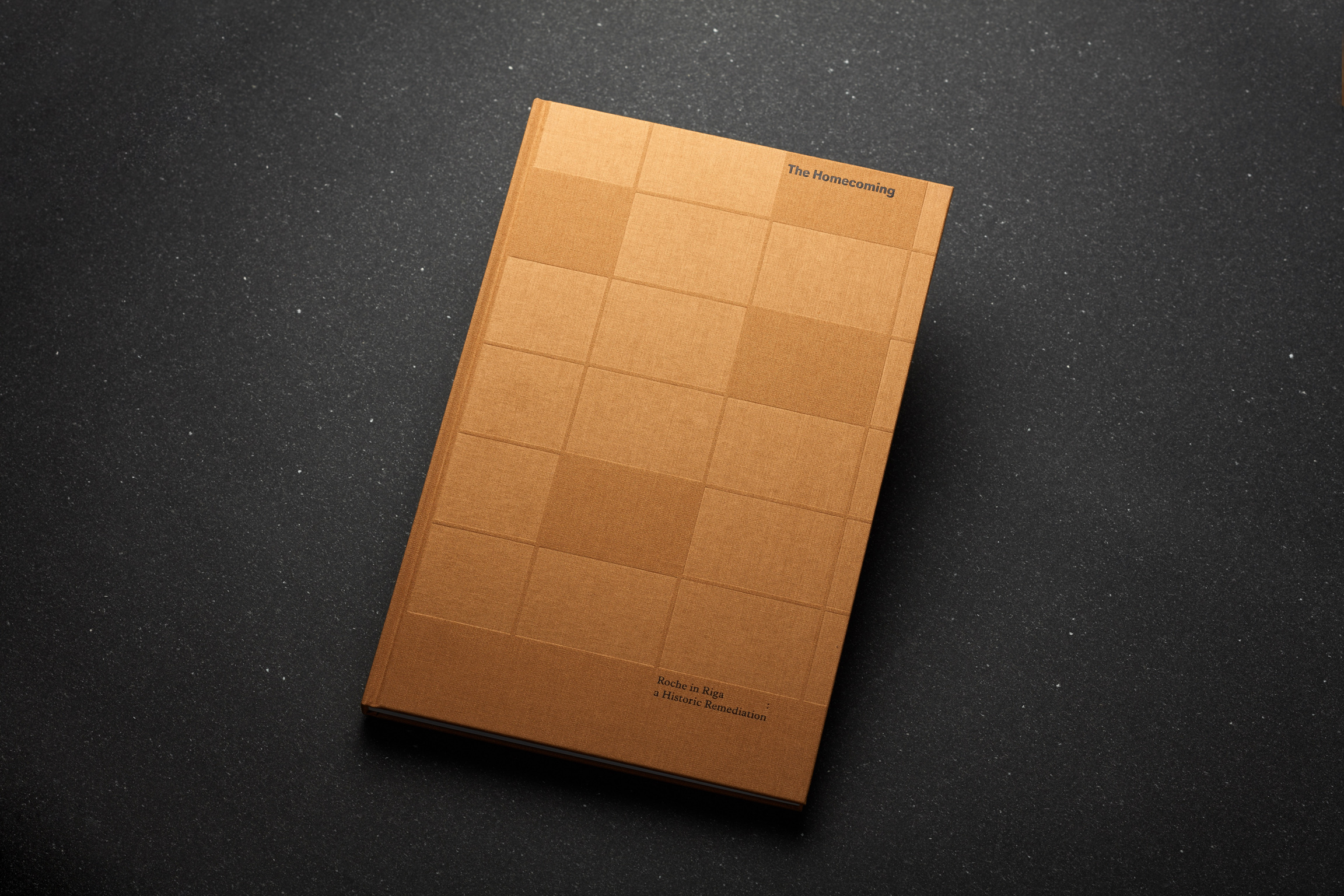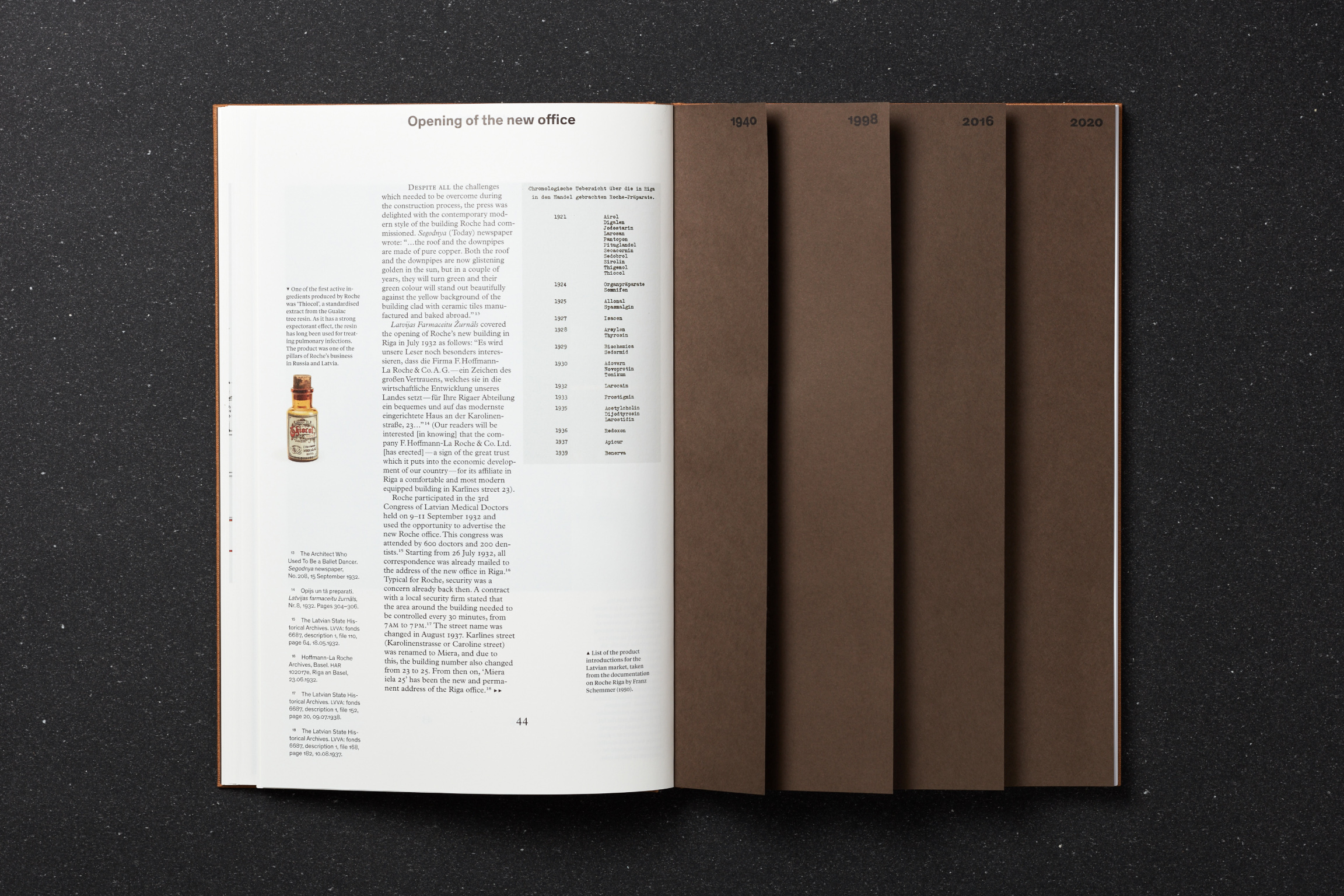 The book conveys the story of the functionalist building on the corner of Miera and Palīdzības streets in Riga built by Roche in 1932, expanding its operations in Eastern Europe. The structure was one of the first modernist buildings commissioned by Roche and signified a new business style and a new level of corporate presence in Latvia. The genuine gem of the building besides its peculiar façade is its historic wooden staircase. In Roche corporate philosophy staircases are a metaphor of gradual, but consistent development and growth. The design of the cover and the modular grid for internal pages have been inspired by the building’s façade tiles and their proportions. The book draws tonal parallels with the building’s exterior and interior, culminating in a brown signature of pages of gradually changing widths ― those hold the milestones of the building’s dramatic transition and make a visual allusion to its heart ― the main staircase. It connects two parts of the edition — the historical part on ivory coated paper, and the modern part on white one of the same quality. The edition is set in Monotype Plantin for the body text, its contemporary interpretation — Tiempos Text by Kris Sowersby for captions and Theinhardt by François Rappo for the headings and marginalias bridging the aestetics of early modernism and perception of contemporary functionalist typography.