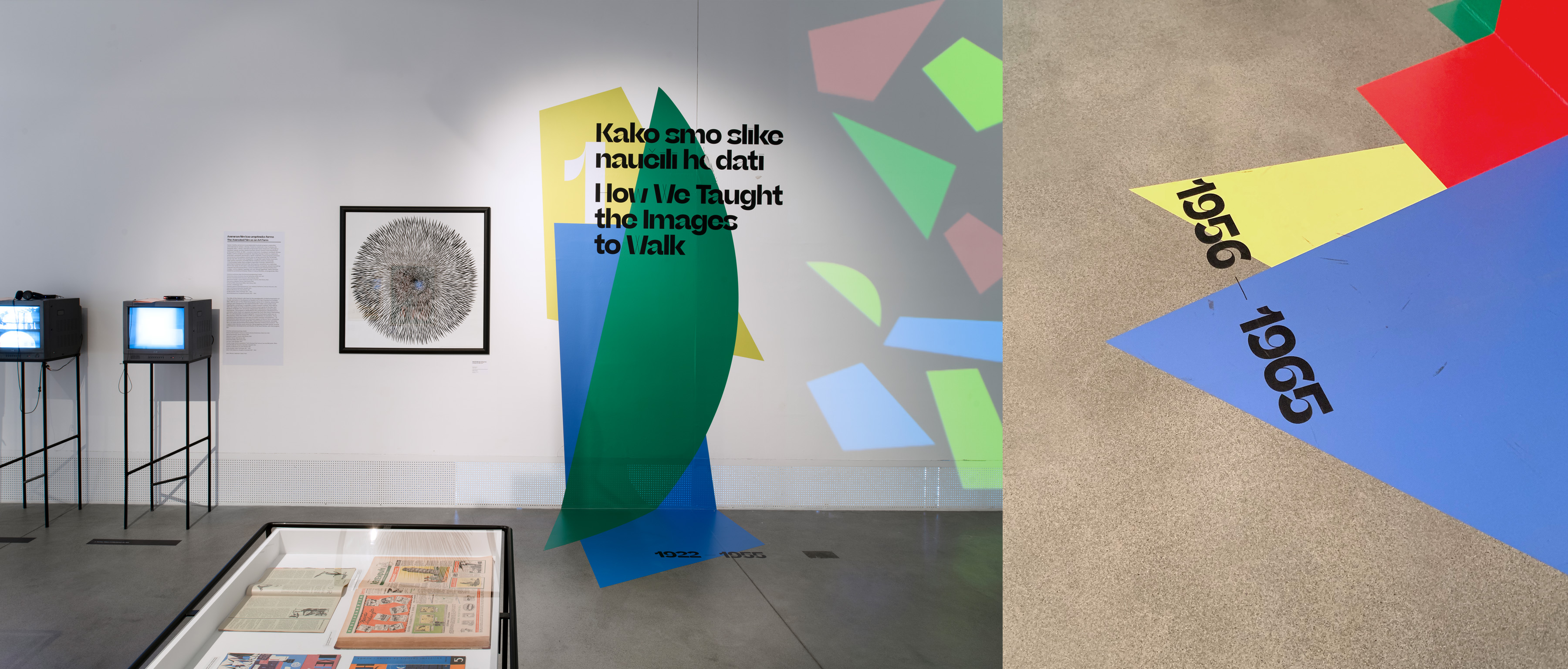 By emphasizing essential visual elements and their transformation into the main visual and constructional conveyors of the exhibition message, we created a visual language that refers to the distinctive identity of Zagreb Film. By adding a third dimension to the flat shapes on the screens, a group of specific elements was formed to communicate the exhibition abundant and diverse content. Oversized inventory pieces and old TV sets used to screen films take adult visitors back to their childhood, while certain interactive elements lead visitors to experience their favorite animated movies.