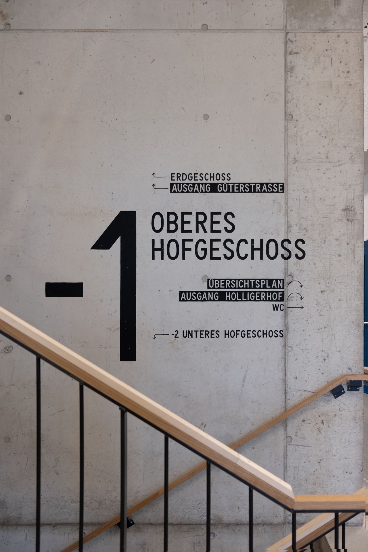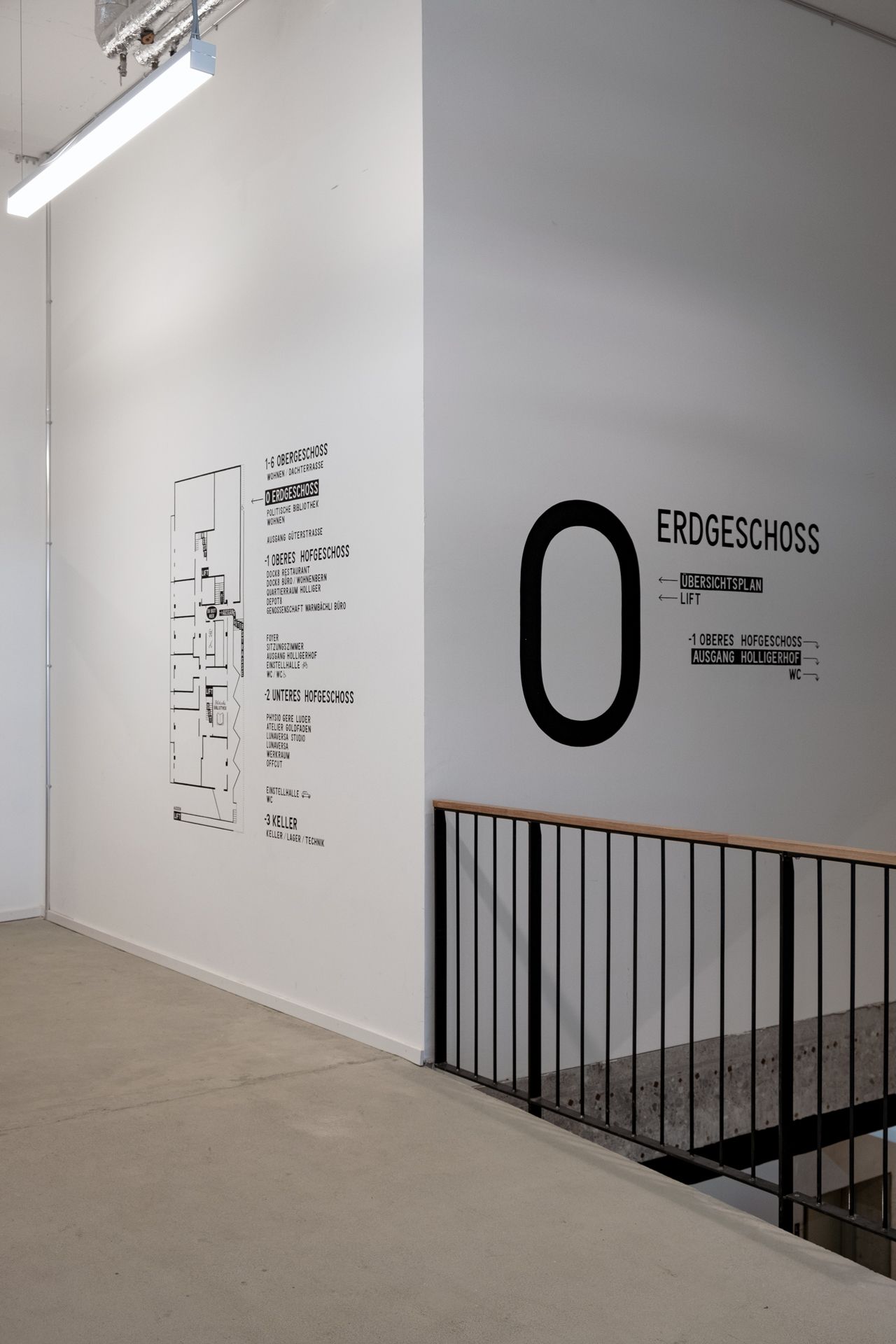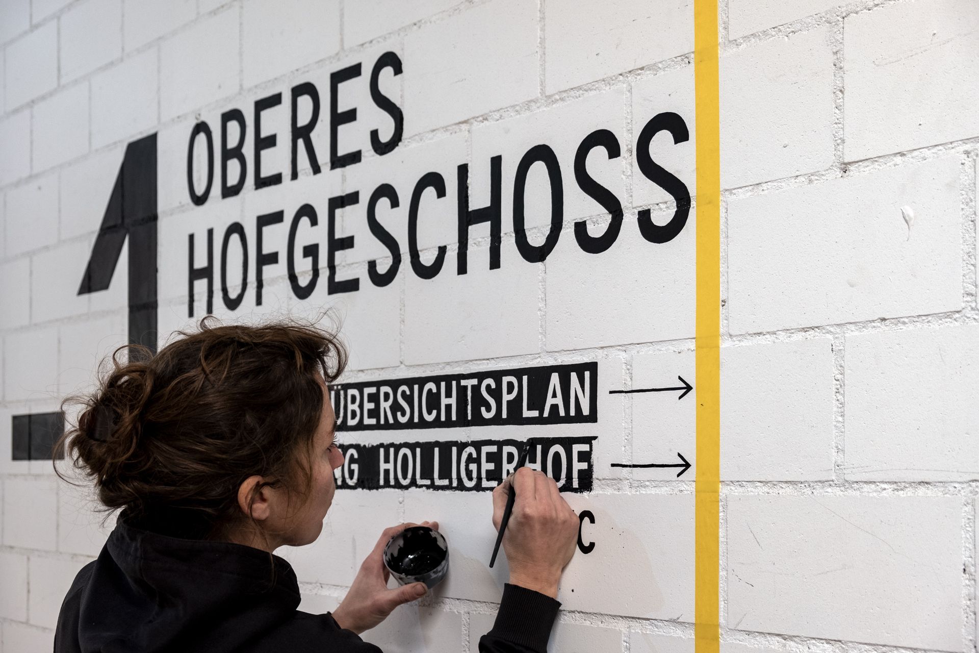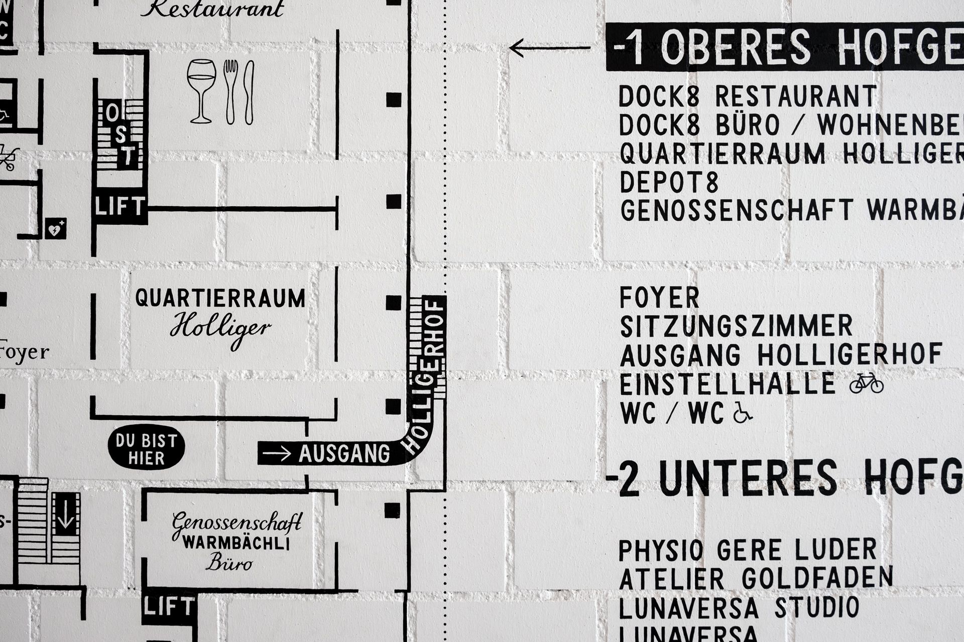 The concept of Heyday reflects the vibrant, social, improvised, and playful spirit of the place. Subtle humour in the details shape the character without affecting the functionality of the signage. At the same time, the concept draws like a straight line in the history of the building. Heyday got the inspiration for the concept from a wall plan painted by Johanna Schaible during the interim use. The artist, illustrator and child book author had her studio here for some time. It is her who realised the hand-lettered signage for the entire building and thus helps to preserve the history and identity of the place.