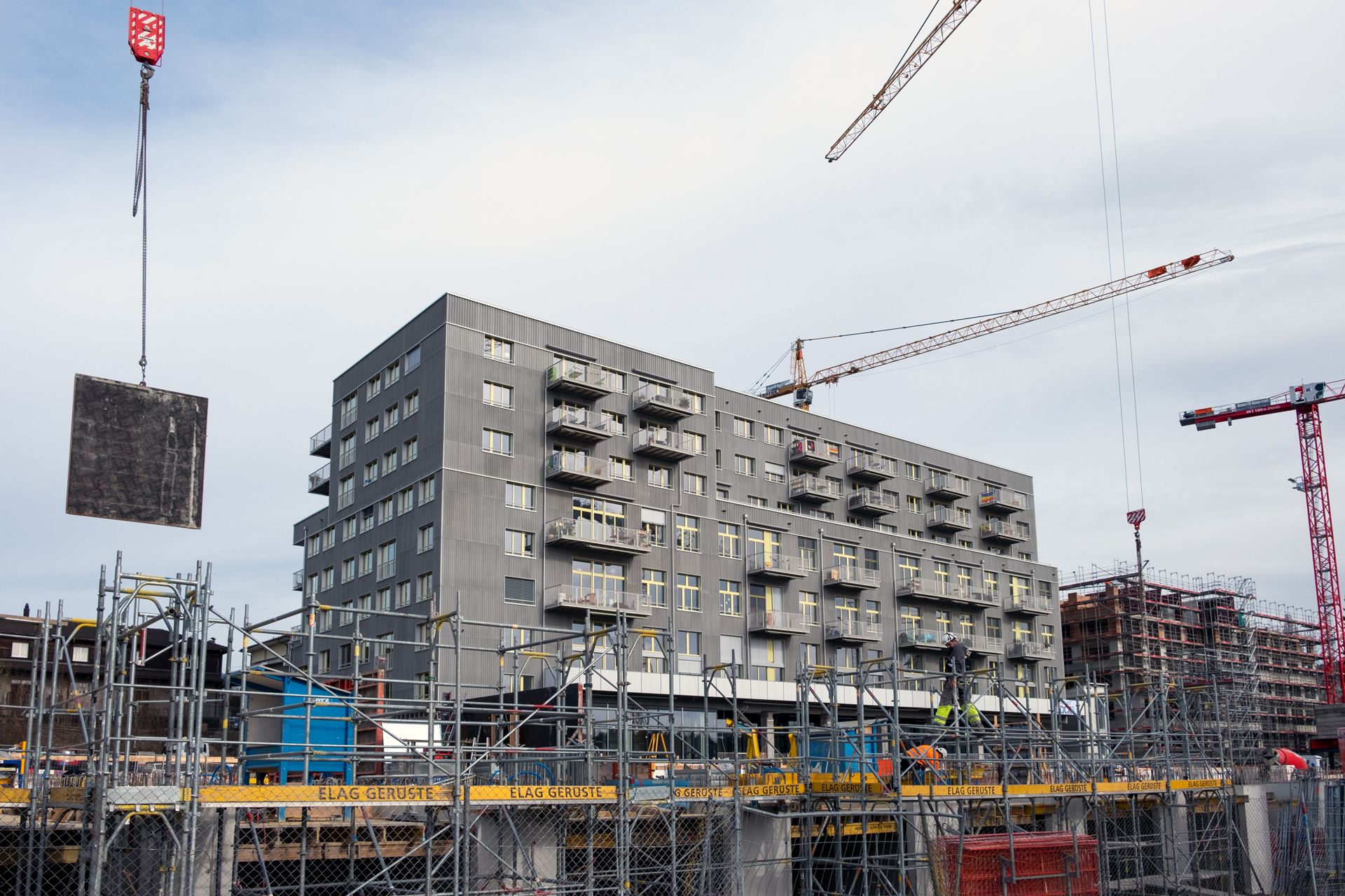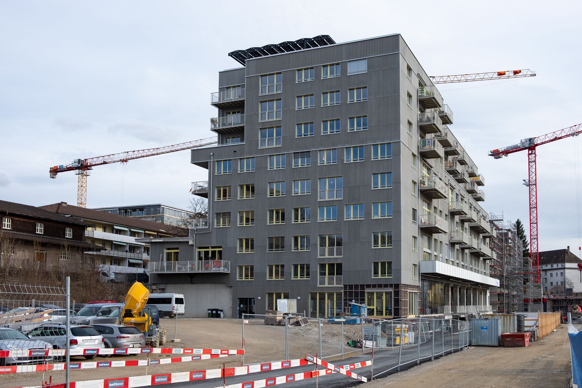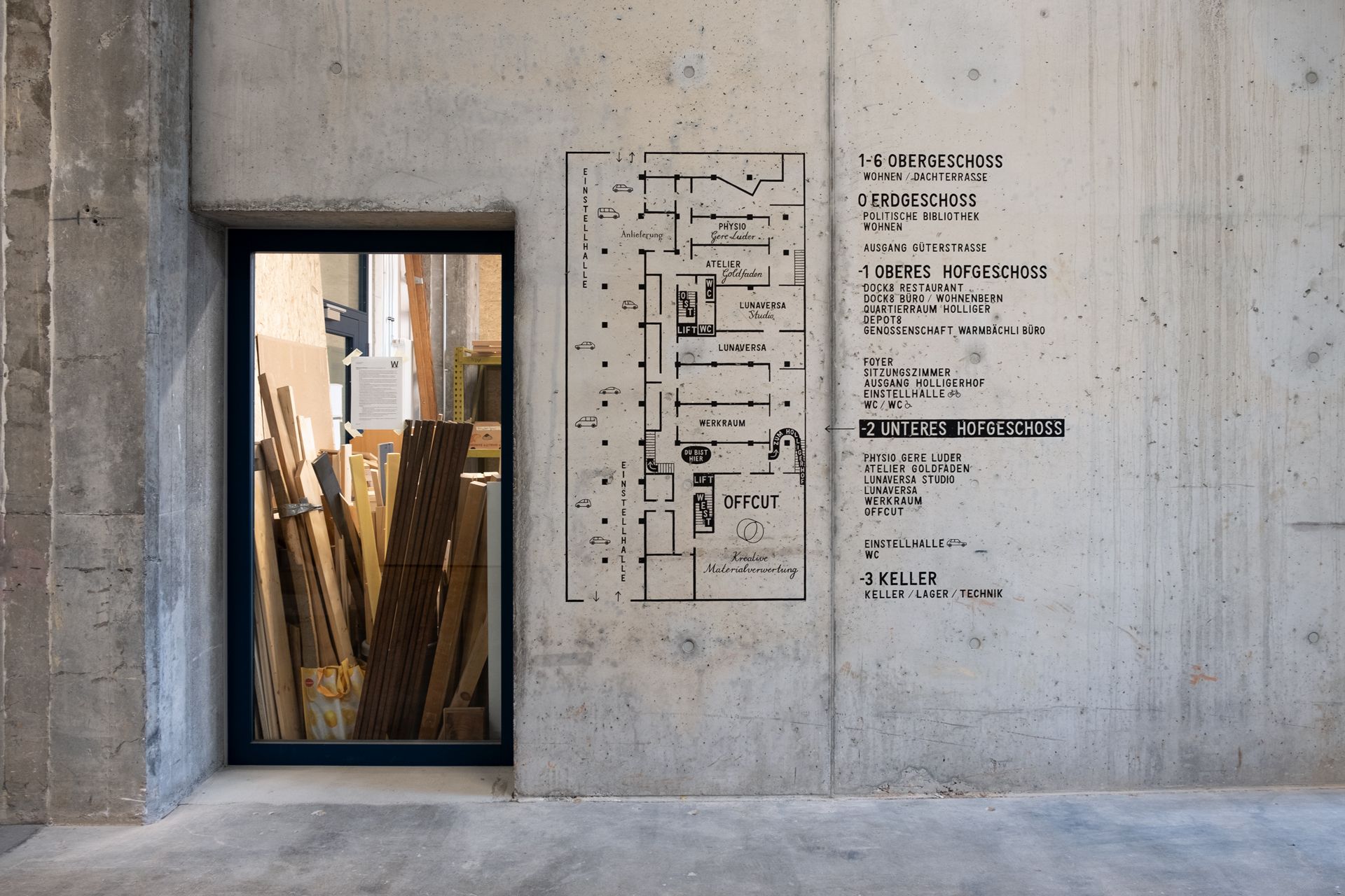 The cooperative has converted the building into apartments and commercial space. It is the first out of six buildings in the Holliger area, where living space for around 900 people emerges by 2027. In some cases, the 4.6 m high rooms are rented out without any sort of interior fittings, and the housing communities build their own rooms from scratch. Besides living space, the building also offers a political library, various businesses, a restaurant, day care centres and community rooms.