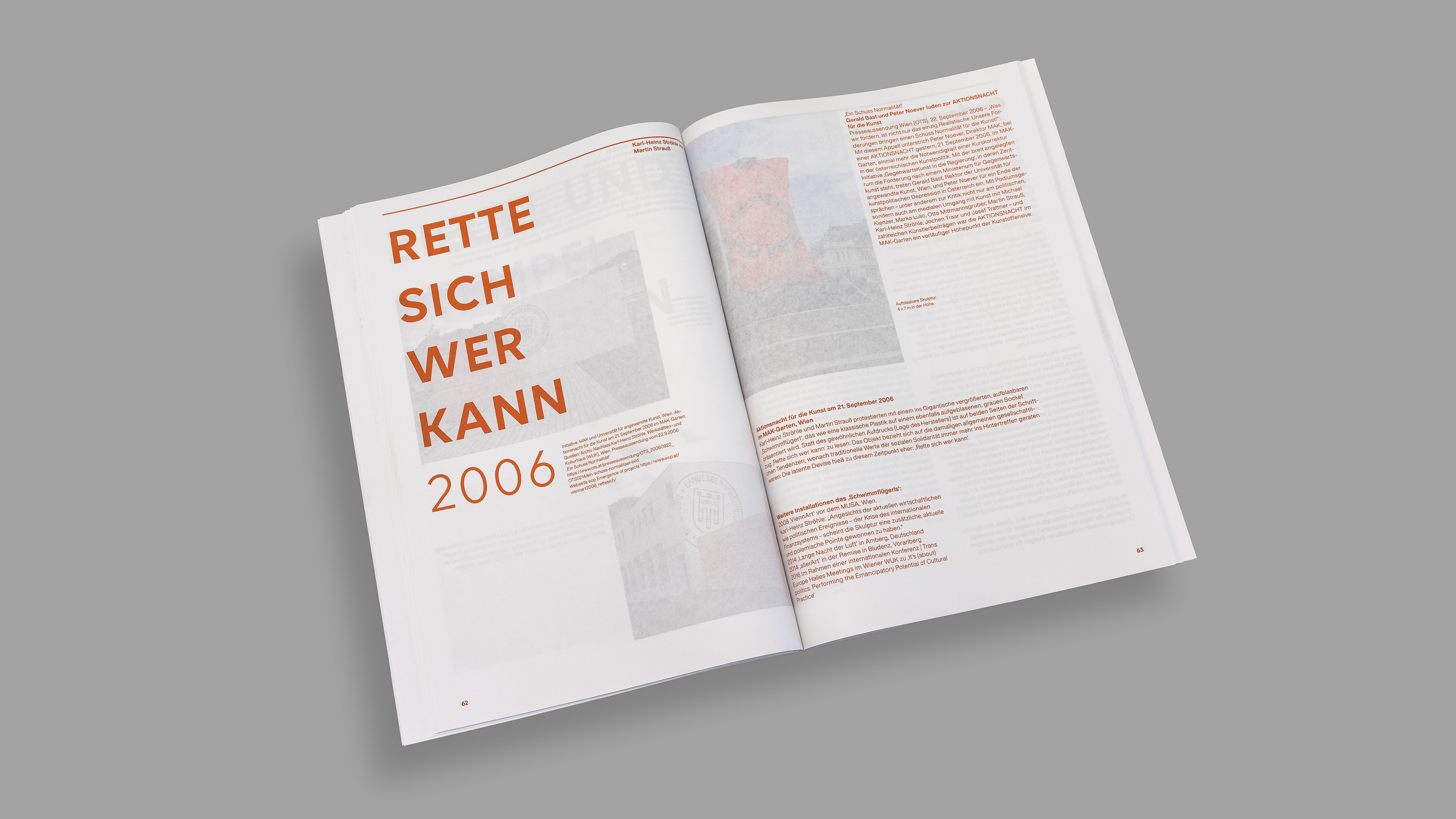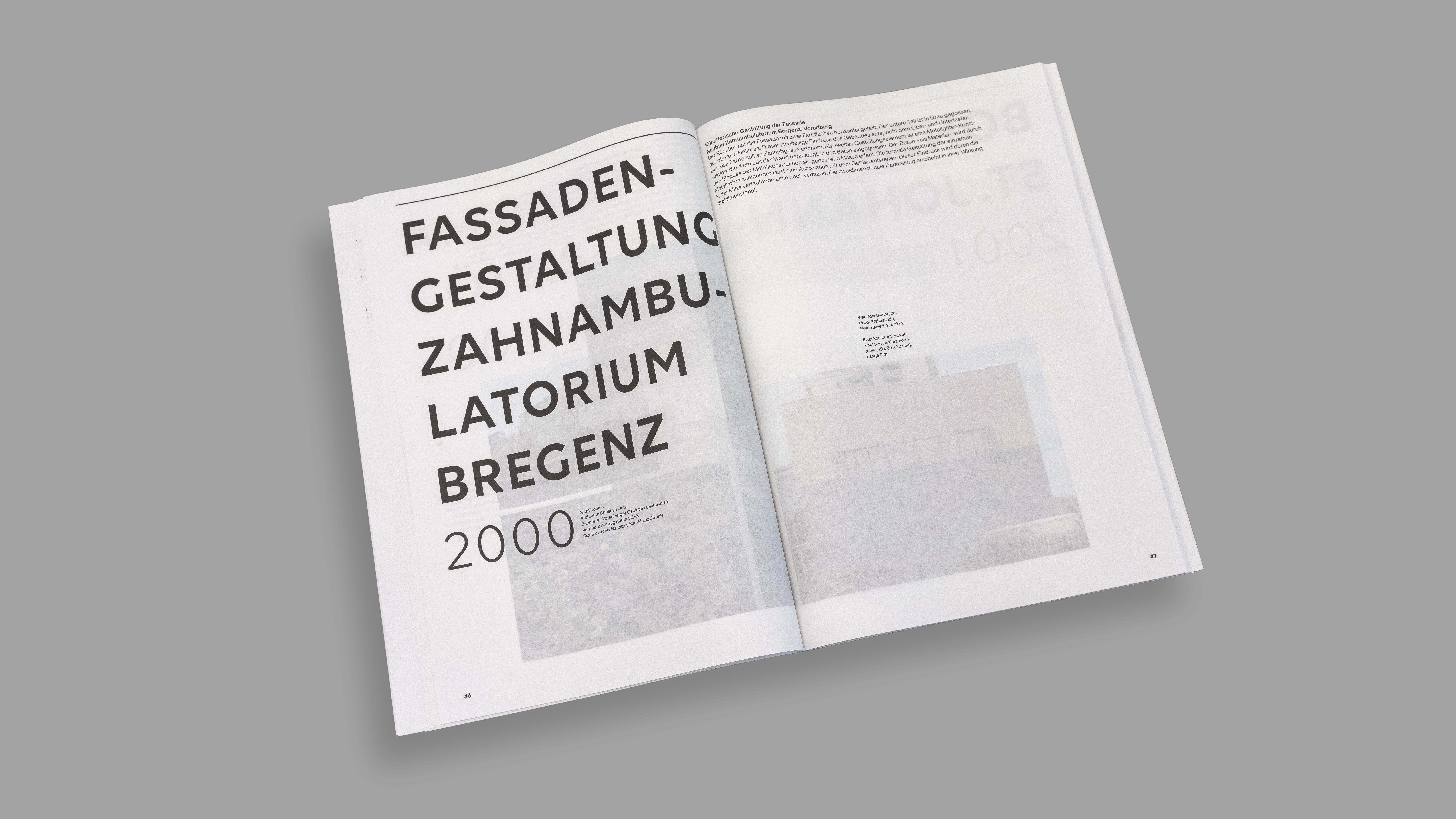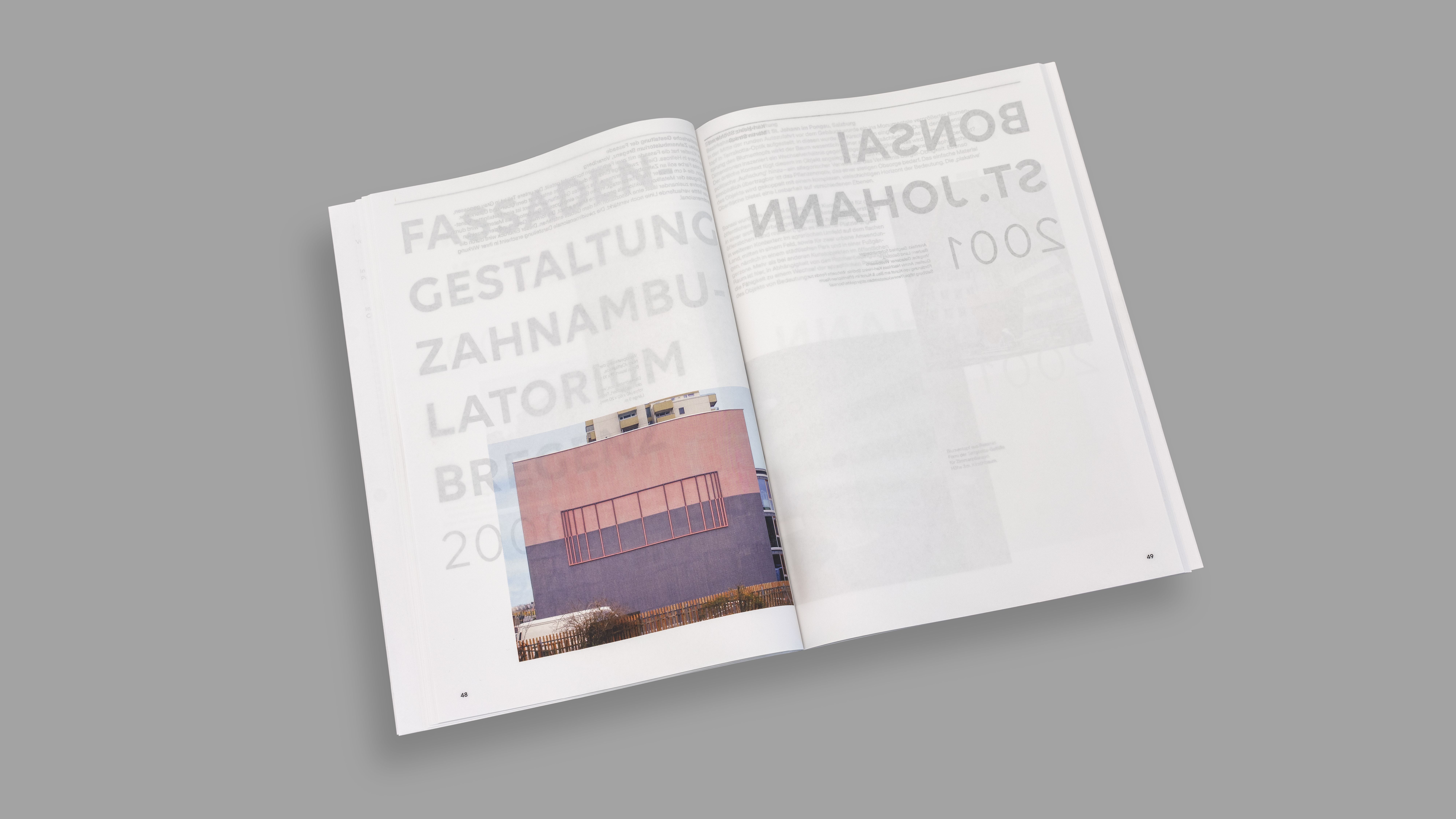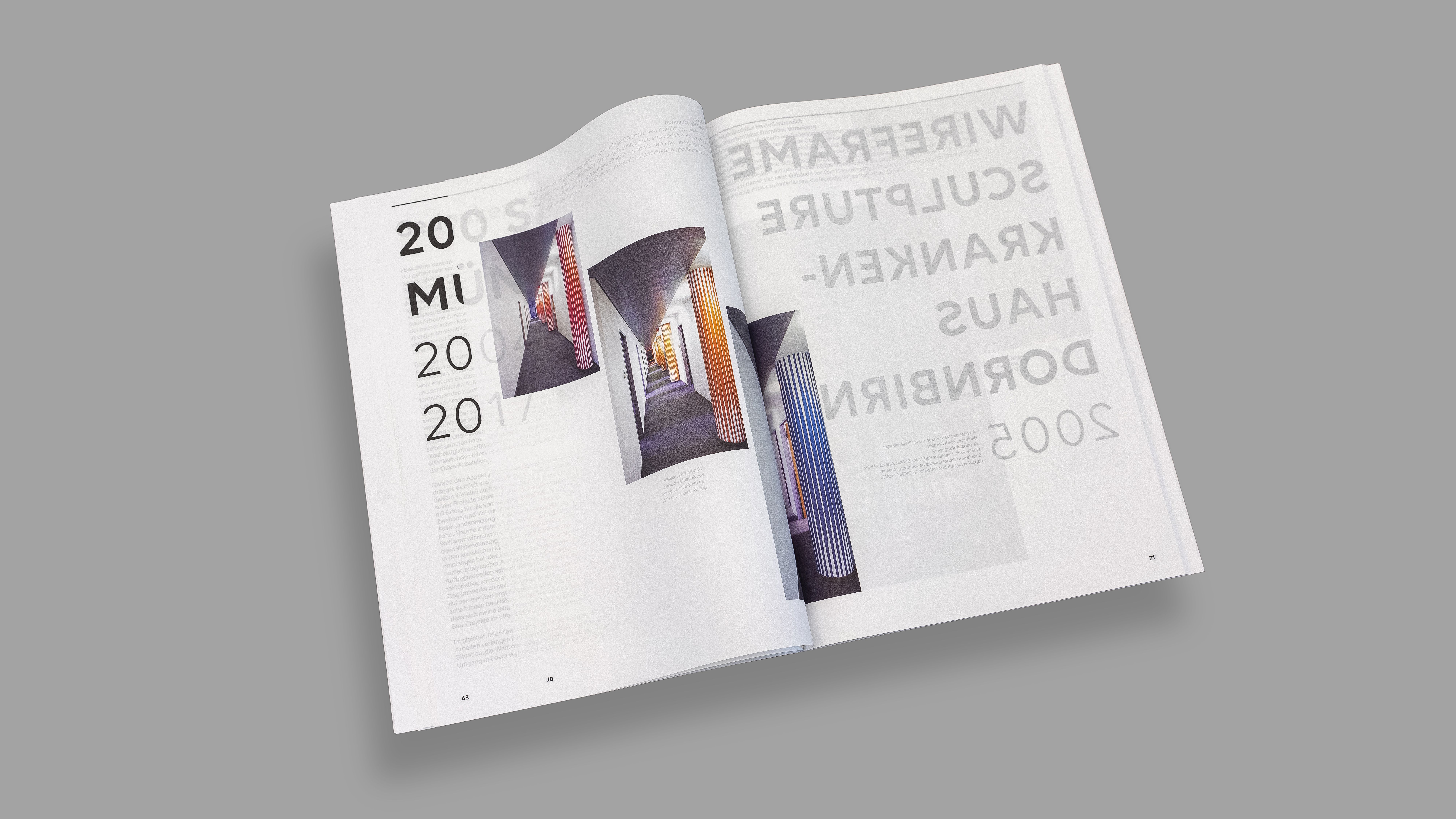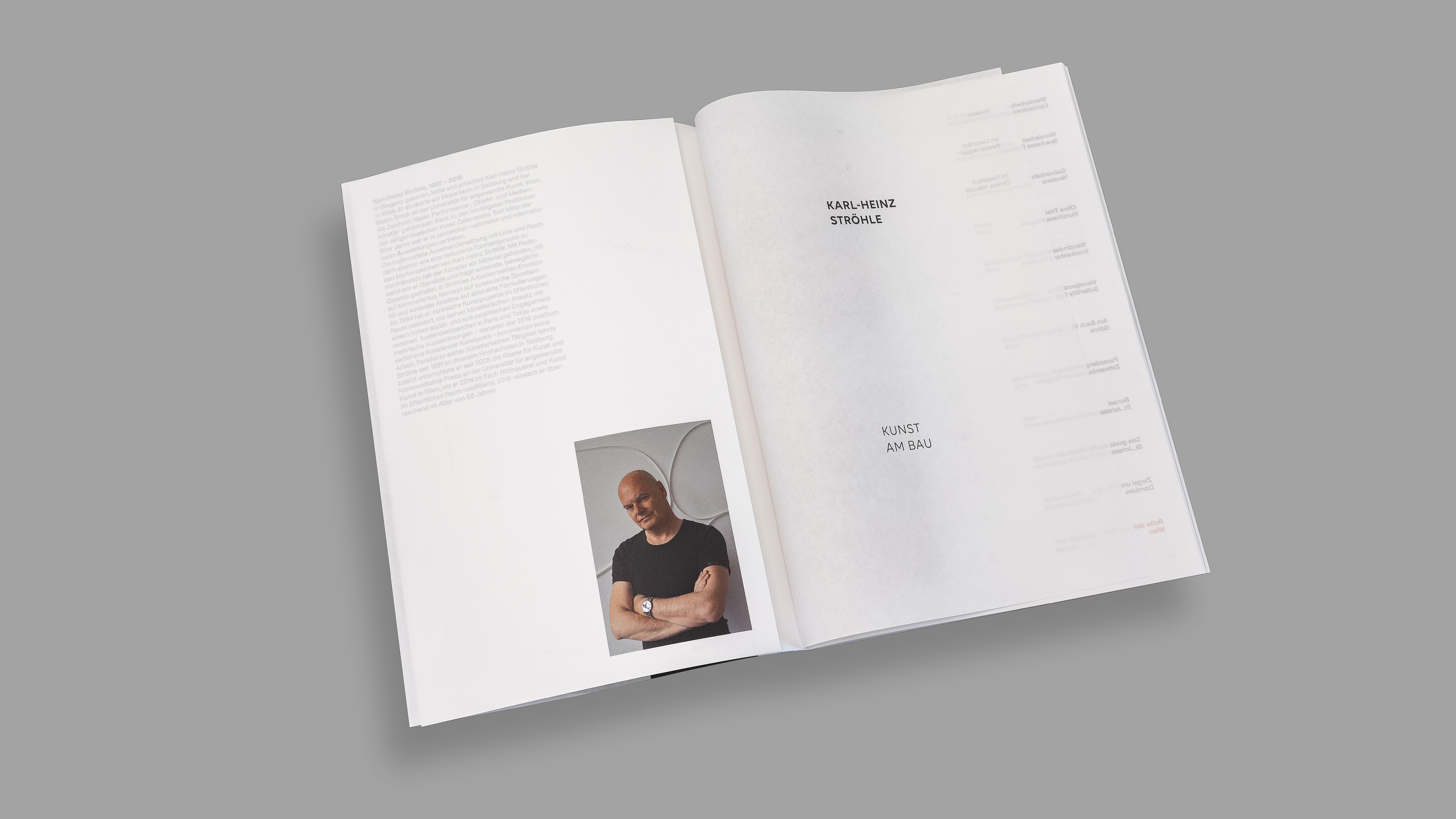 To mark an exhibition of the work of Karl-Heinz Ströhle Atelier Andrea Gassner designed a 132-page “Art-in-Building Magazine”, employing design qualities that relate to those found in Karl-Heinz Ströhle’s work: white space, clear lines, reduction, materiality, translucence, and movement. The pages of text are consistently separated from the image pages and are yet woven together using a transparent paper. The way in which the generous image pages and the typography of the text pages overlap creates an entirely new dynamism and spatiality. After turning the page to an image, the project title in large print blends behind it, like a glazed underprint.