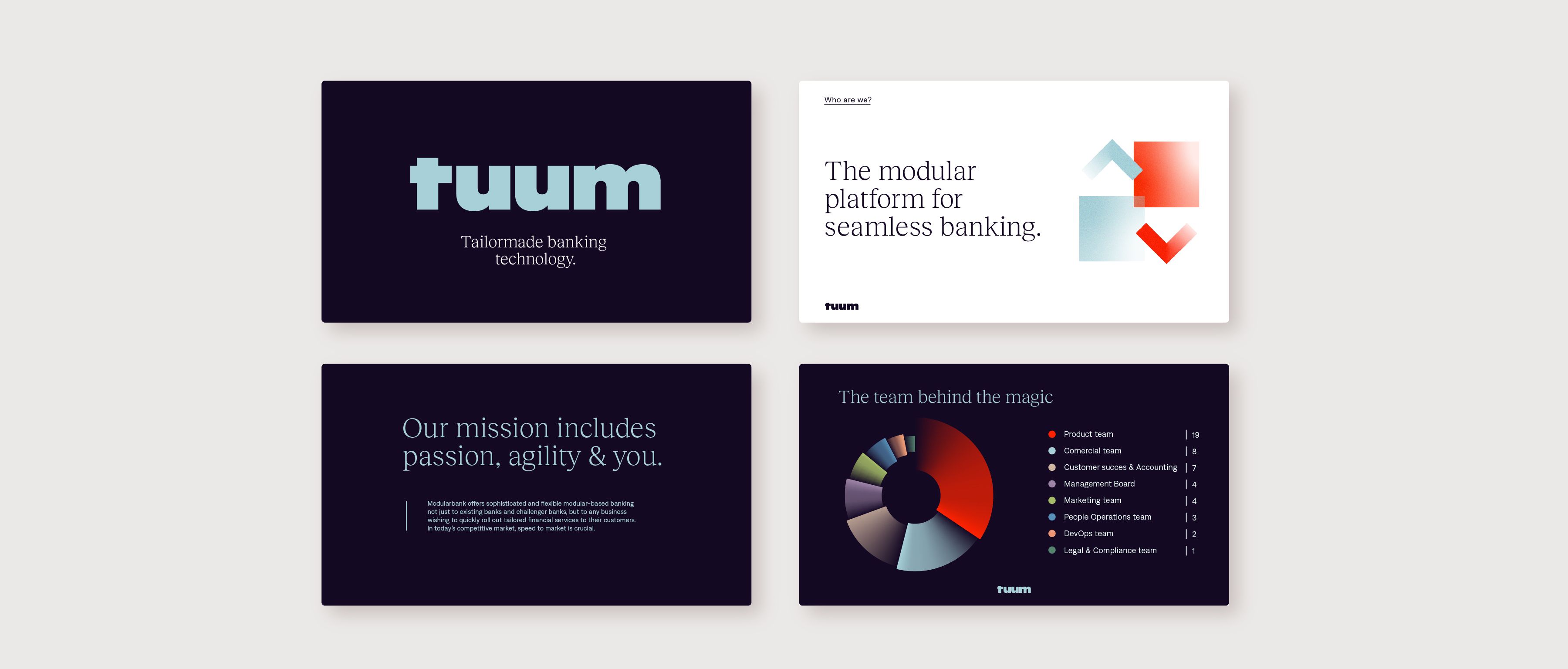 In the same way that clients build their banking solution using Tuum, the brand can now construct its own identity using their own building blocks. The processing tool enables them to create digital shapes that are always different, yet distinctively Tuum. After the rebranding, Tuum raised €15 million euro in a Series A Funding Round.