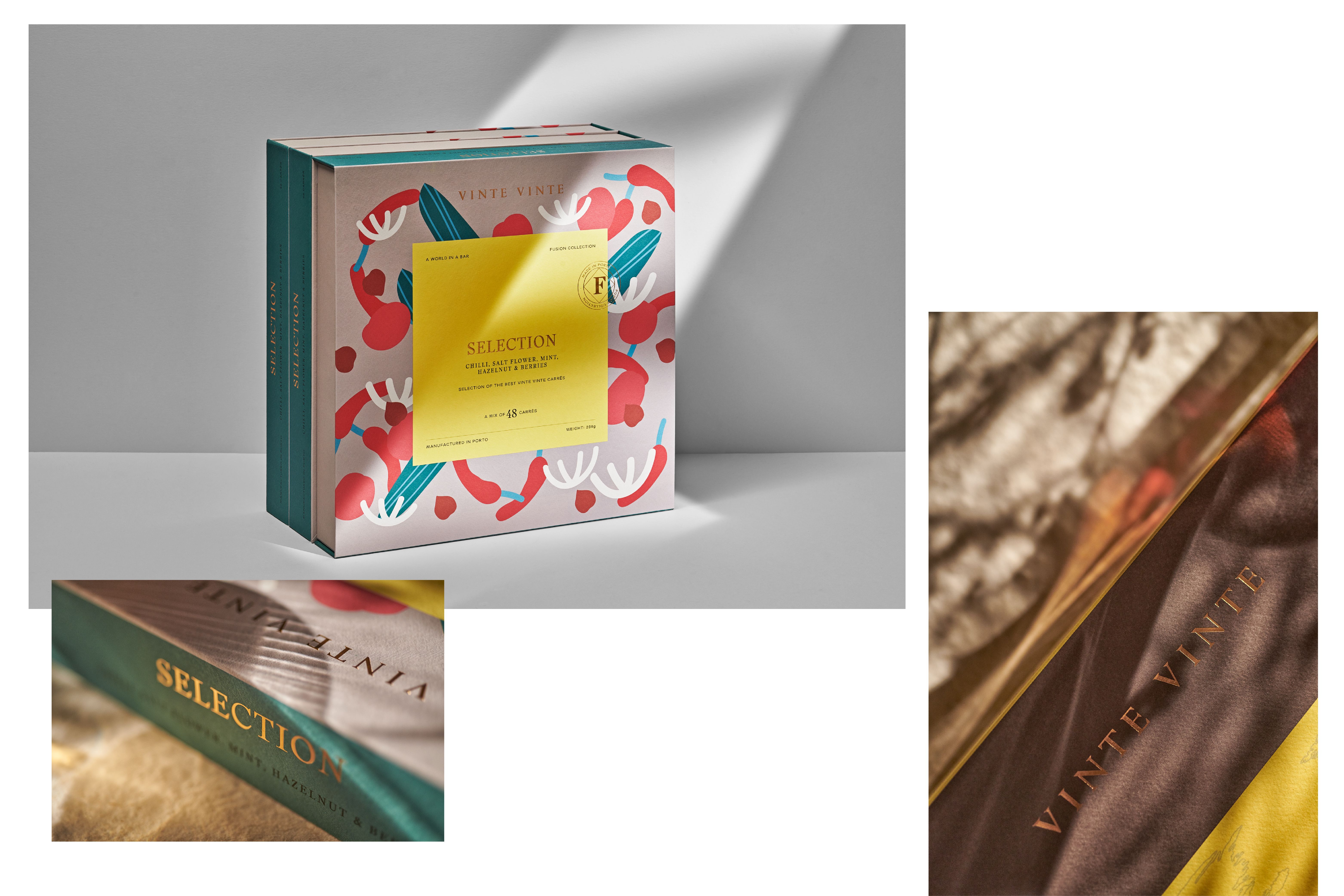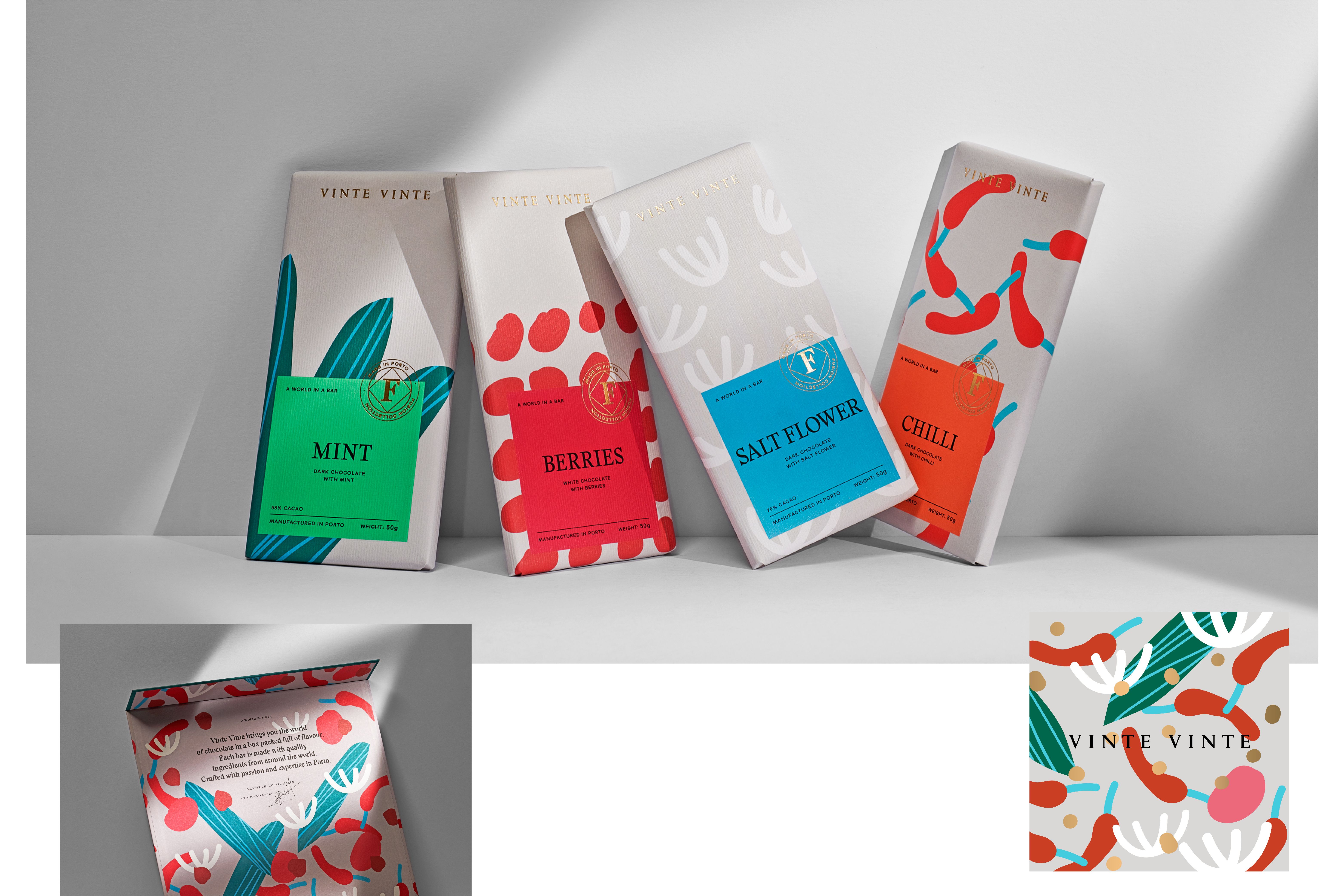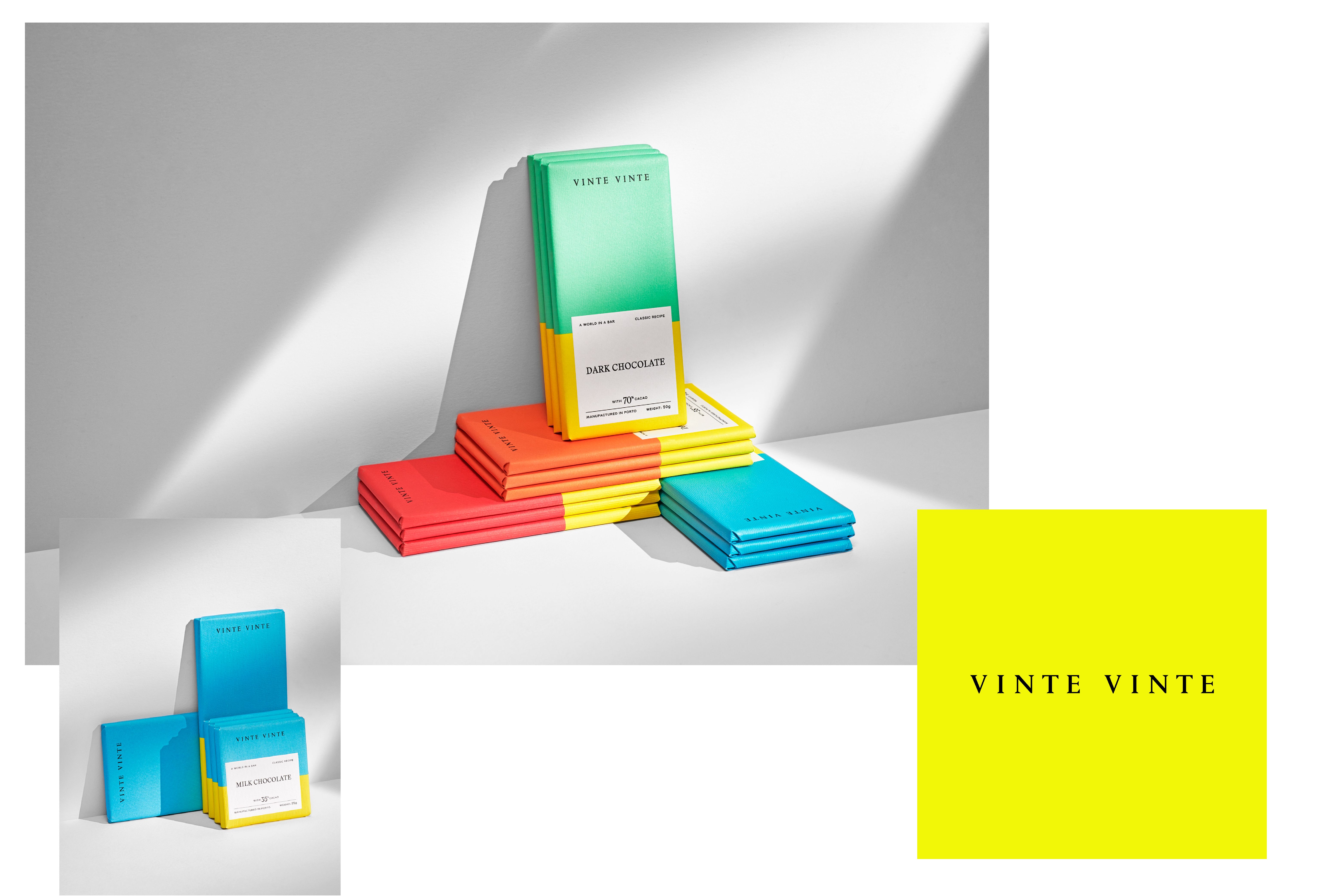 The World of Wine (WOW) is Porto's new cultural and touristic quarter created by The Fladgate Partnership. It integrates “The Chocolate Story,” a factory that produces authentic “bean to bar” chocolate. Vinte Vinte was born after twelve months of intense collaboration with the customer in defining the strategy branding, naming, identity and packaging. The brand has defined four product lines that evolve in terms of experience, quality and sophistication. They are Classic, Fusion, Cocoa Intensity and Grand Cru. The brand's intention was to create a formal and classic identity, contrasting with a colorful and vibrant packaging, which transmits variety and creates an impact on the linear.