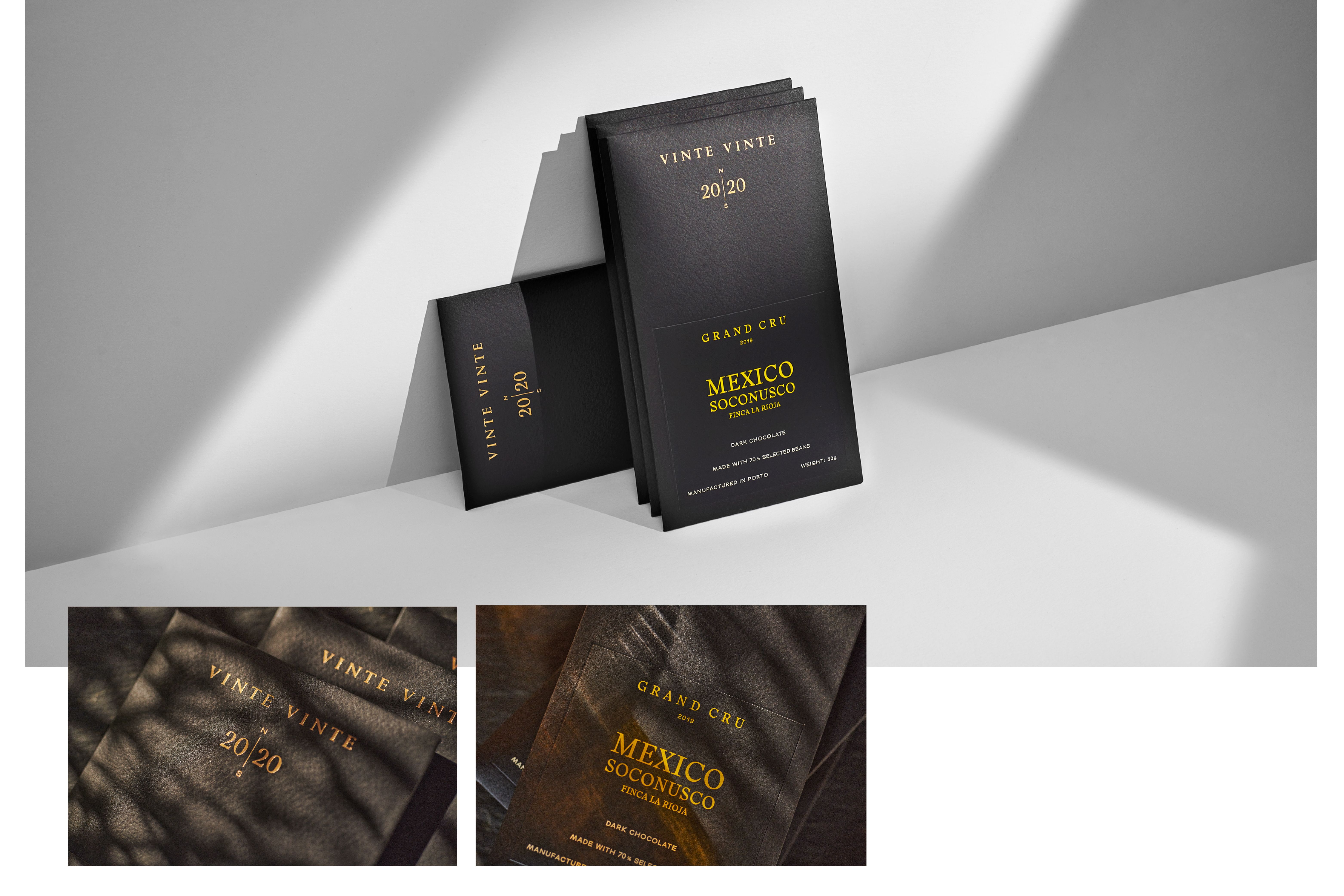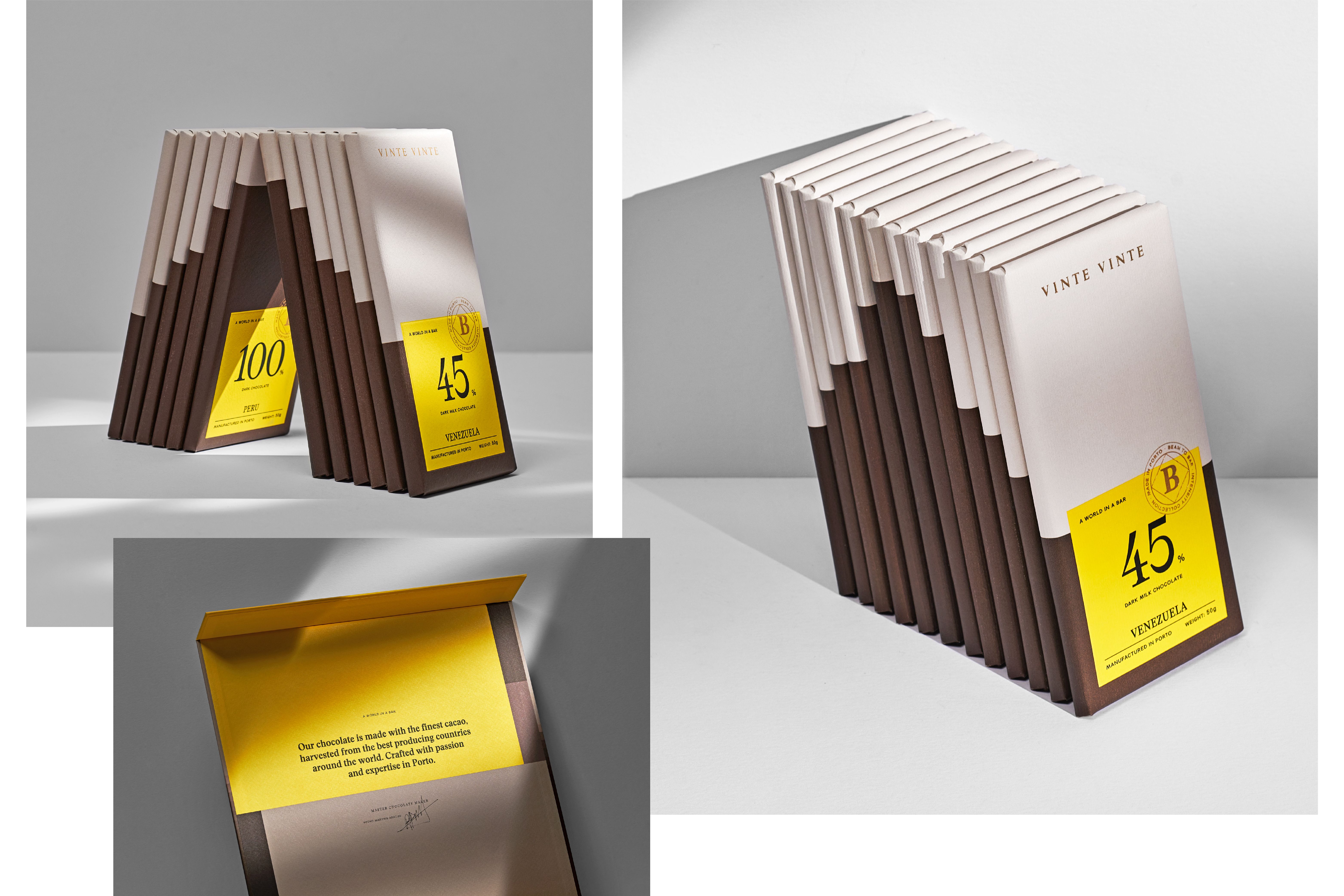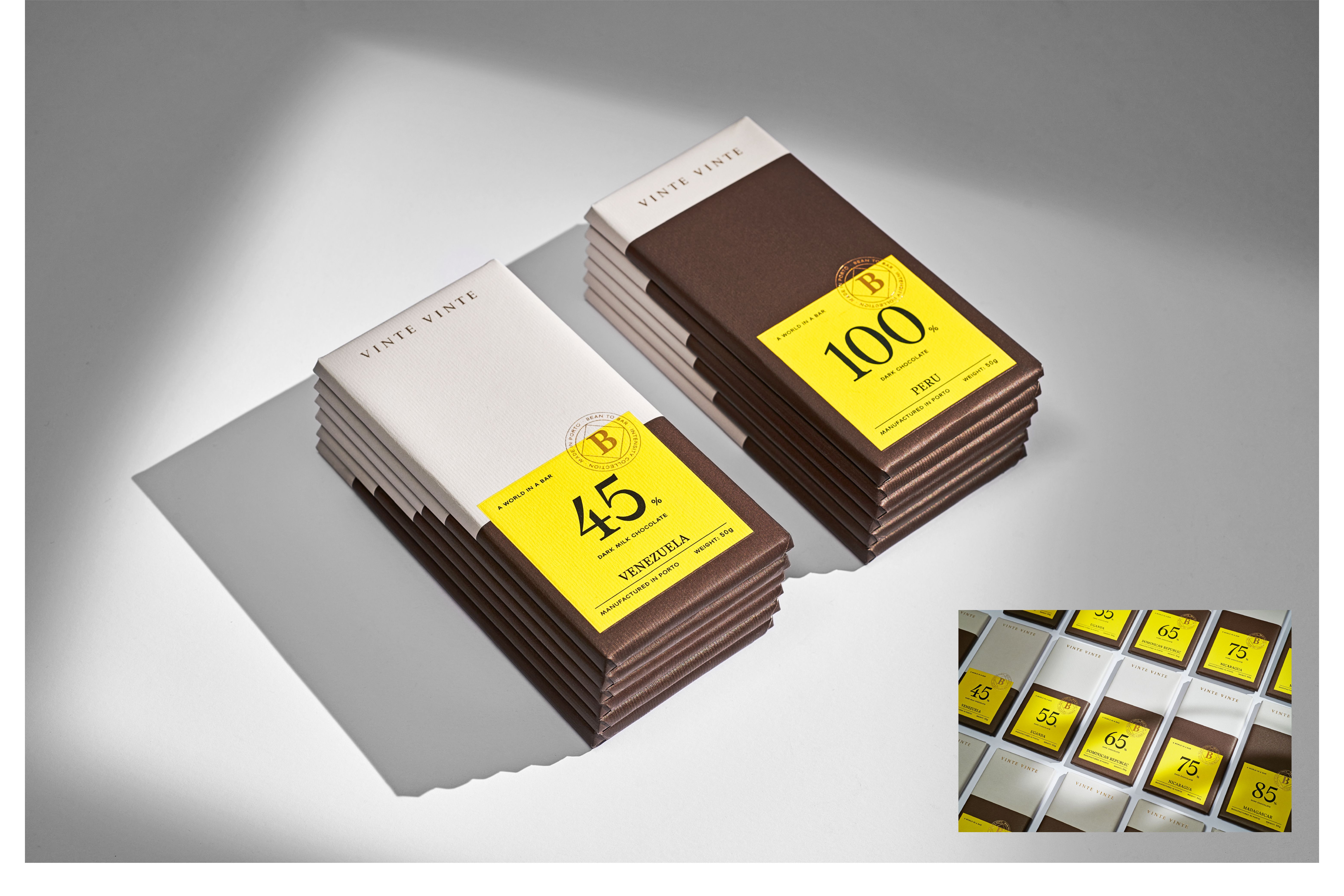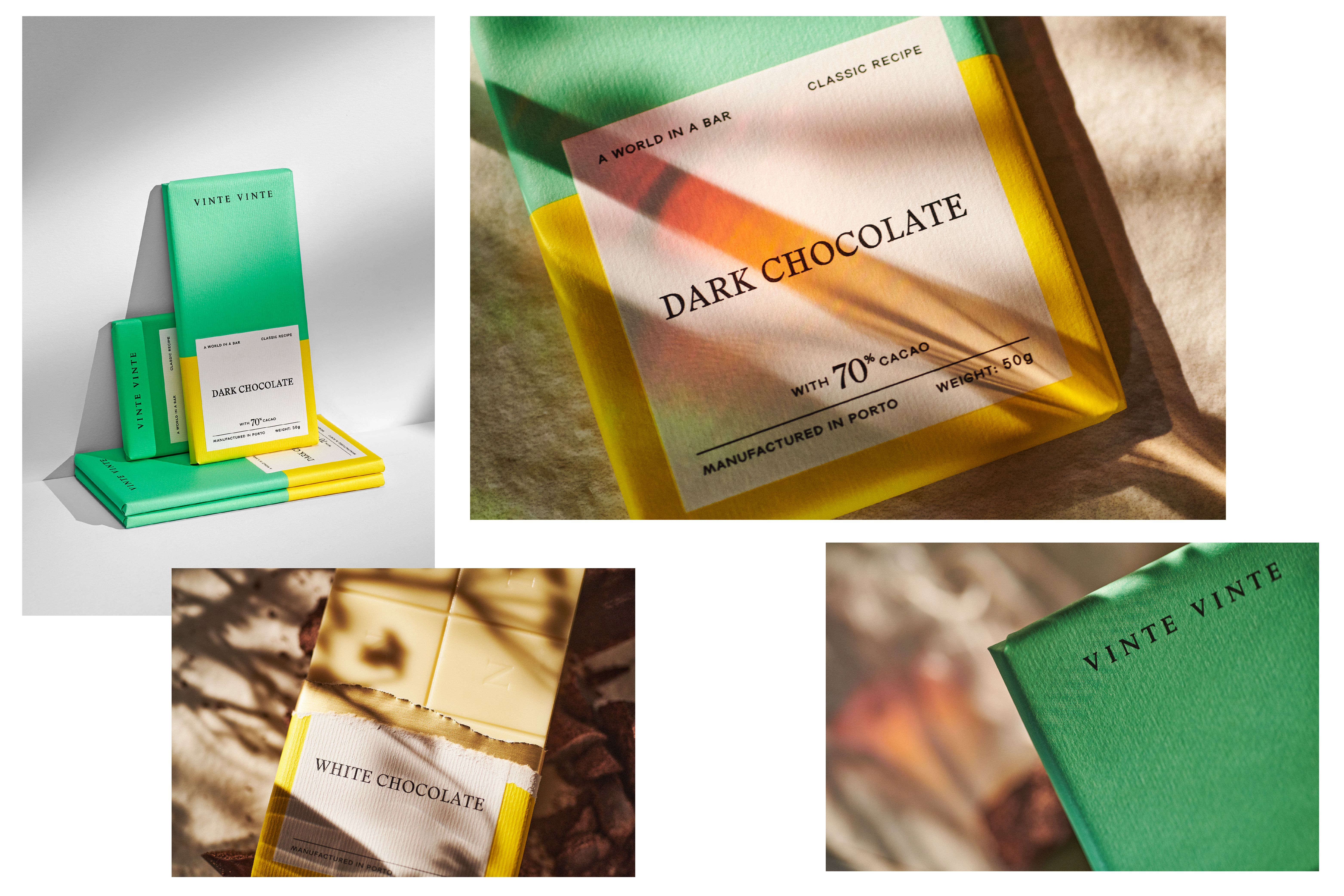The World of Wine (WOW) is Porto's new cultural and touristic quarter created by The Fladgate Partnership. It integrates “The Chocolate Story,” a factory that produces authentic “bean to bar” chocolate. Vinte Vinte was born after twelve months of intense collaboration with the customer in defining the strategy branding, naming, identity and packaging. The brand has defined four product lines that evolve in terms of experience, quality and sophistication. They are Classic, Fusion, Cocoa Intensity and Grand Cru. The brand's intention was to create a formal and classic identity, contrasting with a colorful and vibrant packaging, which transmits variety and creates an impact on the linear.