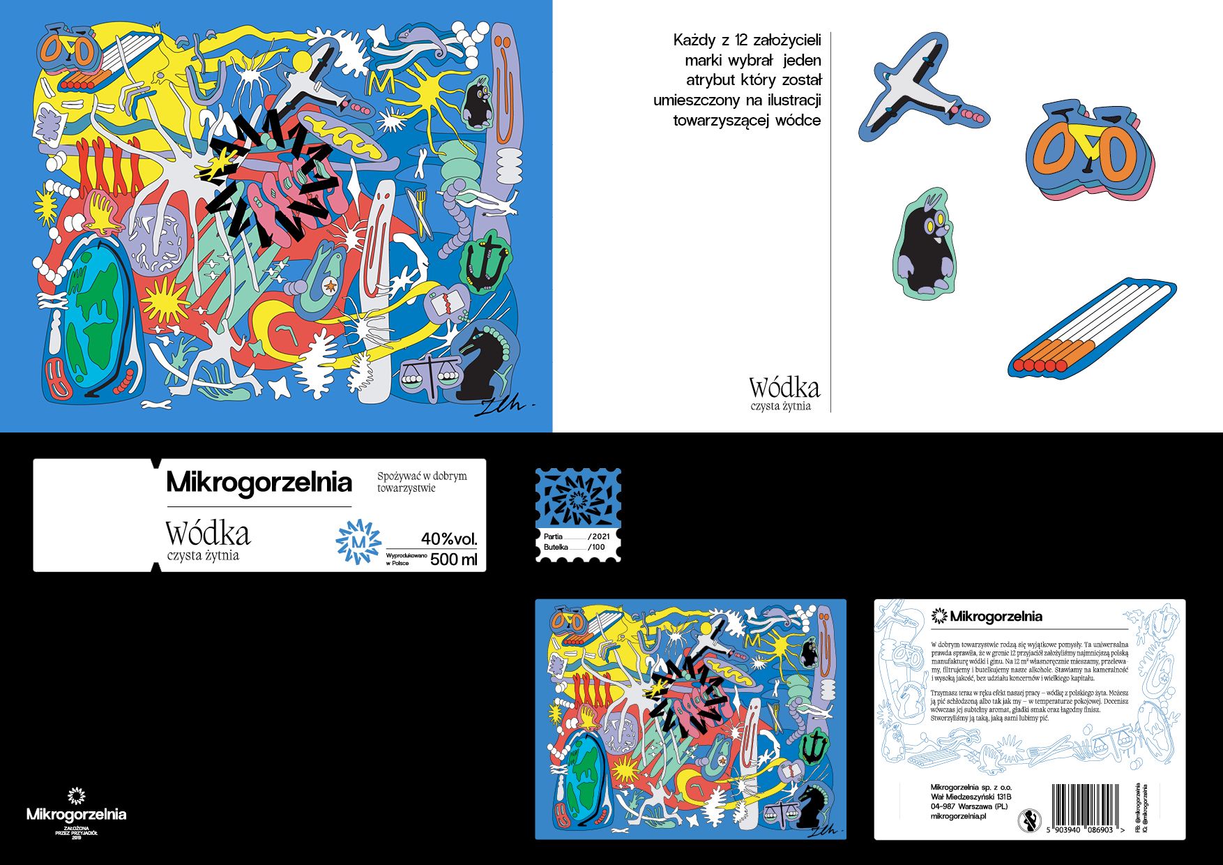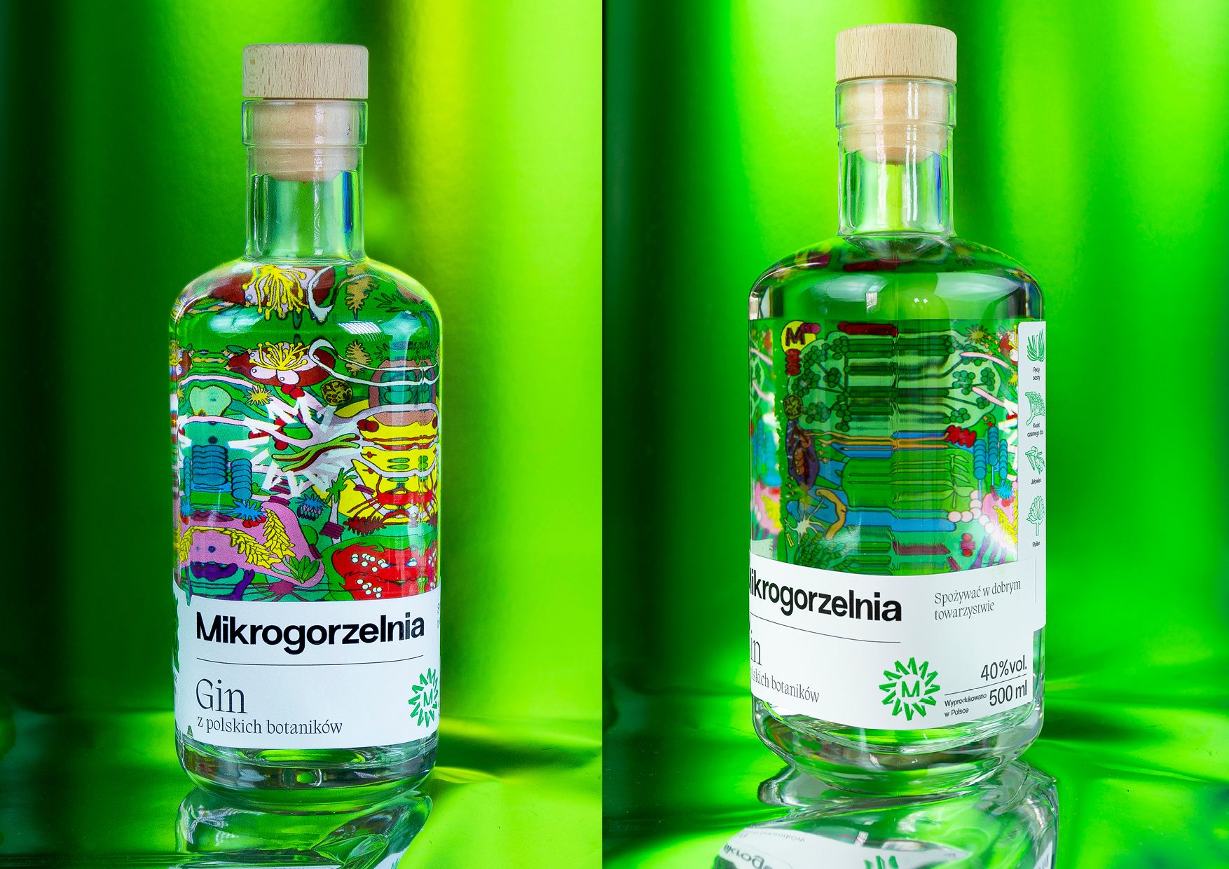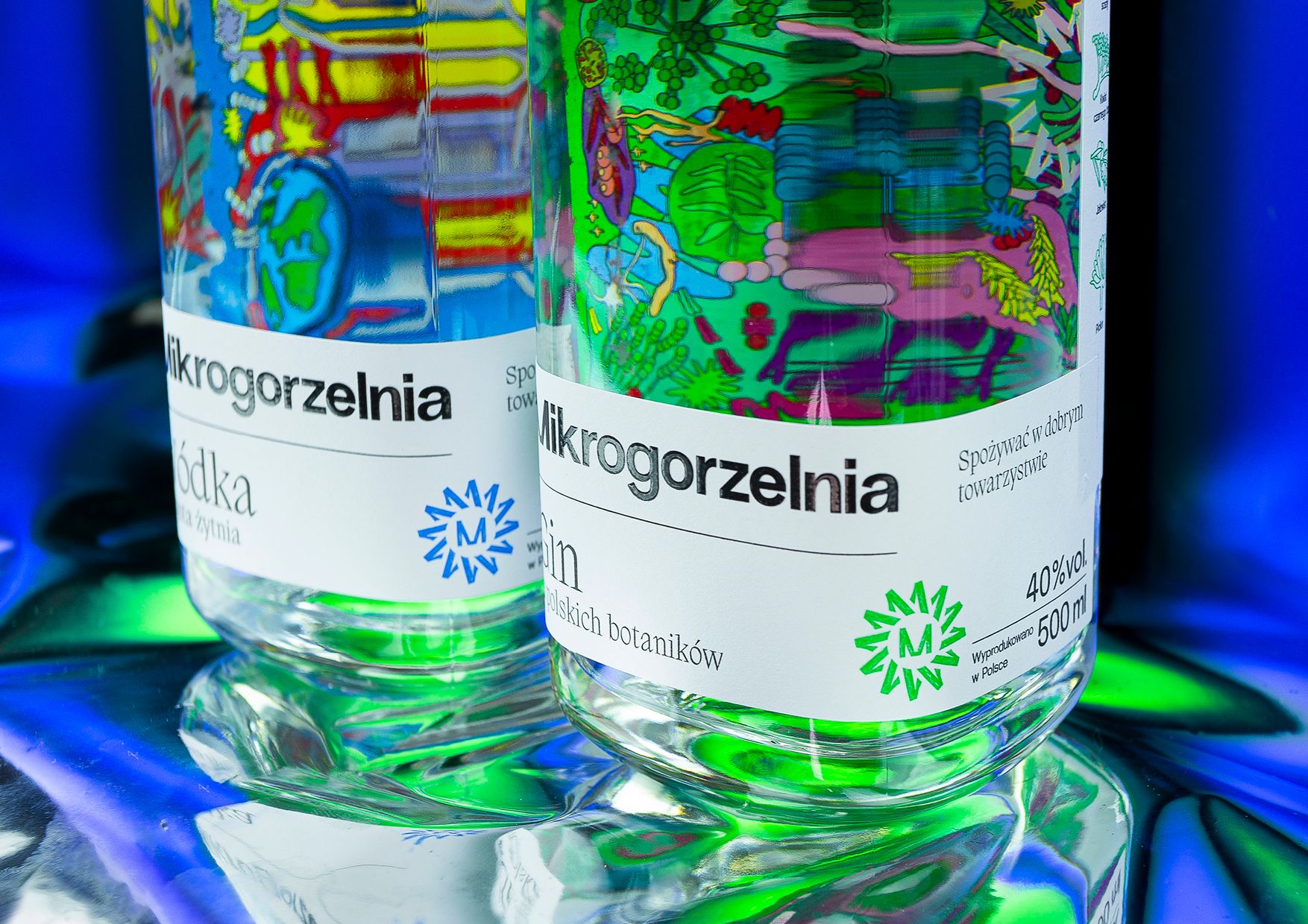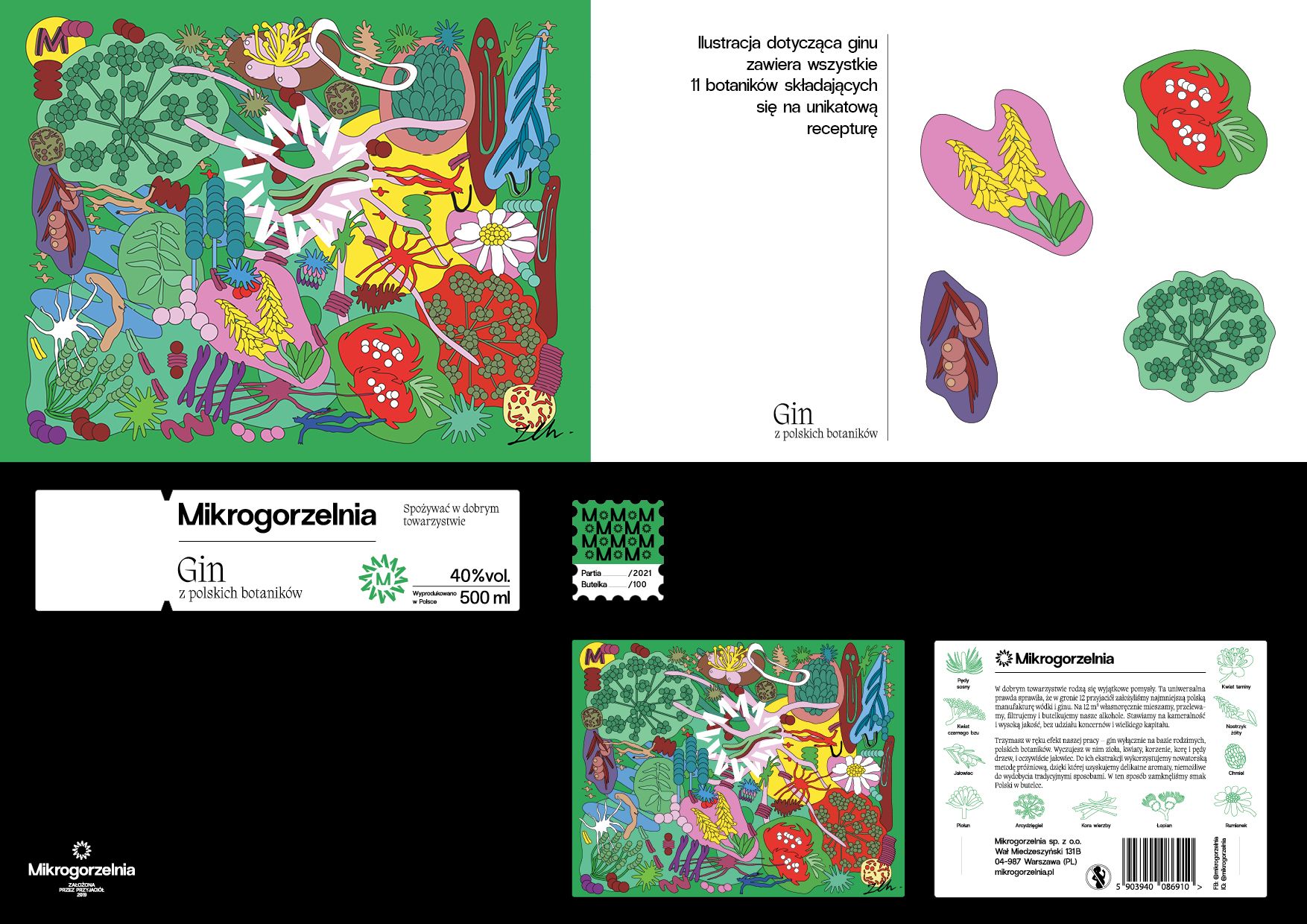 The first two products introduced onto the market by Mikrogorzelnia are pure rye vodka and gin made from Polish botanicals. By emphasizing the visual identity of the brand in the packaging design, we’ve decided to combine a clean, simple front label with a psychedelic illustration inside the bottle. Each of the founders of the brand chose one of the attributes from which the illustration accompanying the vodka was built. The Gin illustration talks about the ingredients. It contains images of all of the 11 Polish botanicals used to create the unique recipe of the spirit.