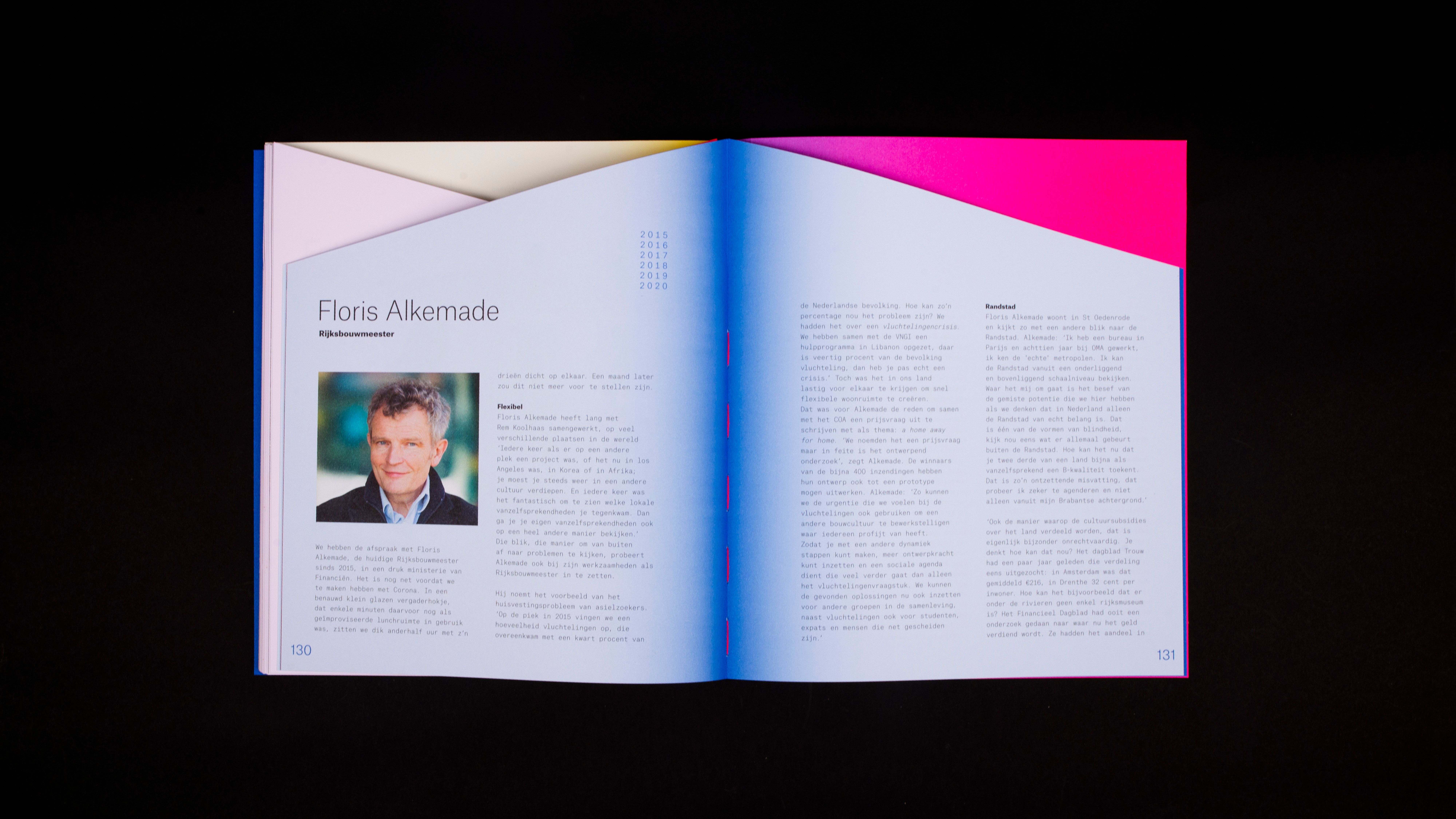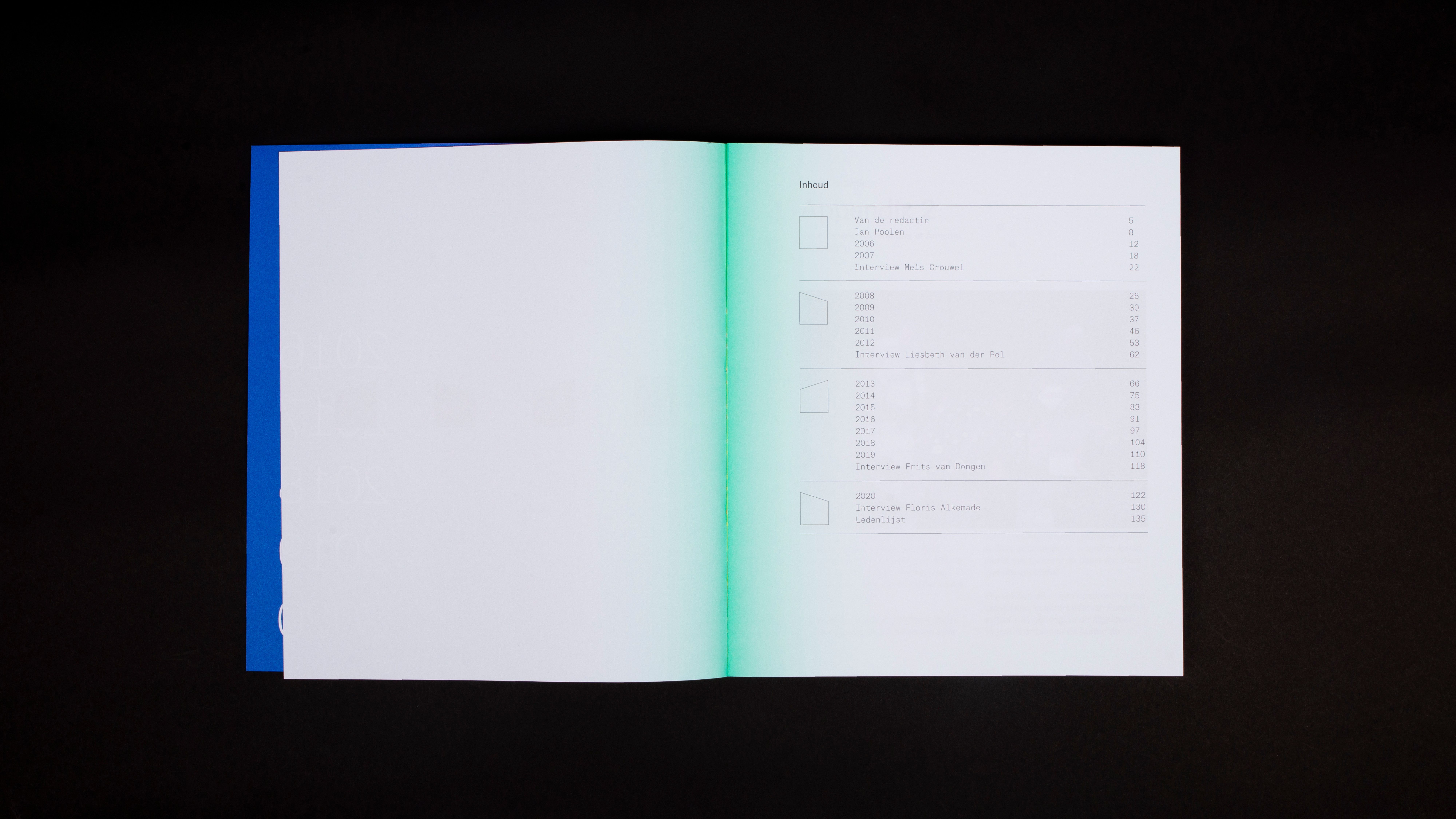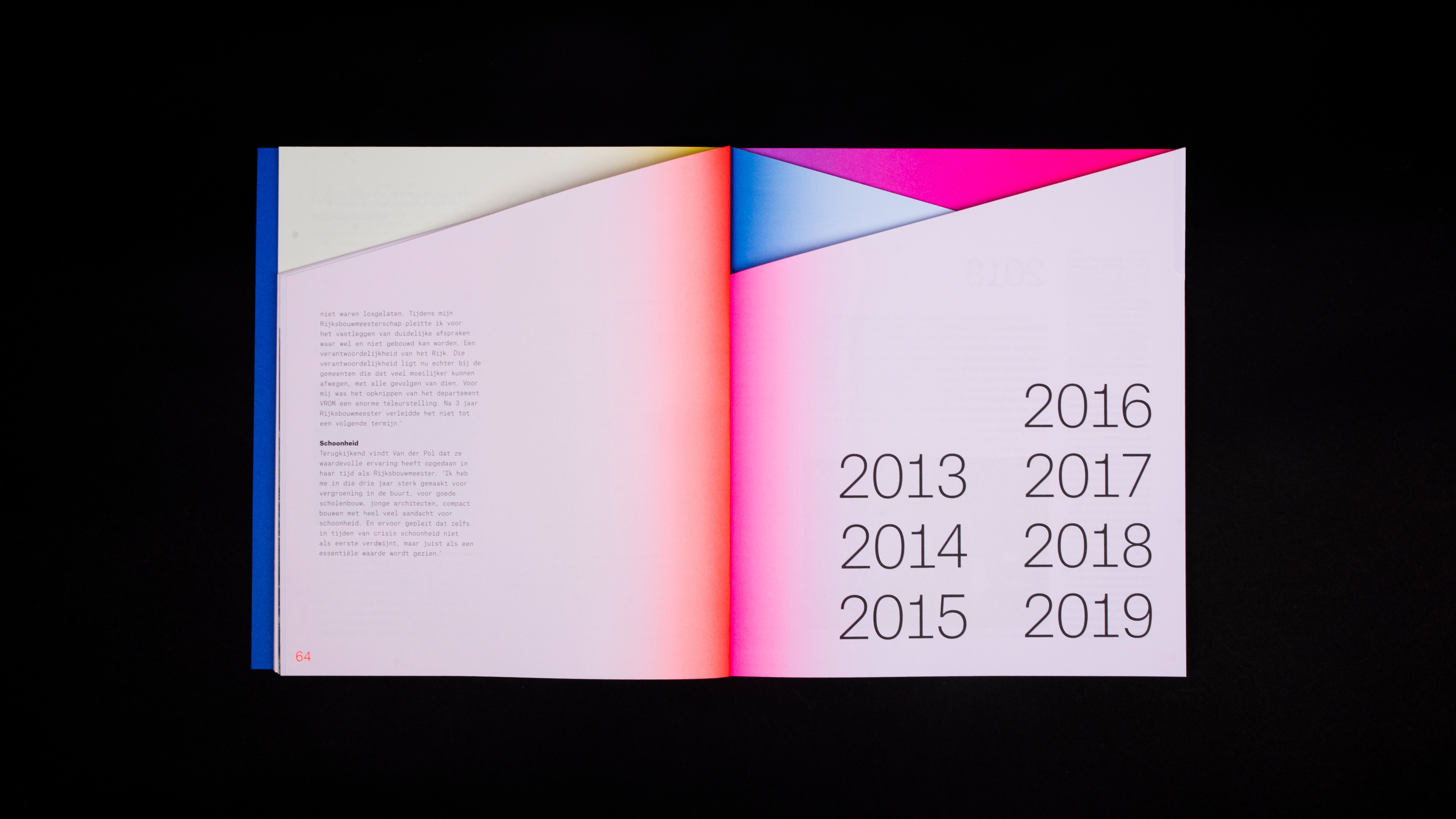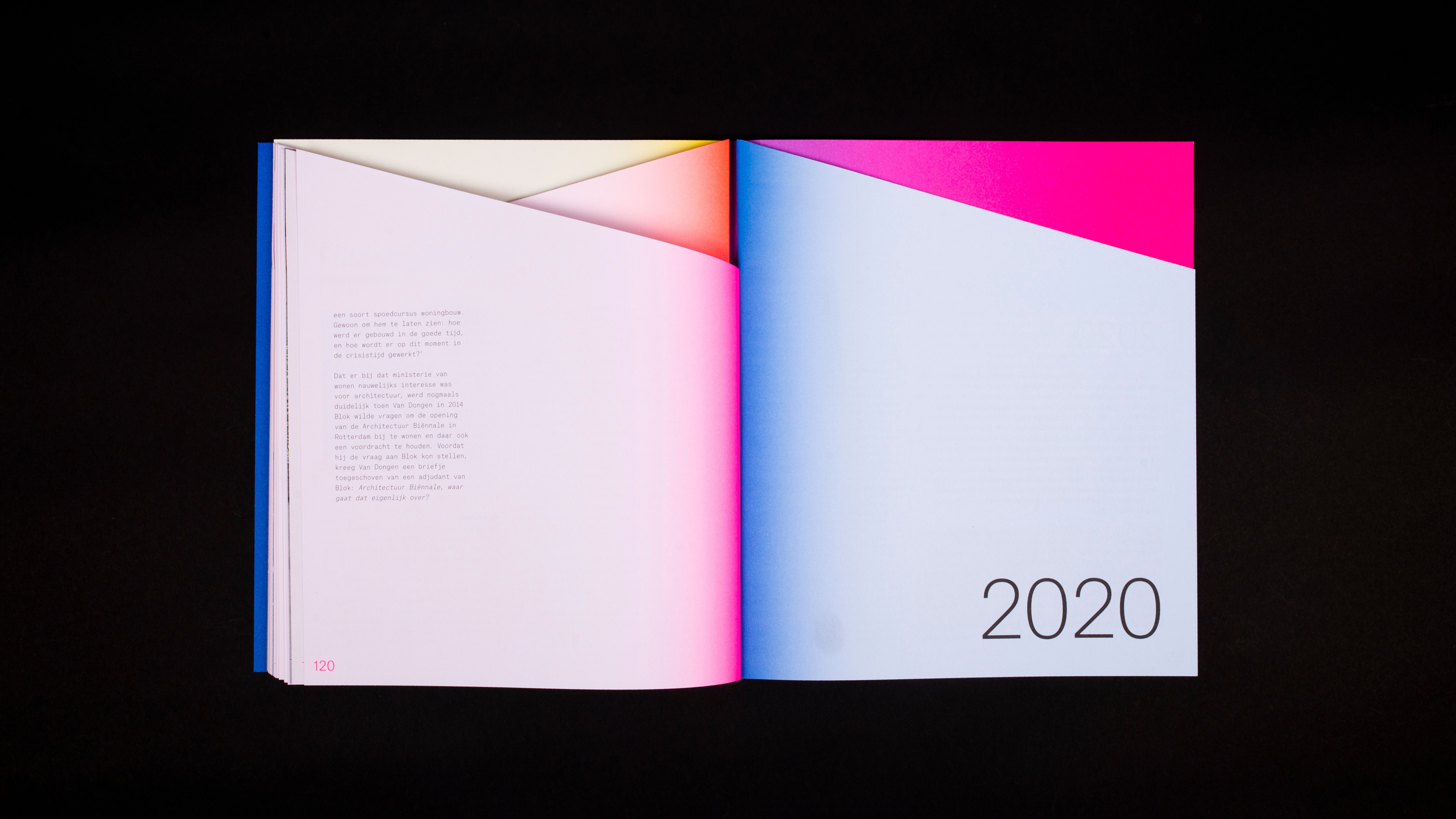 These different parts have been put together chronologically according to the years and divided into four parts. The book shows in word and design that architectural life has high peaks and deep valleys; from economic boom (2006-2007), to crisis and transformation (2008-2012), from recovery and new roles (2013-2019) to insecurity because of Covid 19 and looking forward (2020). These peaks and valleys are literally transformed into the shape of the book, each with a distinct color, which fades from a vibrant color in the middle of the book to a subtle pastel on the rest of the page. Just like an architect designs a building and architectural lines are arising in a landscape, the design of the book creates changing compositions of form and color in the book. Next to the fact that the concept fits the course of the story, it also fits with the association - in which the combination of looking and reflecting on architecture plays an important role. When you flip through the book, a changing play of shapes of depth, geometric surfaces and changing colors are passing before your eyes.