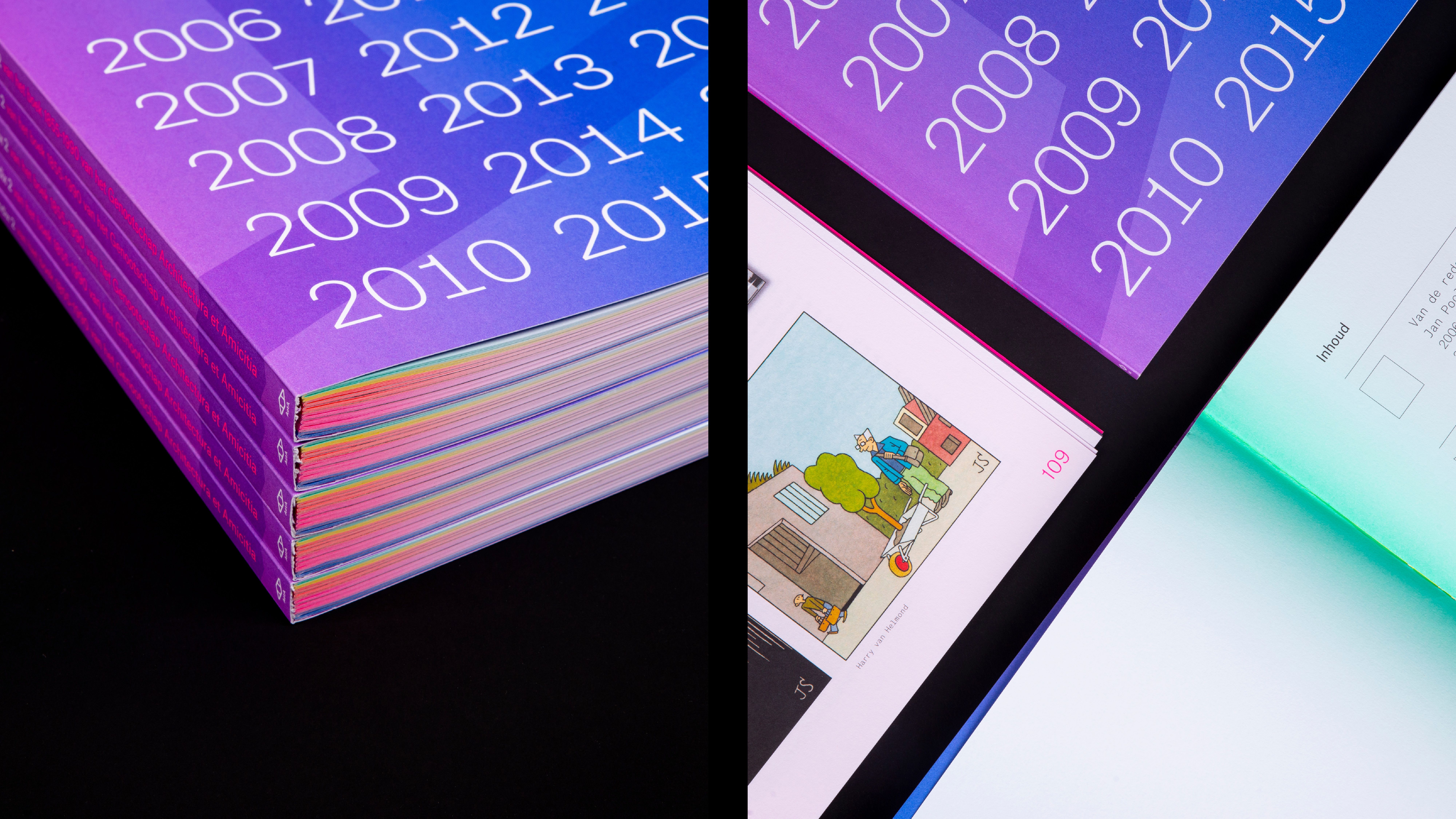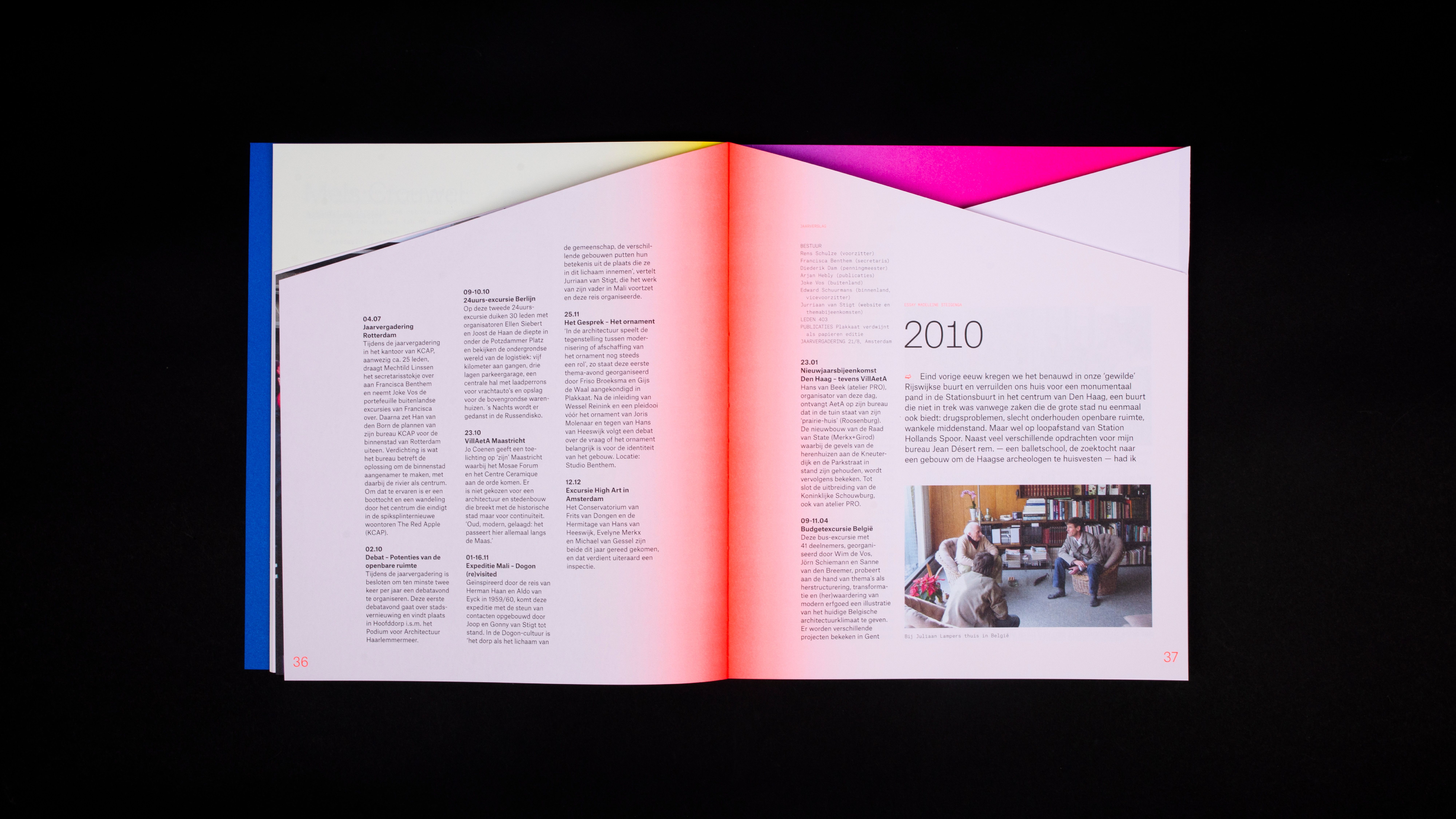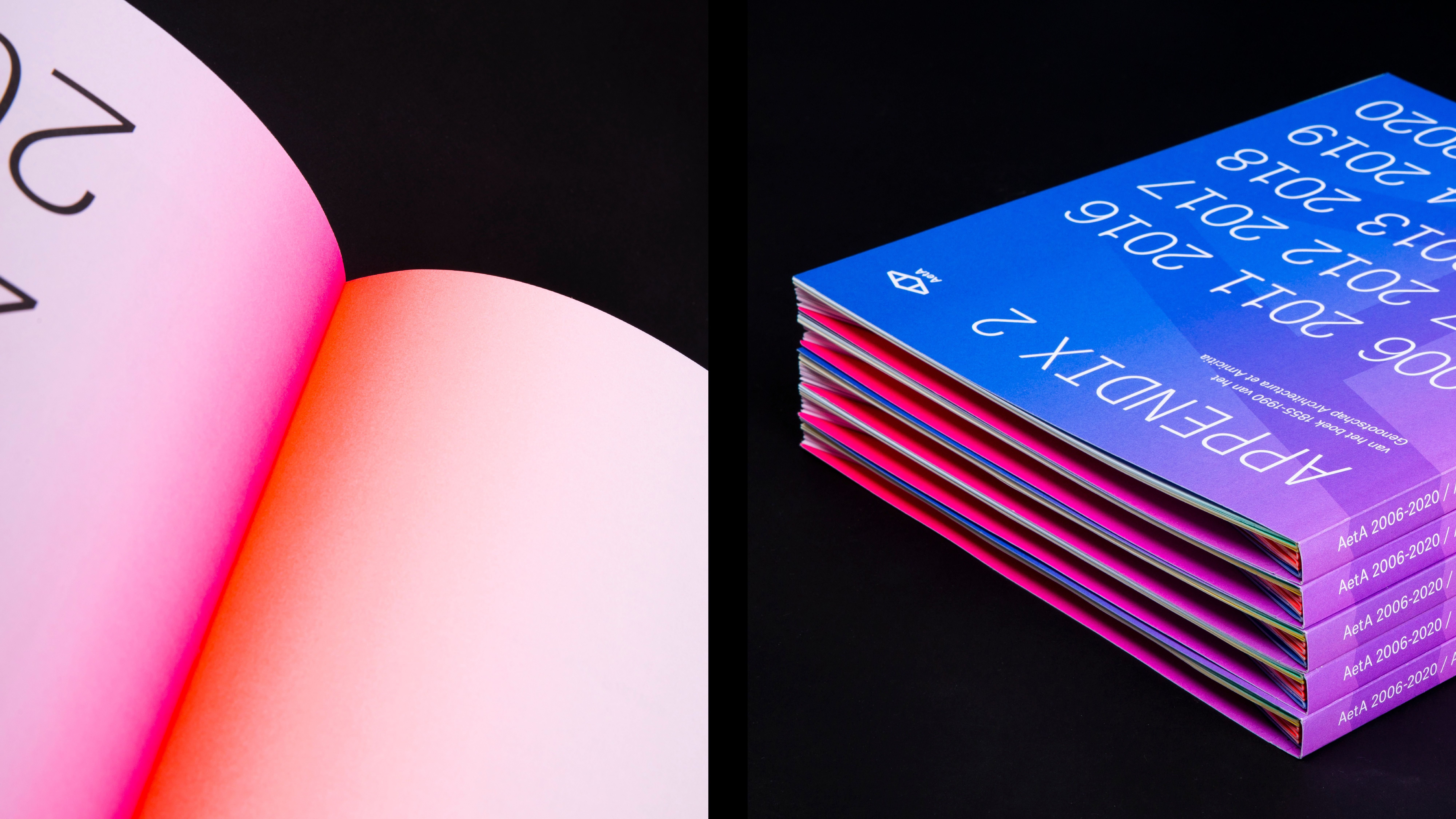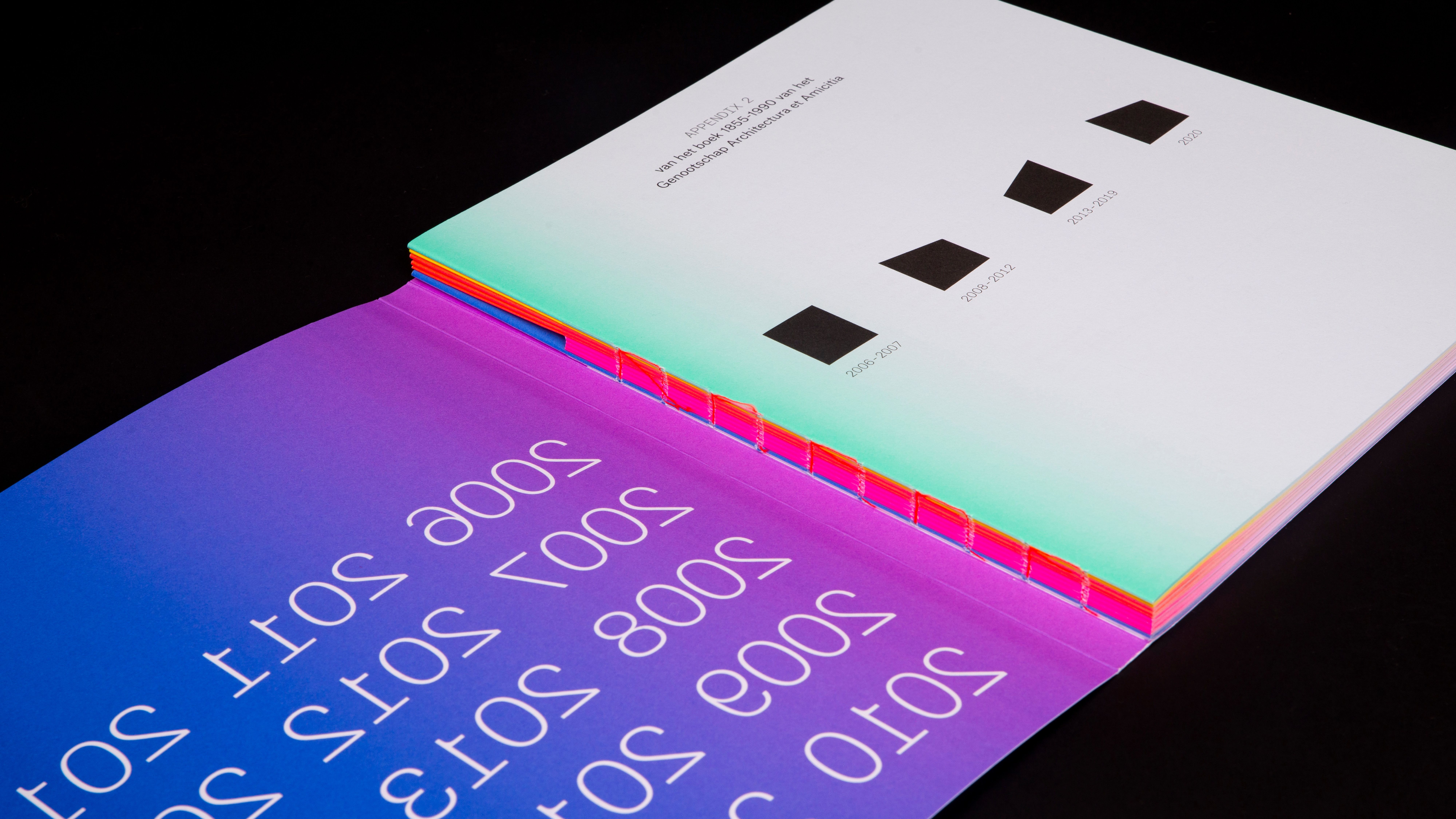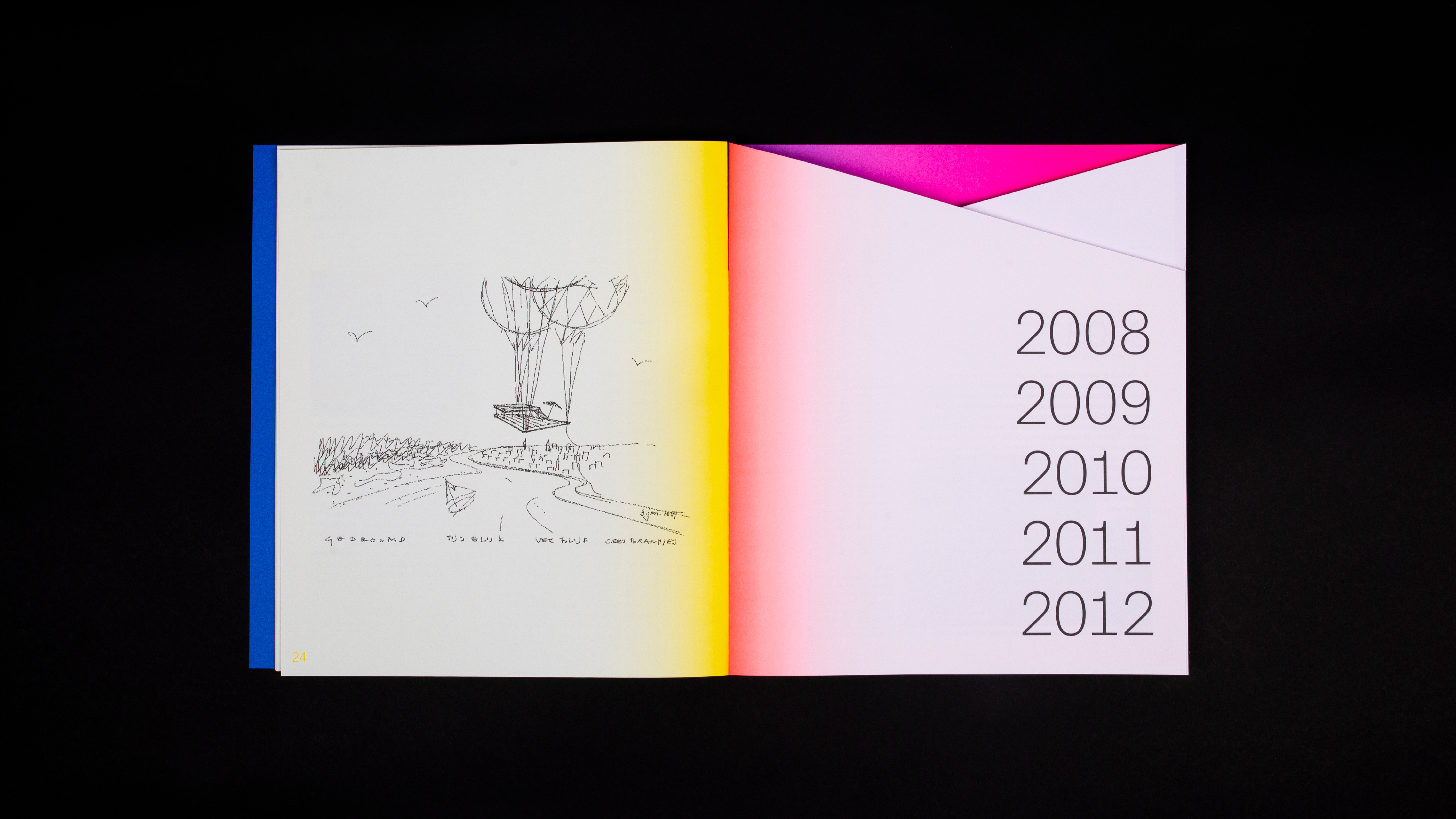 These different parts have been put together chronologically according to the years and divided into four parts. The book shows in word and design that architectural life has high peaks and deep valleys; from economic boom (2006-2007), to crisis and transformation (2008-2012), from recovery and new roles (2013-2019) to insecurity because of Covid 19 and looking forward (2020). These peaks and valleys are literally transformed into the shape of the book, each with a distinct color, which fades from a vibrant color in the middle of the book to a subtle pastel on the rest of the page. Just like an architect designs a building and architectural lines are arising in a landscape, the design of the book creates changing compositions of form and color in the book. Next to the fact that the concept fits the course of the story, it also fits with the association - in which the combination of looking and reflecting on architecture plays an important role. When you flip through the book, a changing play of shapes of depth, geometric surfaces and changing colors are passing before your eyes.