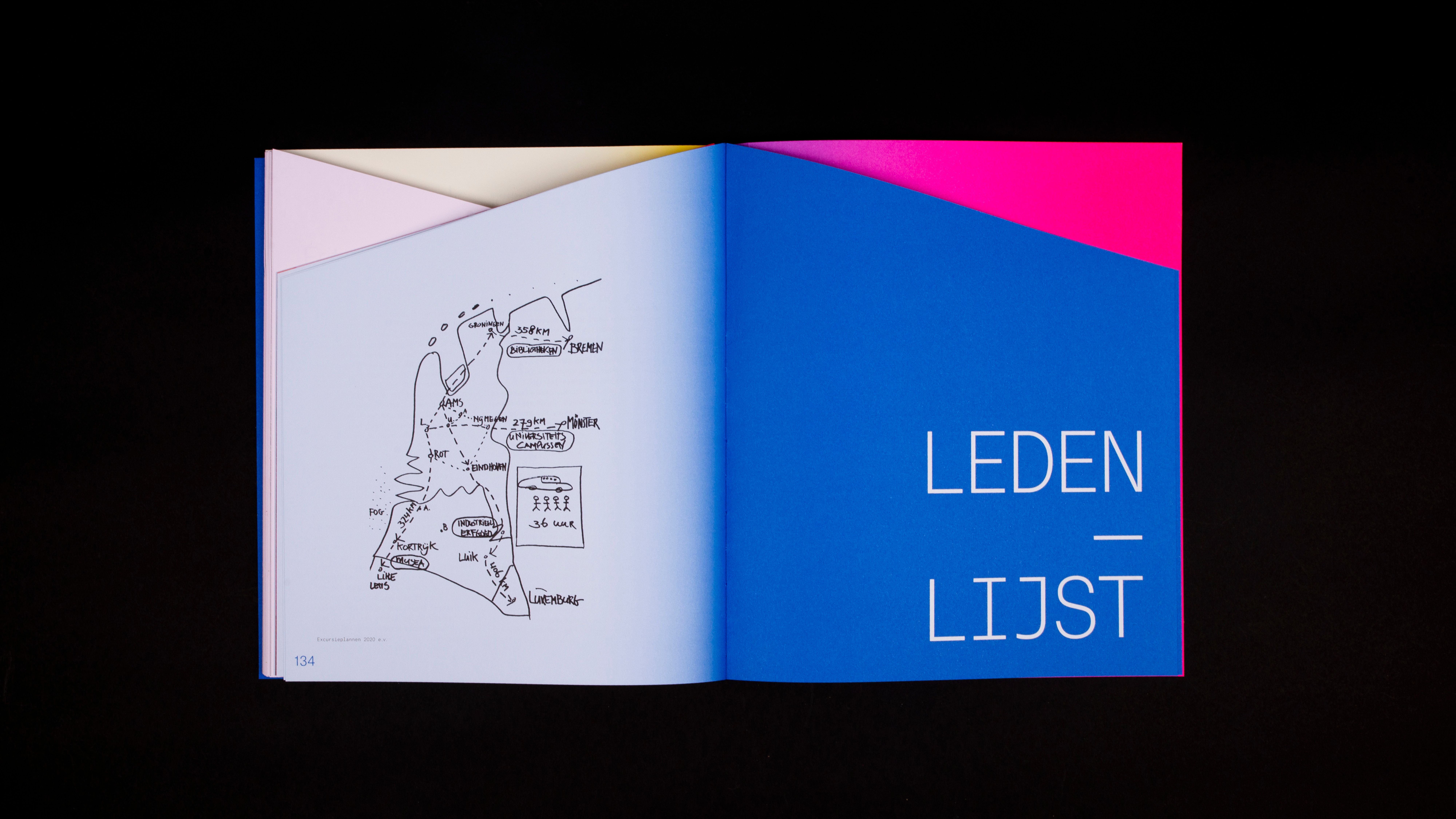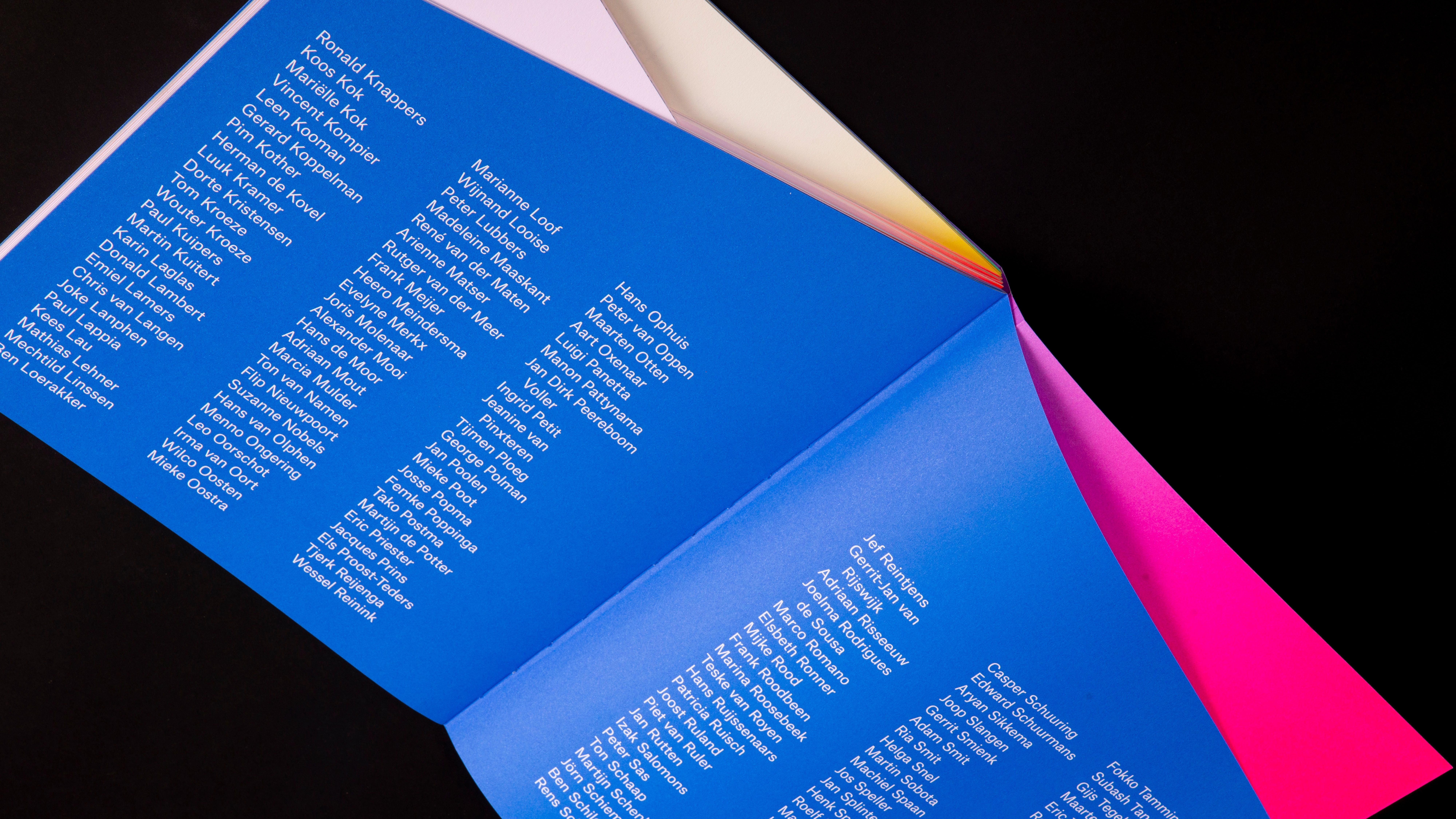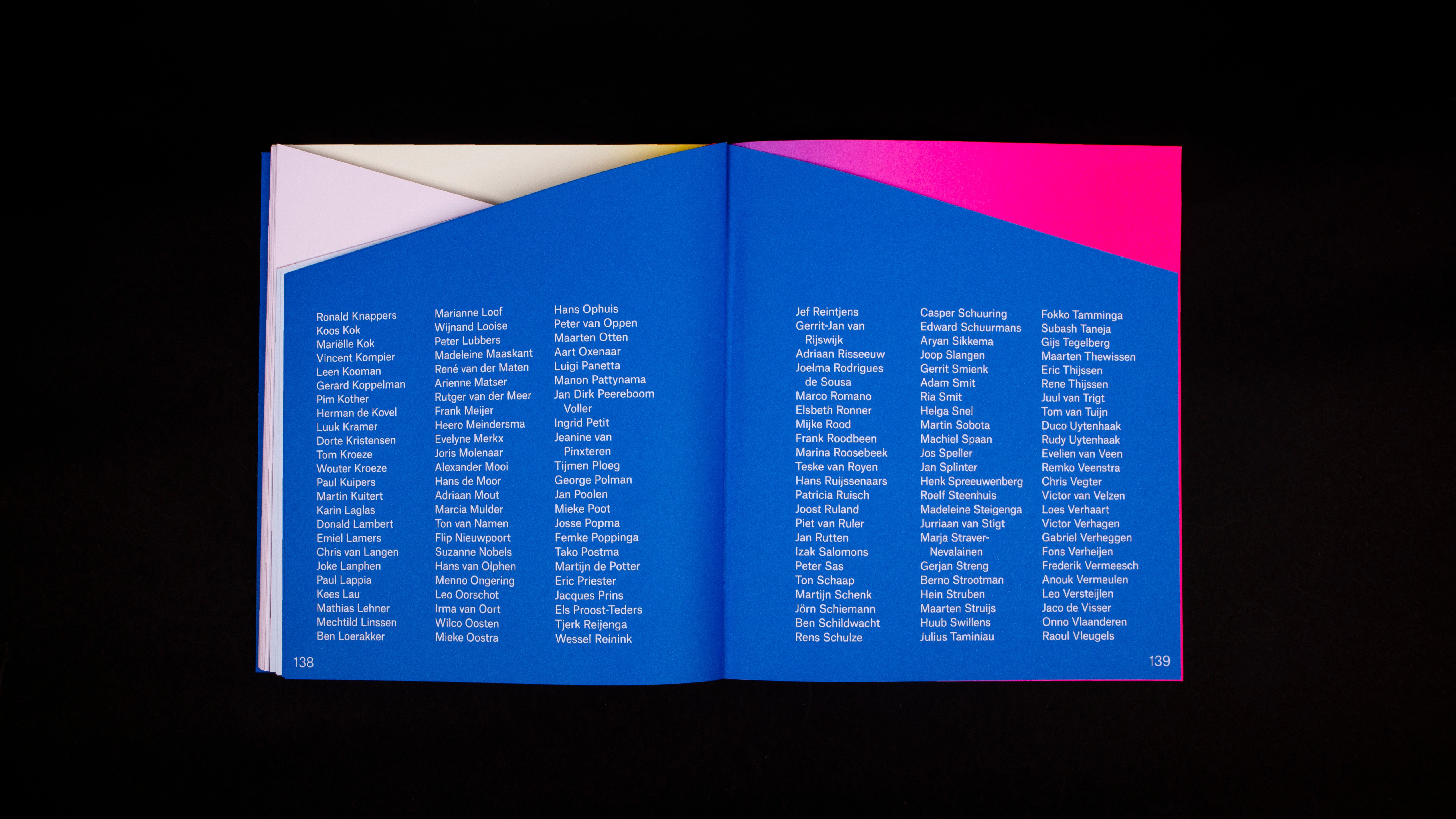 The book is printed in full color (CMYK) and 4 pantone inks. Furthermore, 3 of the 5 parts of the inside of the book are cut obliquely, resulting in distinctly varying three-dimensional compositions throughout the book where color and form play together. The book is then bound with a Swiss binding method with fluorine red-orange yarn. Without the exceptional efforts of Bindery Patist and printer Zwaan Lenoir, this special production would not have been possible.