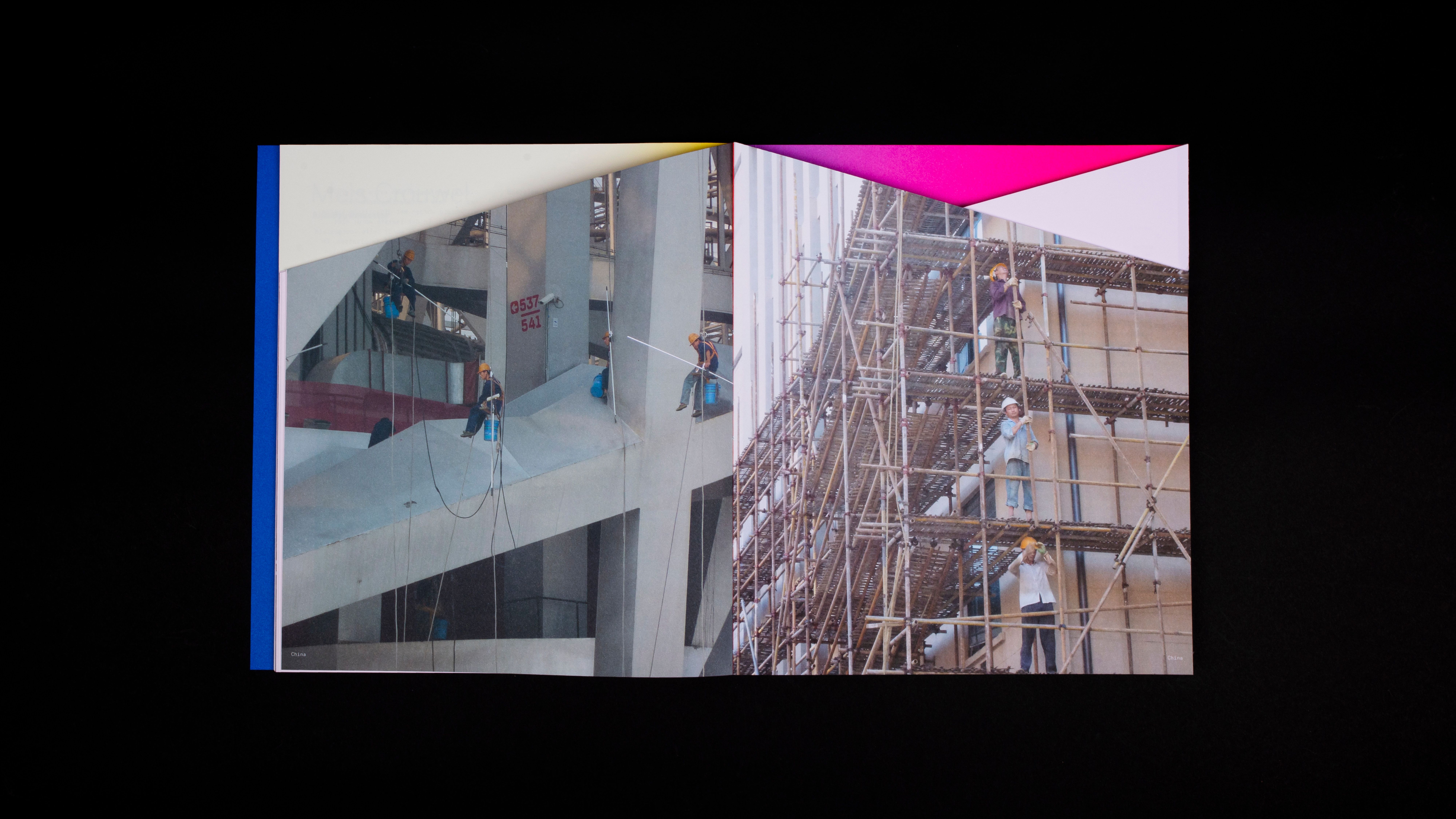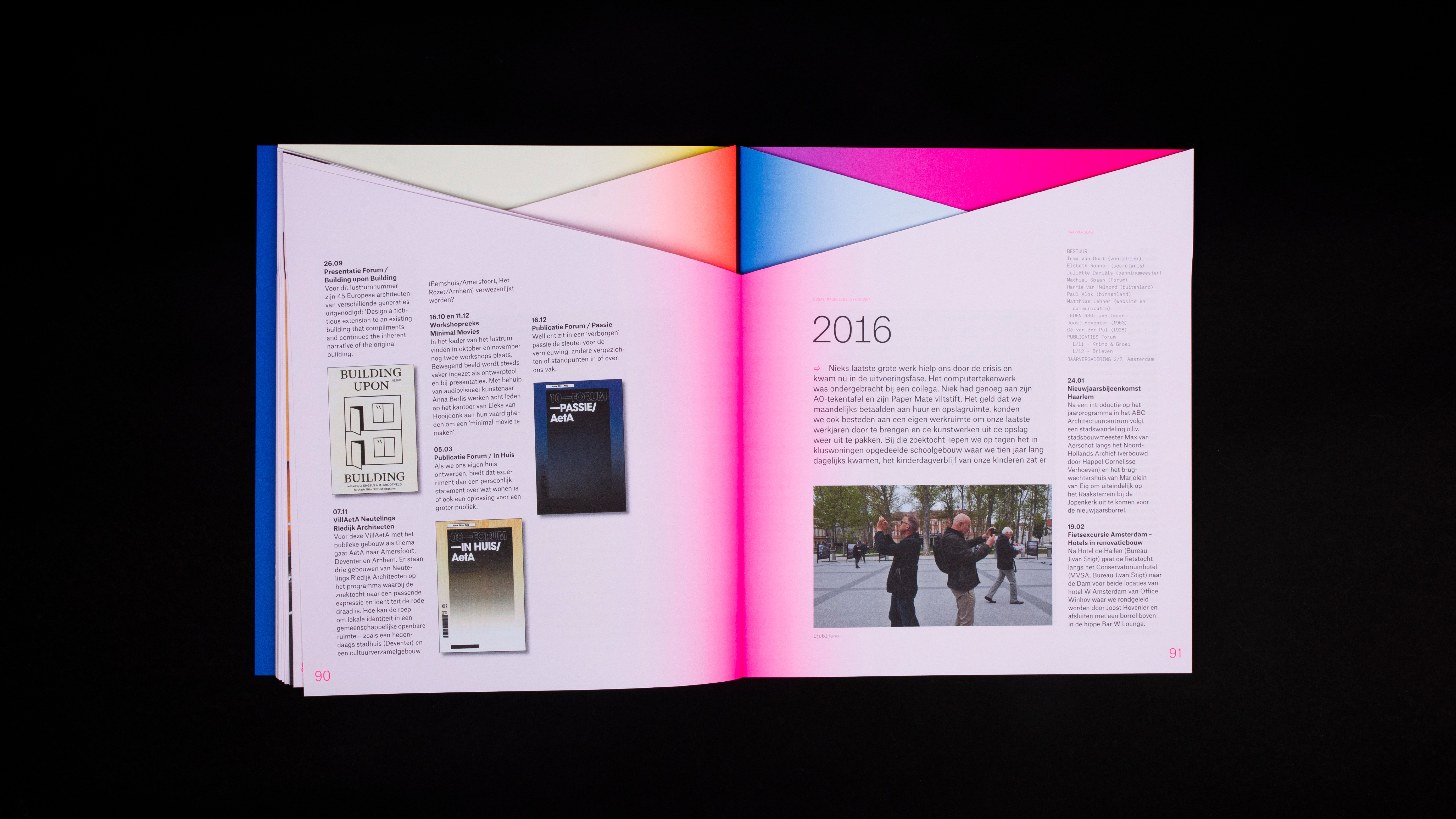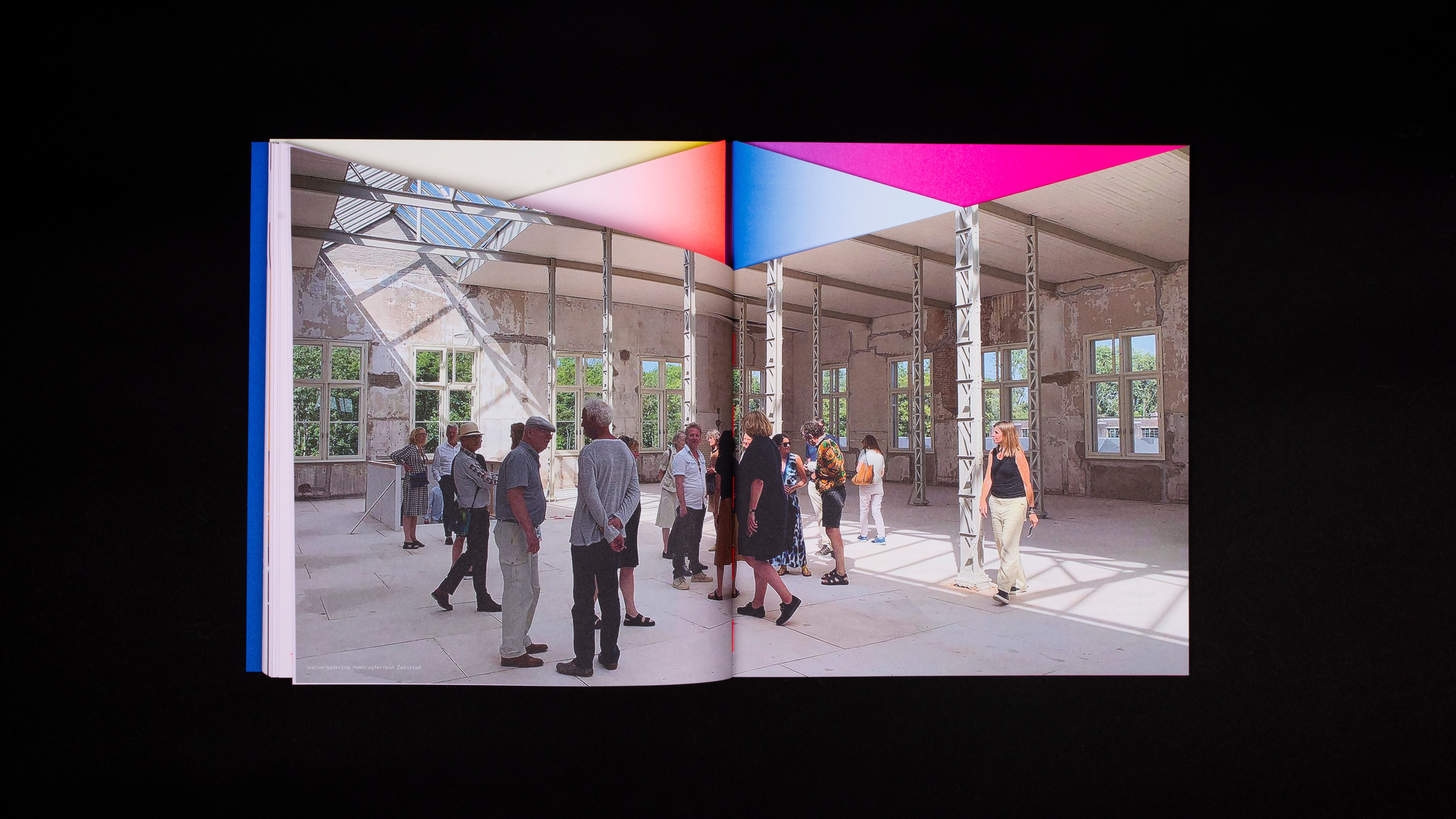 The book is printed in full color (CMYK) and 4 pantone inks. Furthermore, 3 of the 5 parts of the inside of the book are cut obliquely, resulting in distinctly varying three-dimensional compositions throughout the book where color and form play together. The book is then bound with a Swiss binding method with fluorine red-orange yarn. Without the exceptional efforts of Bindery Patist and printer Zwaan Lenoir, this special production would not have been possible.