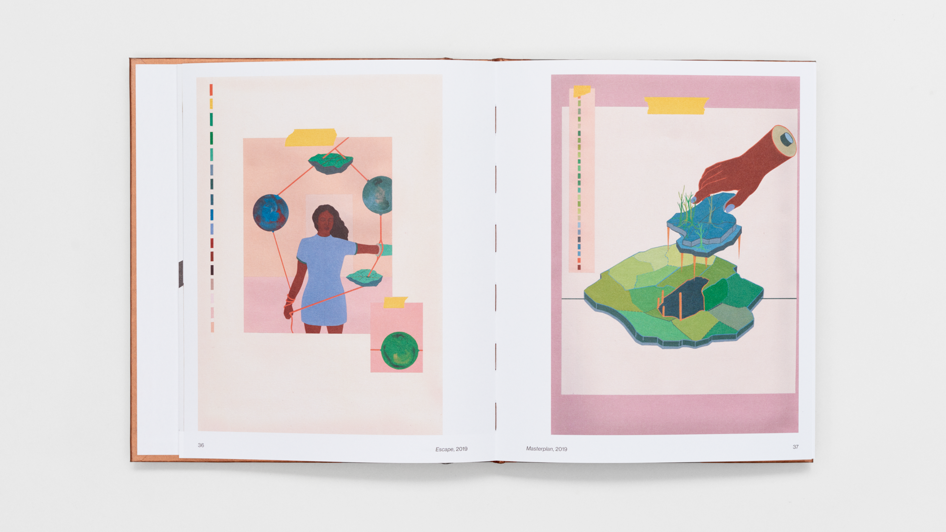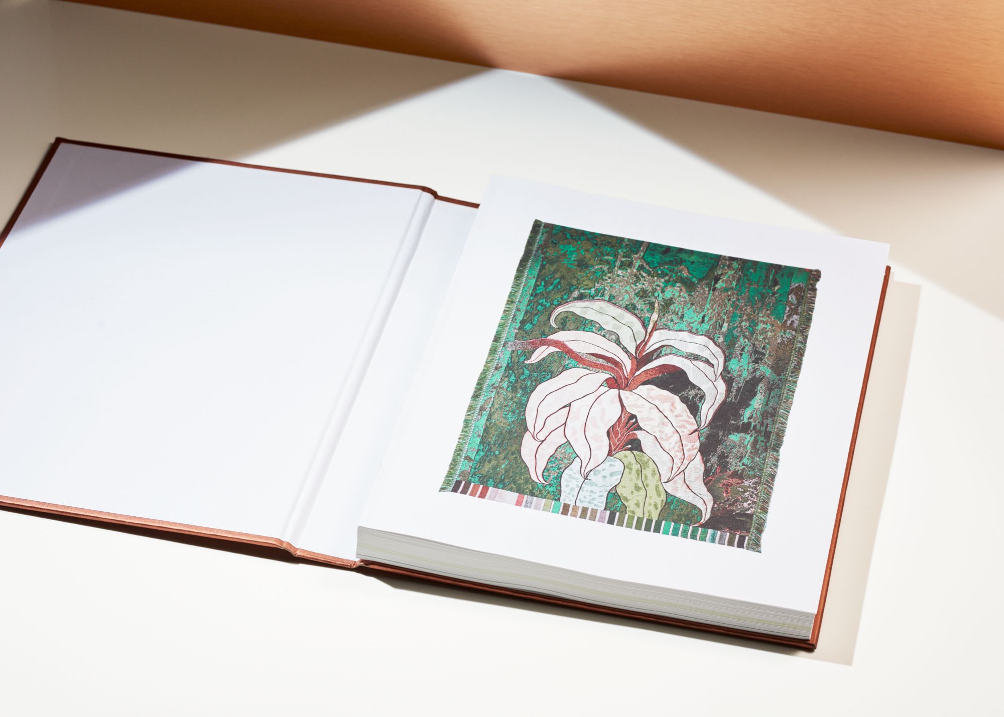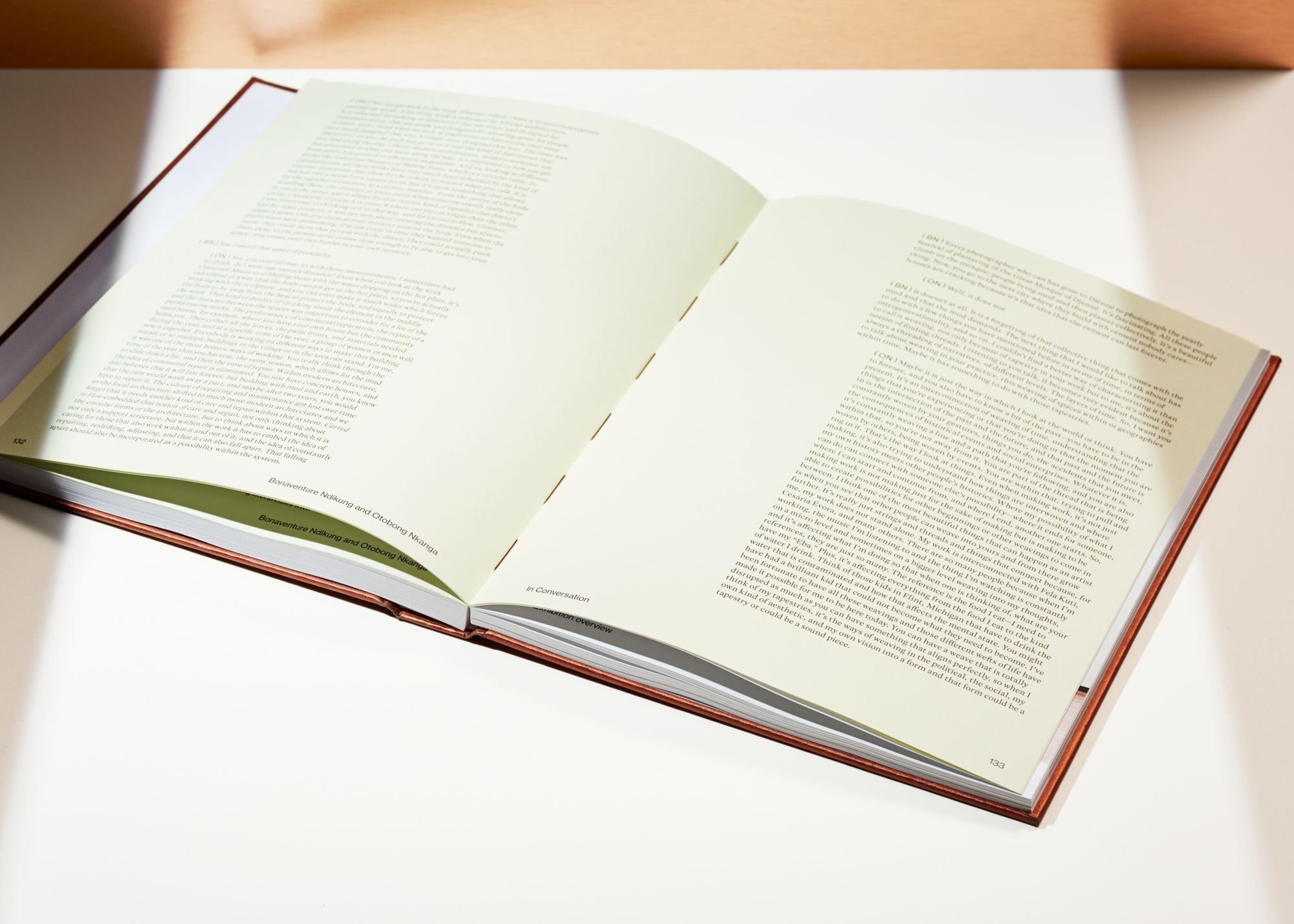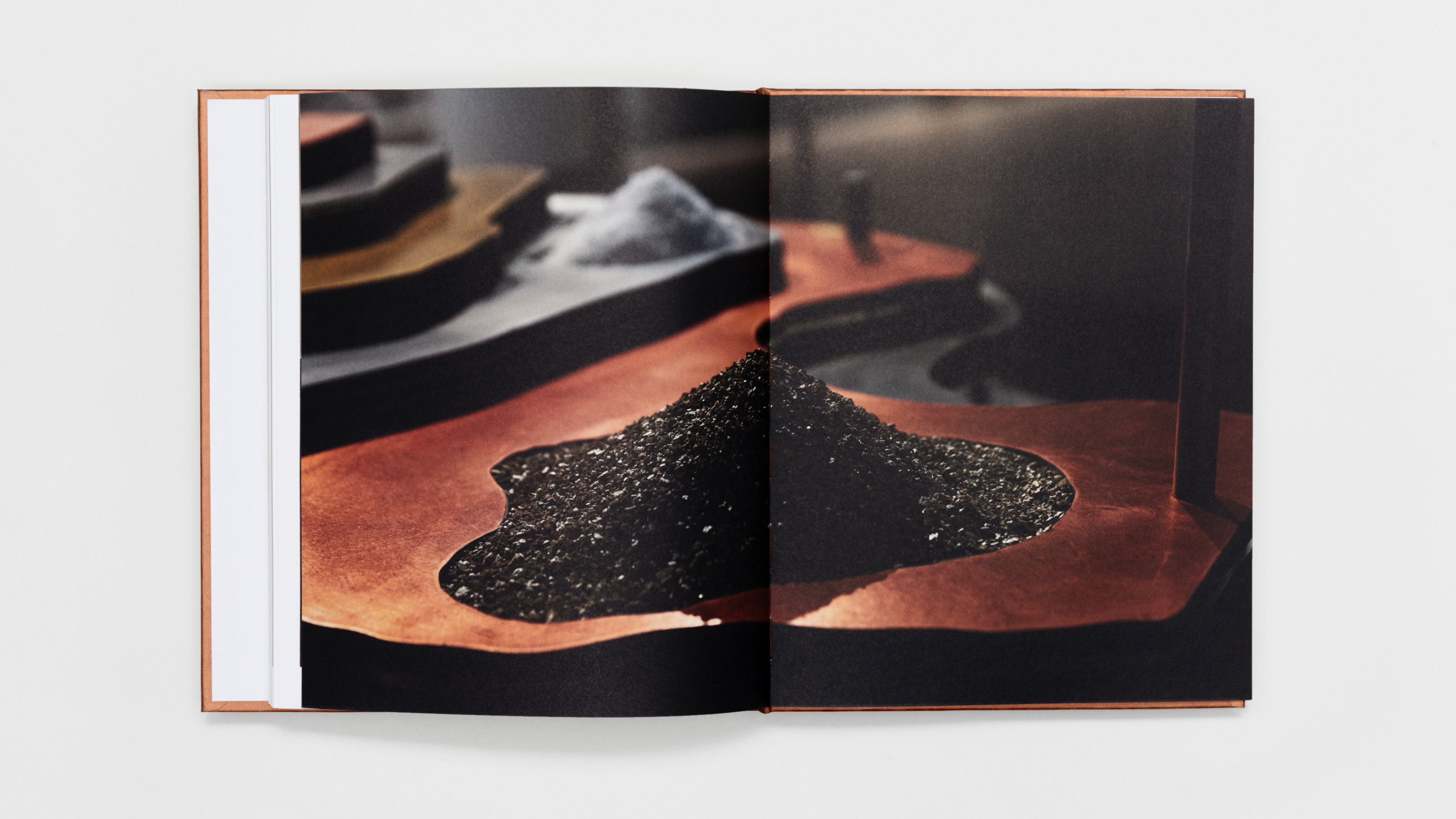 The book has been created in close collaboration with the curators and the artist herself. It has been important that the book's visual and tactile qualities reflects Nkanga's artistic work. Curious Collection - Alchemy Copper from Arjowiggins, the paper used on the book's cover, is a clear reference to Nkanga's work, both thematically and visually; copper as a natural resource and as a recurring color in her works. The Swiss binding results in a flat-laying format, which ideally presents the catalogue’s extensive use of installation images. The contrasting, visible thread calls to mind Nkanga’s textiles and is inspired by the inclusion of her palette in many of her completed works, while the copper-toned cover directly references works such as Steel to Rust – Meltdown (2016) and Solid Maneuvers (2015).