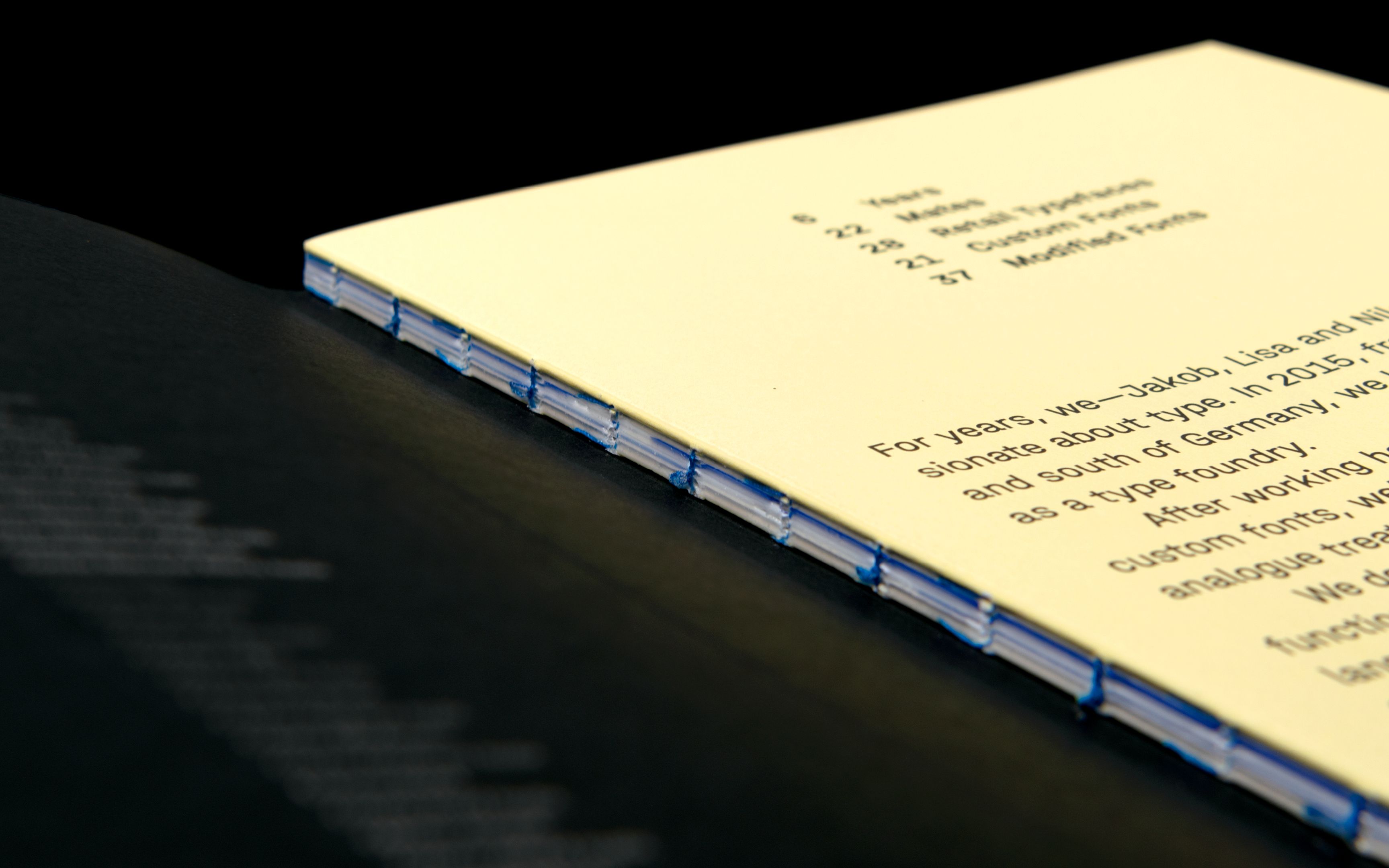 The type catalogue was printed 100% climate neutrally by Reset St. Pauli on 320 g/m² Burano Nero and 120 g/m² Pergraphica Classic Rough papers. Besides Offset Black and Yellow, it was printed with special spot colours Pantone Blue 072 U and Pantone Silver 877 U. A fine thread-stitched binding and the big embossed M-Logo on the cover rounds off the overall picture.