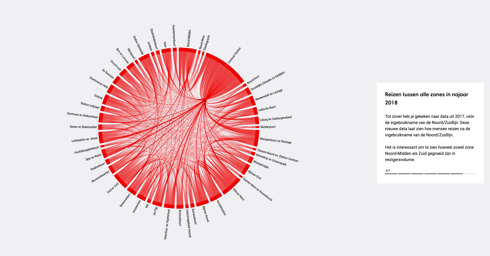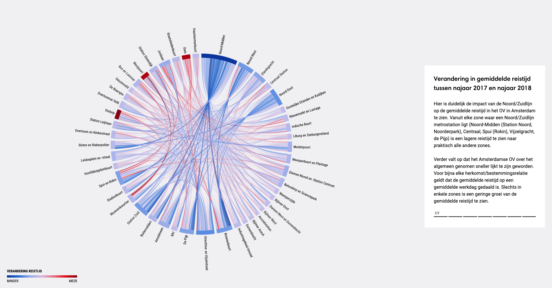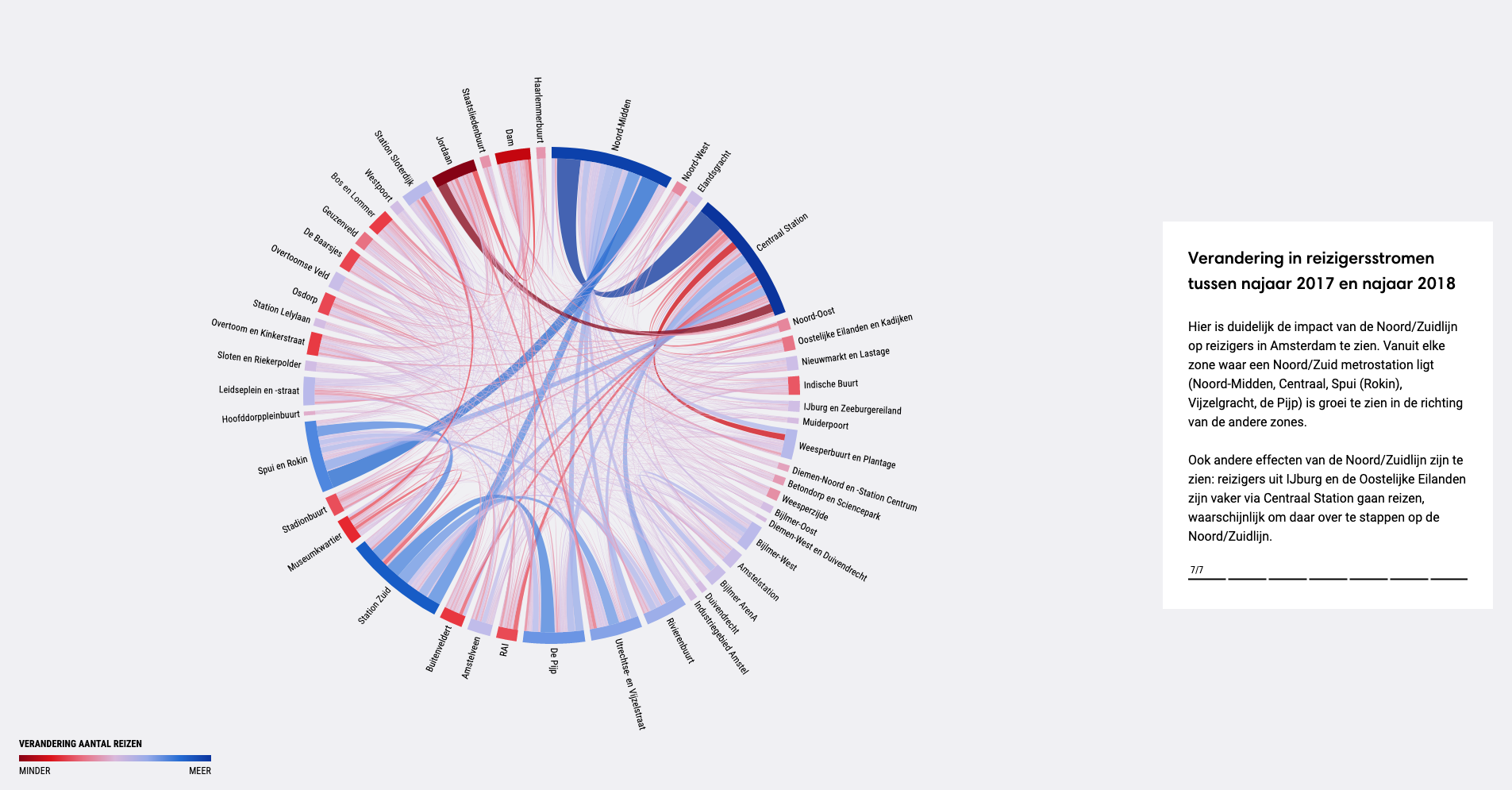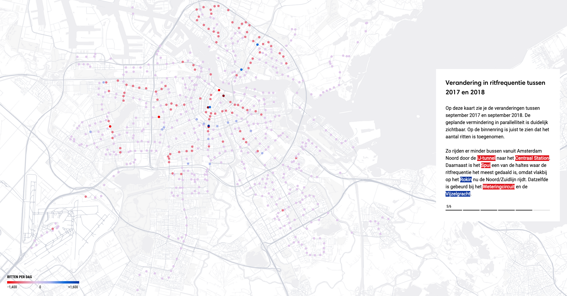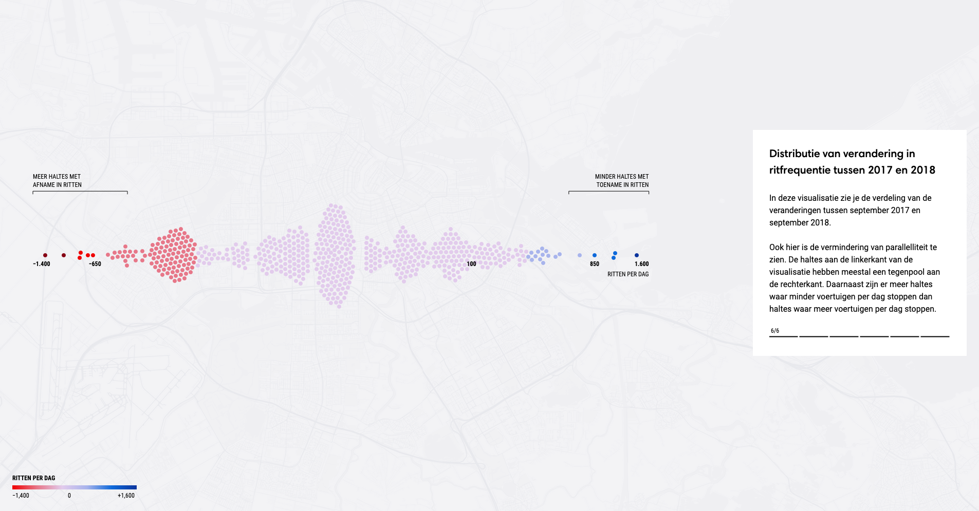 The second section reveals changes in the network: how the opening of the line affected Amsterdam’s public transport and timetable. The visualisation is a map, where dots represent locations (stops). Scrolling down, the map transitions into aggregate visualisations showing the overall performance and from abstract turns into tangible. Different colours of the dots represent changes in stop frequency.