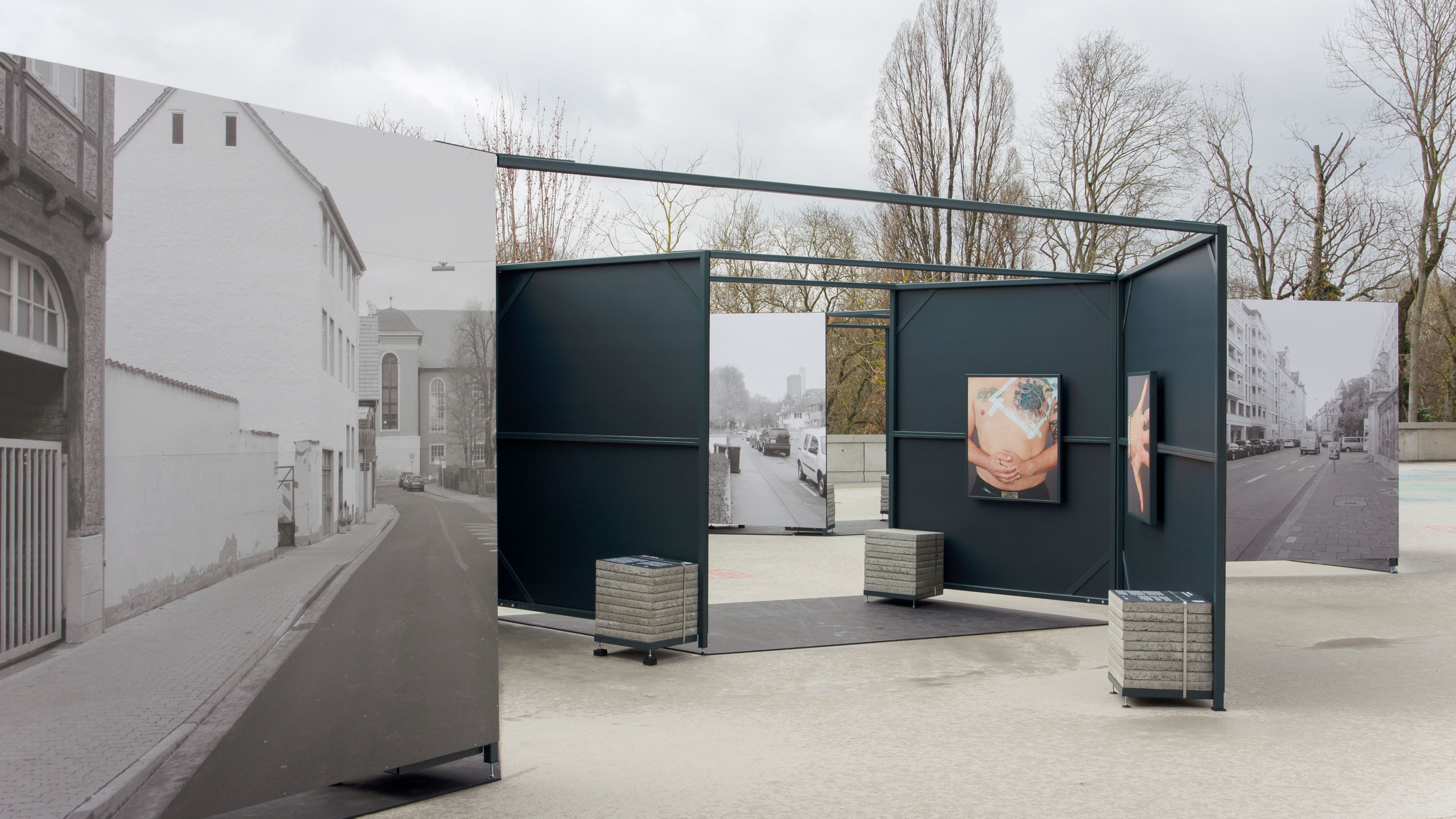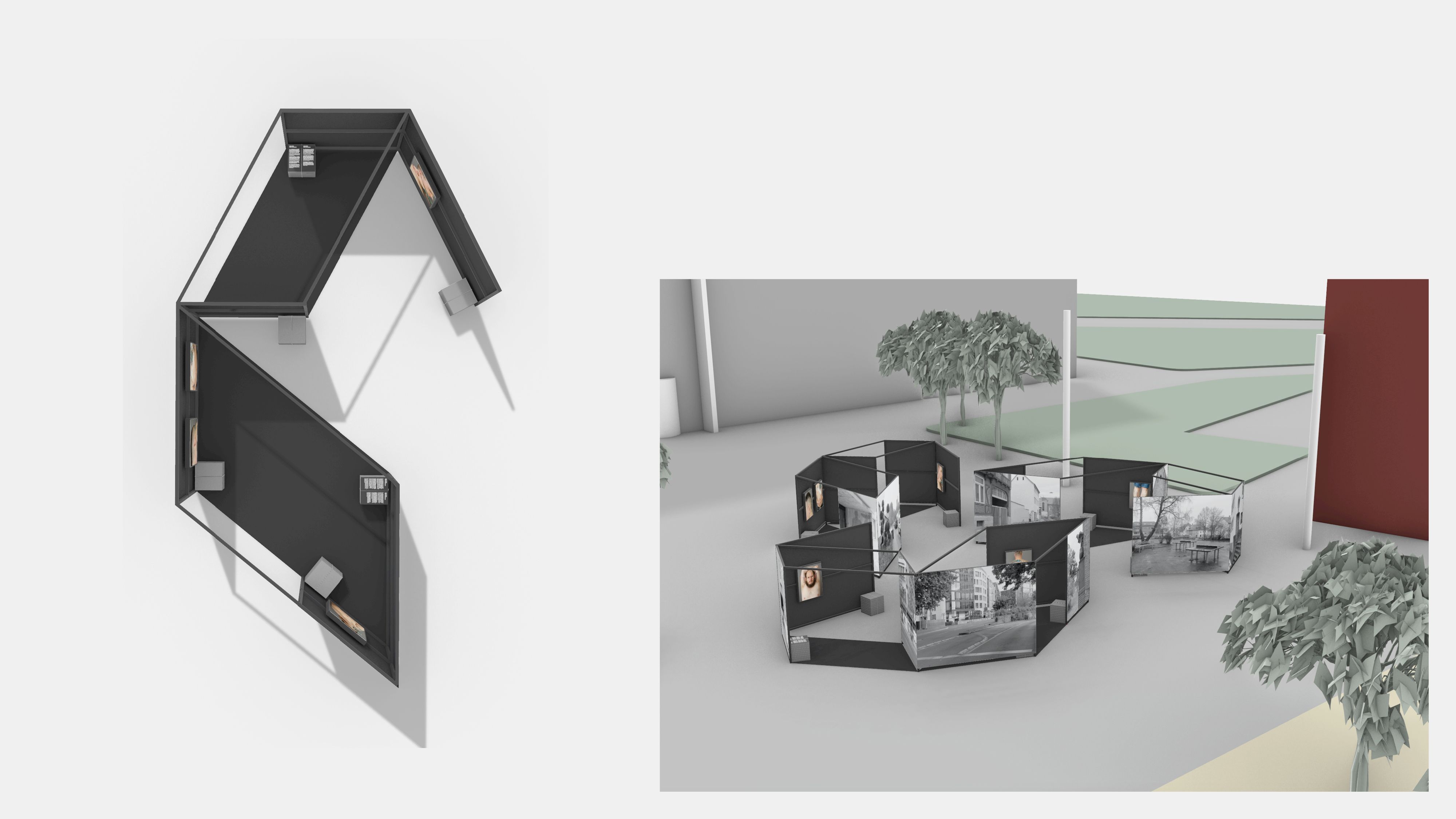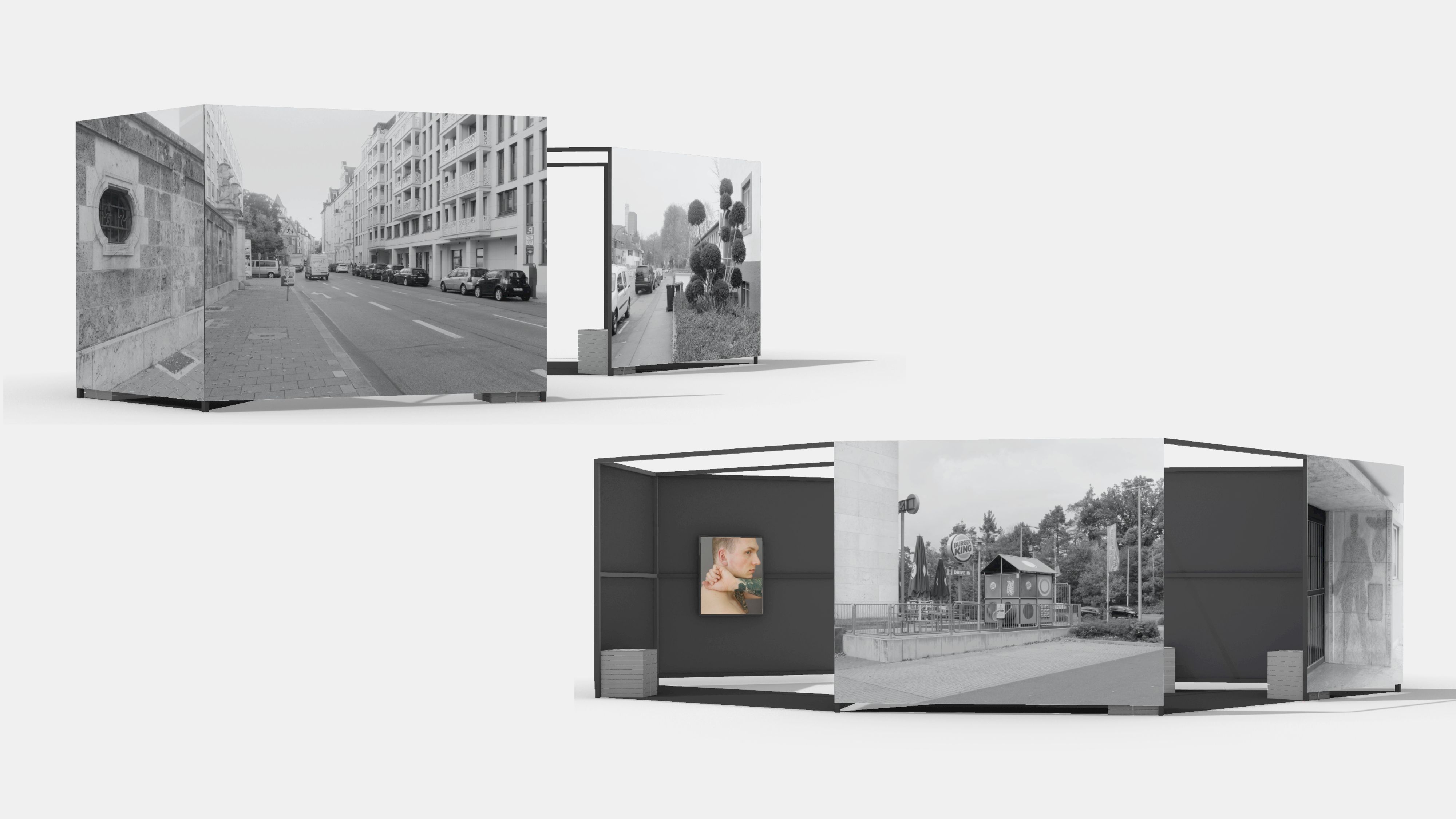 We developed a design that narrates the project step-by-step. By creating an in- and exterior within the installation, the project unravels itself as the visitors get closer. The installation consists of three modules. The exterior of each module shows the monochrome diptychs of the ‘Stein’ part of the work. The proportions of the exterior frame and panels are 1:1 based on the ratio cut of the photography. Each L-shaped element contains a portrait and landscape sized frame to house each diptych. By placing these images in a large format on the outside of the construction, this part of the project is the first to be encountered. Furthermore, this placement makes the images function as a mirror of the surrounding public space.