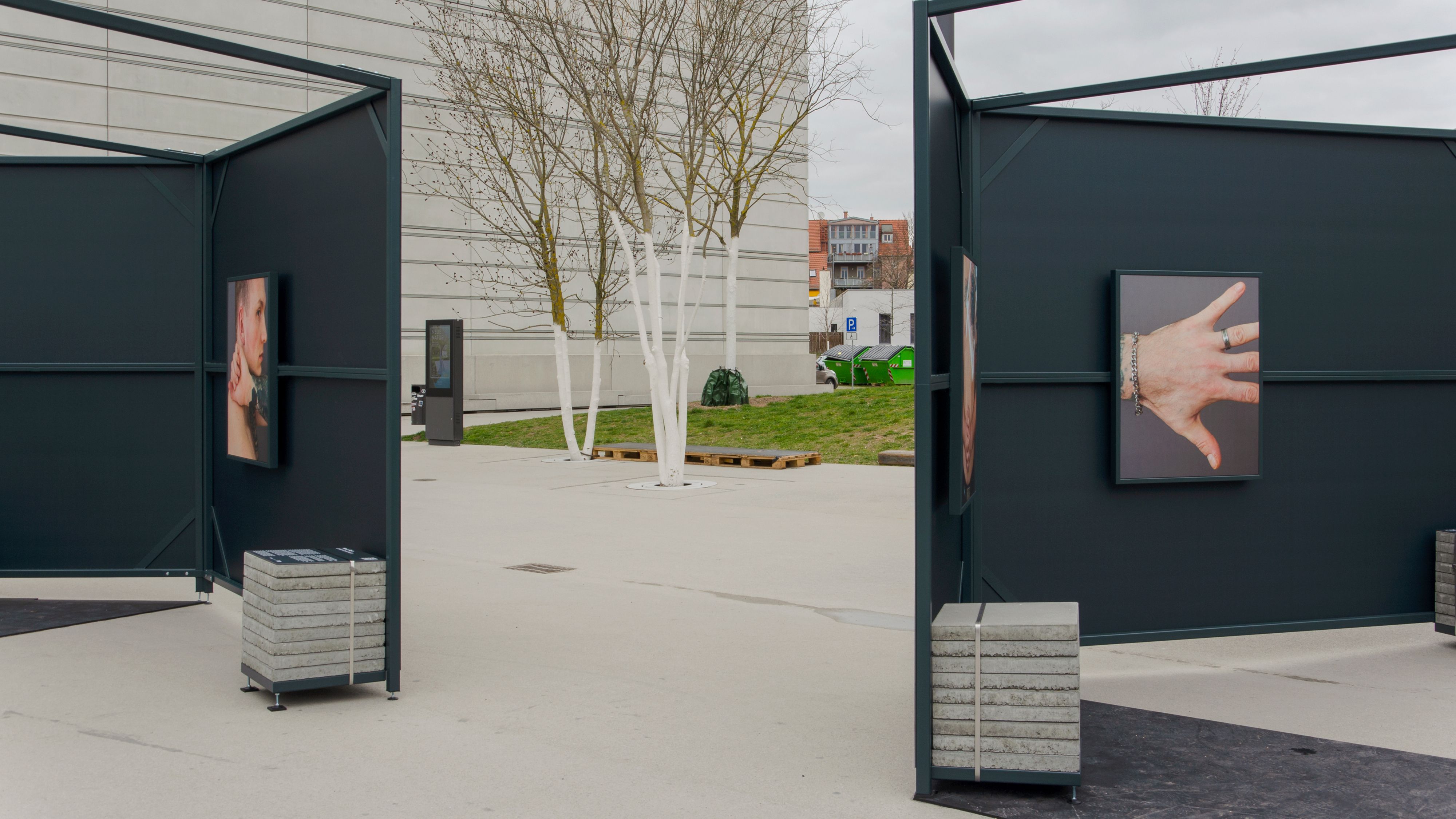 The interior of each module is colored dark grey to provide for a noticeable contrast with the outside. Placing a durable dark grey flooring further emphasizes this notion. The interior part of the modules houses the color portraits from the ‘Haut’ selection. The portraits are placed in floating steel frames that are specifically placed to make sure the most confronting images are the ones least visible from the outside.