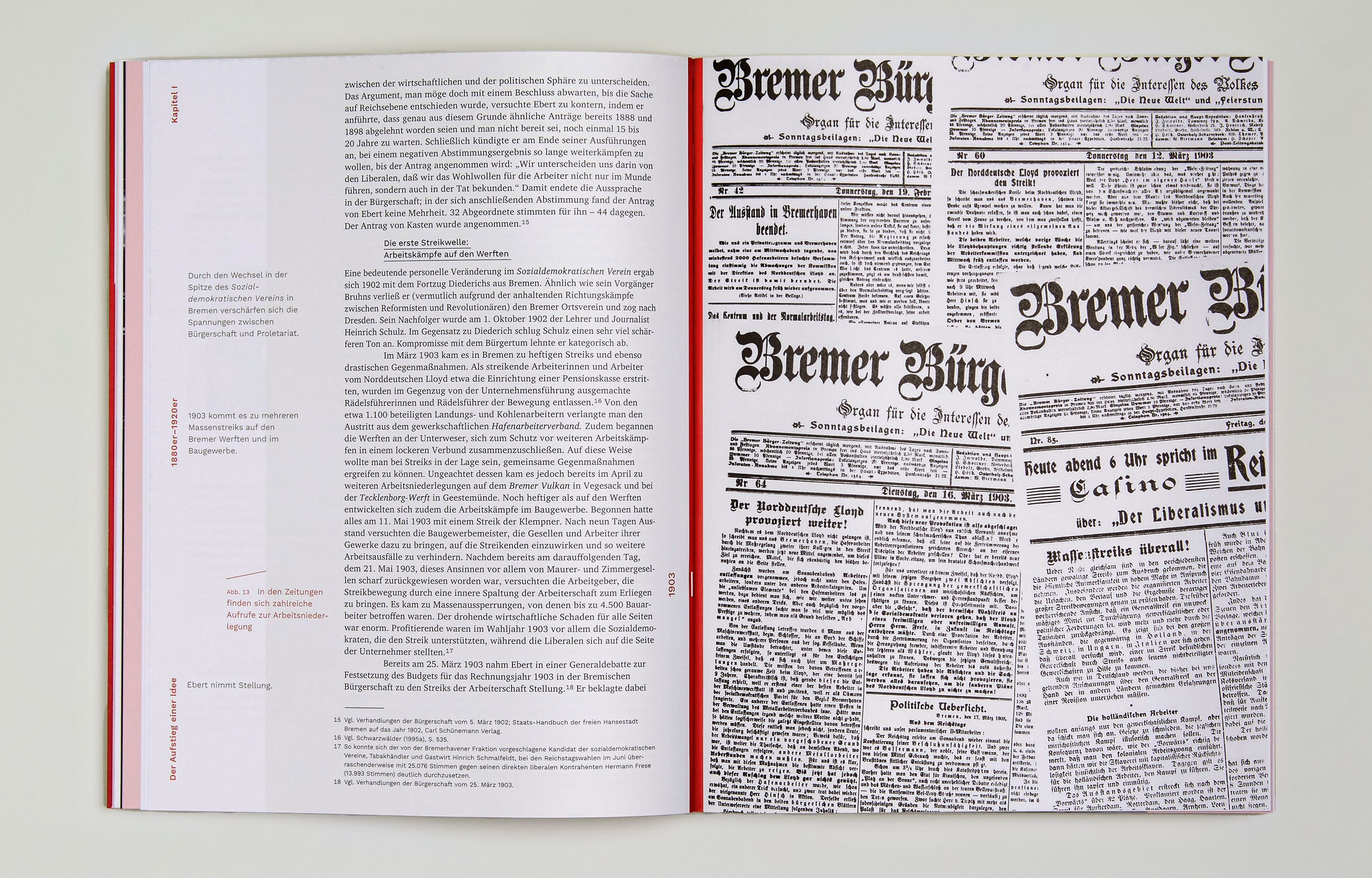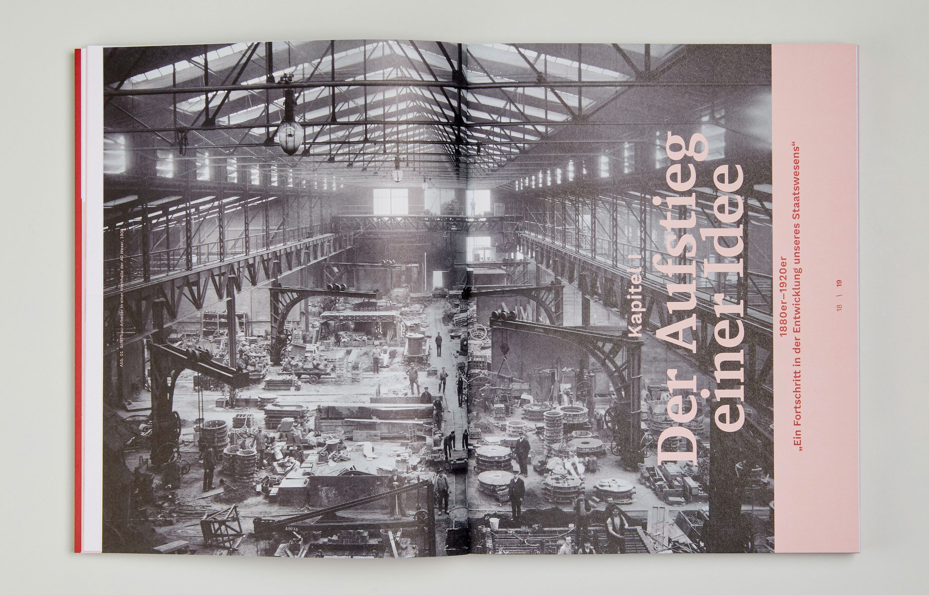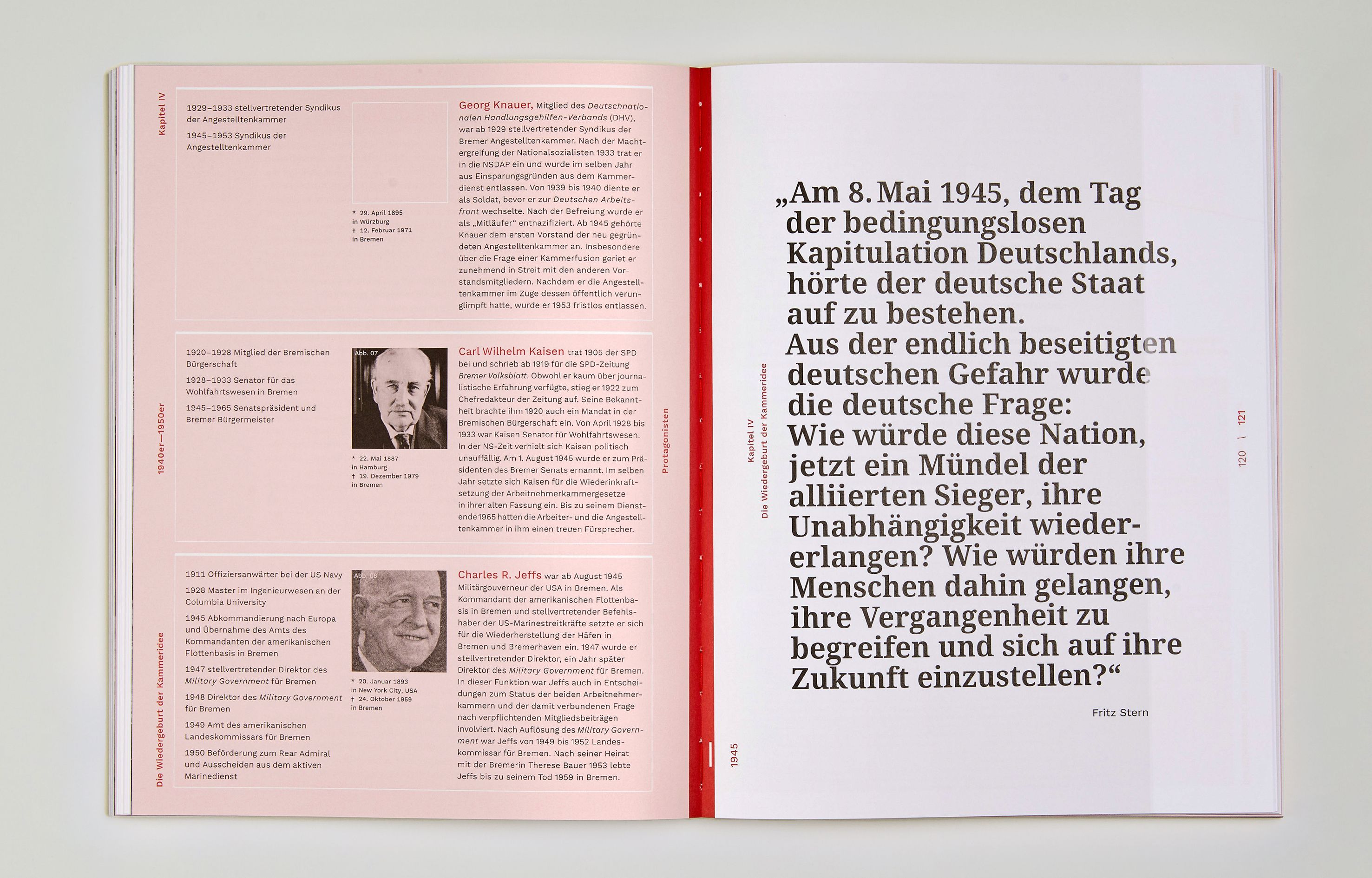Red stands for industrial action and it is the corporate color of the Chamber. The (red) ›time axis‹ runs through the whole book in a bundle. The pages practically grow out of the book and are commented on towards the edges by photos, documents and notes. Colored intro pages structure the book at the beginning of the chapters with a large symbolic image, infographics, a summary of the chapter and short CVs of the actors. At the beginning and end of the book, interviews form the historical review and the outlook for the future, arranged transversely.