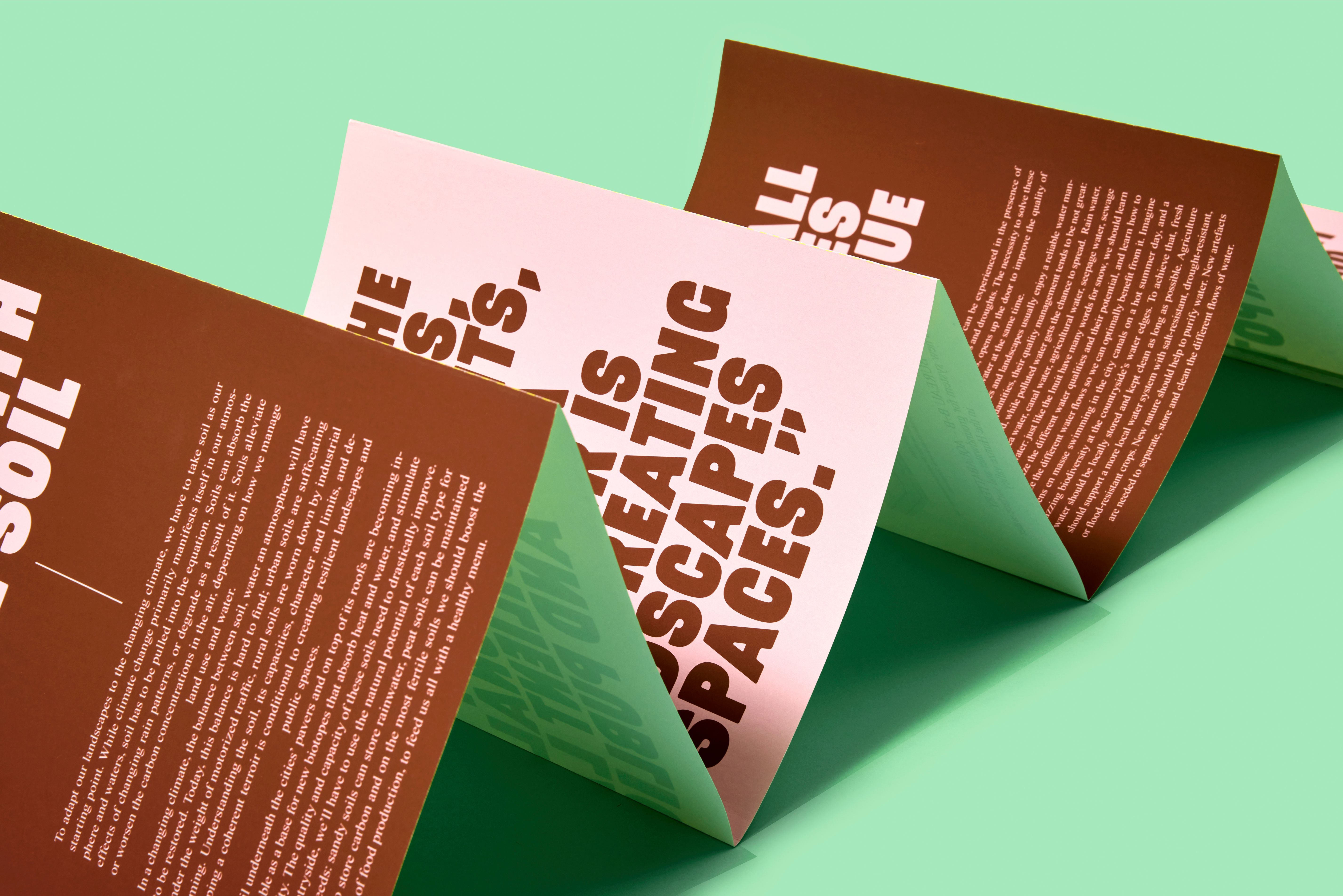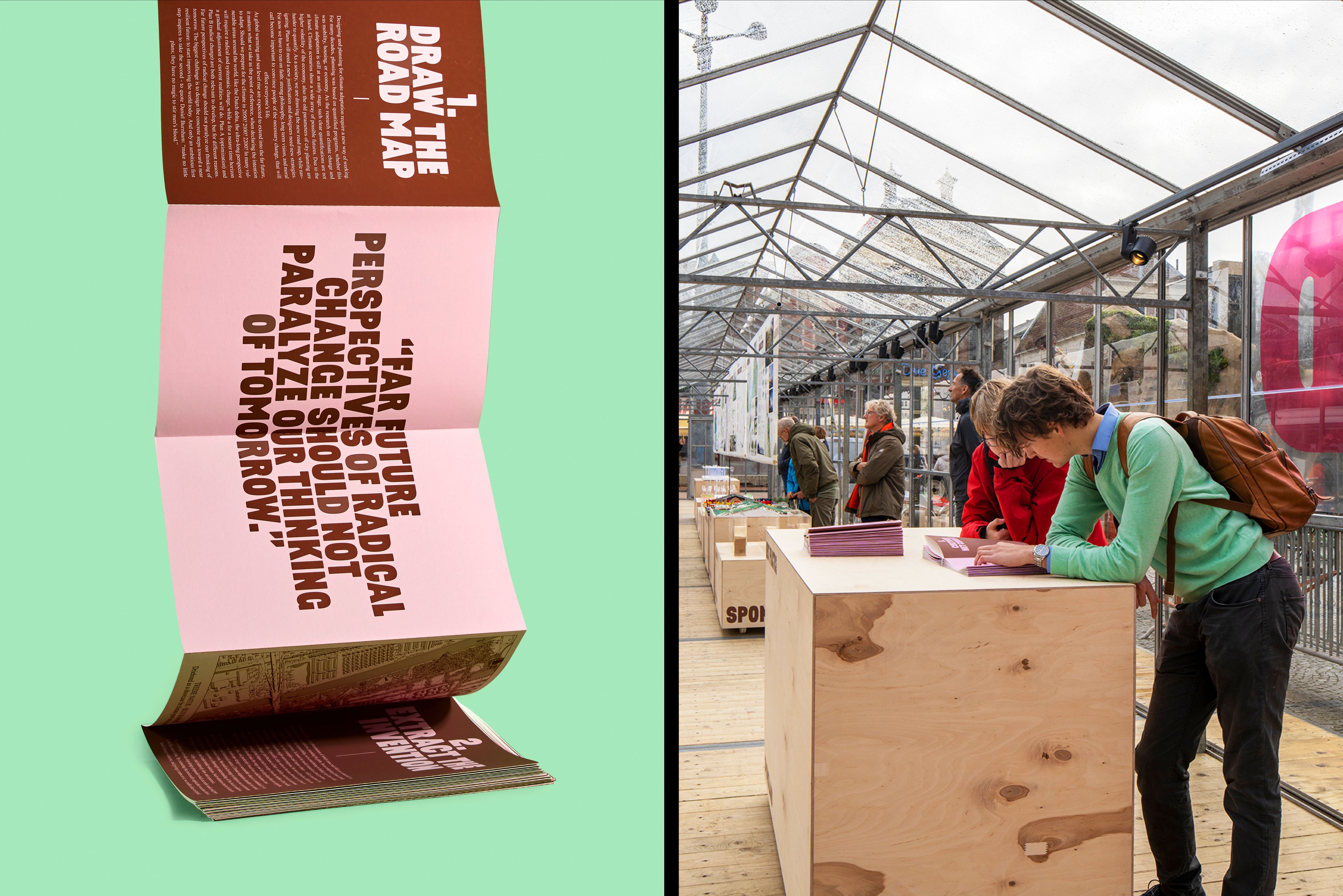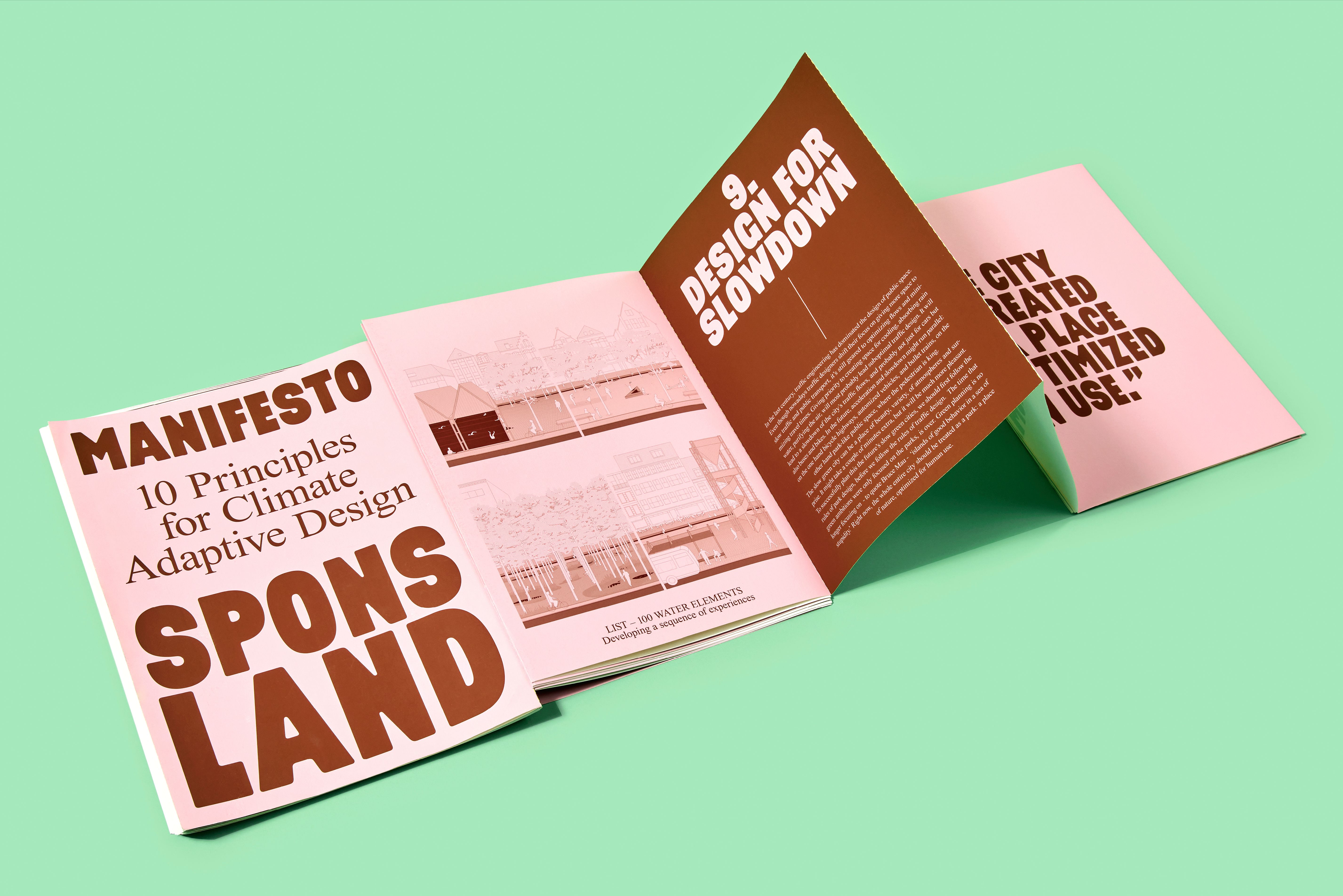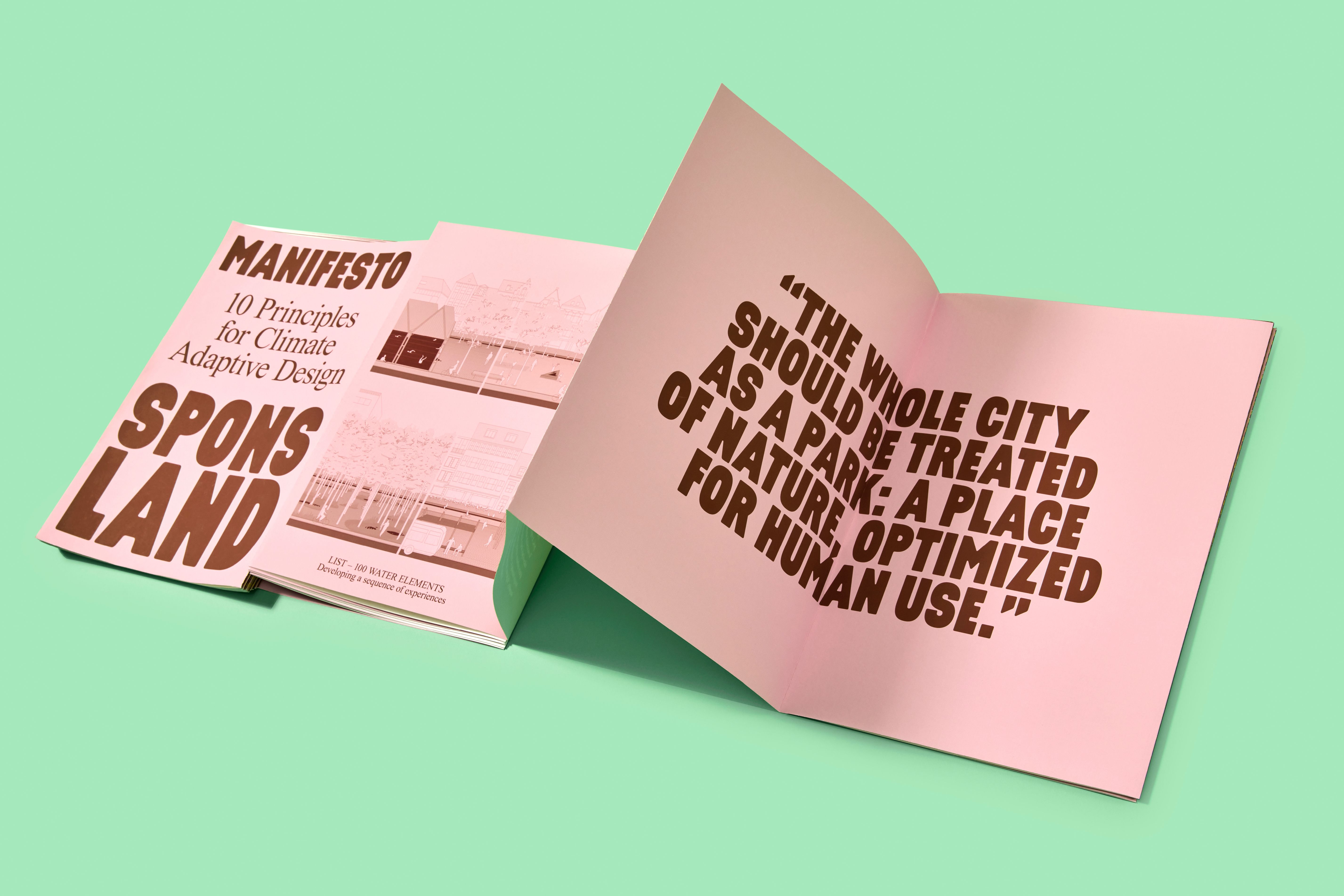 To inspire everyone involved with climate adaption, all the acquired knowledge was translated into a manifesto with 10 generally applicable principles for climate-adaptive design. We captured these principles in a 13-meter-long leporello. In design, we chose for this shape, size, and length to emphasize its activistic character and make it stand out. With this size, length, and shape, it’s possible to individually browse through the pages and once unfolded, it’s also possible to gather around it with a group. In the design, we used a bold typeface to emphasize the activistic character, in combination with classic typography, to emphasize research. The pink refers to the human part in the climate challenge, to the fact that we must act and adapt. The manifesto was offered to Ban Ki-moon, Secretary-General of the United Nations, and Cora van Nieuwenhuizen, former Ministry of Infrastructure and Water Management. Furthermore, the manifesto could be found on the website and in the exhibition catalogue.