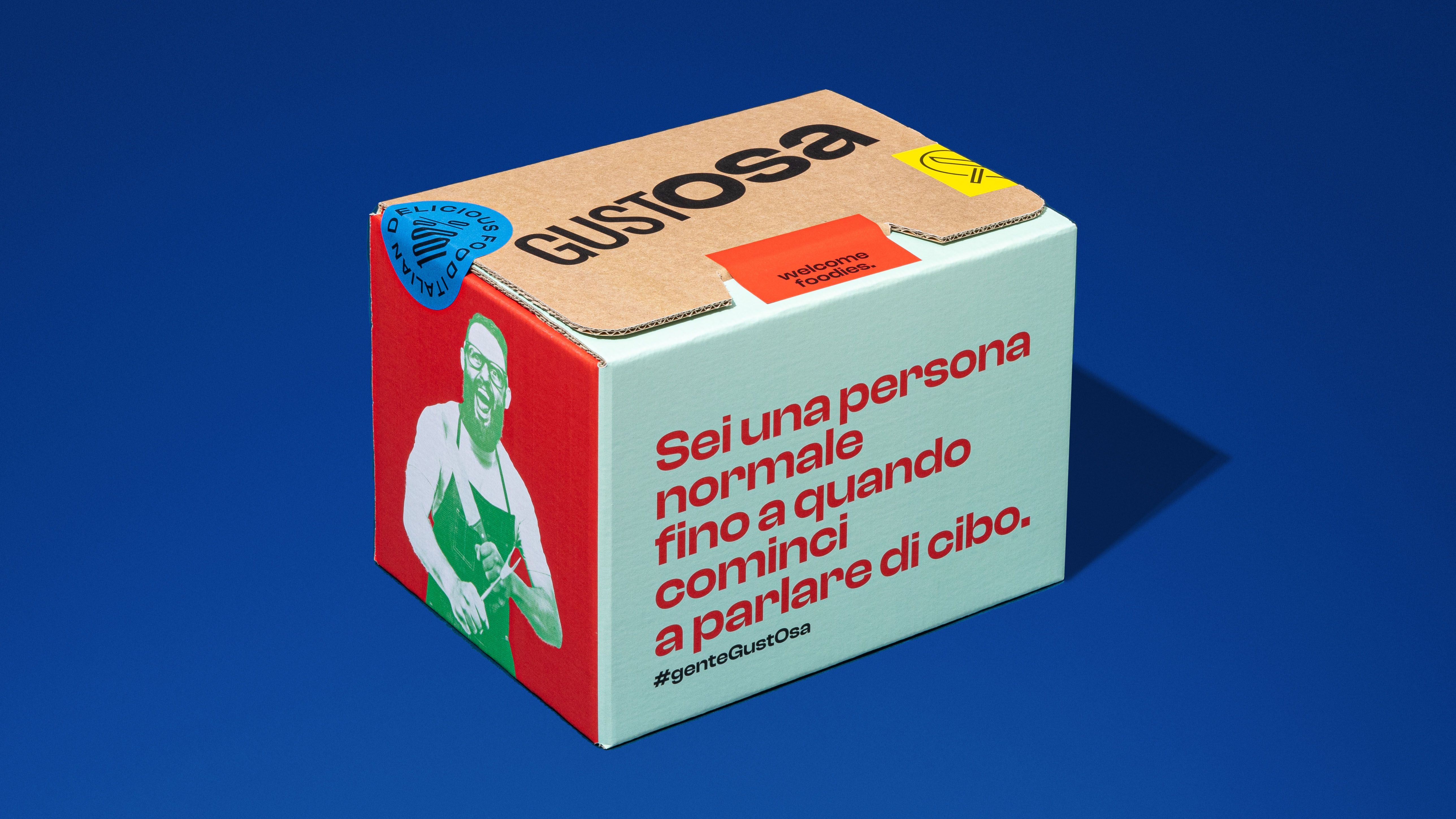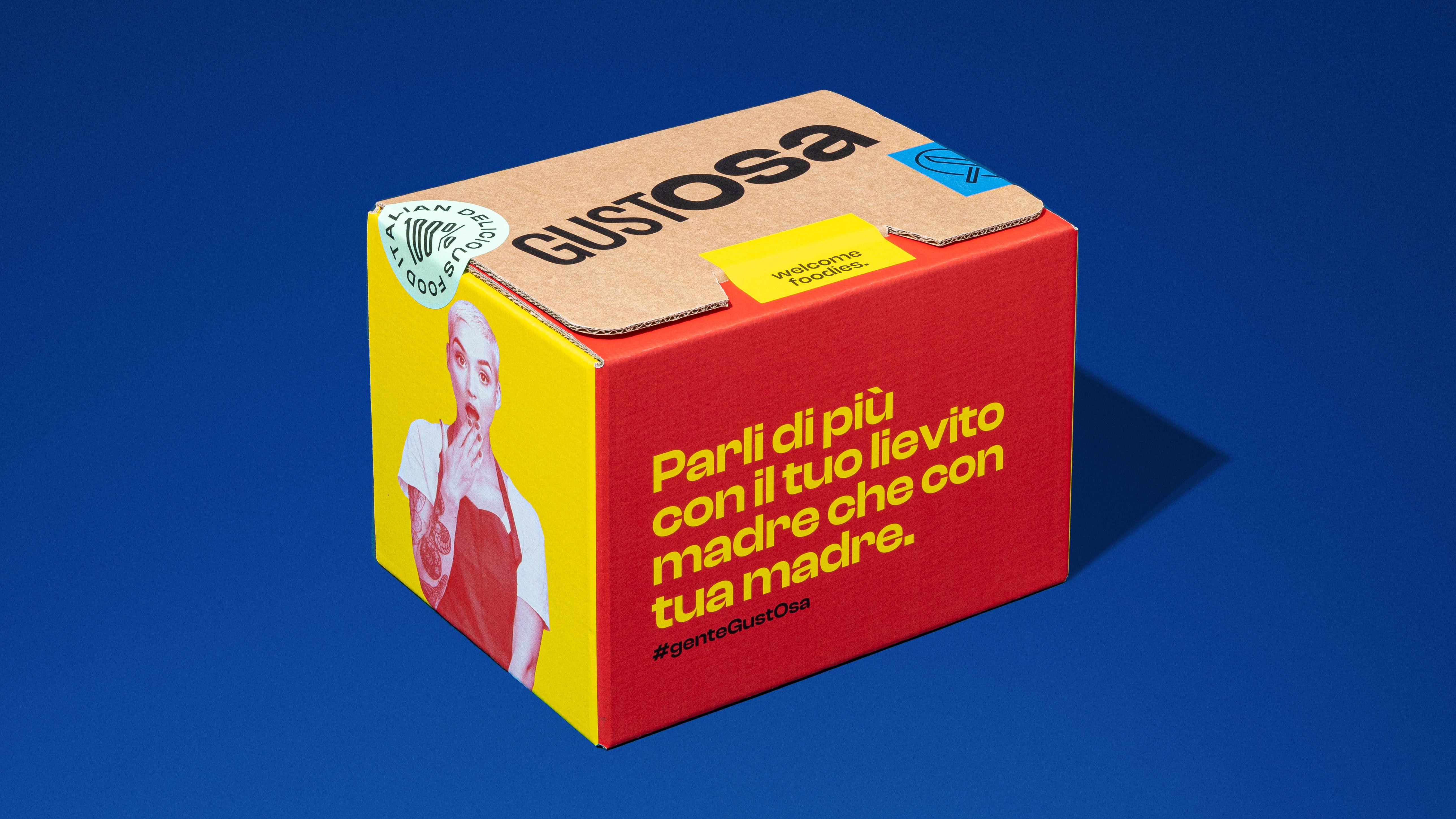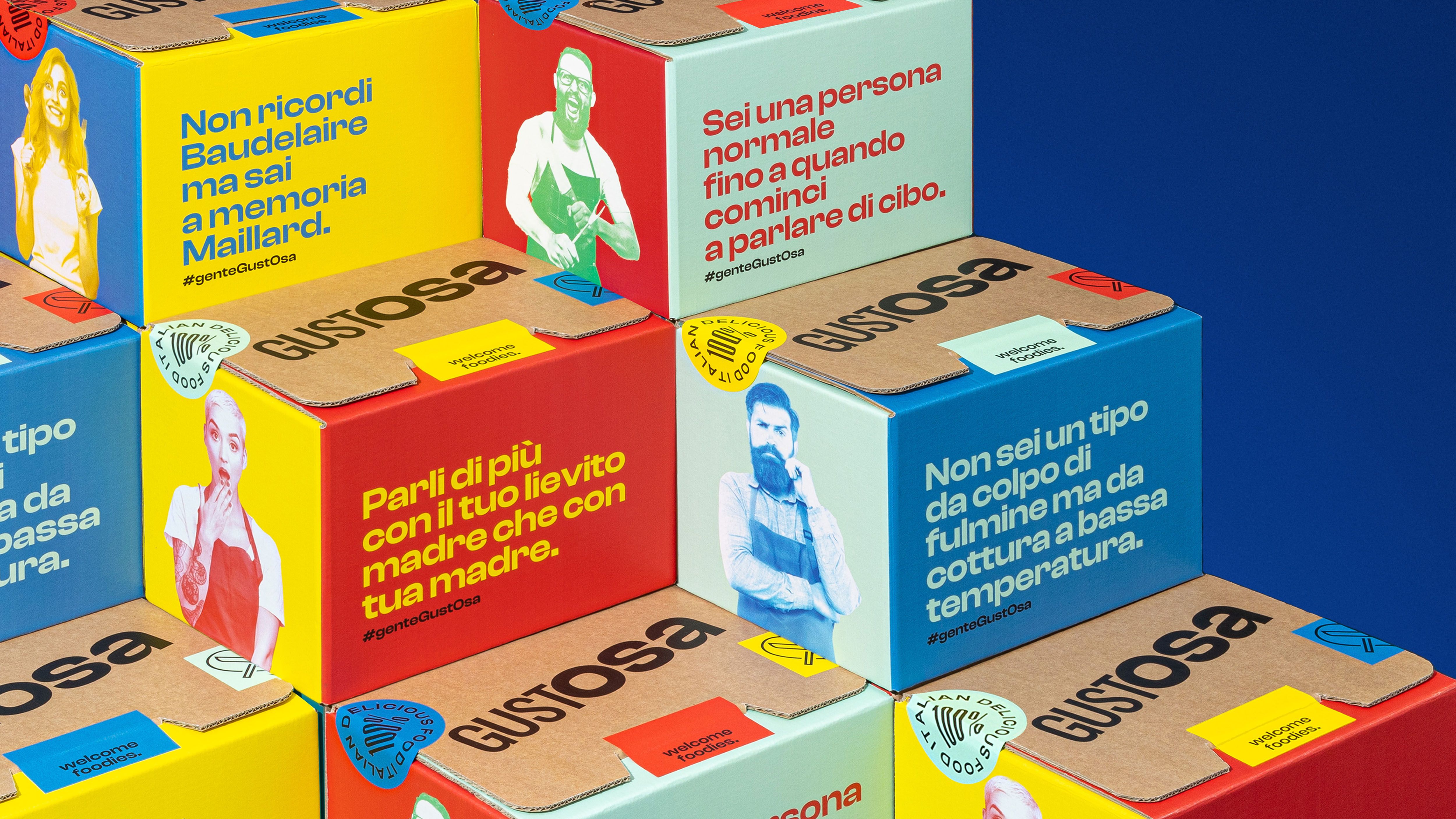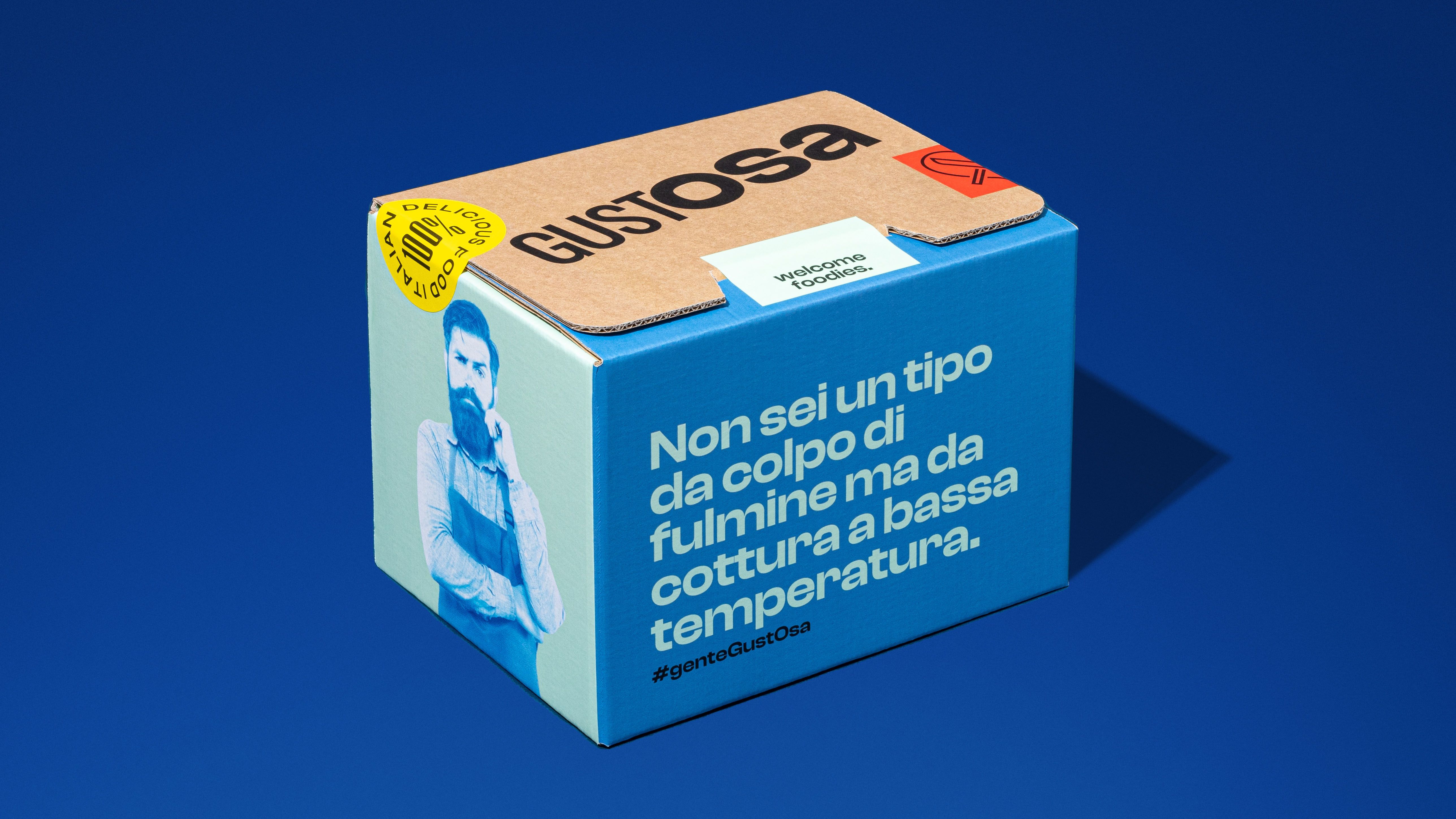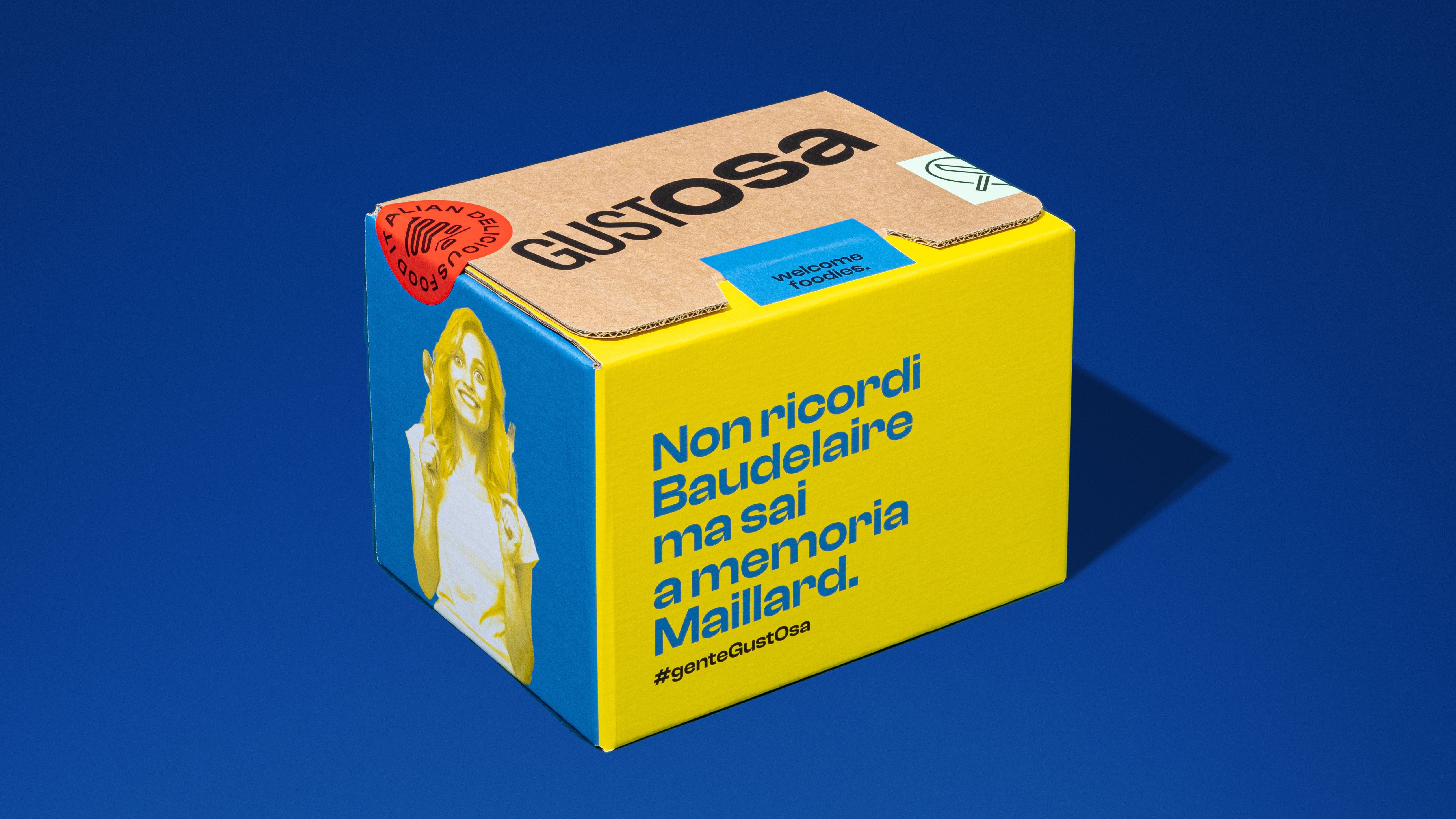 GustOsa is a brand dedicated to the sale of the best Italian regional food and beverage excellence, produced by small businesses far from mainstream. Love for raw materials and ingredients, authenticity of flavors, pleasure for sharing and for tales arising around the table are the fundamental brand pillars. GustOsa approached us to create a strong identity that would help the brand stand out in a very crowded marketplace. First of all, we identified the audience - people always looking for unique ingredients - and put it at the heart of the brand's narrative, giving it a name and a sense of belonging: #genteGustOsa (gourmet people, in English). Secondary, we created a storytelling, developed on packaging, stationary, e-commerce and Instagram, where the culinary obsessions of these kind of consumers come to life. The GustOsa Boxes - four subjects, collectible, reusable and sustainable - speak directly to the consumers speaking their same language : "You can't recall Baudelaire but know Maillard by heart”; "You're quite normal until you start speaking about food”; "You talk more to your mother yeast than you talk to your mother”; "You aren't an instant spark type, but a slow cooker". The Boxes are obviously completely recyclable, made of double-wave corrugated cardboard with white Kraft cover sheets, printed with HD digital technology and water-based inks (suitable for food direct contact). Each box is securely sealed with three stickers of different colors, made with G.F. Smith Colorplan Labels self-adhesive paper. Once the recipients open the box, they will find a card saying that the box has been carefully prepared for them, emphasizing its customization. On the other side of the card they can find one of the other subjects, making them eager to collect all the boxes.