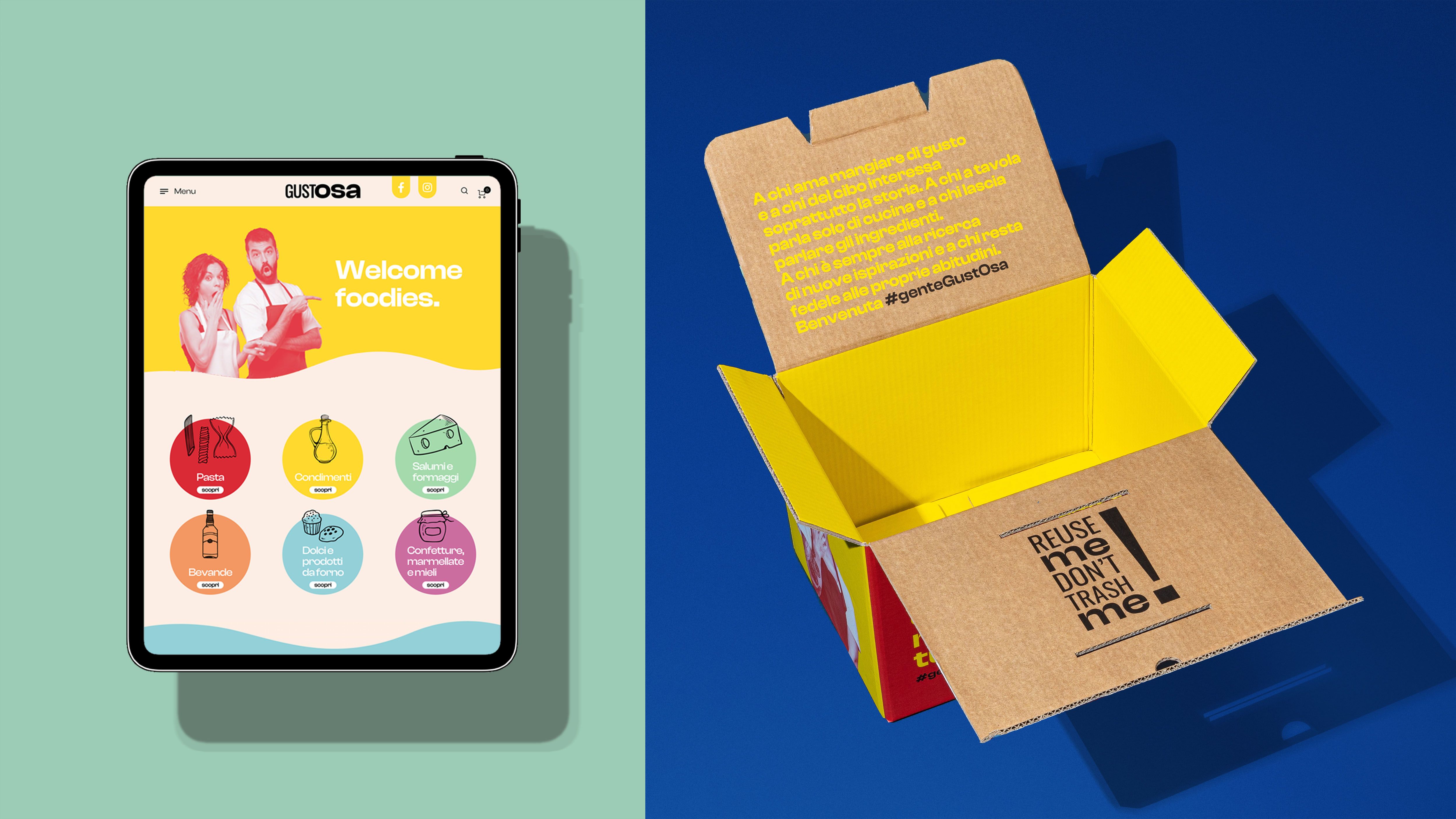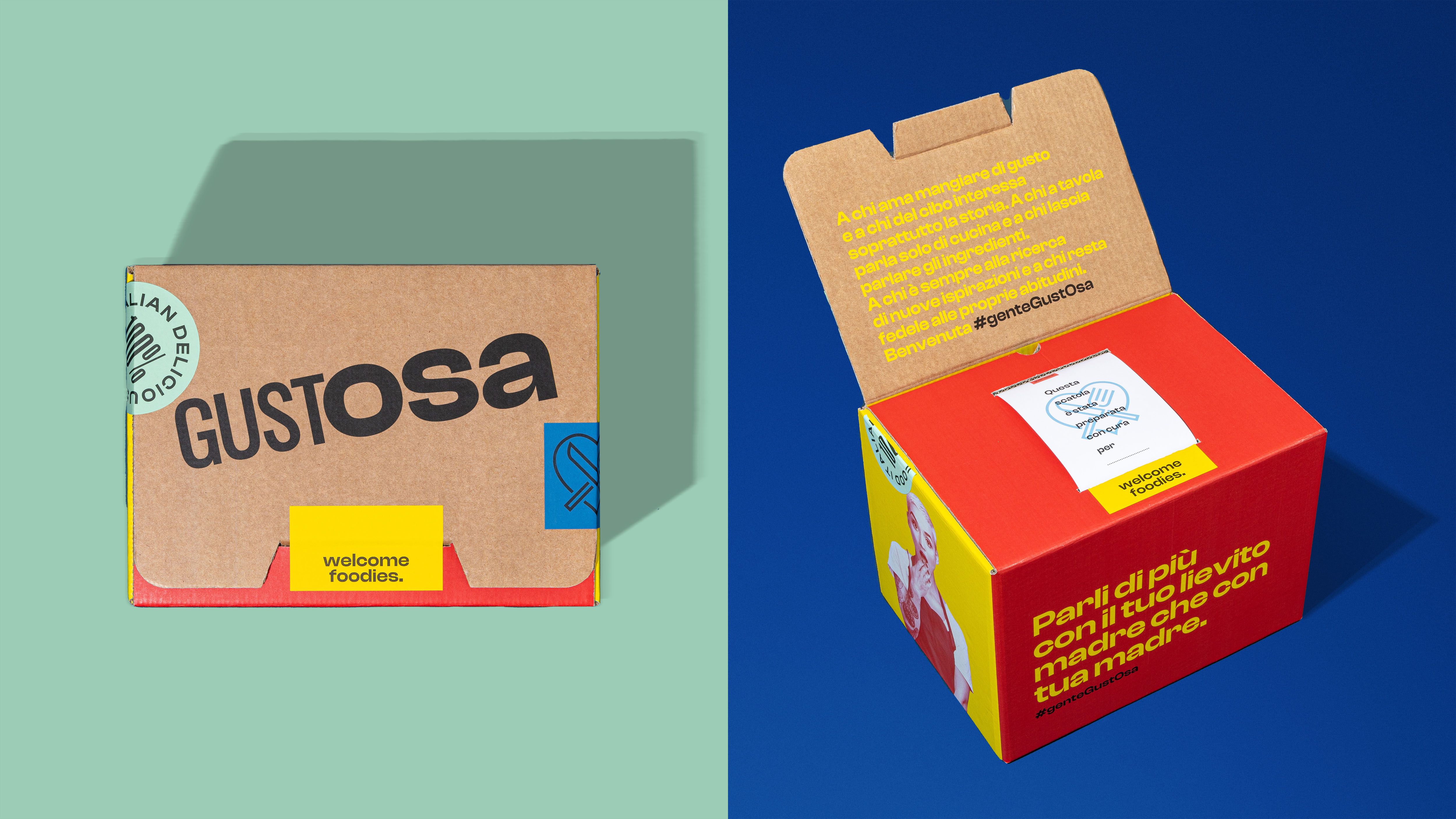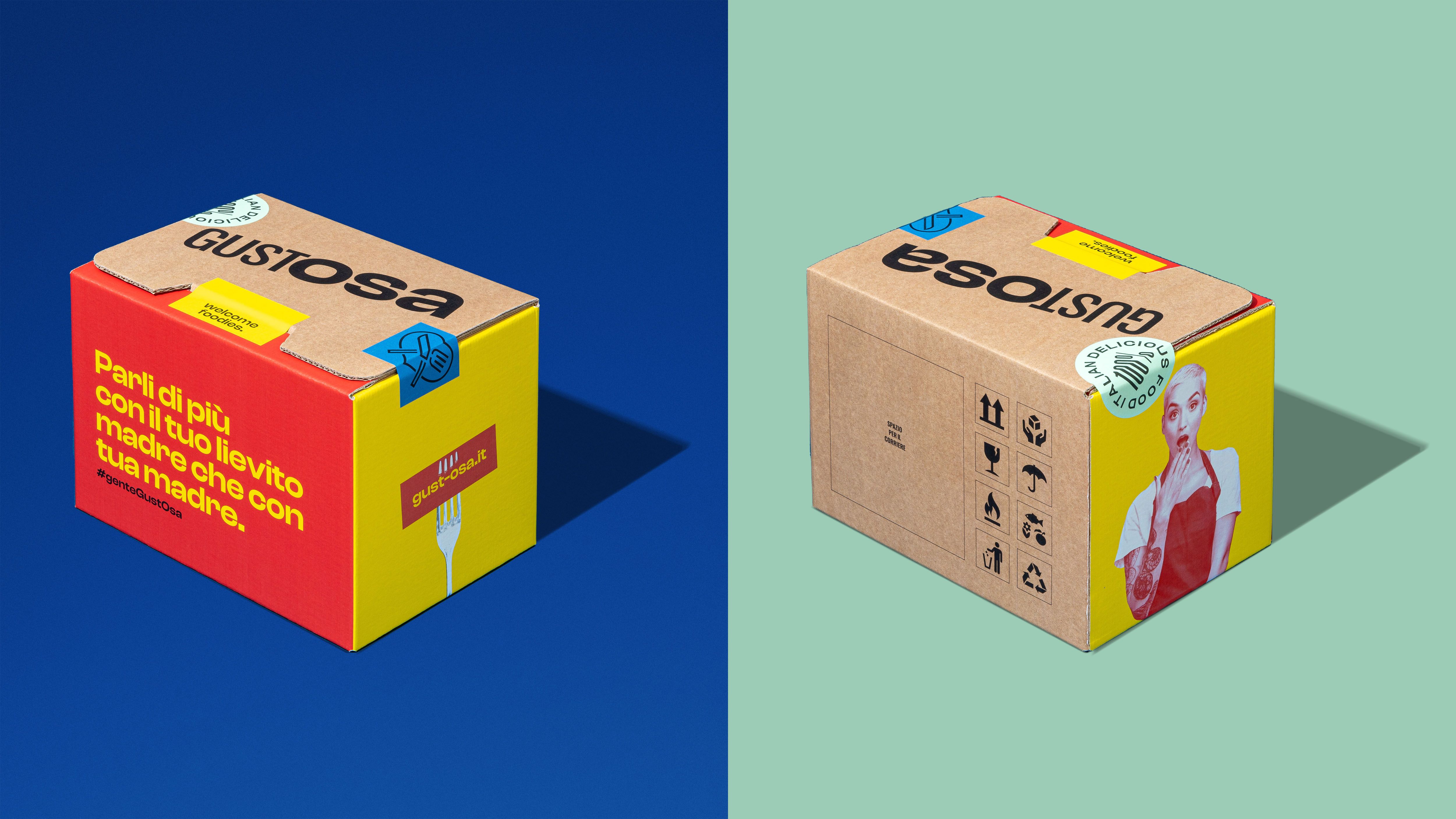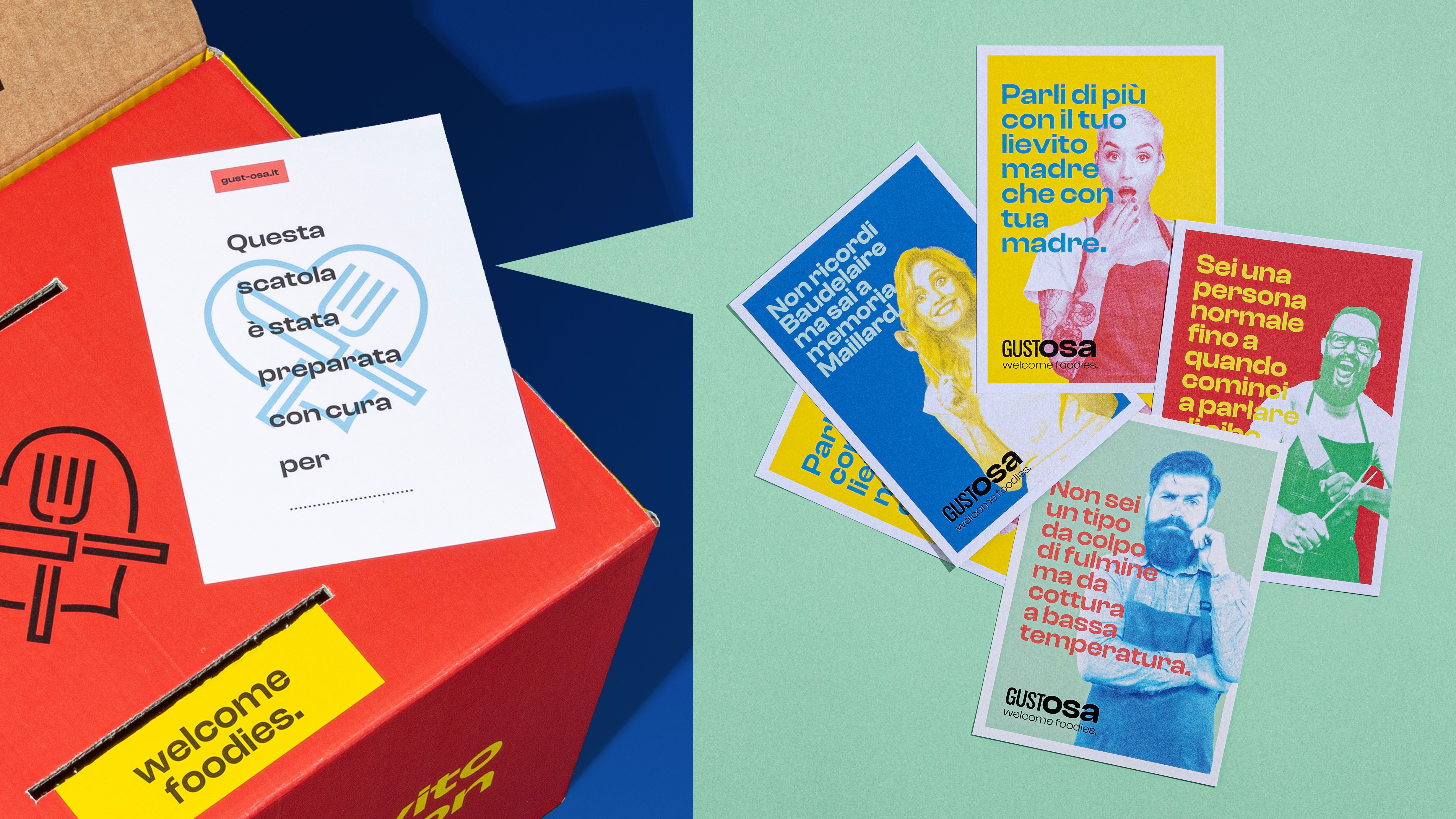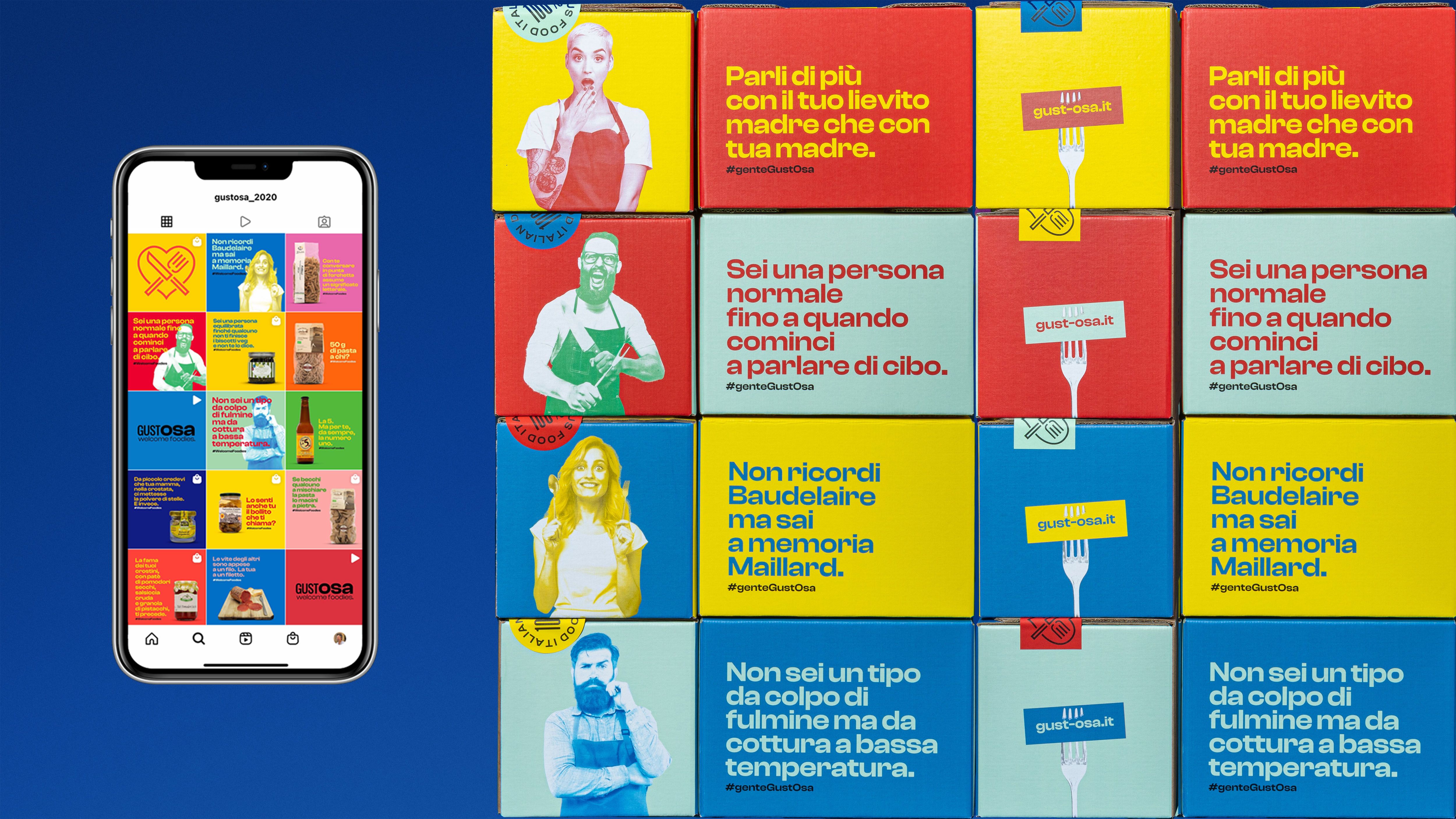 GustOsa is a brand dedicated to the sale of the best Italian regional food and beverage excellence, produced by small businesses far from mainstream. Love for raw materials and ingredients, authenticity of flavors, pleasure for sharing and for tales arising around the table are the fundamental brand pillars. GustOsa approached us to create a strong identity that would help the brand stand out in a very crowded marketplace. First of all, we identified the audience - people always looking for unique ingredients - and put it at the heart of the brand's narrative, giving it a name and a sense of belonging: #genteGustOsa (gourmet people, in English). Secondary, we created a storytelling, developed on packaging, stationary, e-commerce and Instagram, where the culinary obsessions of these kind of consumers come to life. The GustOsa Boxes - four subjects, collectible, reusable and sustainable - speak directly to the consumers speaking their same language : "You can't recall Baudelaire but know Maillard by heart”; "You're quite normal until you start speaking about food”; "You talk more to your mother yeast than you talk to your mother”; "You aren't an instant spark type, but a slow cooker". The Boxes are obviously completely recyclable, made of double-wave corrugated cardboard with white Kraft cover sheets, printed with HD digital technology and water-based inks (suitable for food direct contact). Each box is securely sealed with three stickers of different colors, made with G.F. Smith Colorplan Labels self-adhesive paper. Once the recipients open the box, they will find a card saying that the box has been carefully prepared for them, emphasizing its customization. On the other side of the card they can find one of the other subjects, making them eager to collect all the boxes.