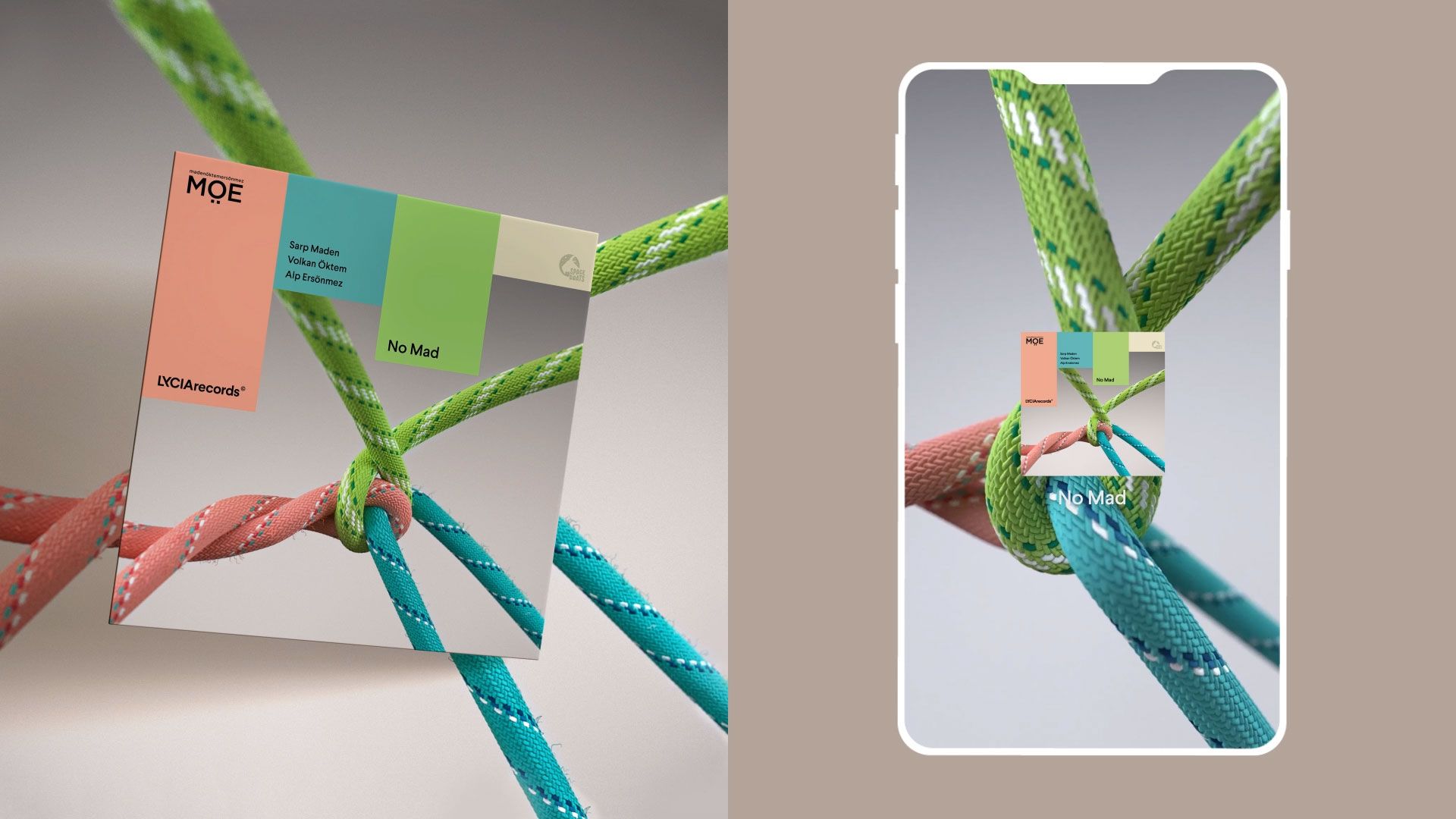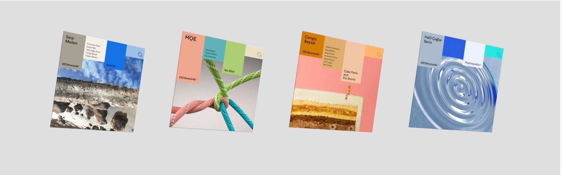 We also create artwork for all of Lycia Record’s releases as their creative partner. Utilizing a range of techniques including 3D modeling, photo-manipulation and production, we create artwork that are distinct but with a similar visual nature: in shape, color intensity and evocative nature. Each artwork tells a different visual story. For example, “No Mad” is a collaborative project between three artists who recorded their part individually in three different cities. The cover art depicts the interaction and the tension between three such creative forces through the analogy of a three-rope knot. On the other hand “Cake Pants and Pie Shorts“ is an EP named by the artist’s daughter that is meant to offer a sweet escape into the world she sees. So the artwork reflects this wondrous nature as the small figurine daydreams on a cliff of multi-layered mousse cake.